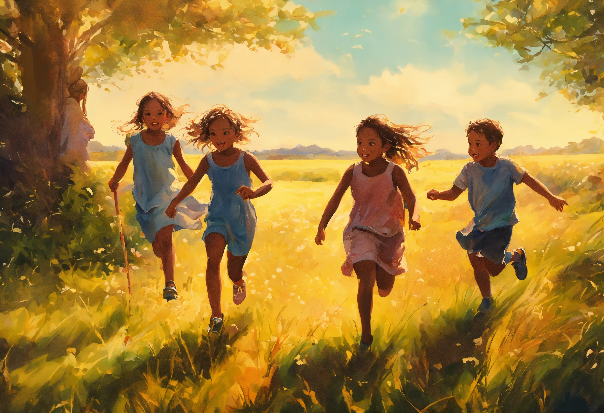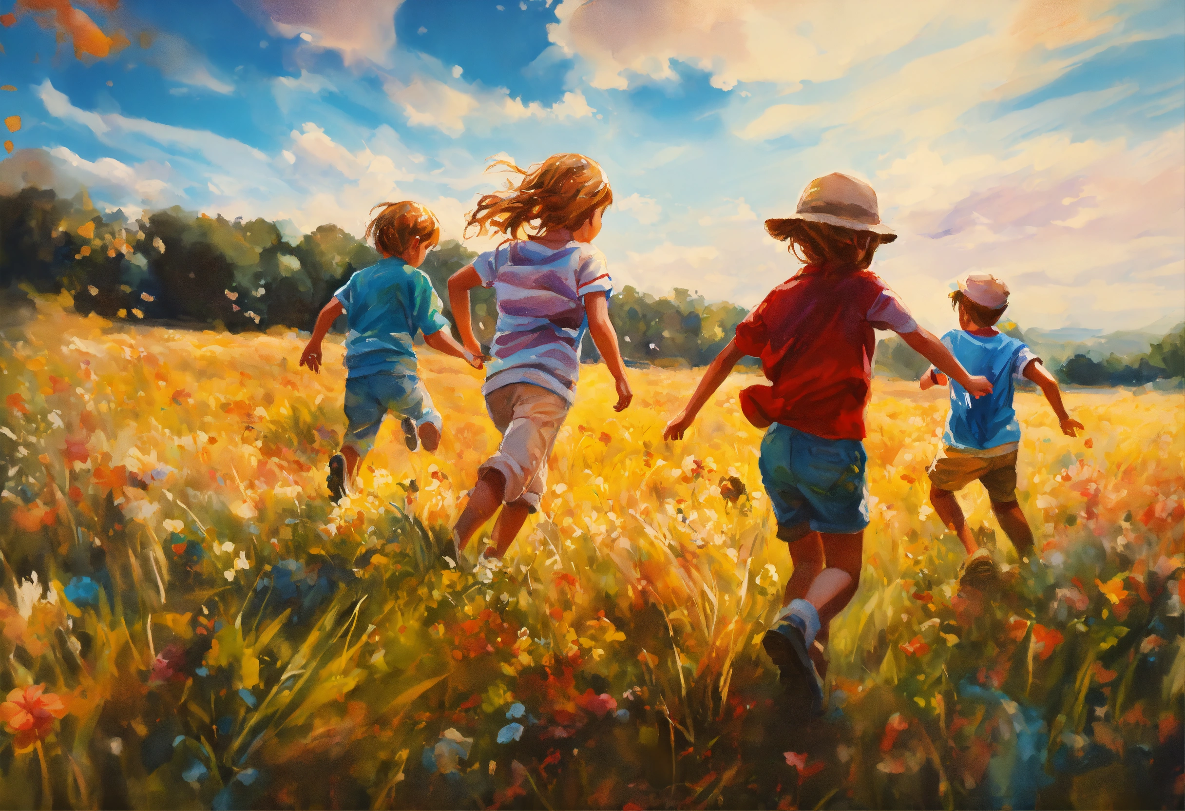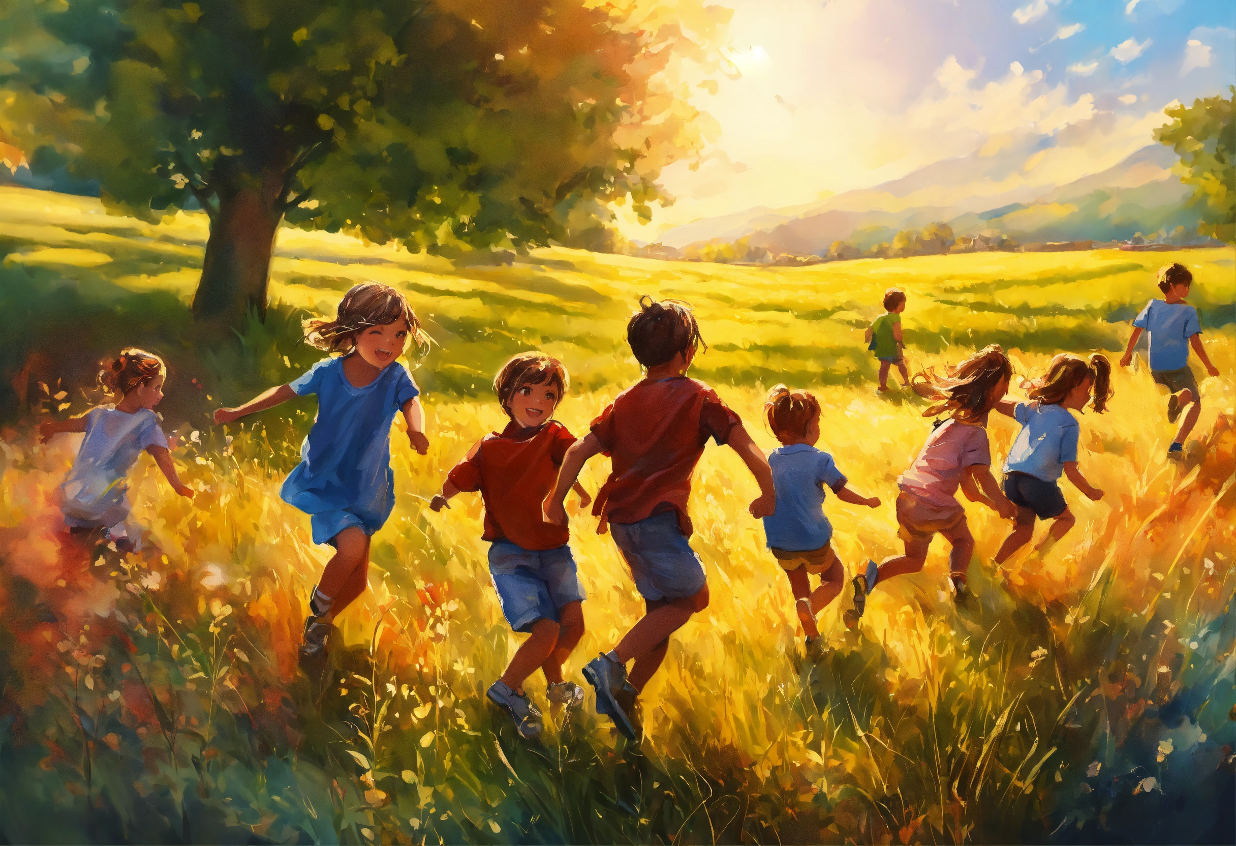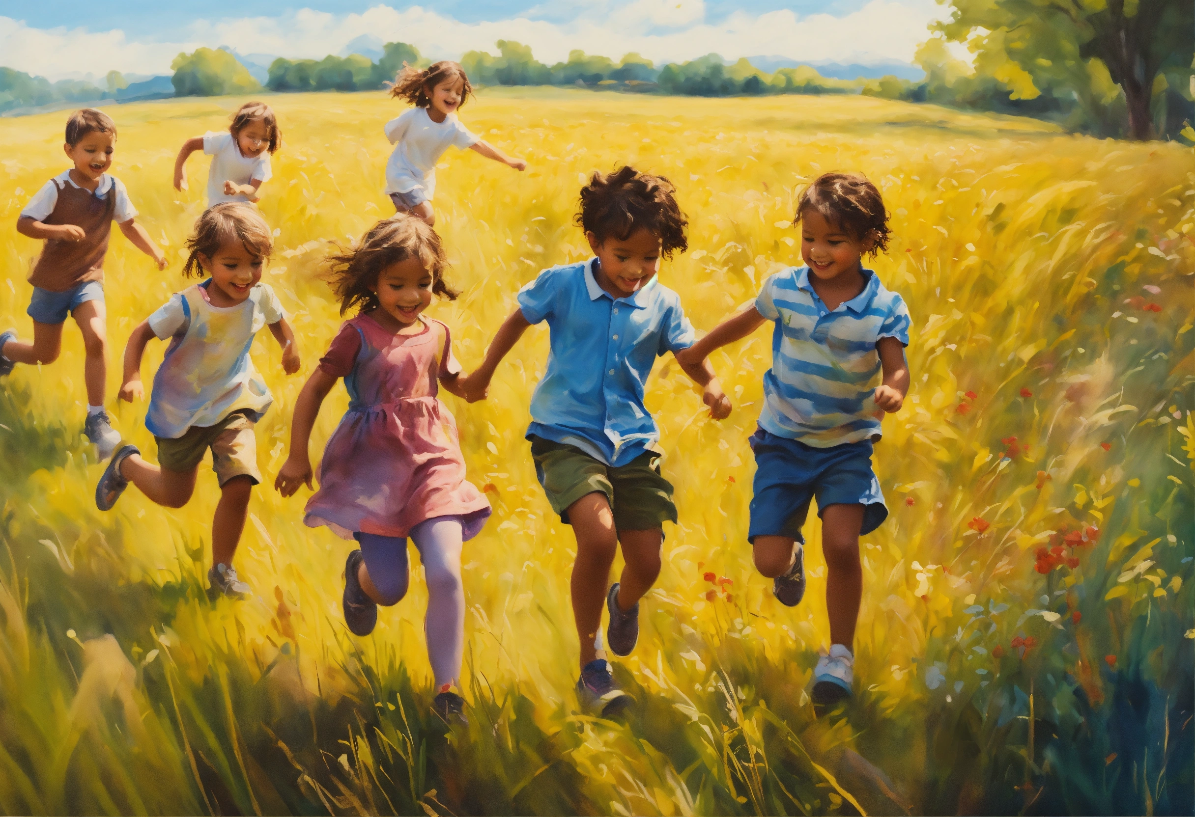 A hand drawn painting of a group of young children playing in the field. highly detailed crisp photo in 4k, wide-angle, sharp, vibrant, vivid.