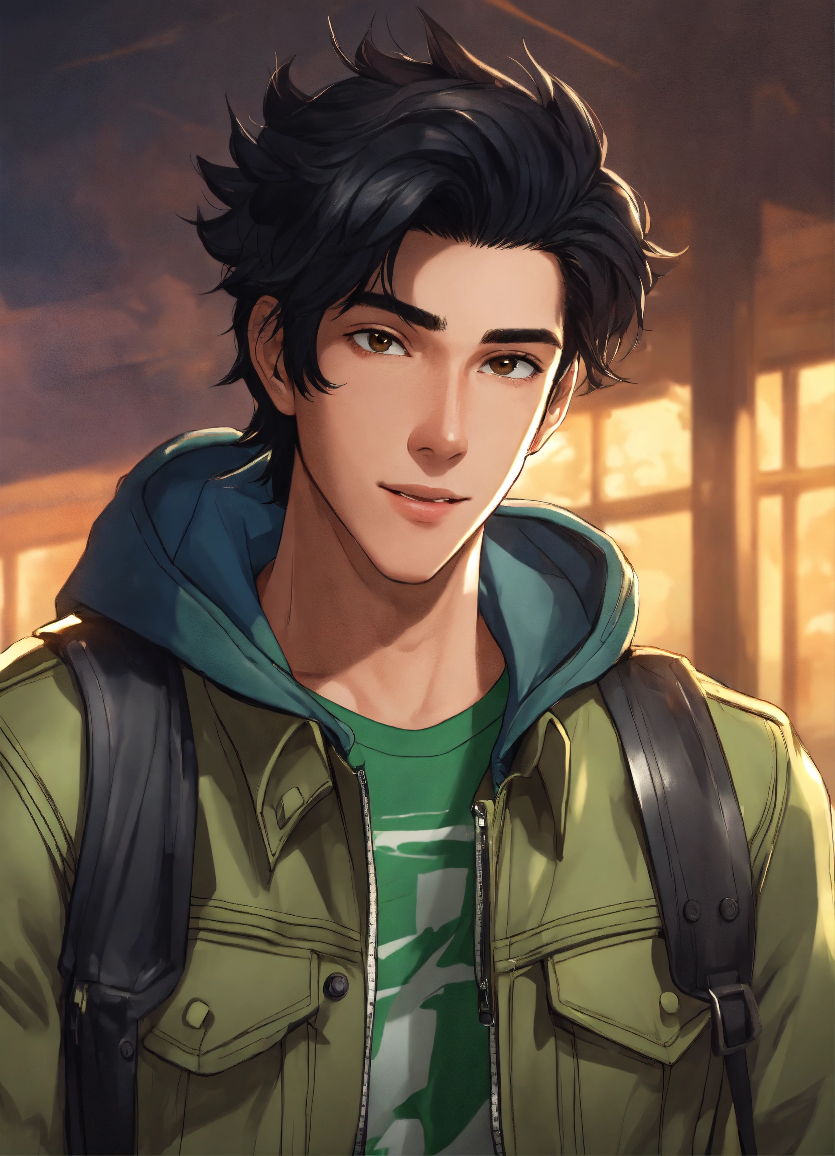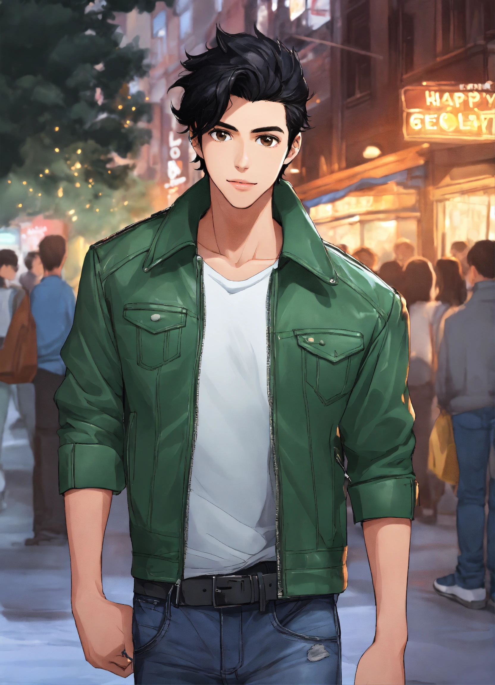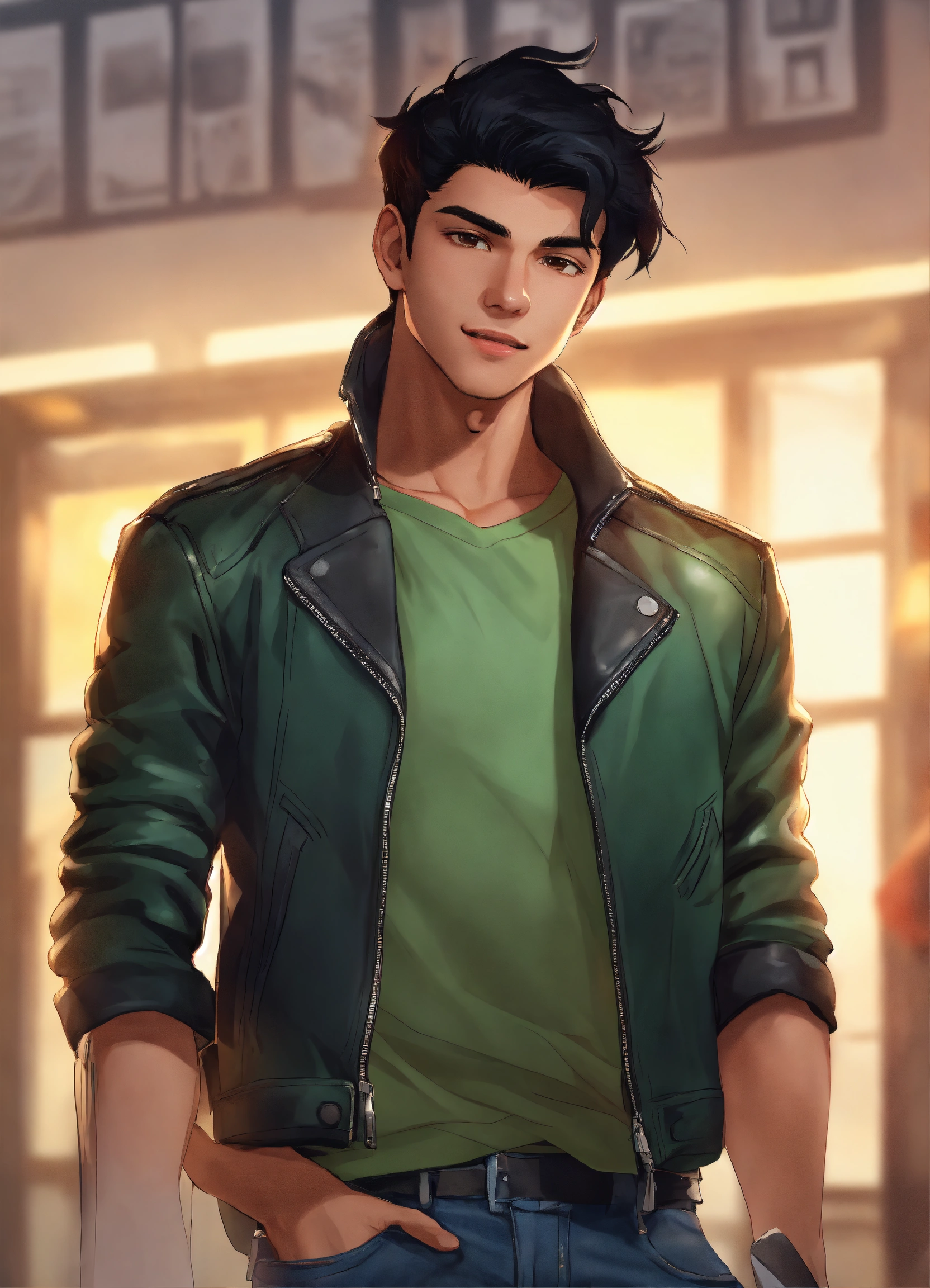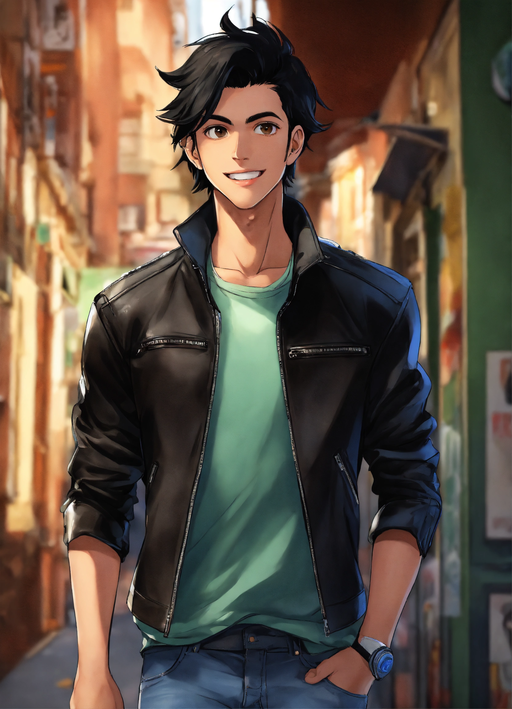 19-year-old male, black hair that sticks up, brown eyes, slightly muscular, black leather jacket, green shirt, blue jeans, black and white sneakers, animated, realistic, cartoon, happy