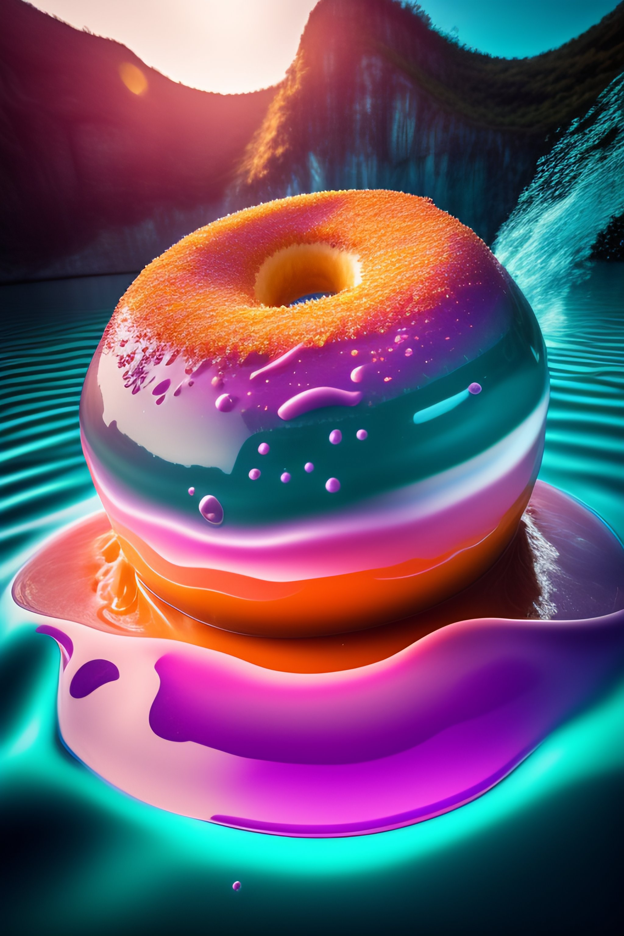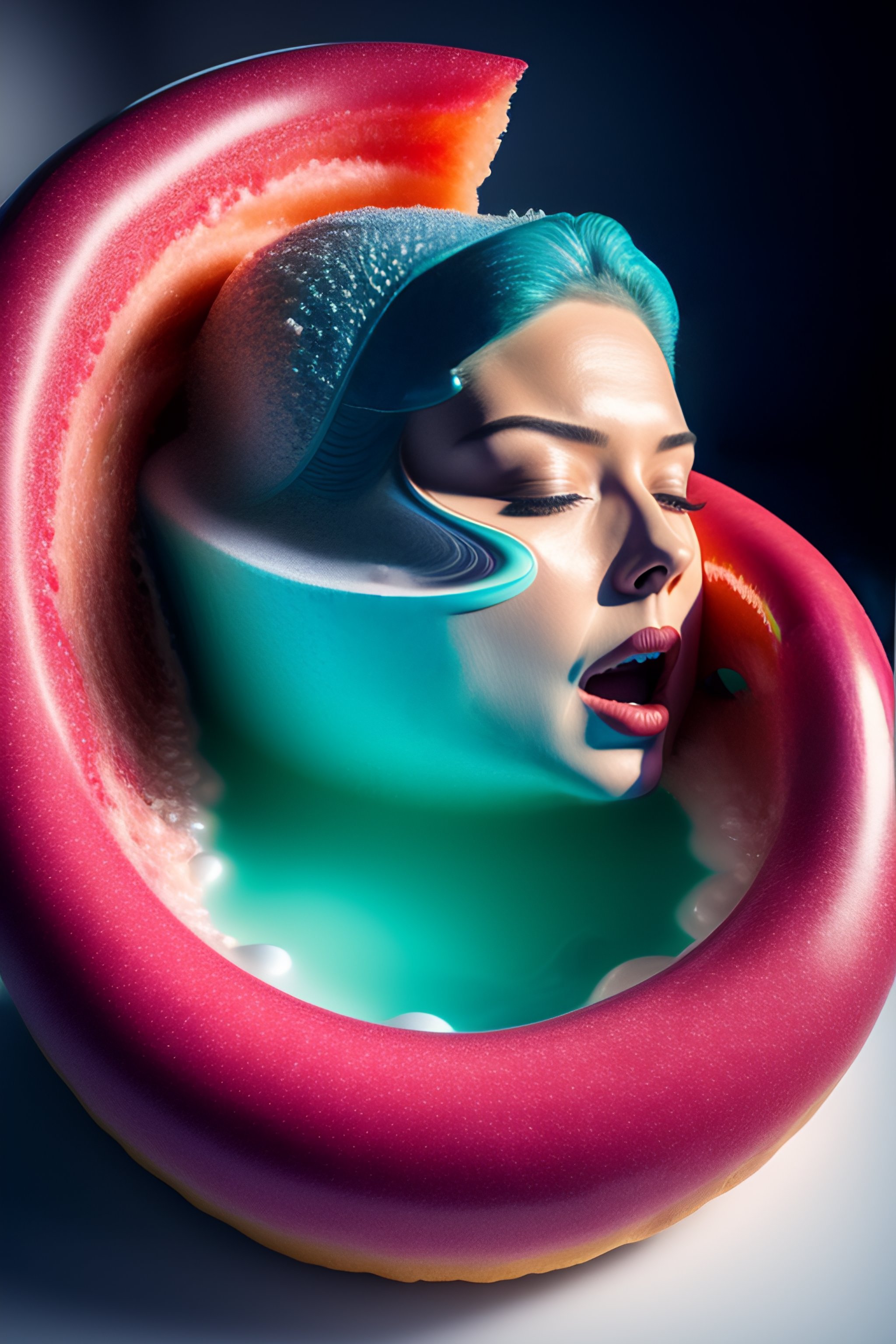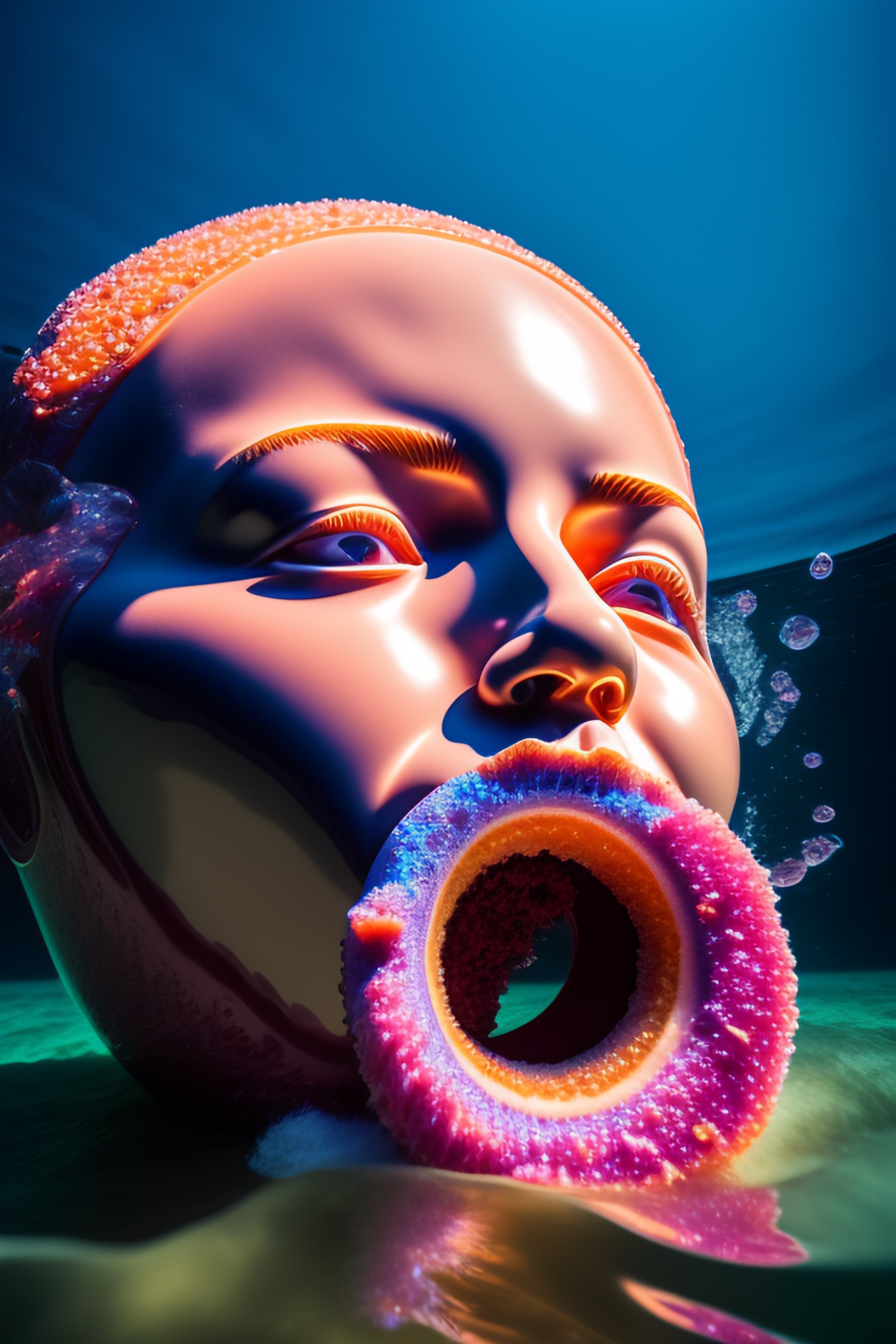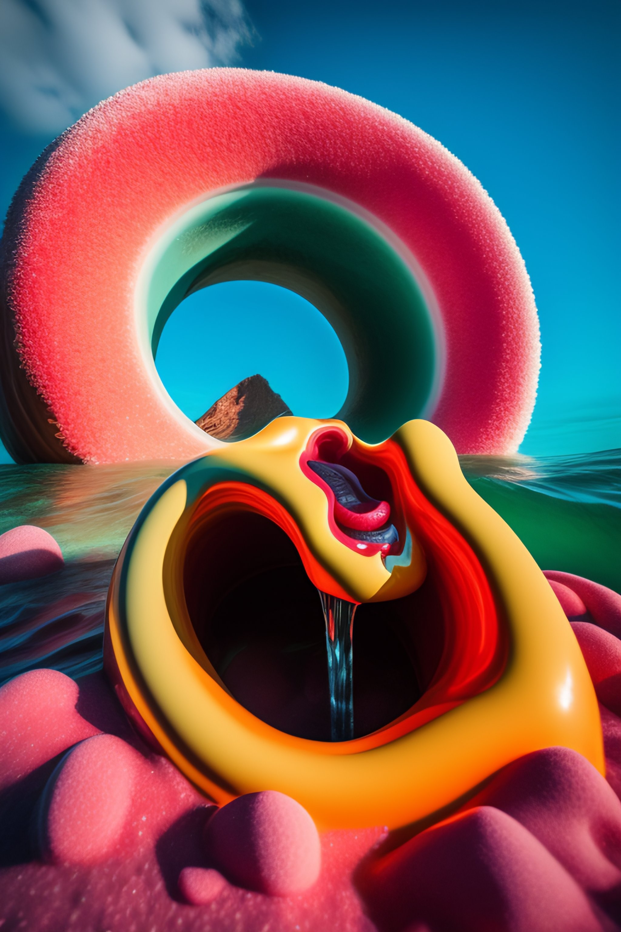 A massive sculpture of a crushed human face licking a giant donut in a jelly pool in the ocean, in the style of johnson tsang, funny sculpture, lucid dream series, cinematic, hyper - realistic, very detailed, realistic water splashes, ray tracing, 8 k resolution, long - shot, sharp focus, low angle, 8 5 mm photograph, wide lens