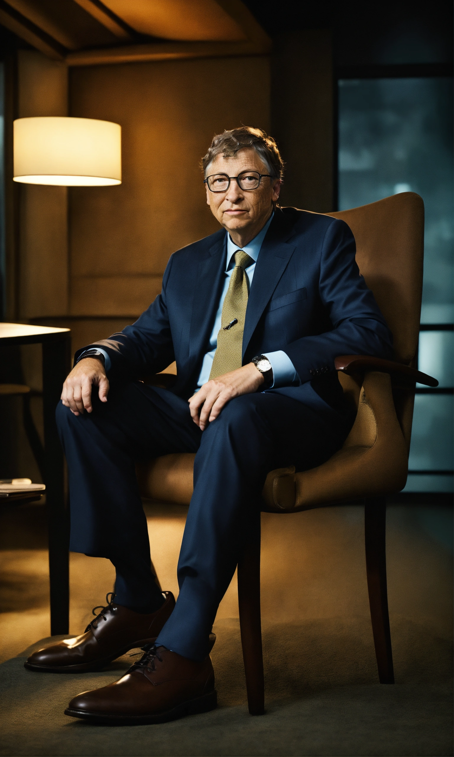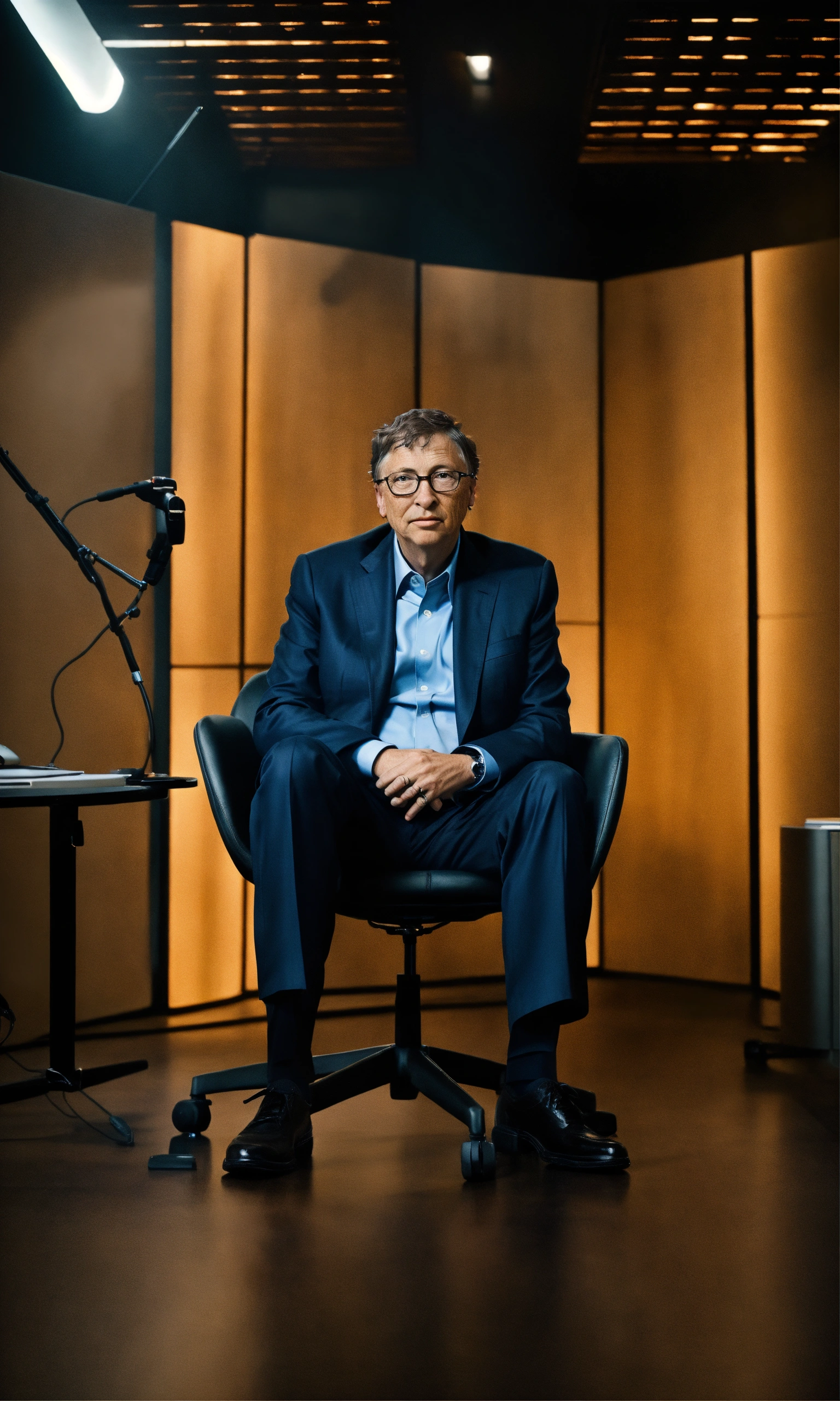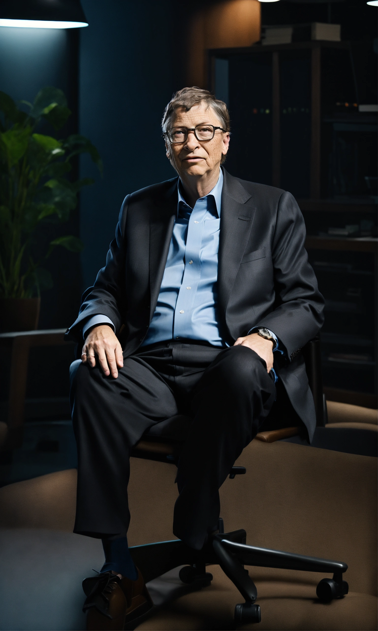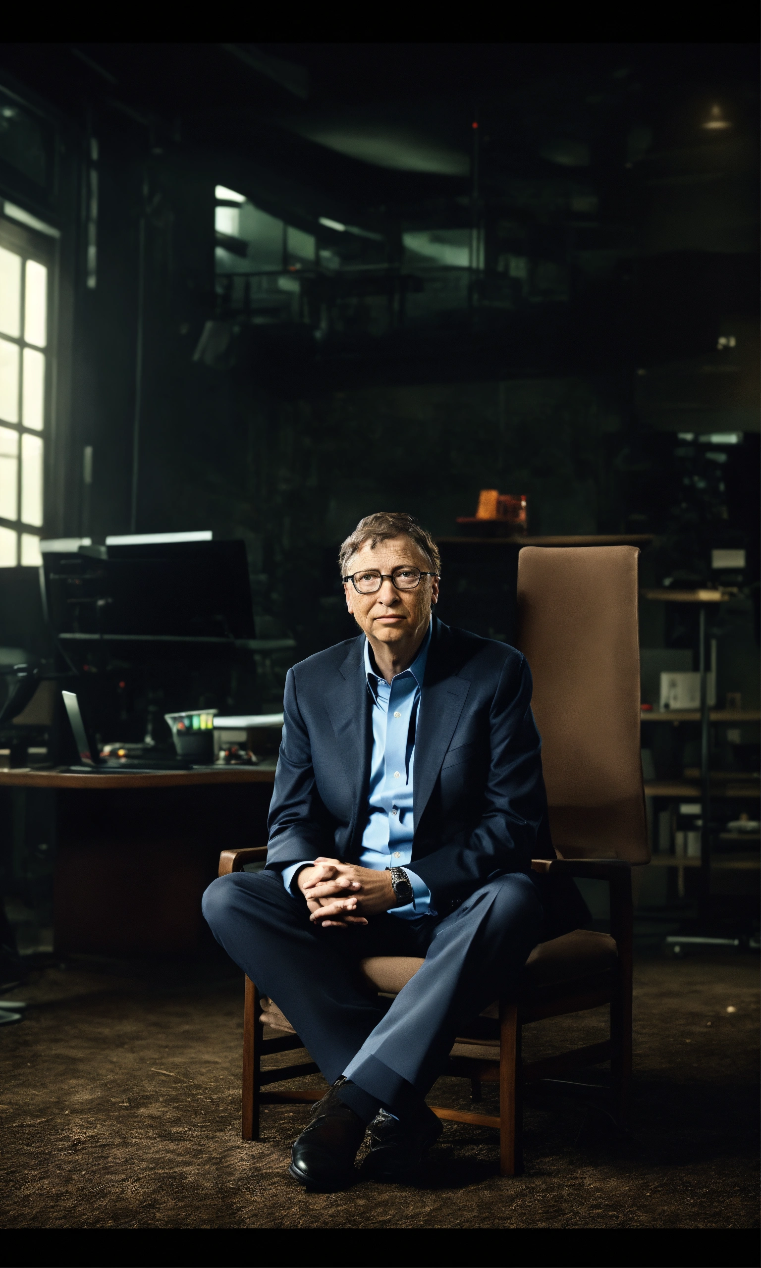 Image of bill gates sitting on a chair, in an environment representing microsoft, facing at camera, super realistic, high resolution, dark room