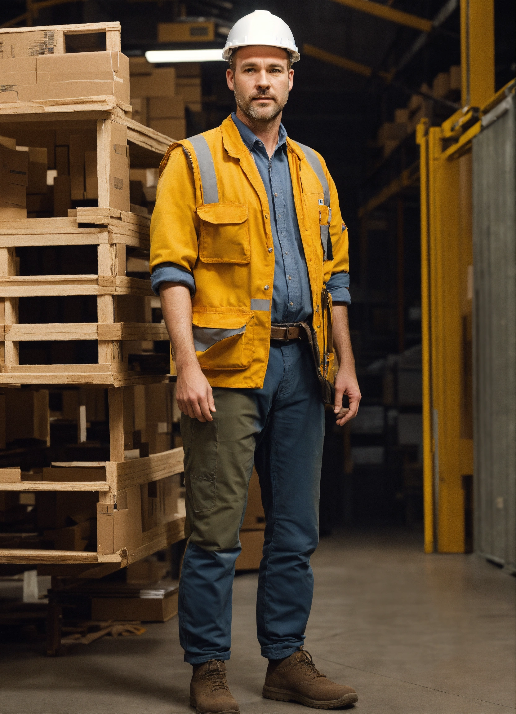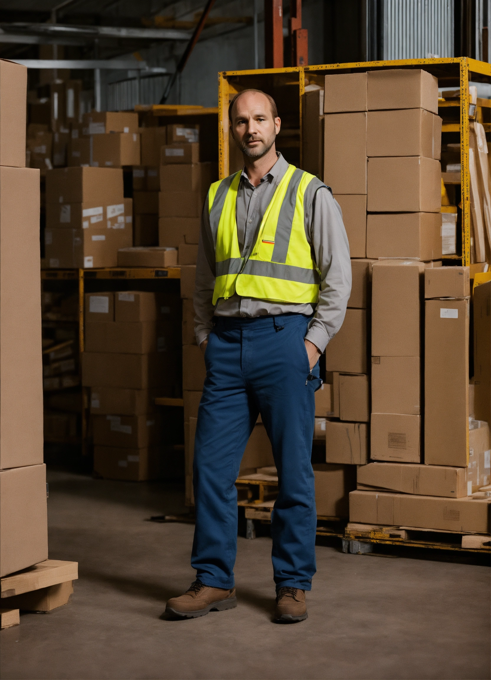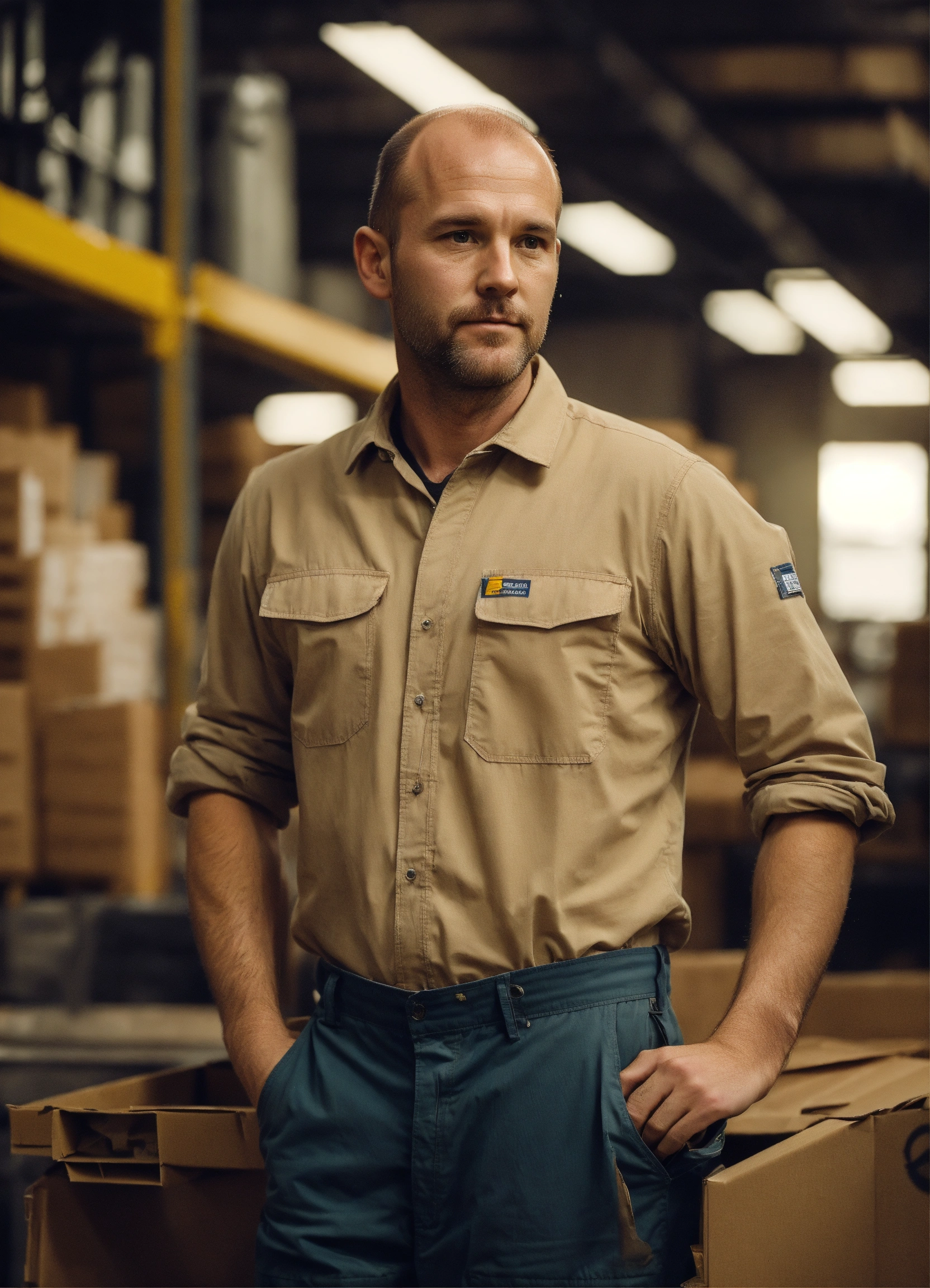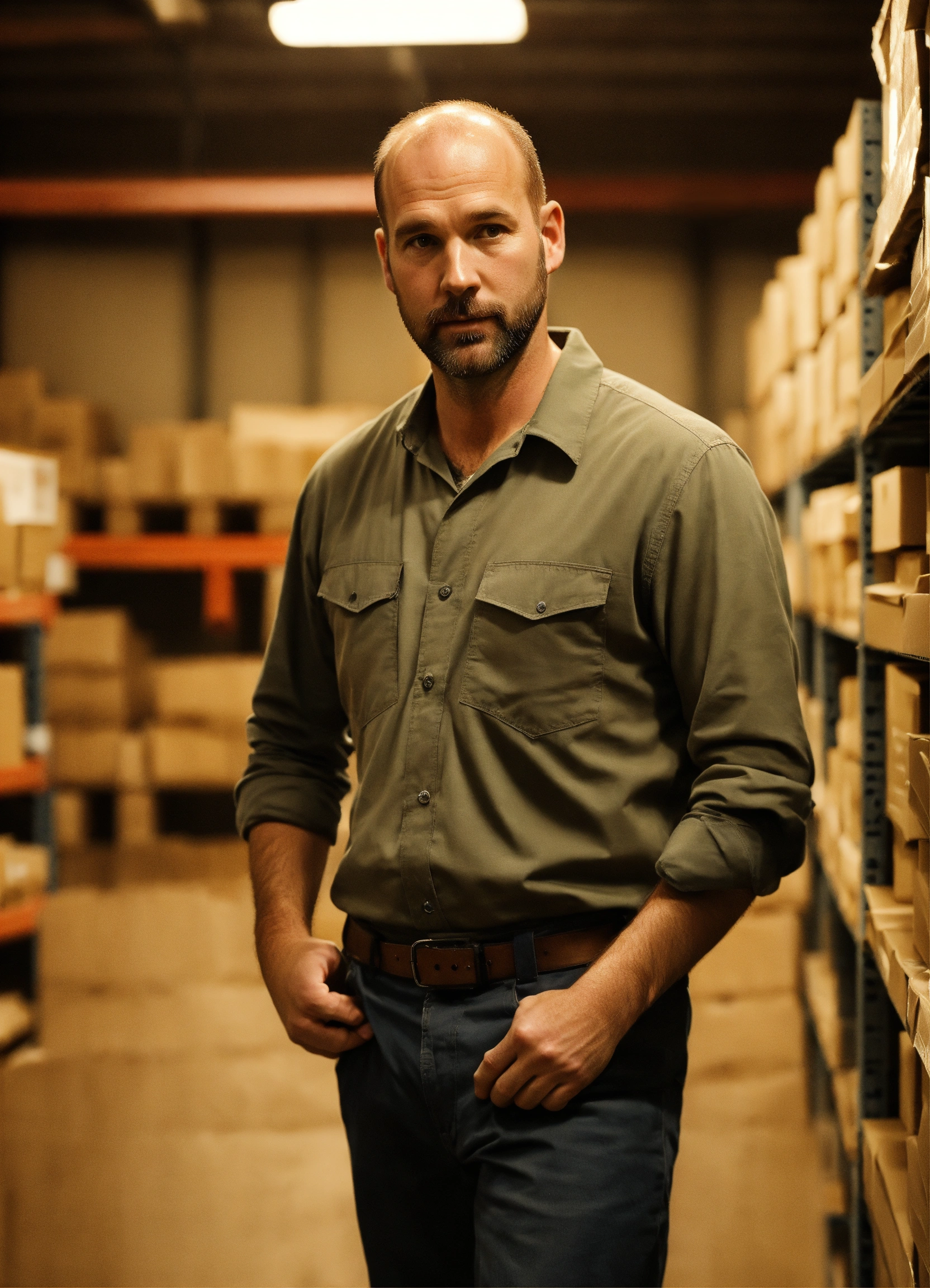 White man in his late 30s short with small build slightly balding warehouse worker quite shy yet outgoing detailed, full body