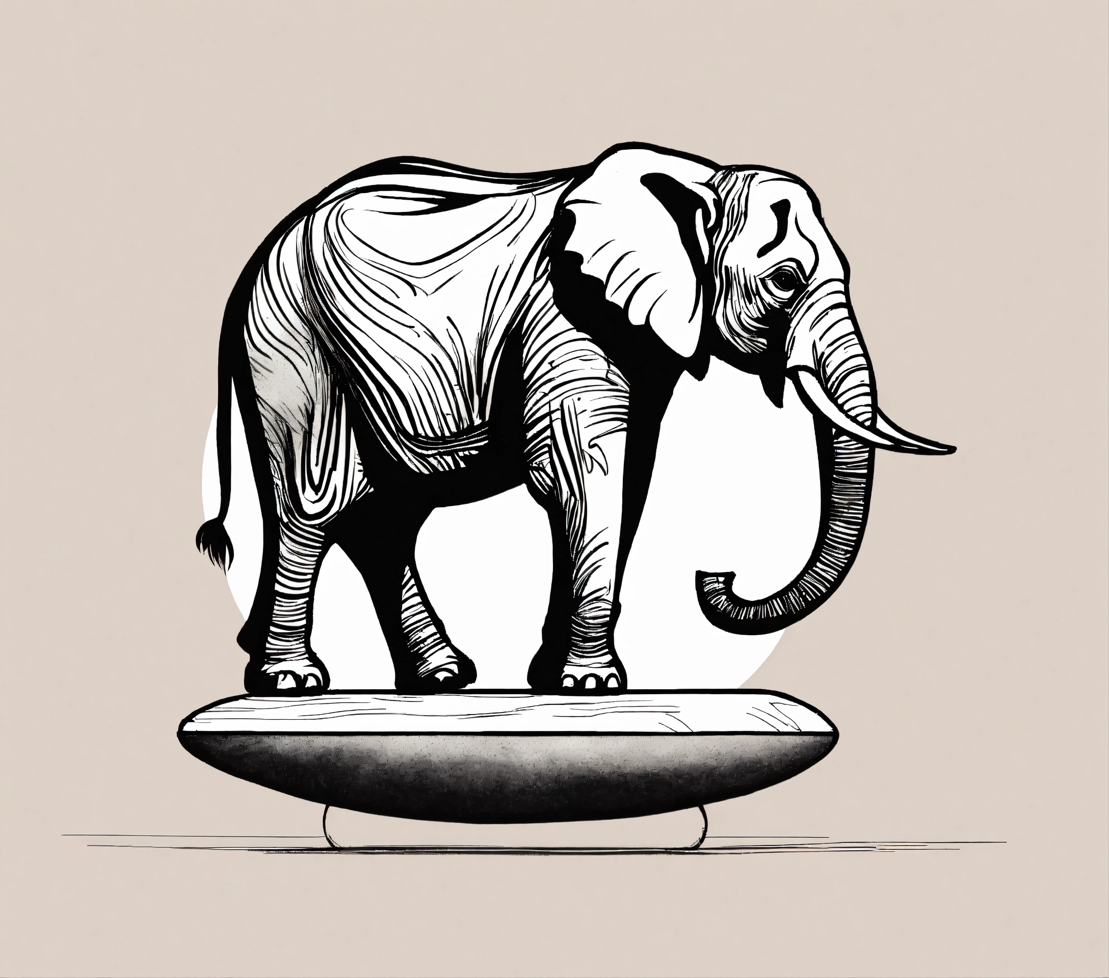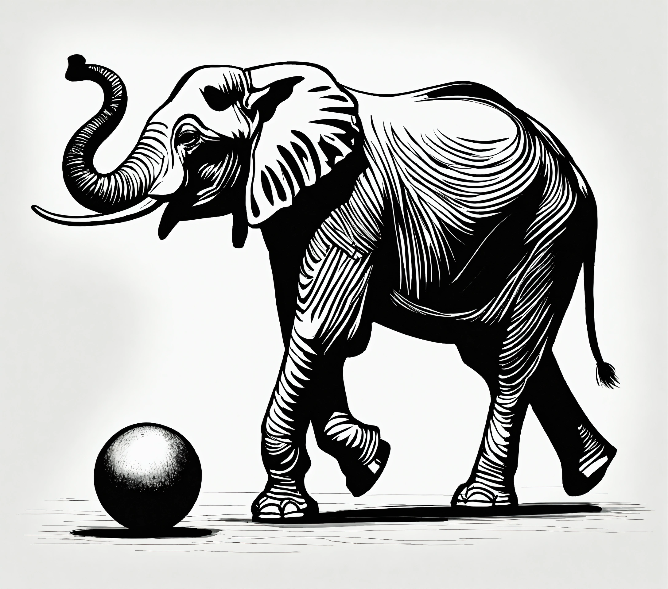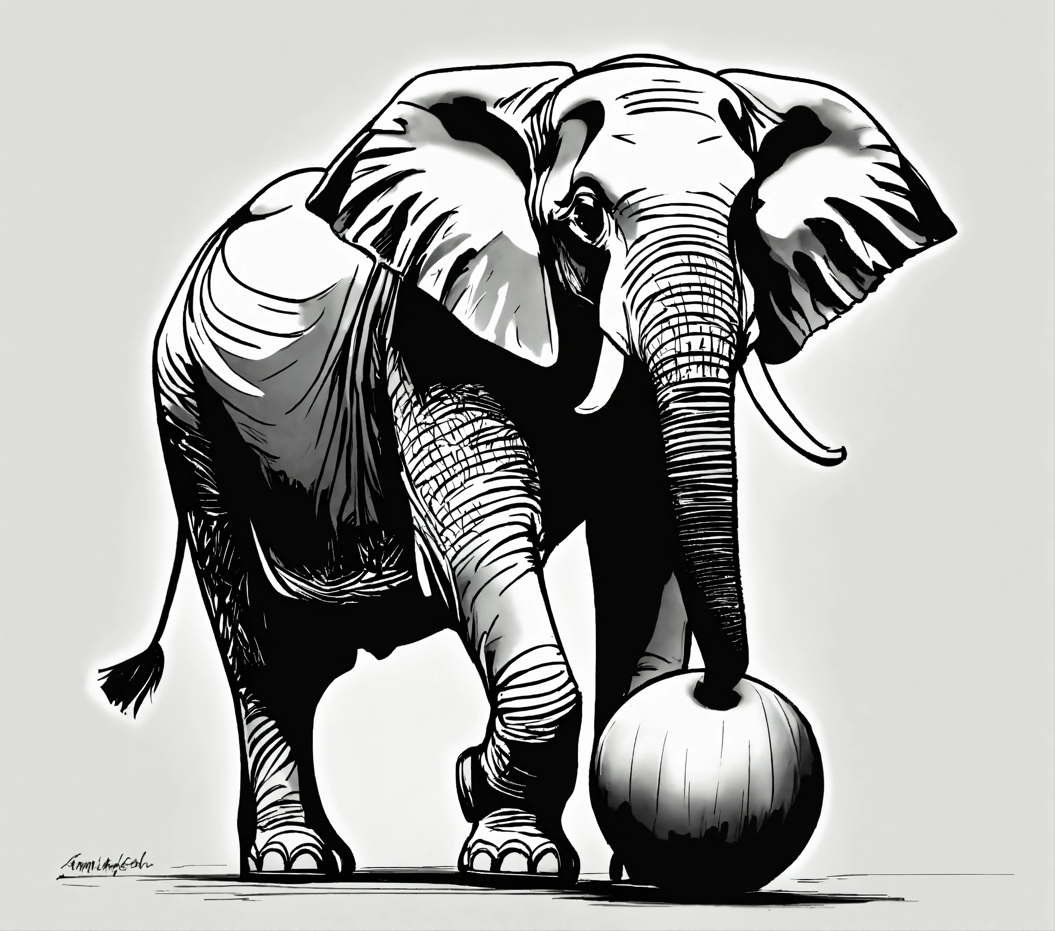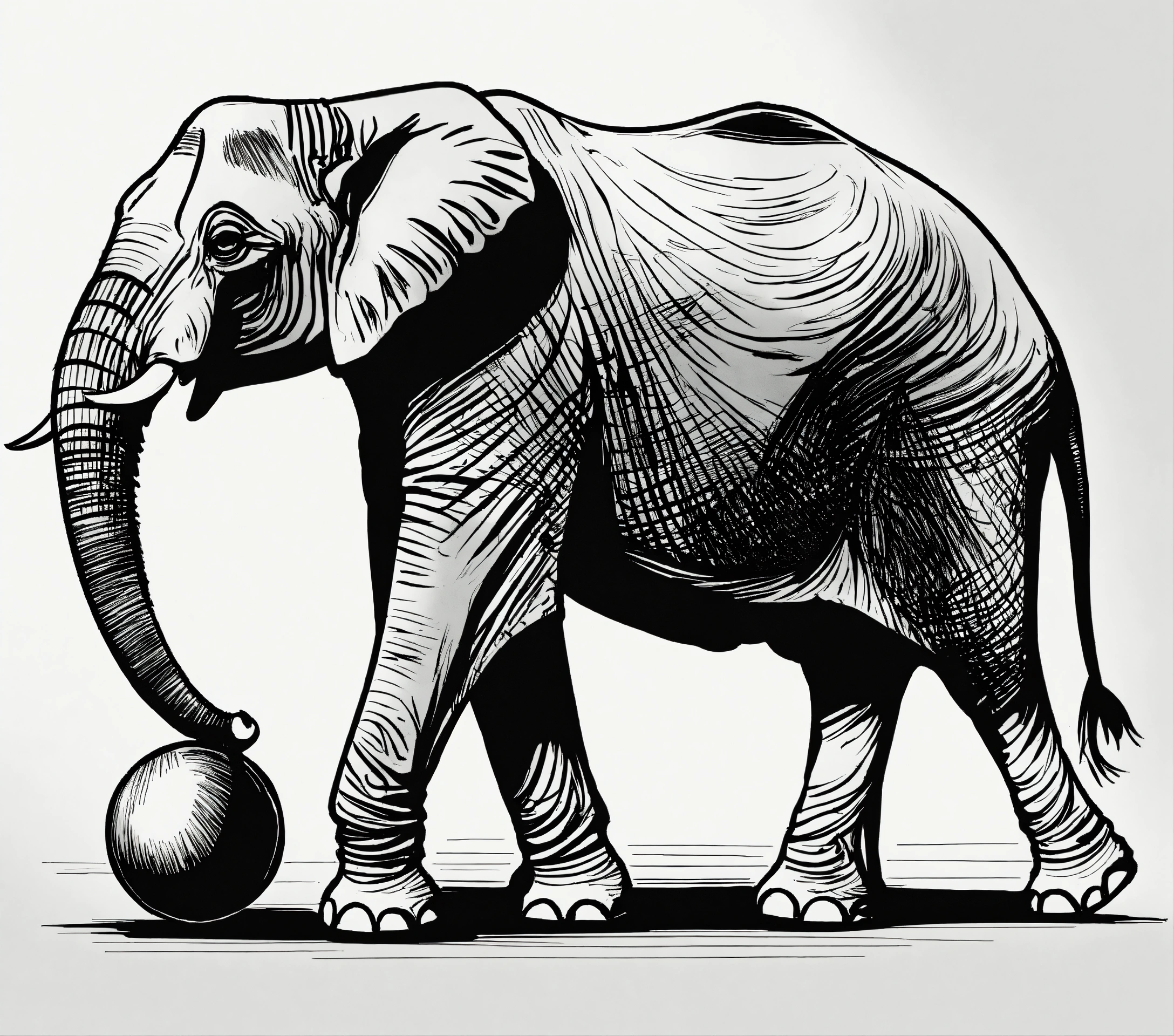 Pensketch of an elephant in balance on a small ball, simplistic, white background, illustration, pen sketch