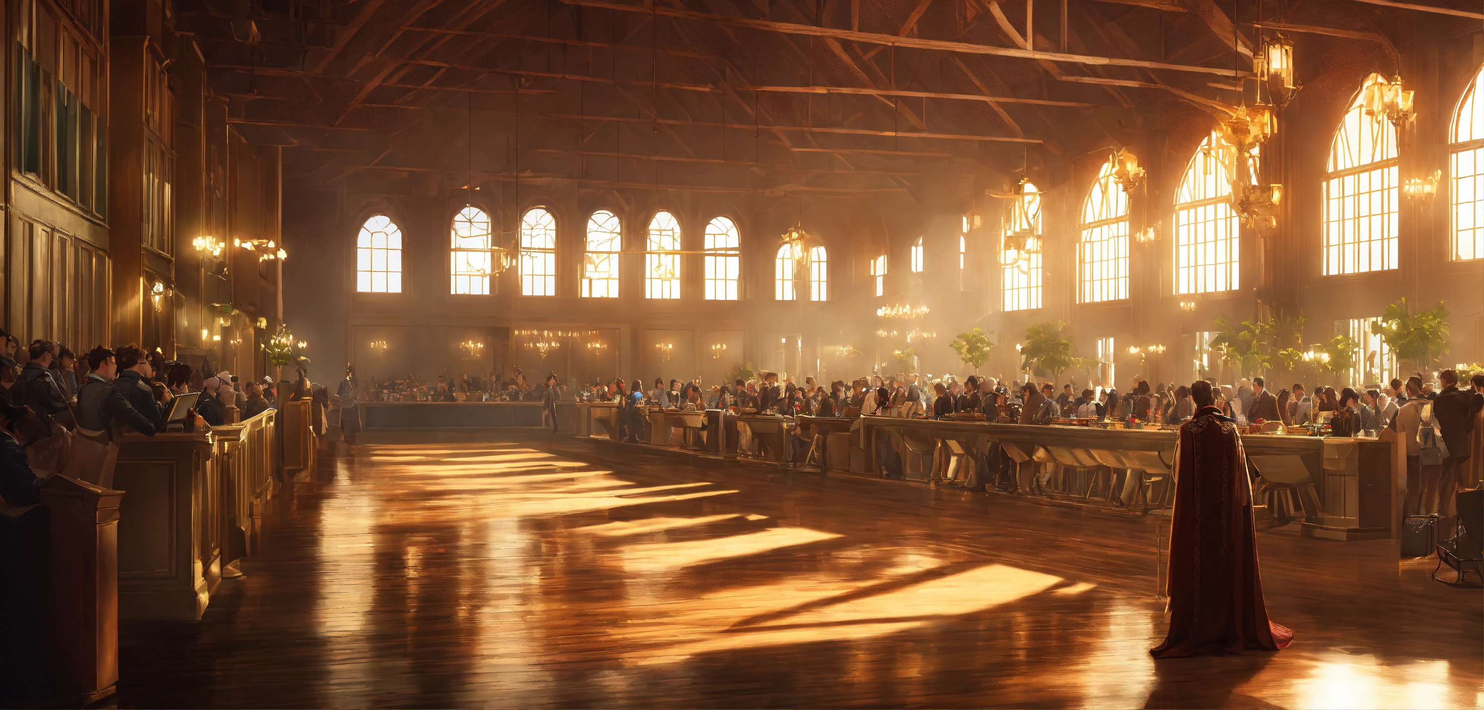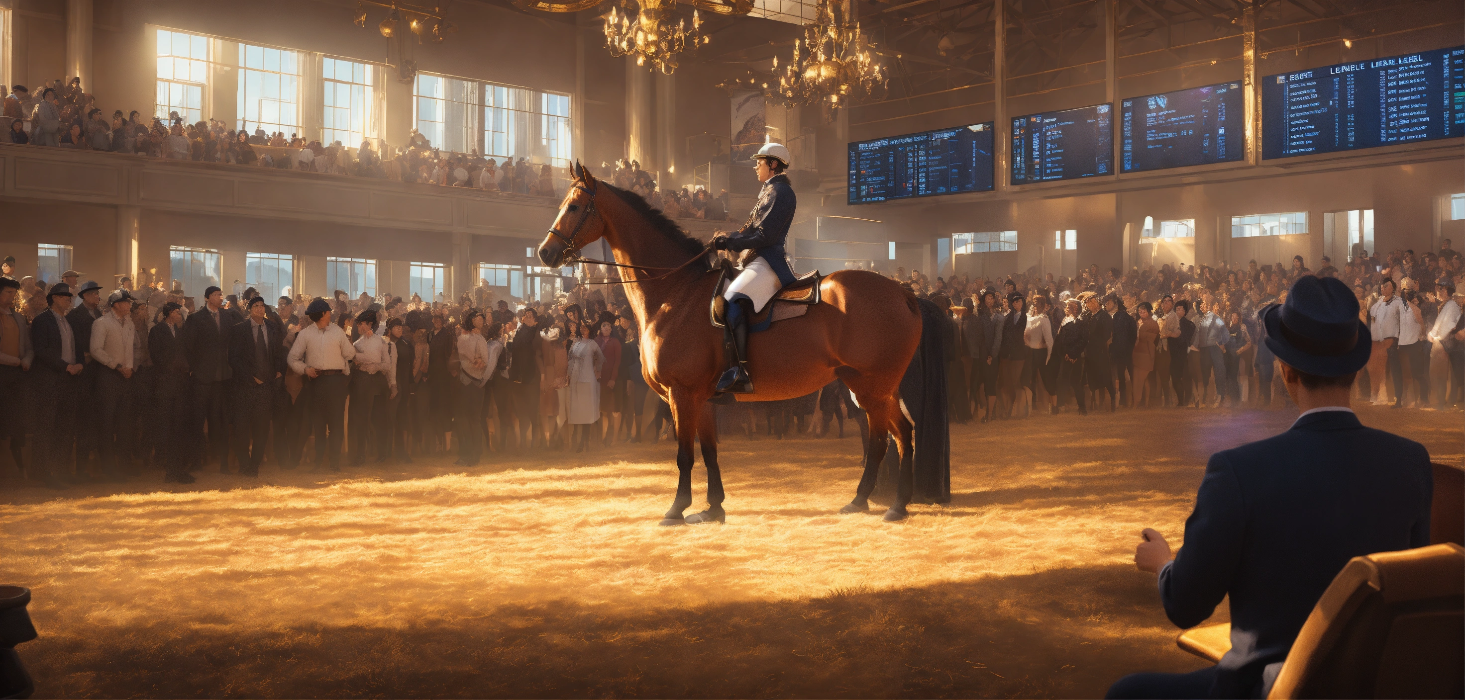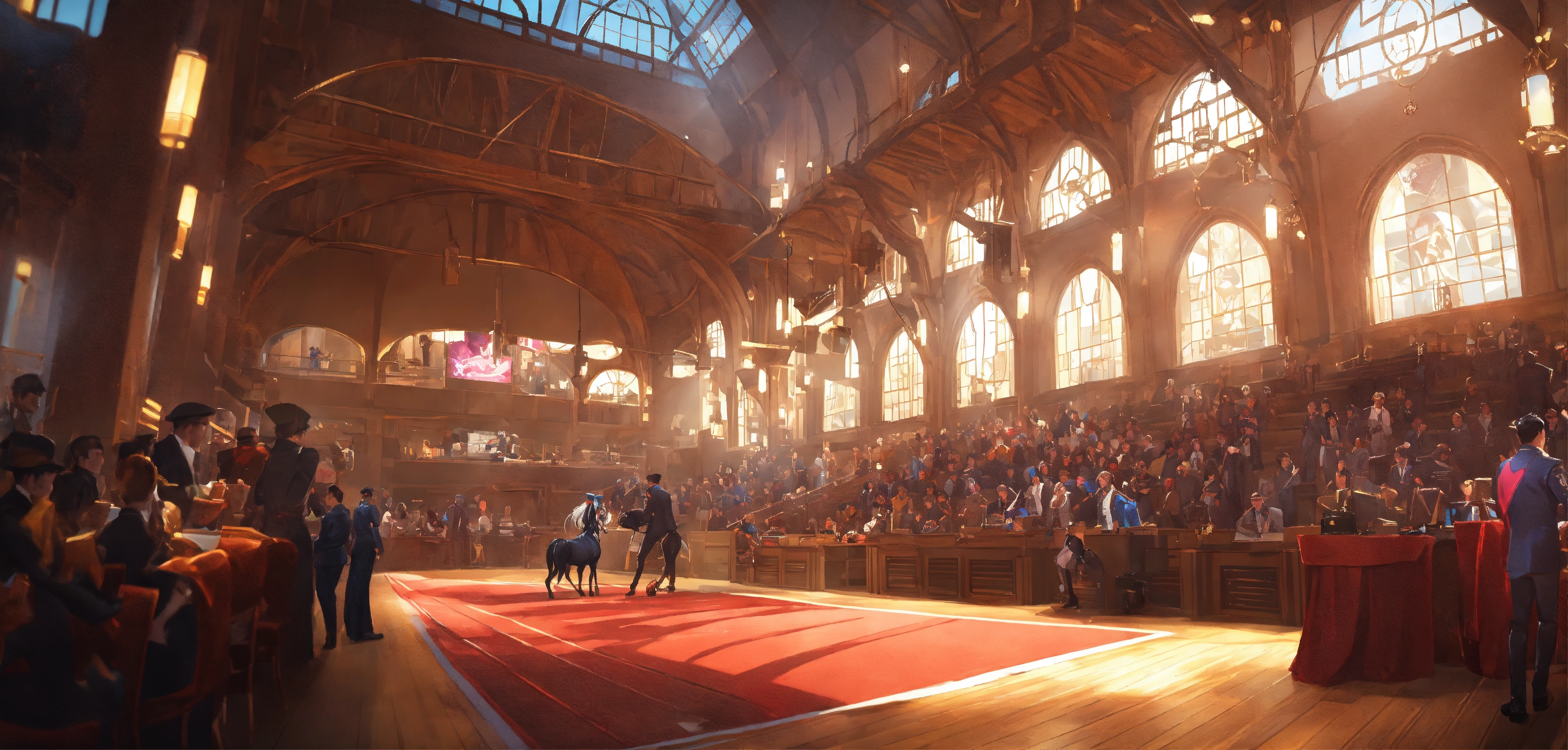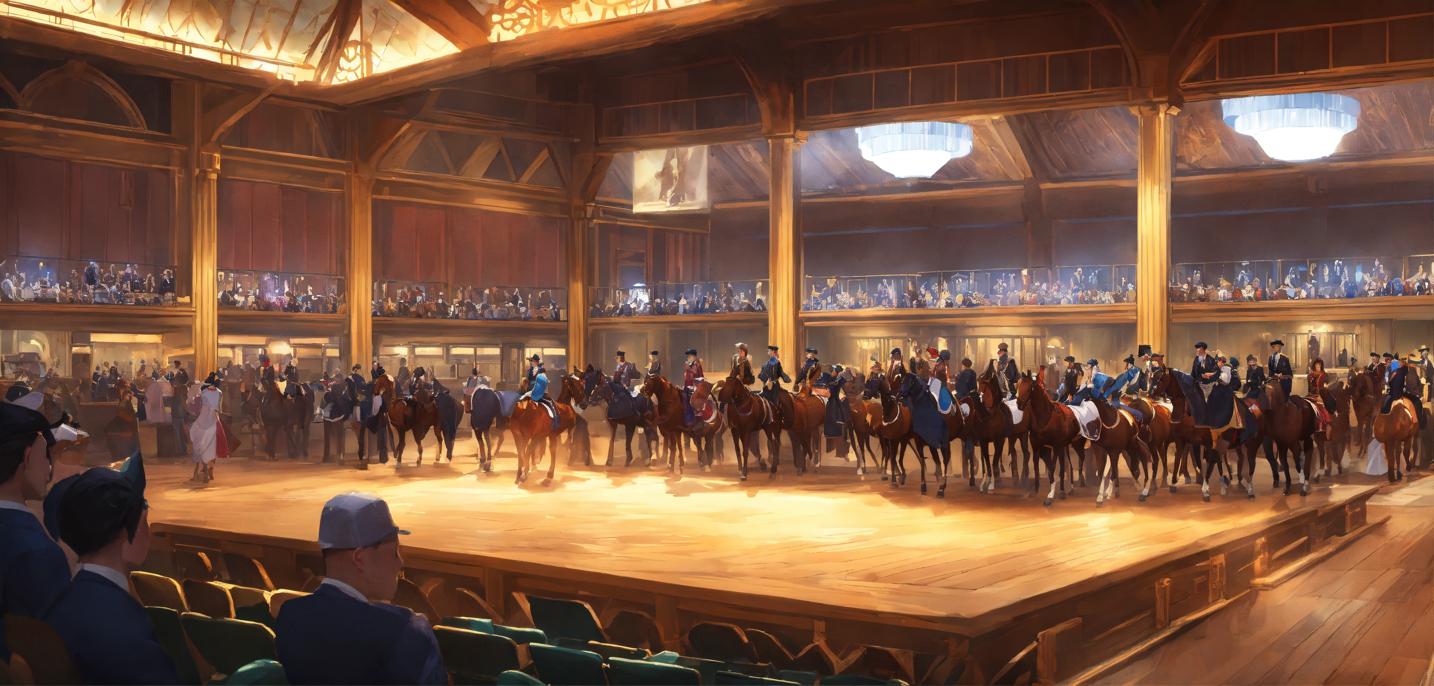 A highly detailed league of legend dynamic illustration of the horse auction in modern event hall by joshua raphael, by artgerm, by huyy nguyen, by cj xander, by jennifer wuestling, by diep duong van, by huyy nguyen, by grafit studio, volumetric lighting, 3d render, 4k resolution, trending on artstation, masterpiece, close up frame, cinematic shot, sport competition, epic, keeneland sales, inside hall with stands, lot of armchairs with people, one horse in centre only, evening, hall without windows
