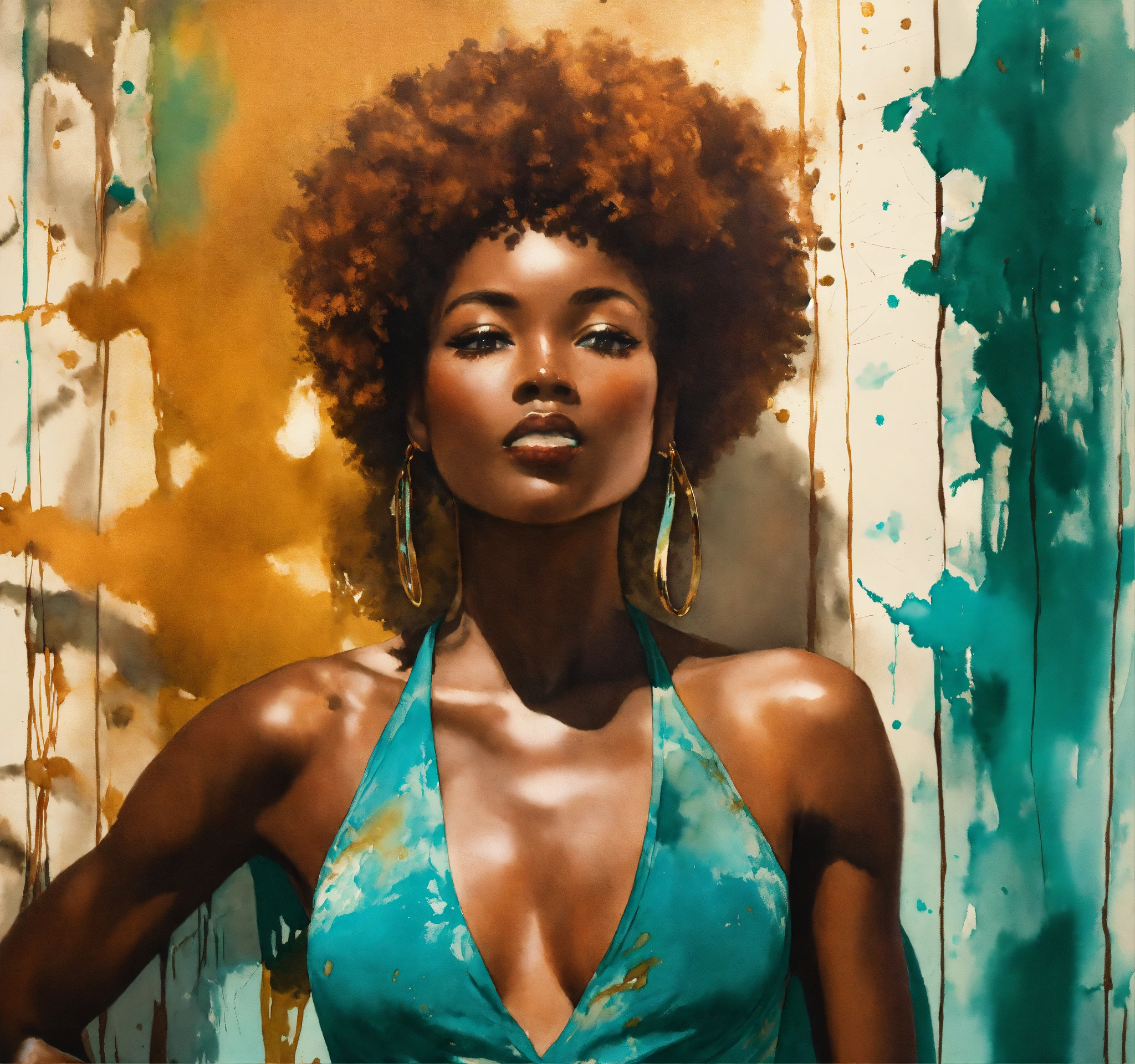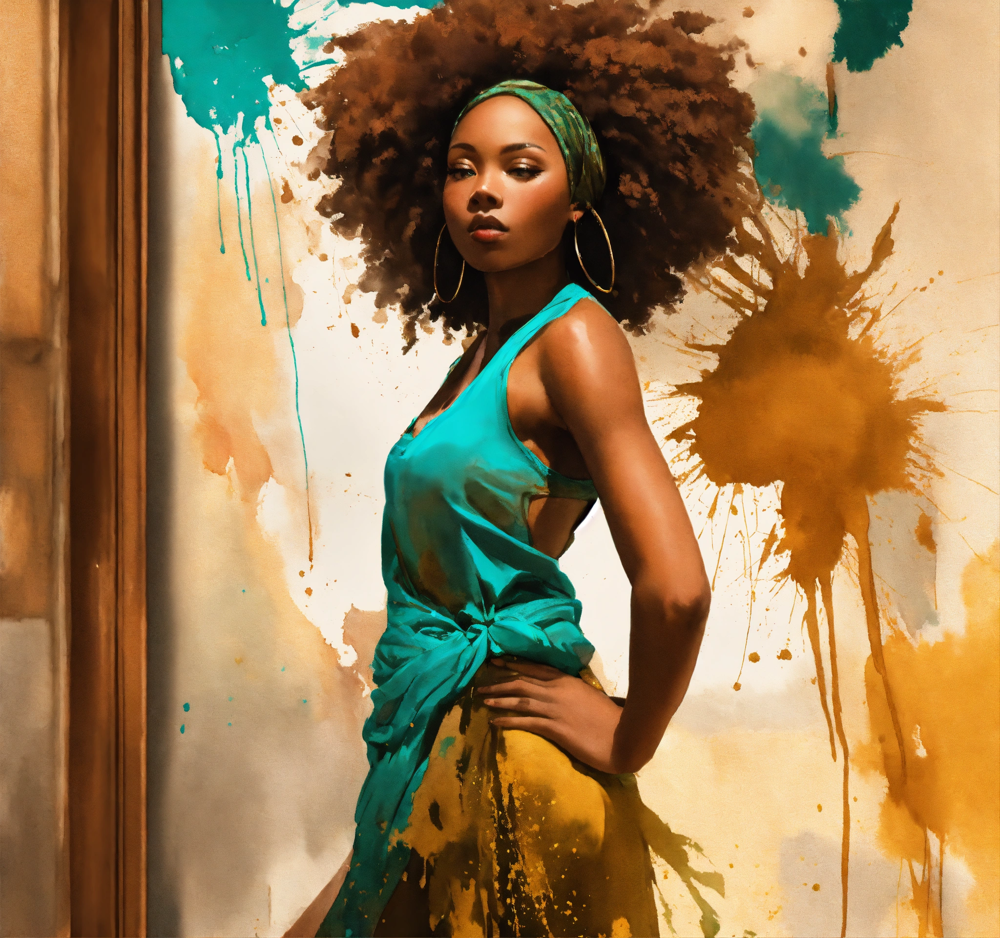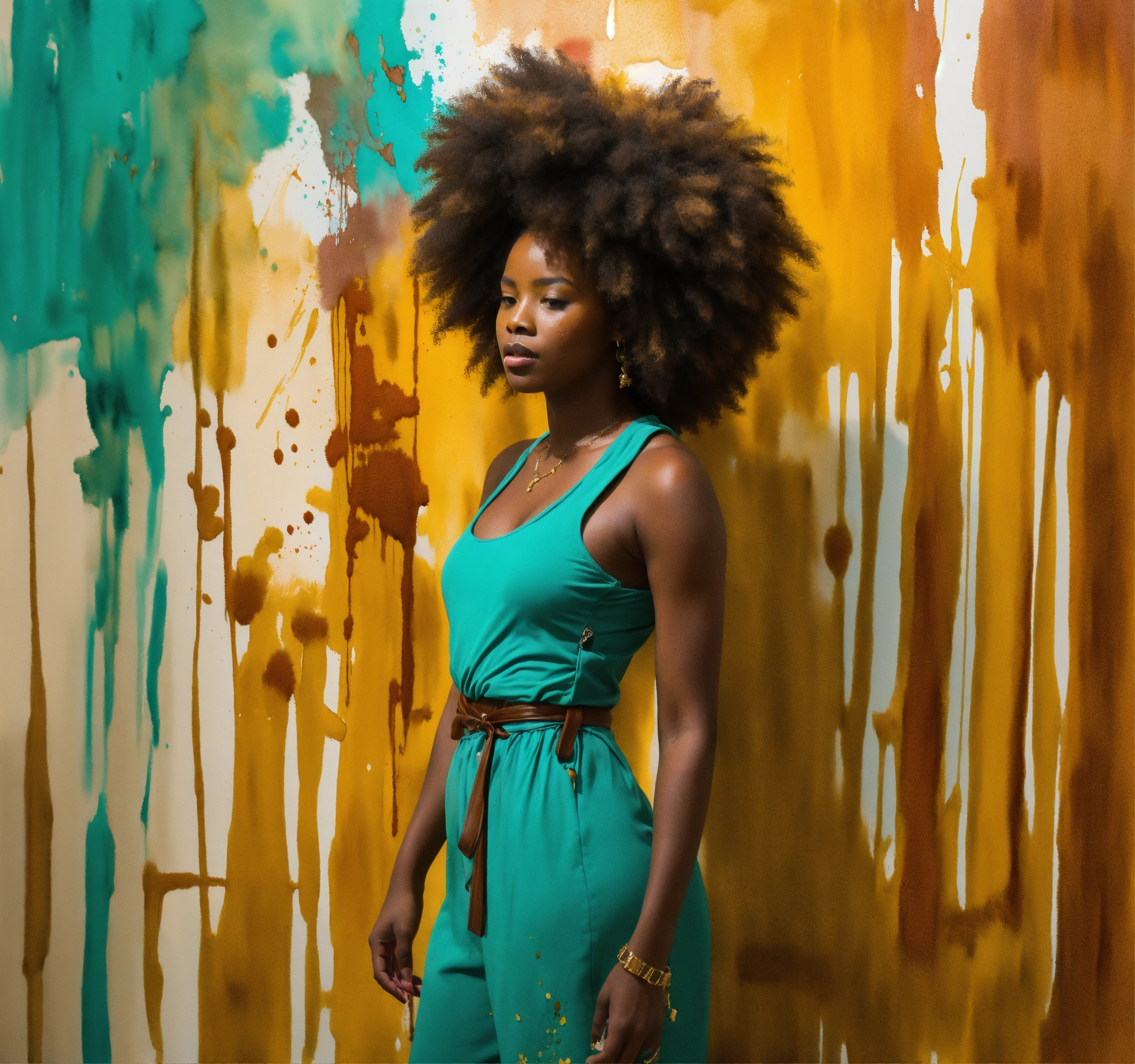 Action shot breaking through a gallery wall a beautifully majestic afrocentric woman holding on with dear life to the reflection of herself standing next to the wall to drag back towards herself, color palette; turquoise rich mahogany burnt umber mustard shades of verde, rule of thirds, watercolor paint splatter