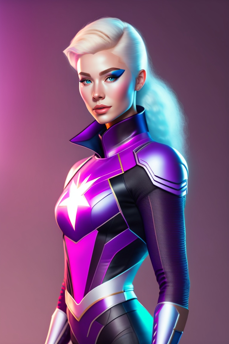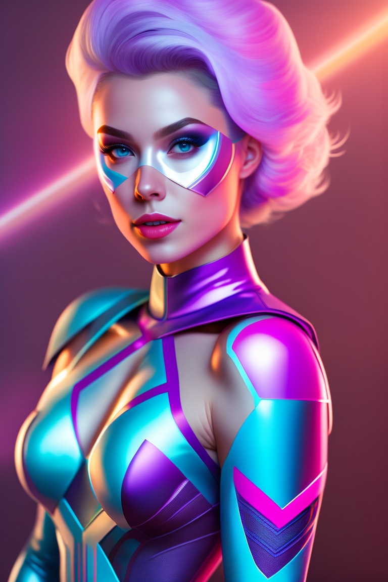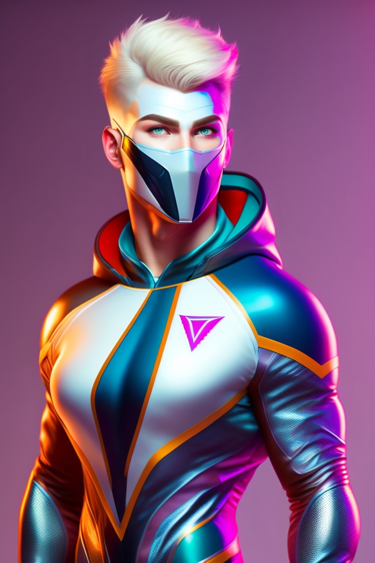 Pretty young man masked in a spider-gwen costume, with feminine curves, with a blonde side-shaved haircut, full body portrait