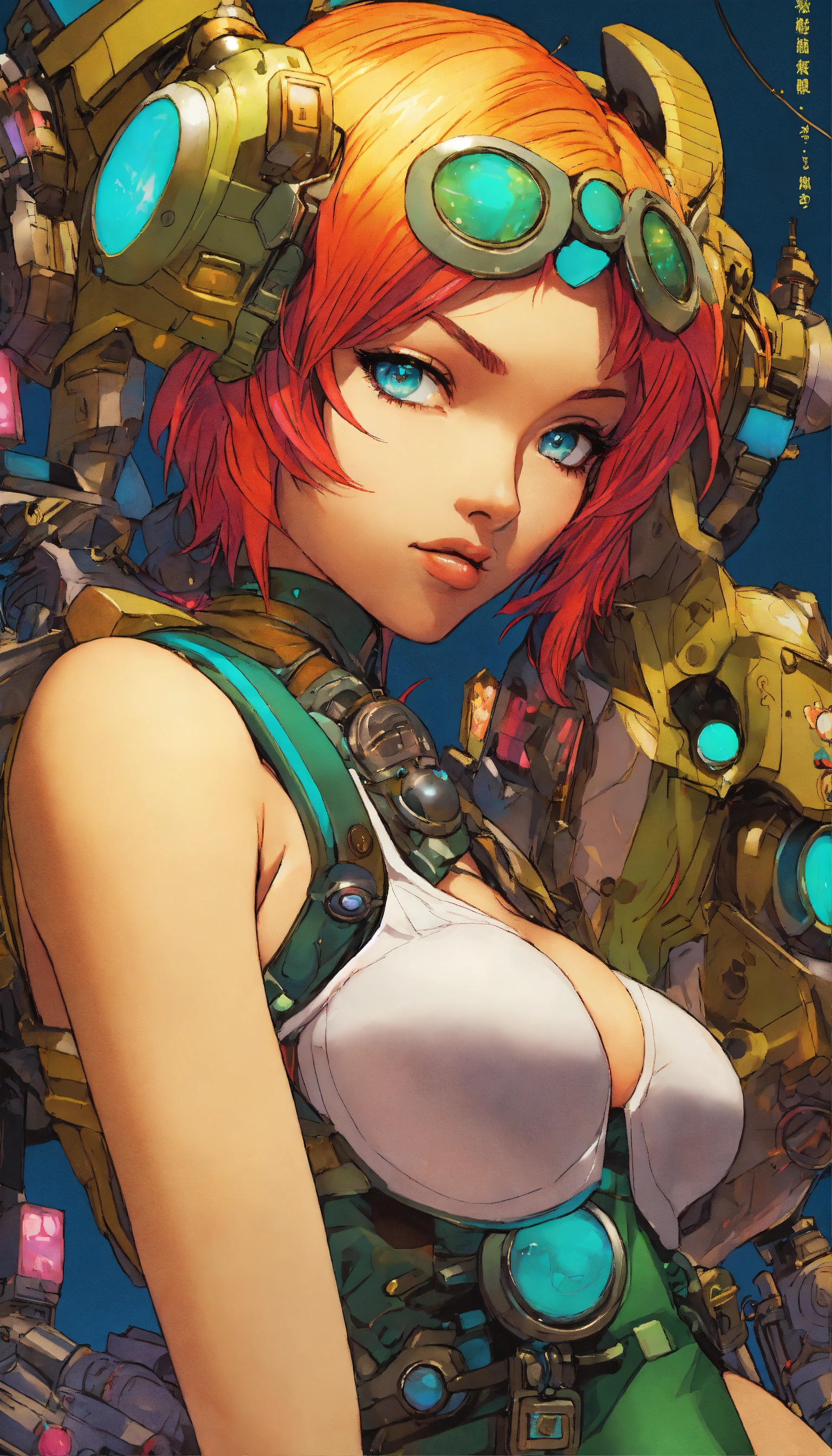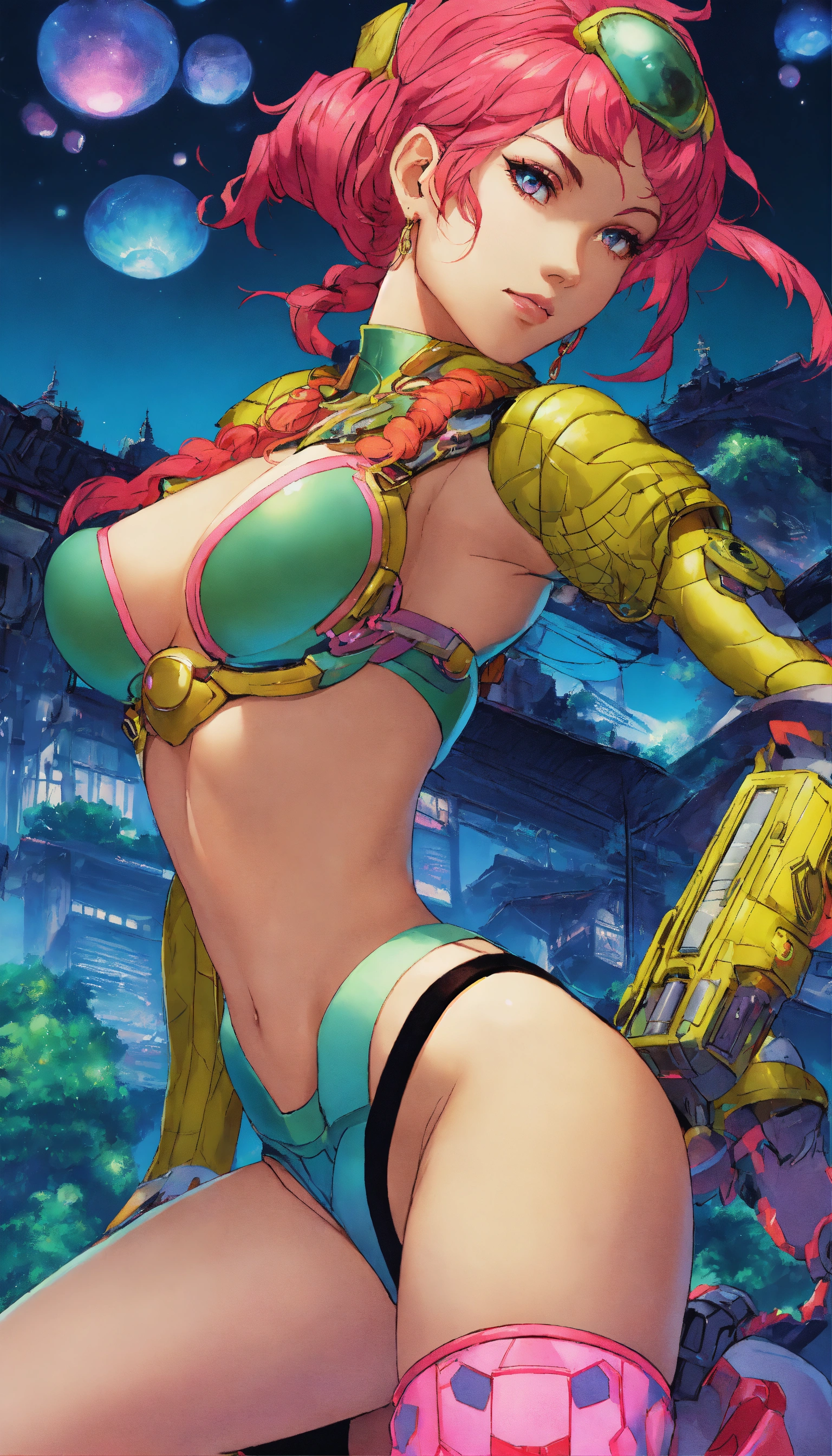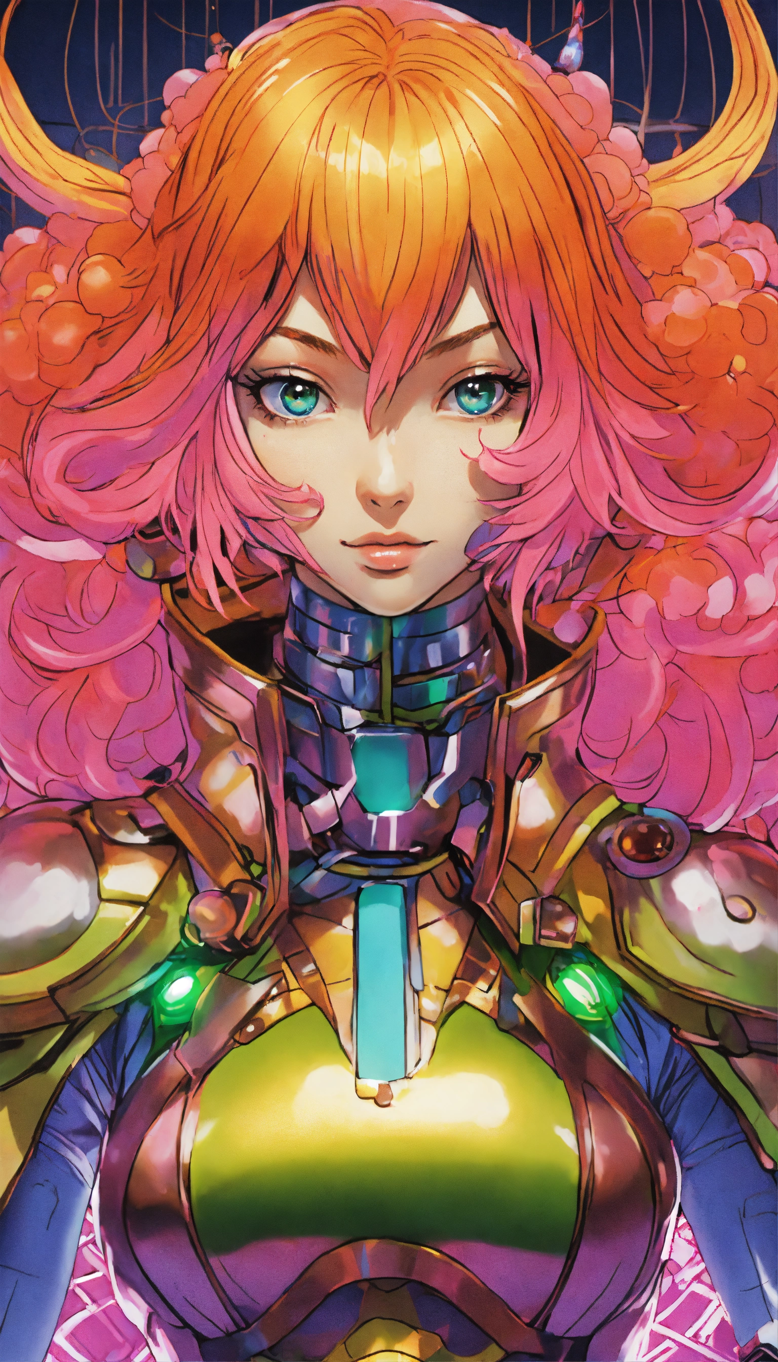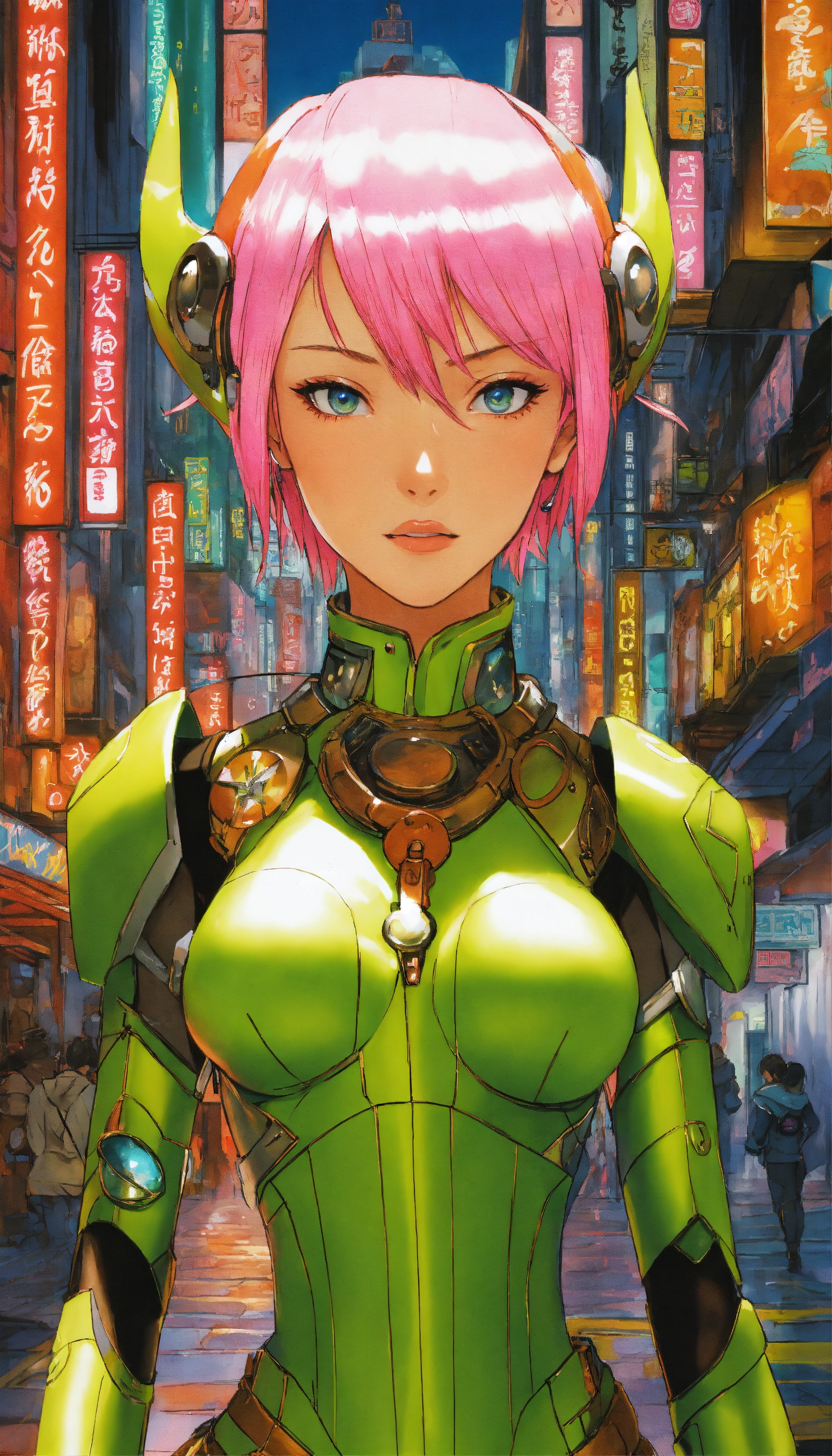 2000s utopian alluring seductress with neon hair and biological armor, full detailed eyes, toriyama, miyazaki