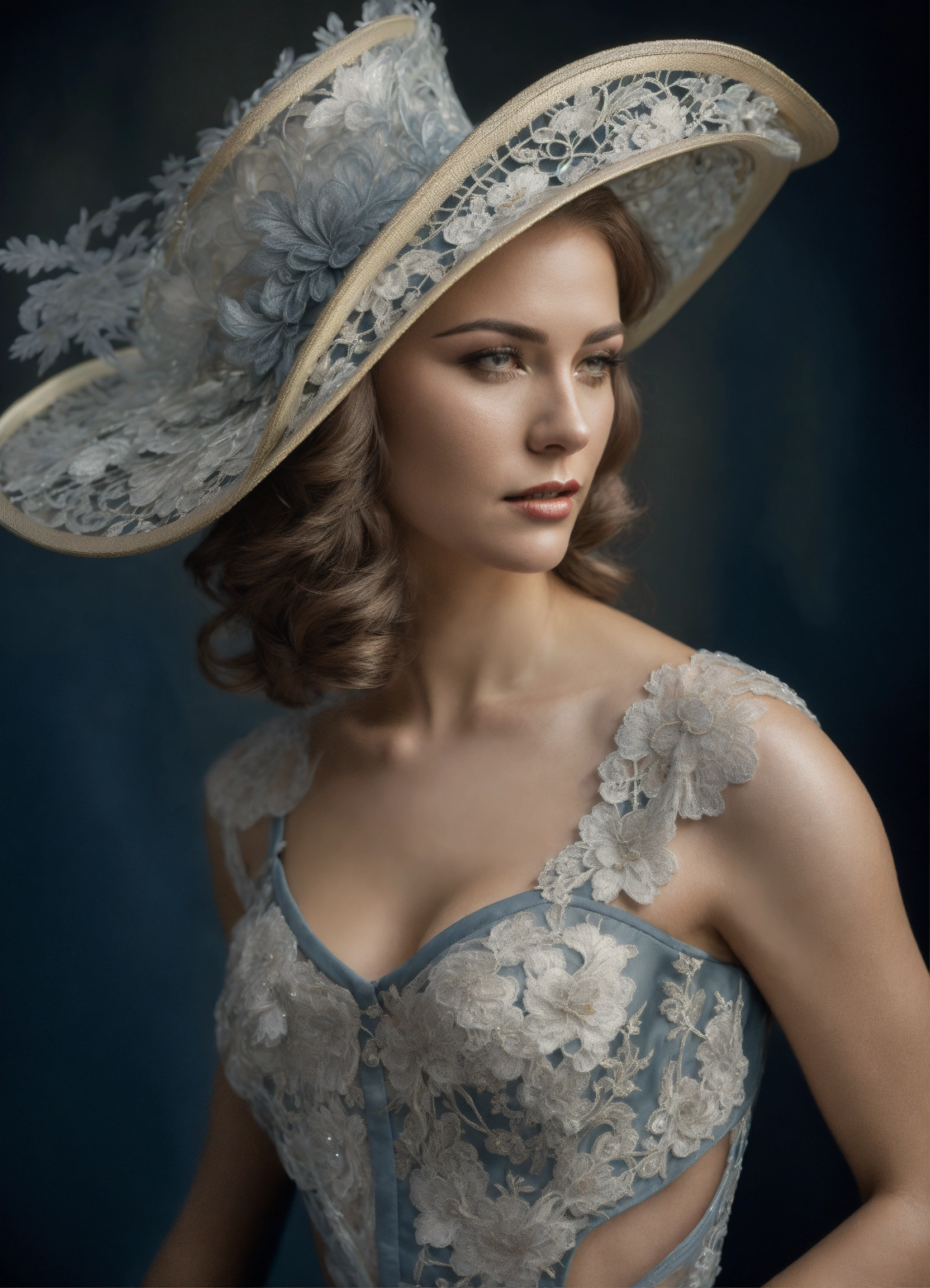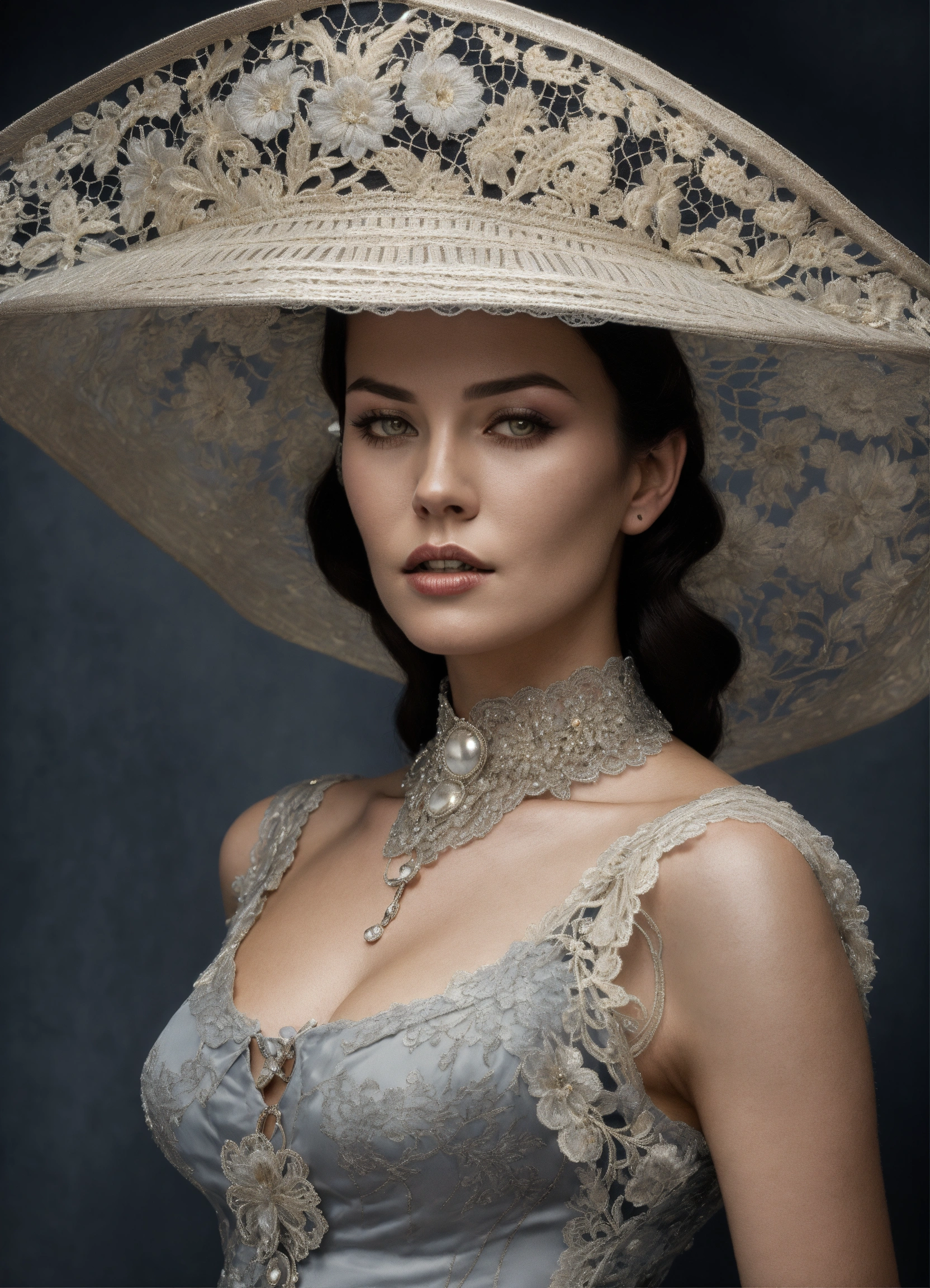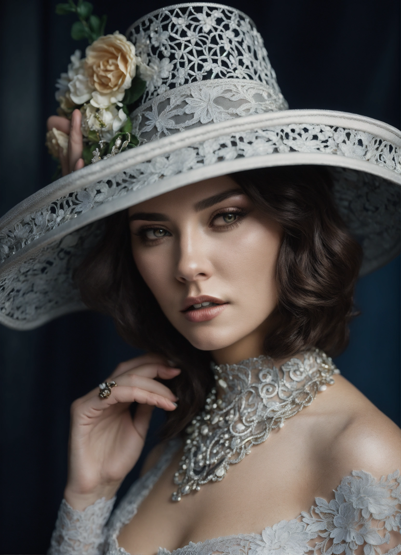 A woman wearing luxurious silver tatted lace hat with large brims in the style of liam sharp, dutch tradition, webcam, gail simone, mark seliger