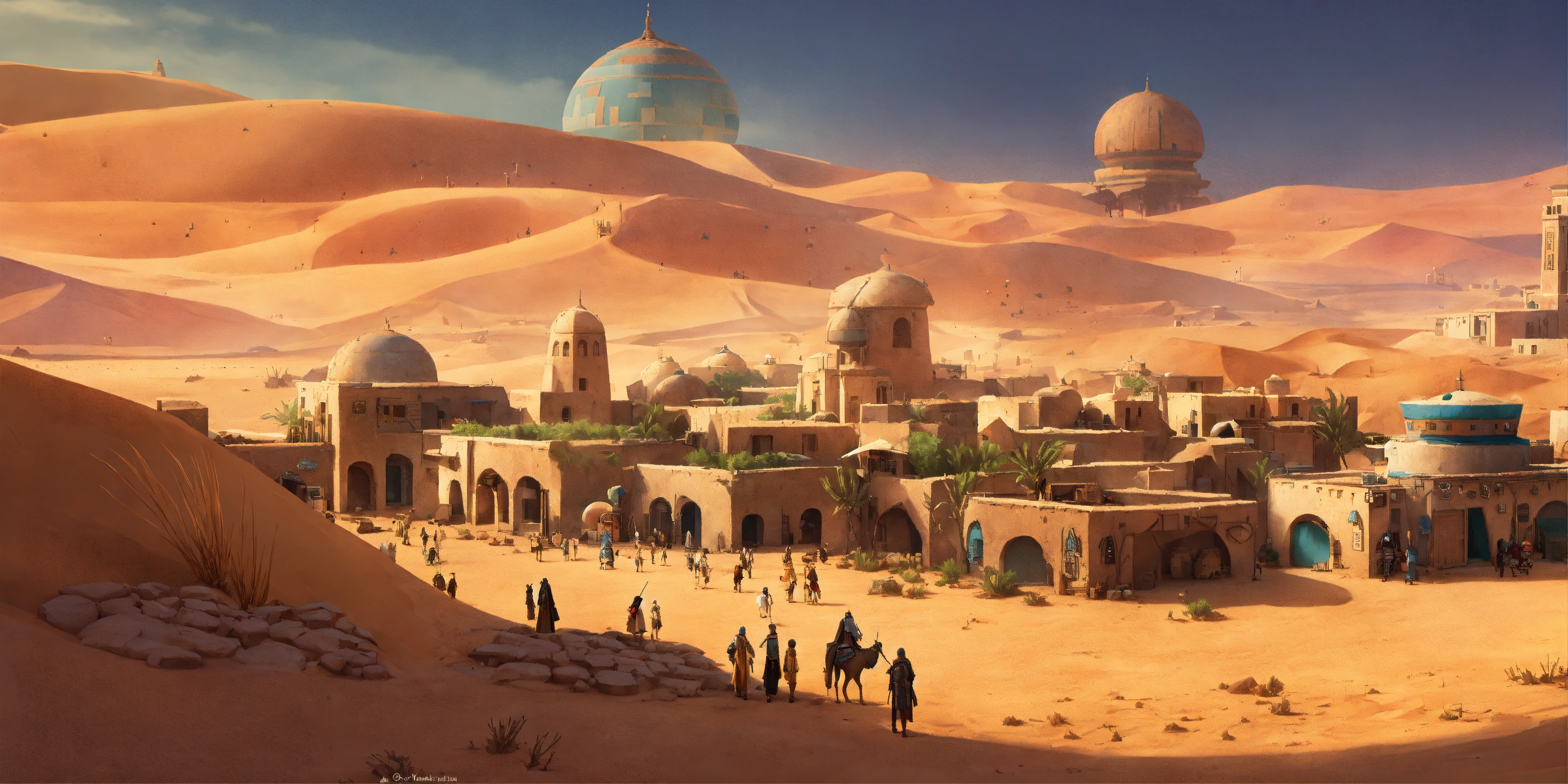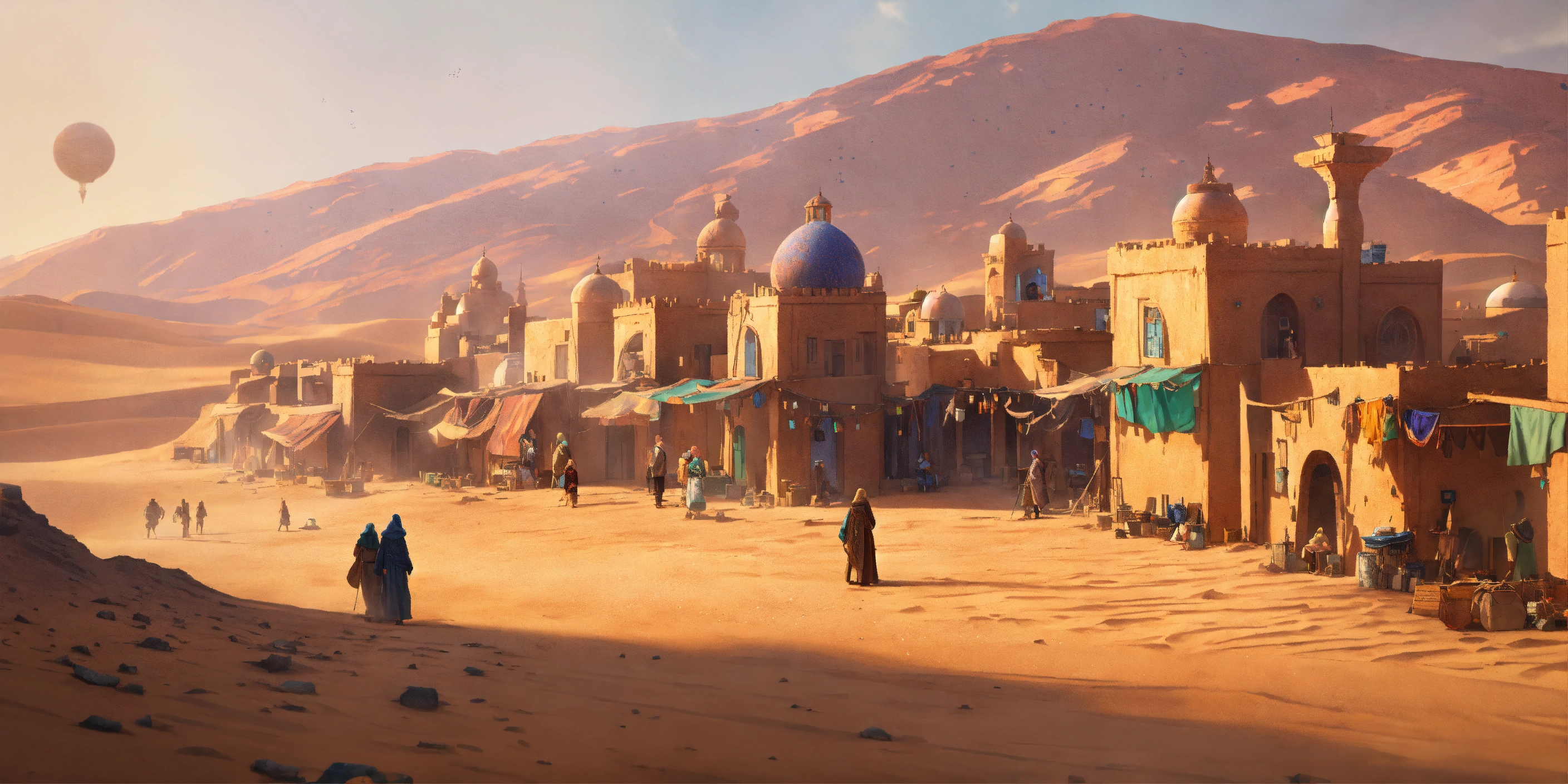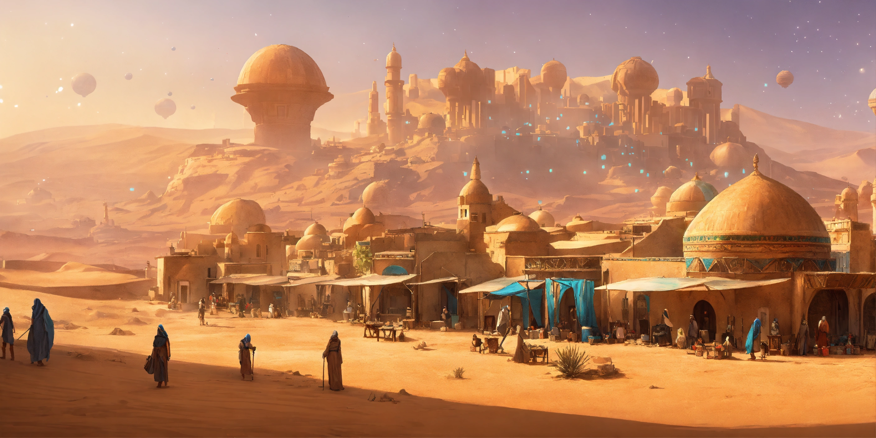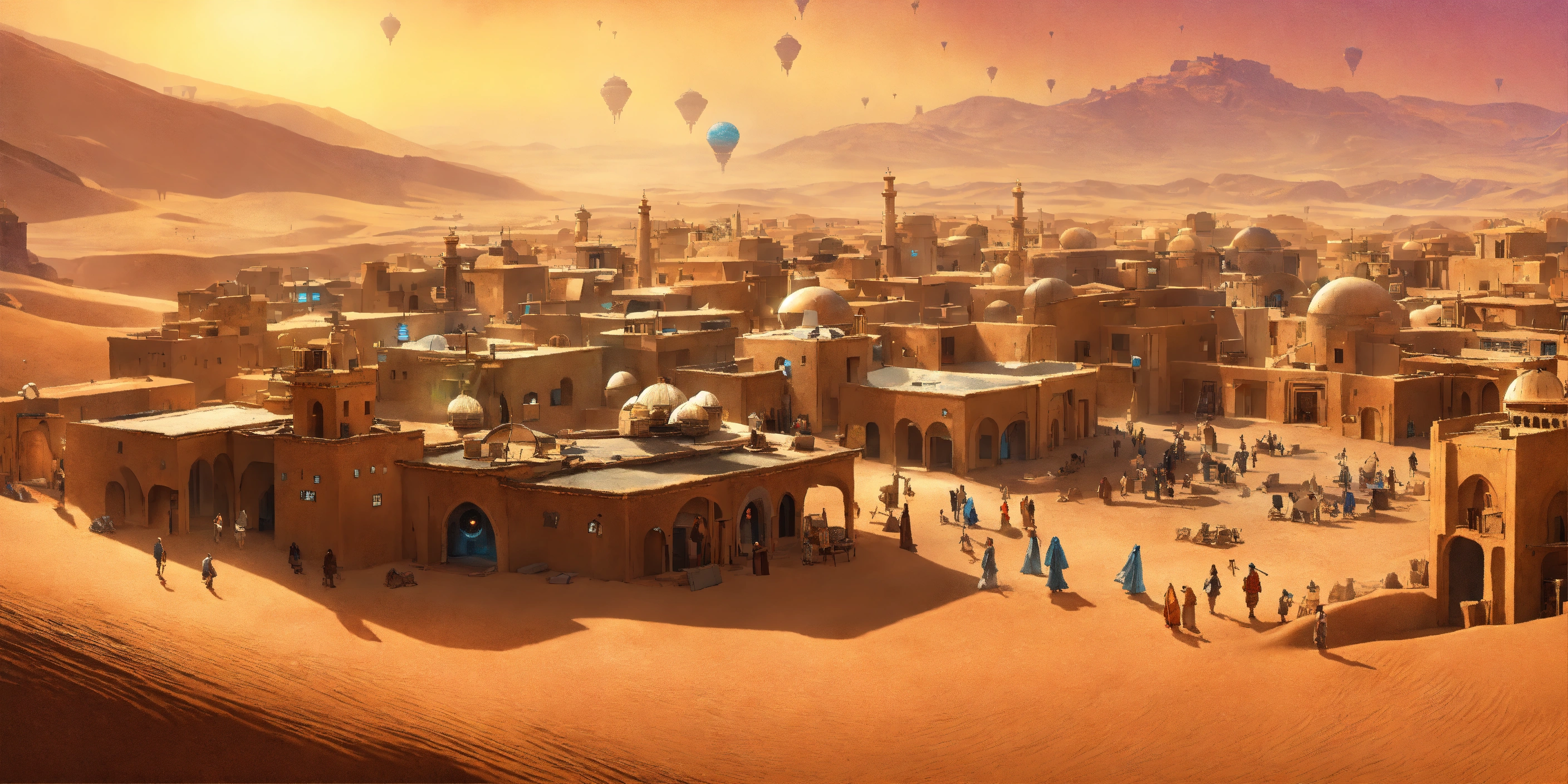 Concept art of a large desert village town, jakku, desert, huts, buildings, star wars, peasant, survivor, charming, moroccan town, desert planet, multicolored patterned textured fabrics on the buildings, ombre moroccan, peasant, starry desert planet outside, star wars, hanging beaded, moroccan fairy lights, view from above, stucco walls, patterned design stucco walls, windows without glass, windows have moroccan pattern flowing curtains, different alien villagers walking around, beautiful, adobe, sand dunes, alien desert planet, stranded, adobe town, star wars, realistic, intricate, 3d, detailed, scavenger, shops and buildings and stores and vendors, cluttered, clutter, messy, different ragged alien peasants walking around, scrappers, jakku, colorful moroccan village, mandala, star wars aliens, huge sprawling city, aliens, alien animals