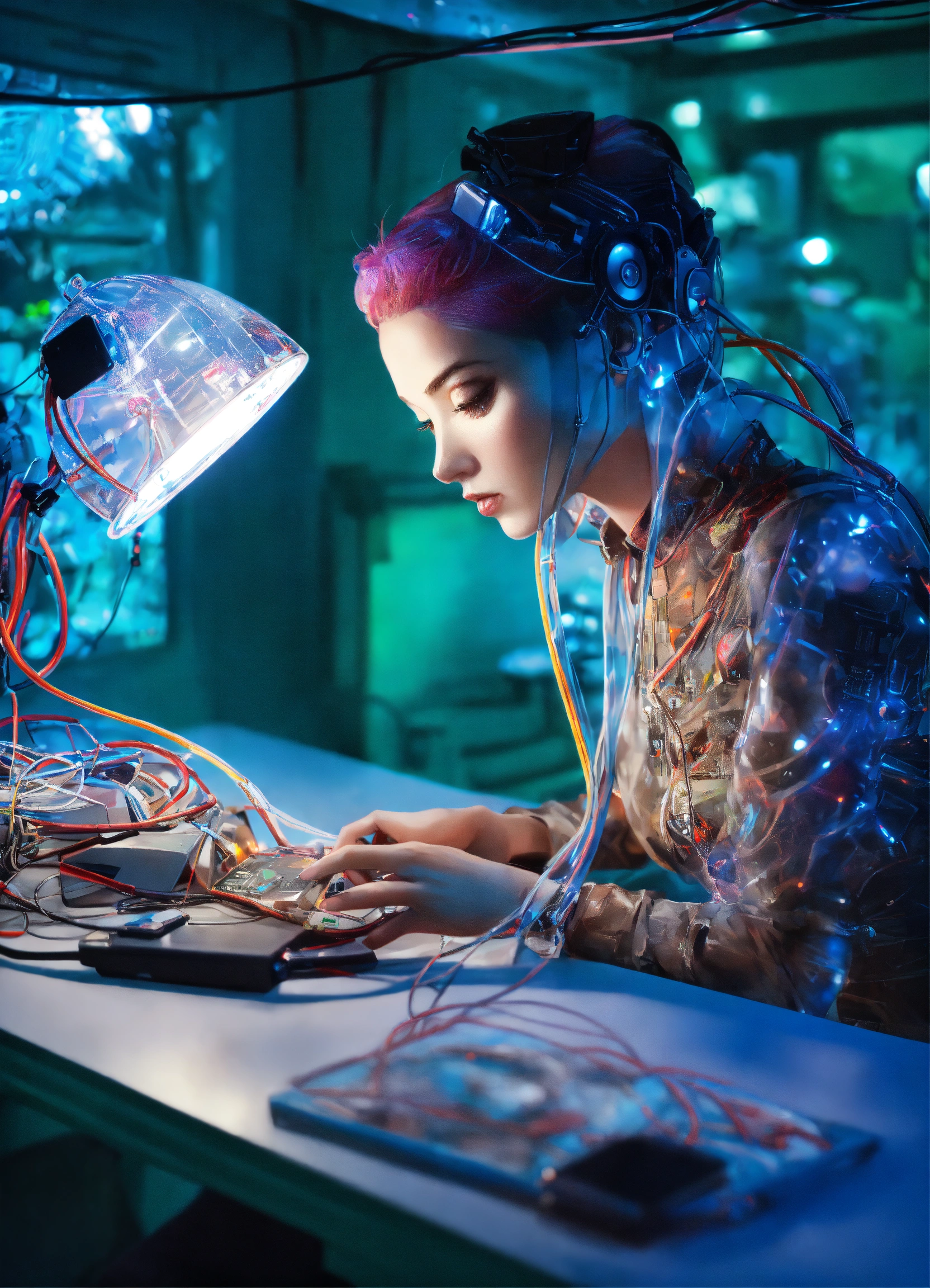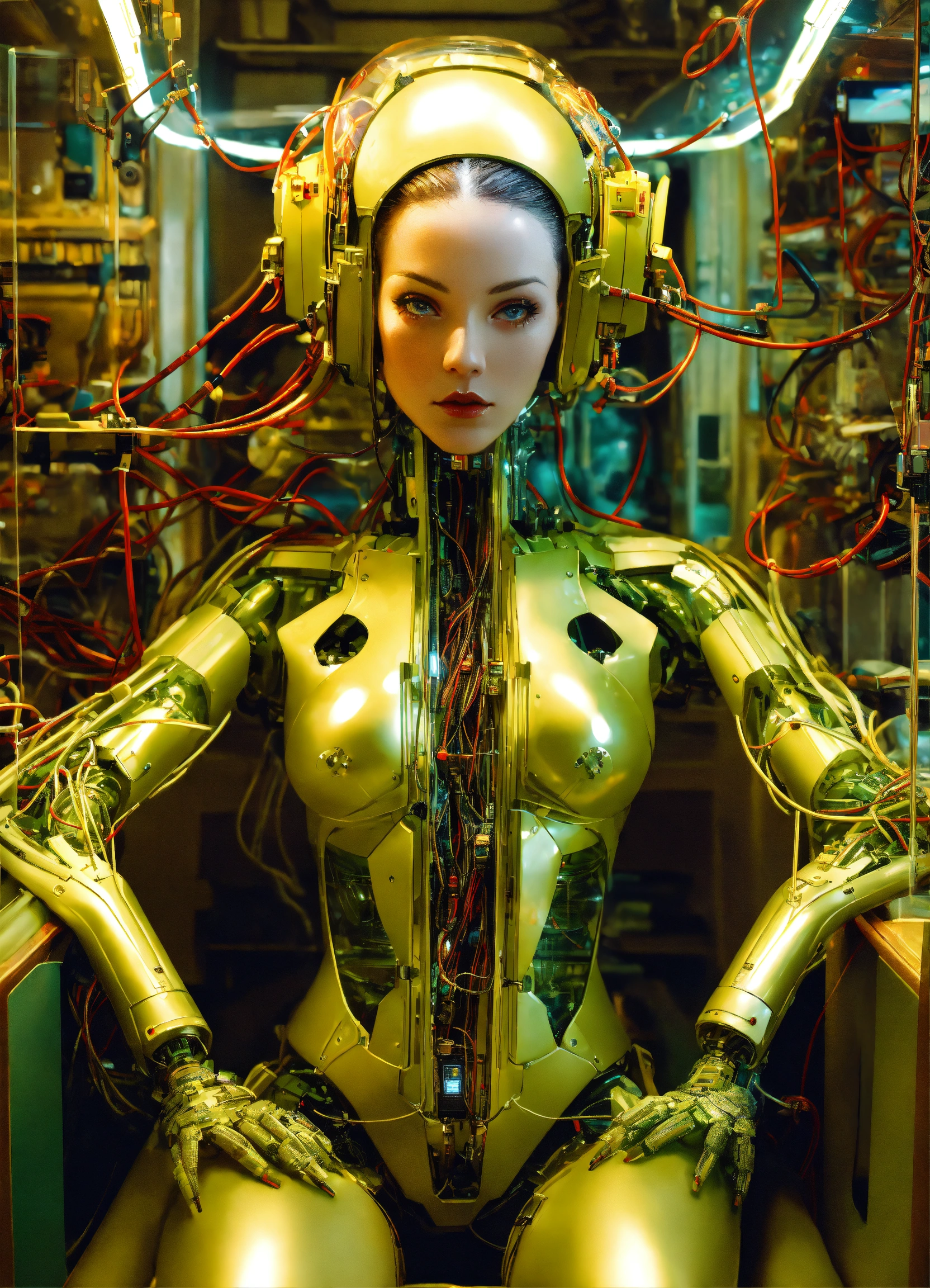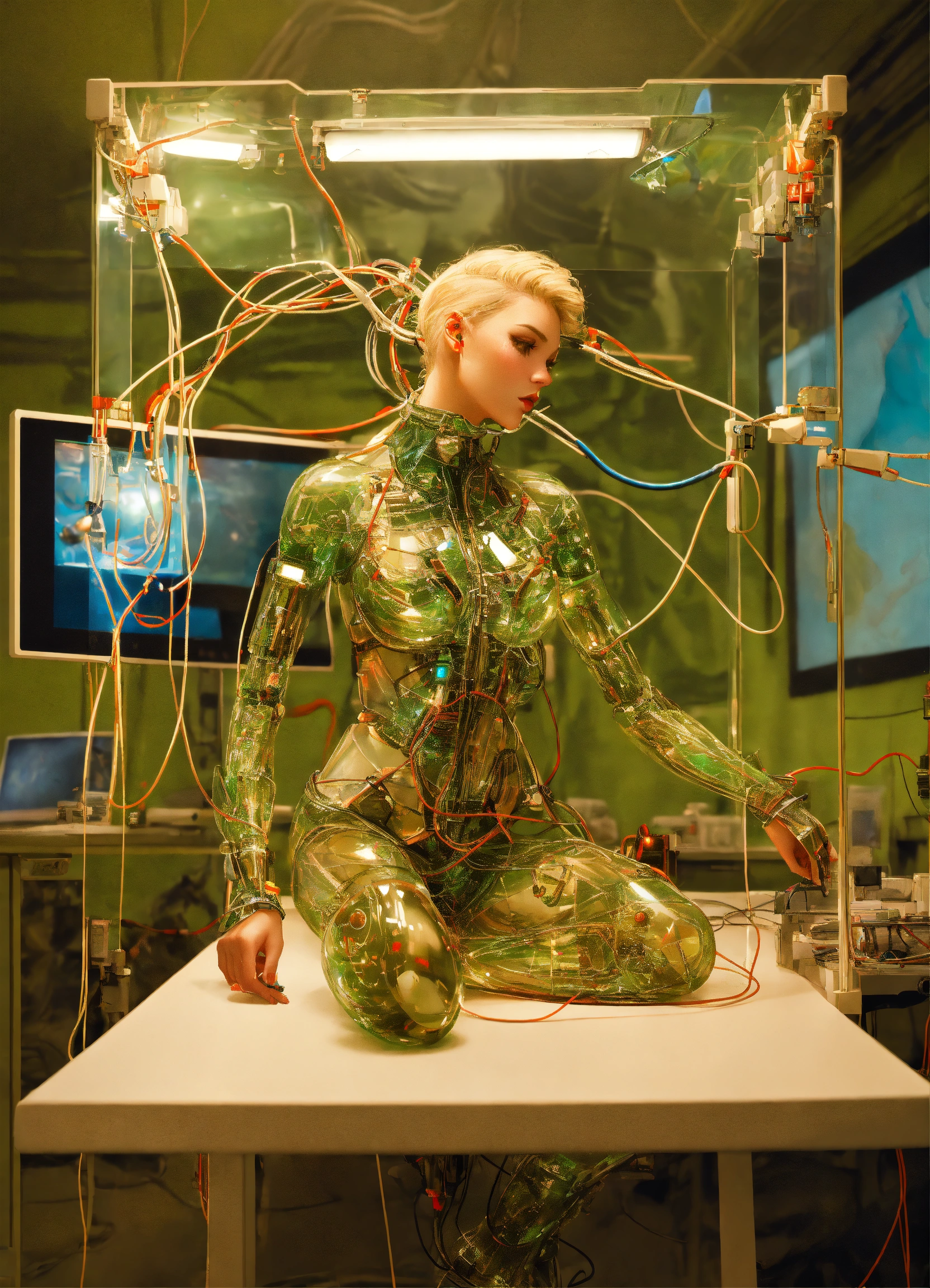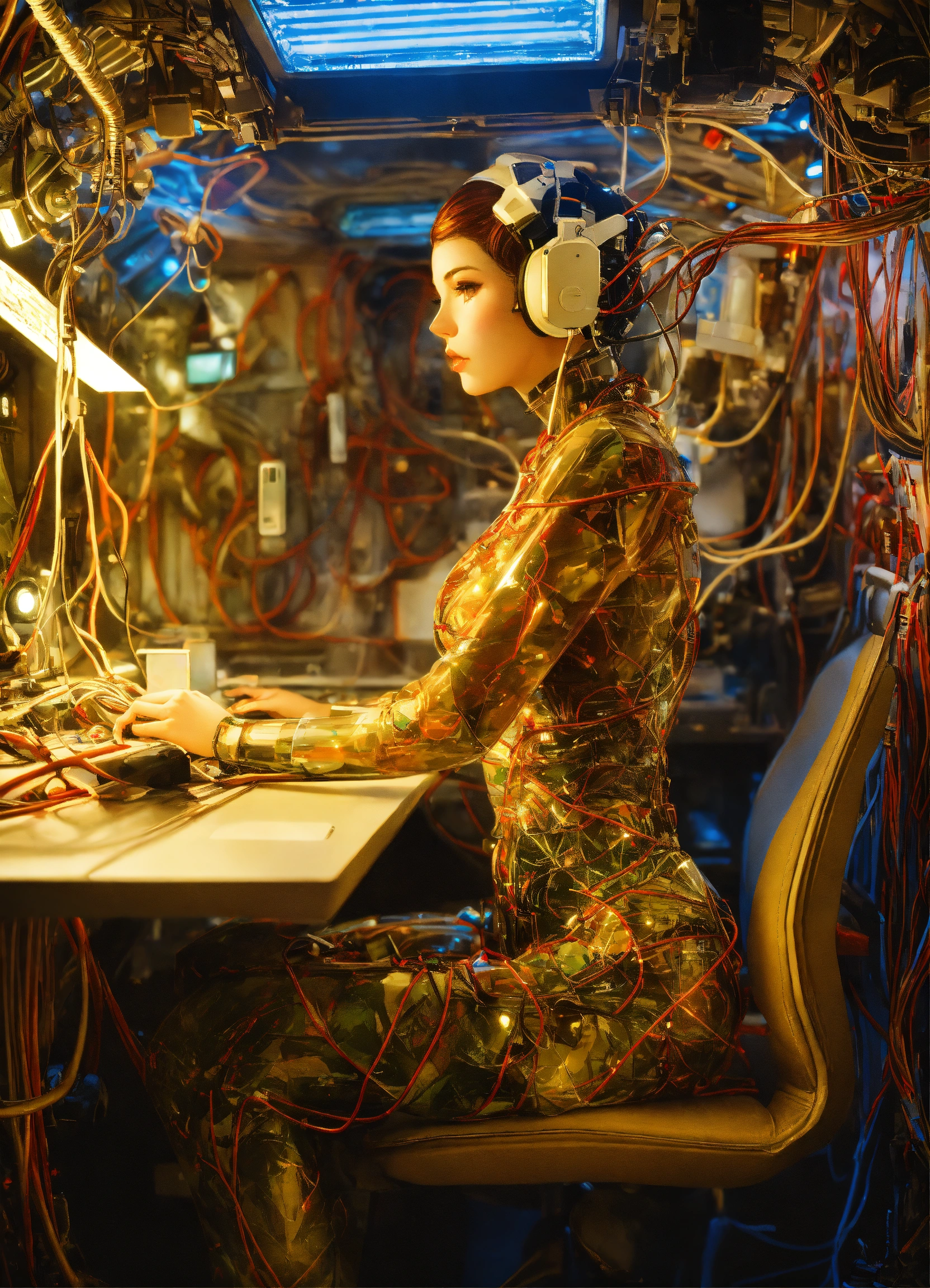 Body portrait photography, in an army spaceship full of cables and wires and led, driving a carbon motor head attractive transparent plexiglass army camouflage design skin tone android robots, watching her mobile phone at her desk, 80 degree view, art by sergio lopez, natalie shau, james jean and salvador dali