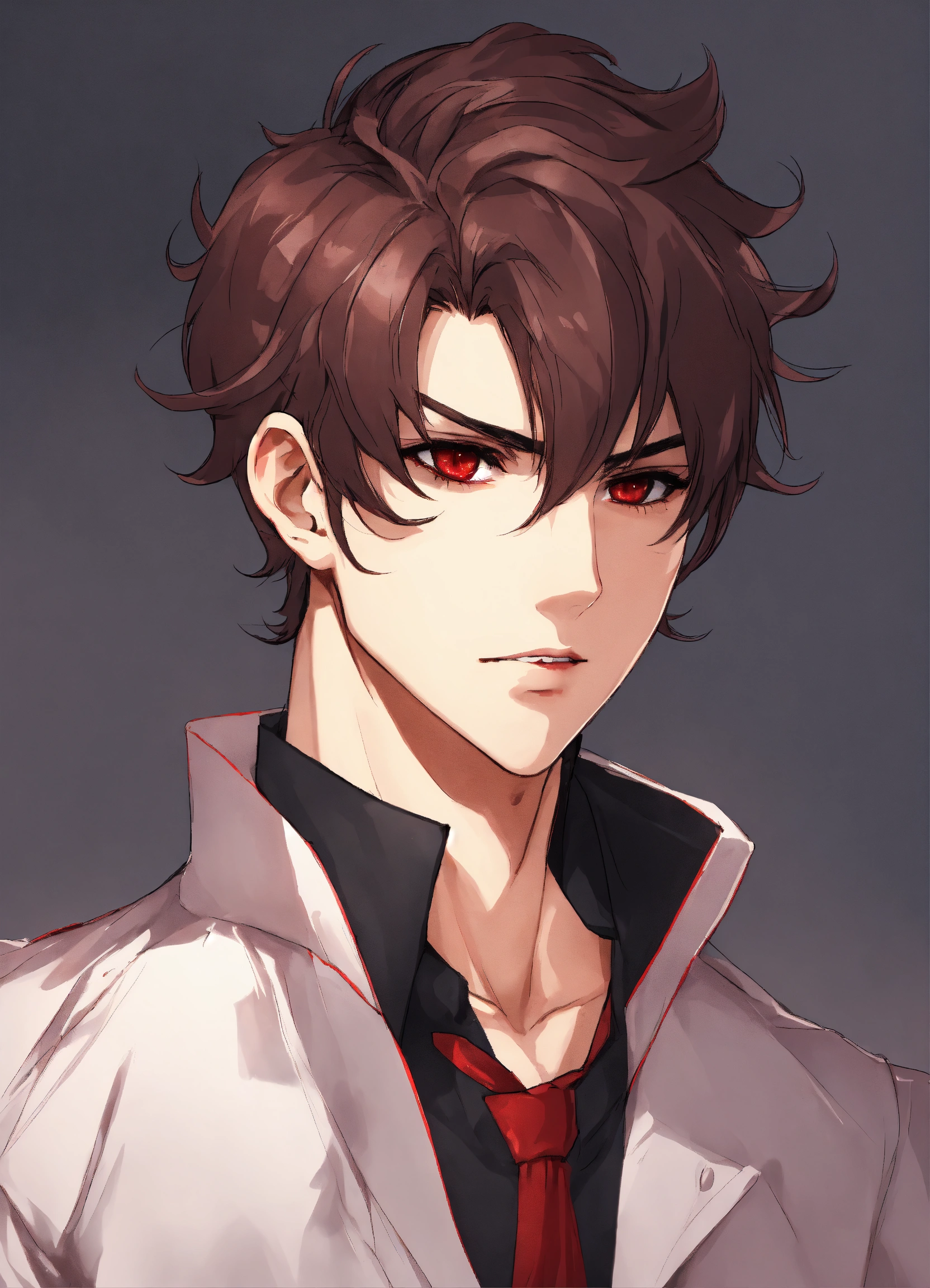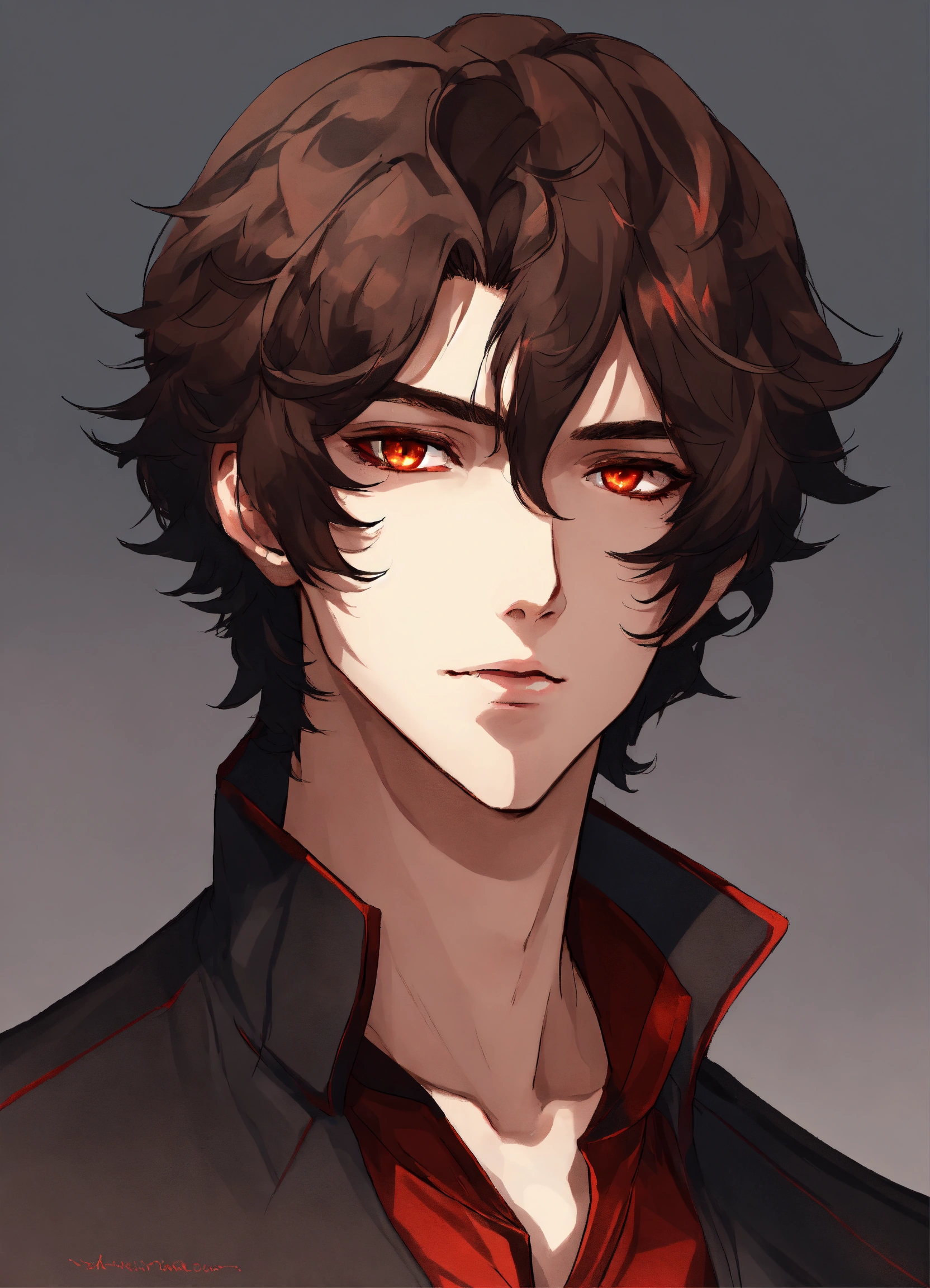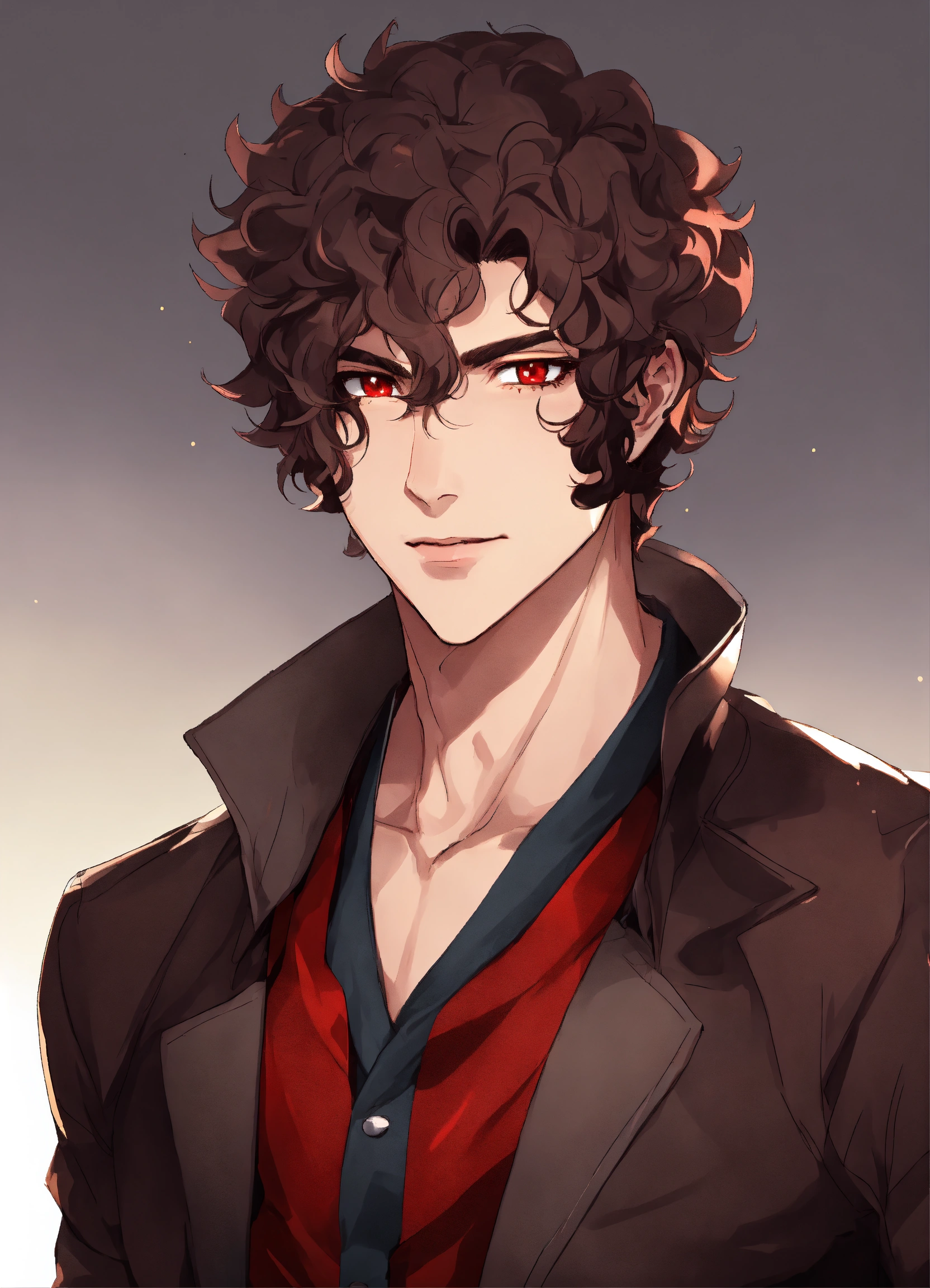 Man 30 years old. dark brown, short, curly hair. sharp facial features. eyes are red. height 180. vampire. anime reskin style