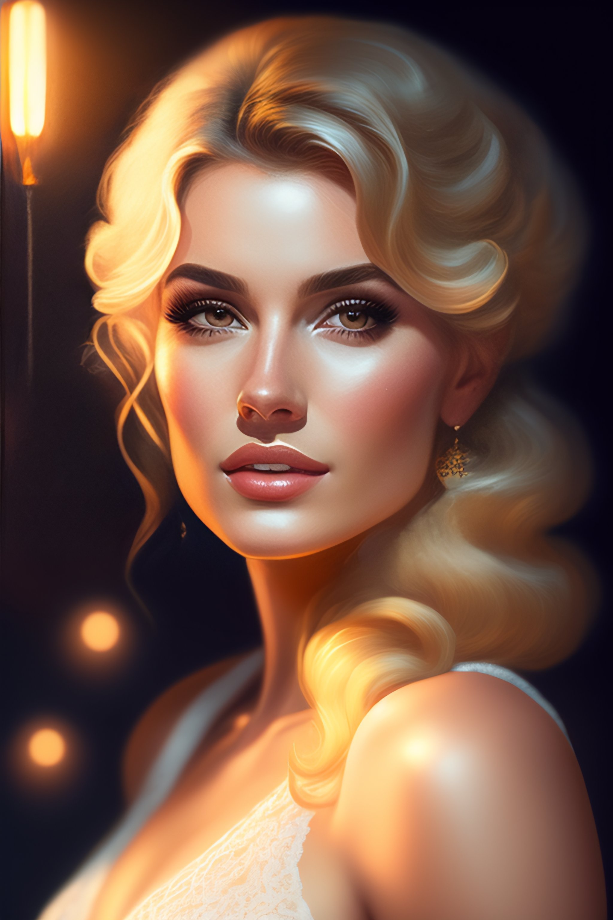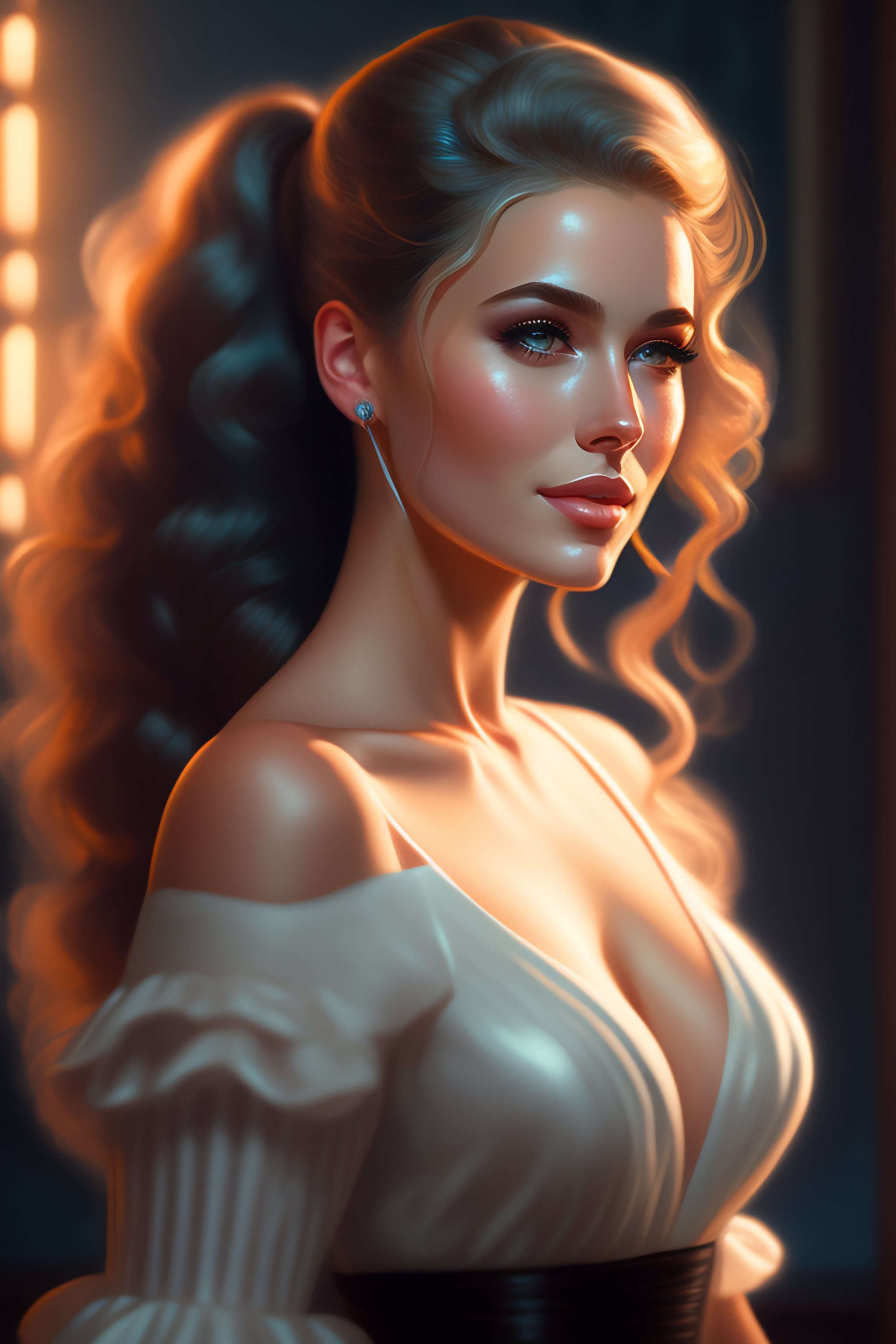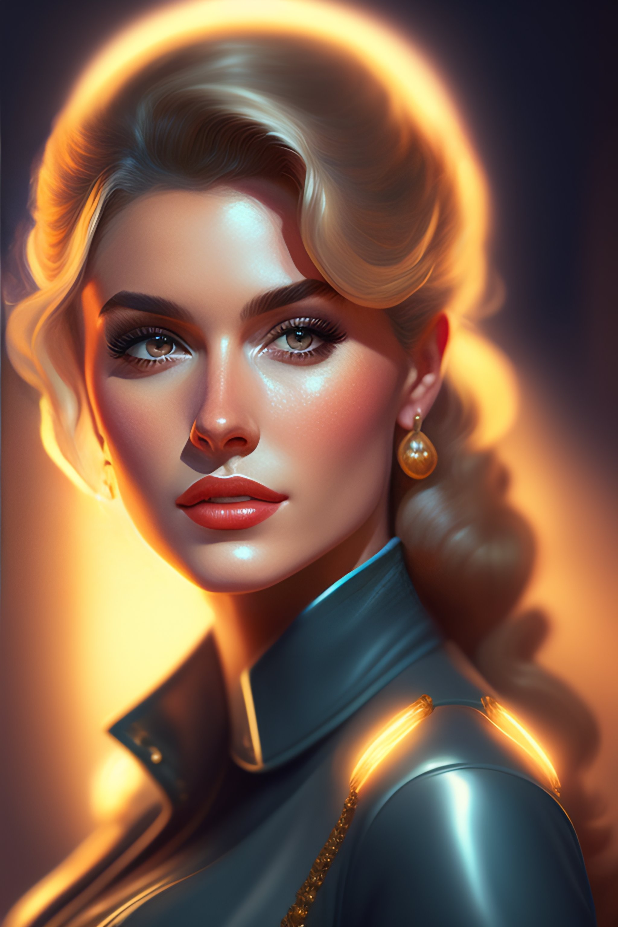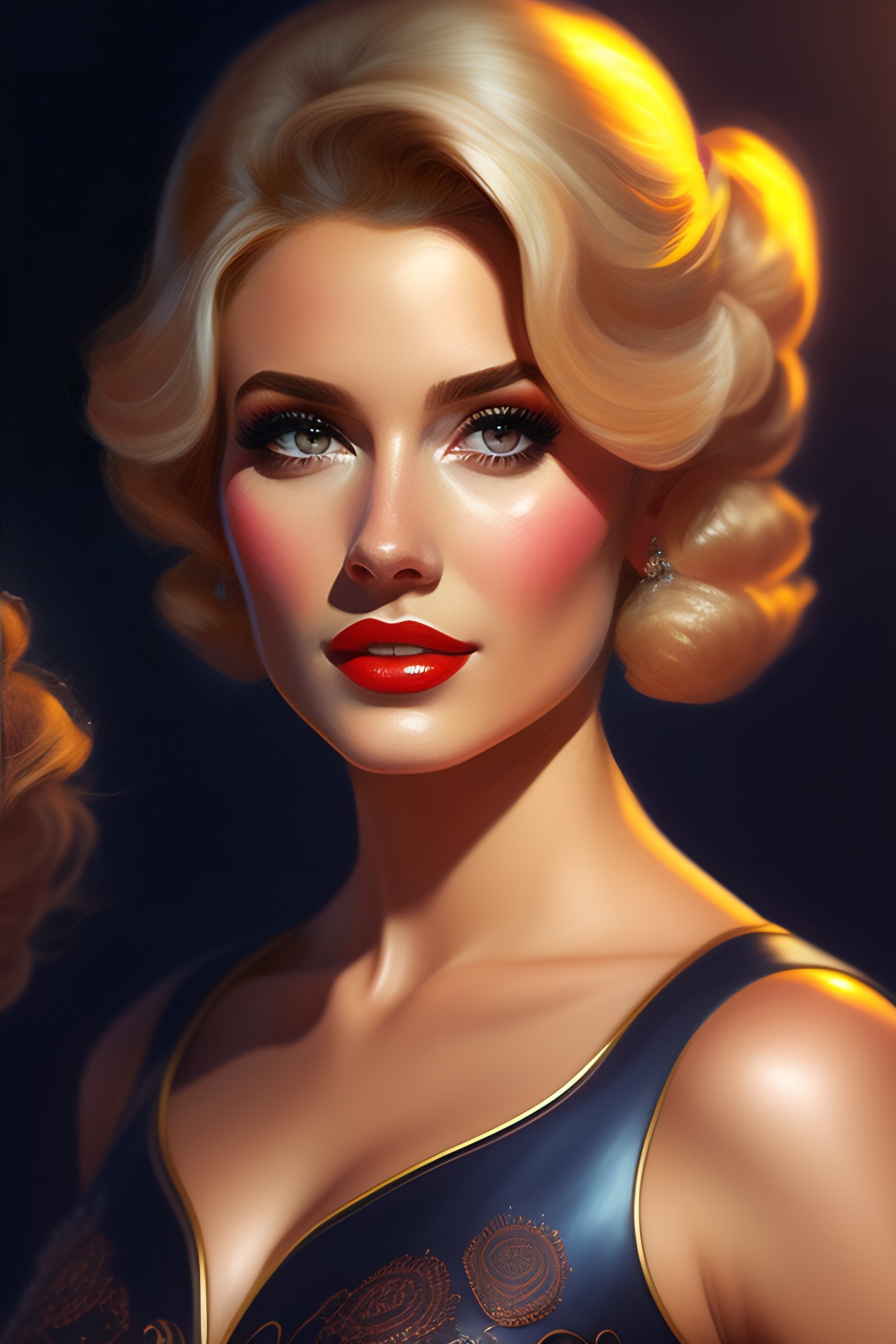 Portrait of betty cooper with fluffy bangs, bangs, 1 9 6 0 s, ponytail, curly bangs and ponytail, rounder face, intricate, elegant, glowing lights, highly detailed, digital painting, artstation, concept art, smooth, sharp focus, illustration, art by wlop, mars ravelo and greg rutkowski
