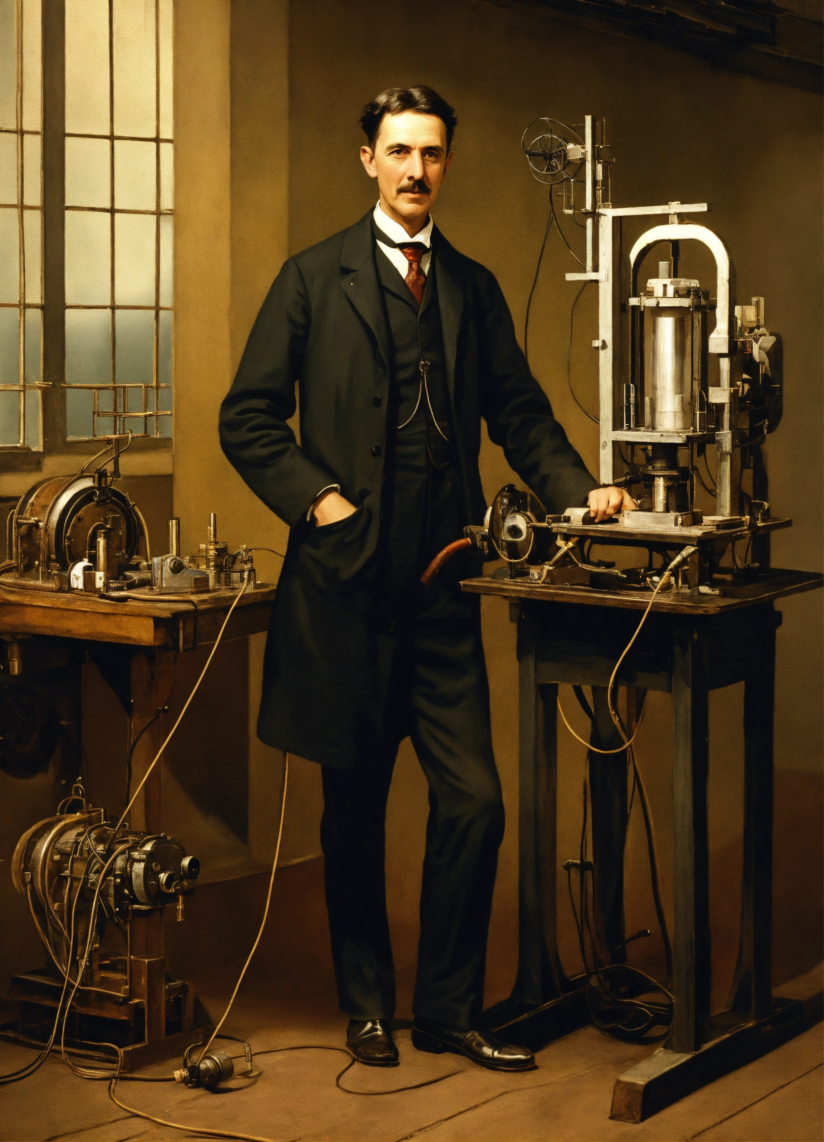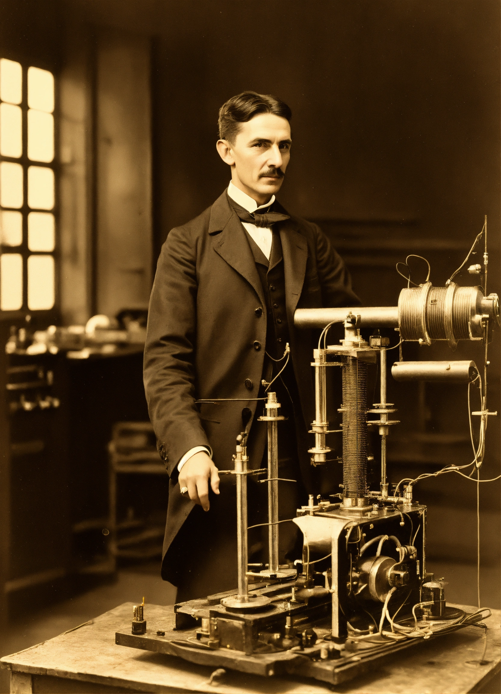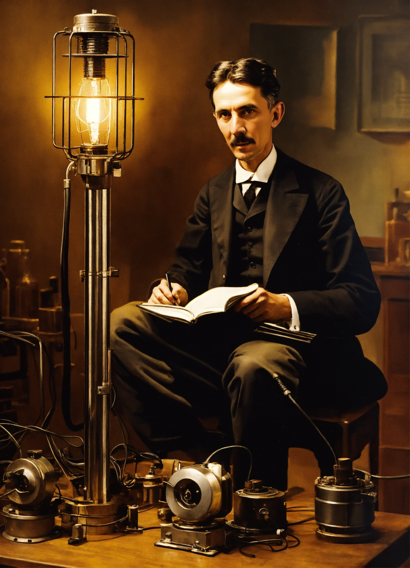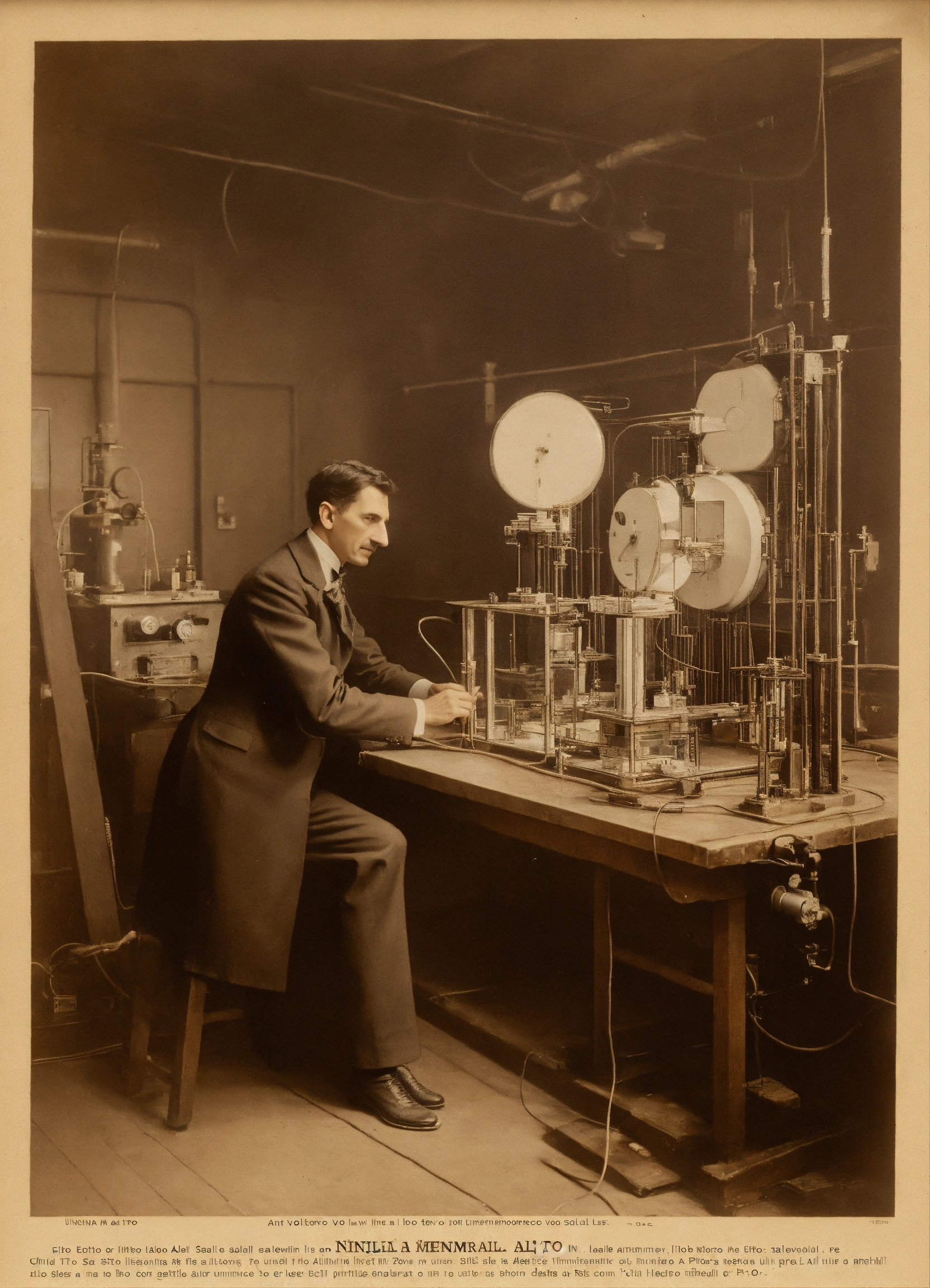 Nikola tesla en laboratorio electrico, con rayos electrostáticos saliendo de una bobina brillante de energía radiante.que se trata de una bobina helicoidal, un inductor resonante de forma vertical alimentado por la conmutacion del polo negativo de la bateria sobre el primario de un transformador de alto voltaje para producir en su salida un tren de pulsos unidireccionales negativos de electrones spin down que forman un campo electrico con carga que apunta al centro y detiene un fermion en el baricentro y lo excita a traves de las fórmulas "tiempo=2pi.r2" y "frecuencia=1/tiempo", y donde la bobina sintoniza el antinodo de una onda estacionaria donde en el baricentro se detiene el fermion y brilla, detrás, una pizarra que dice "christian amenofis marino 2023"
