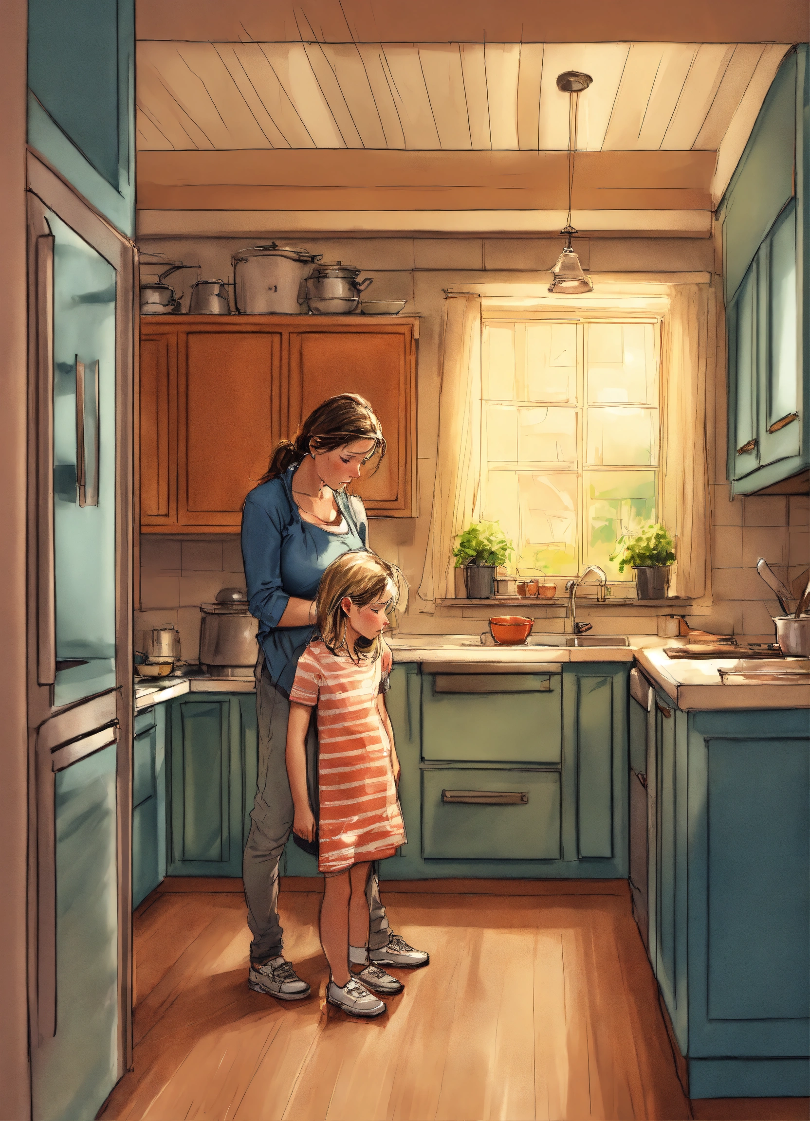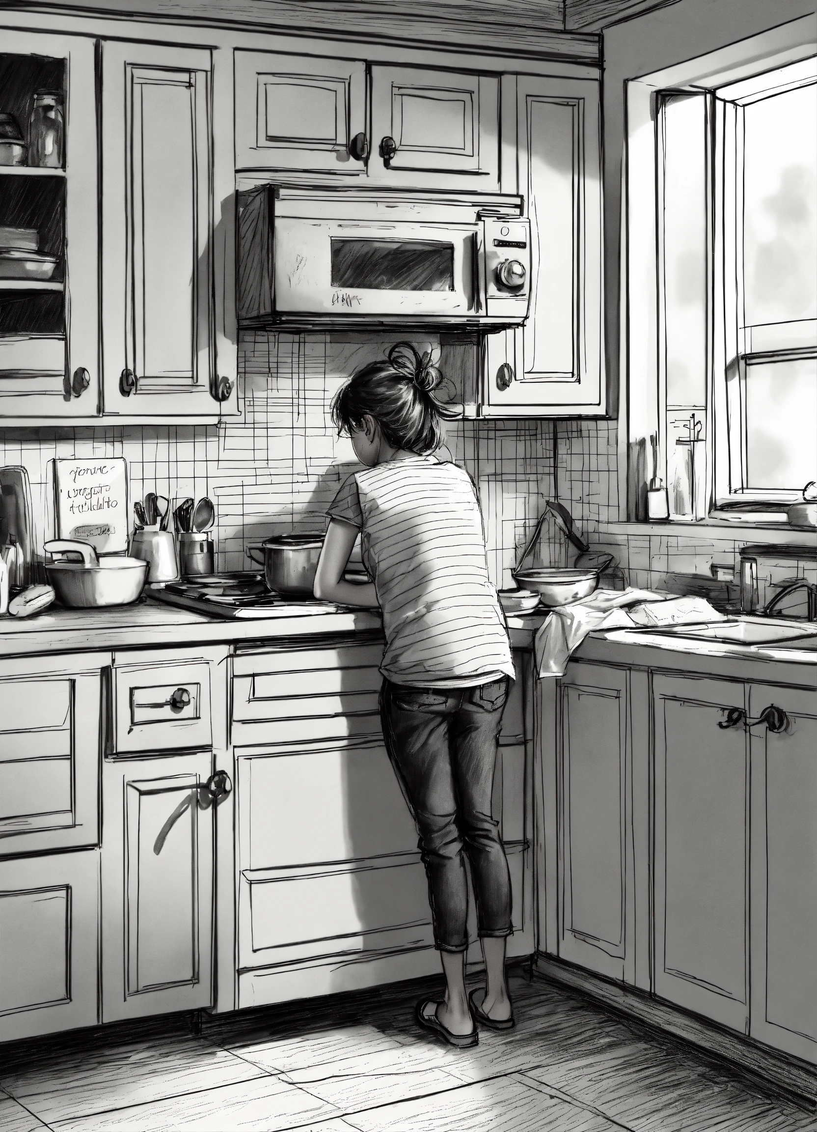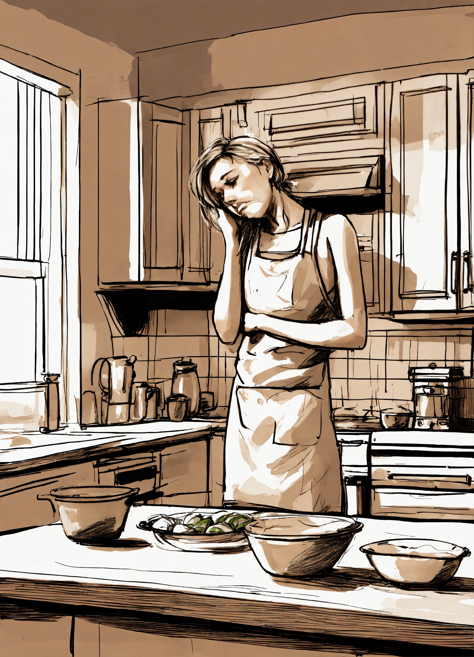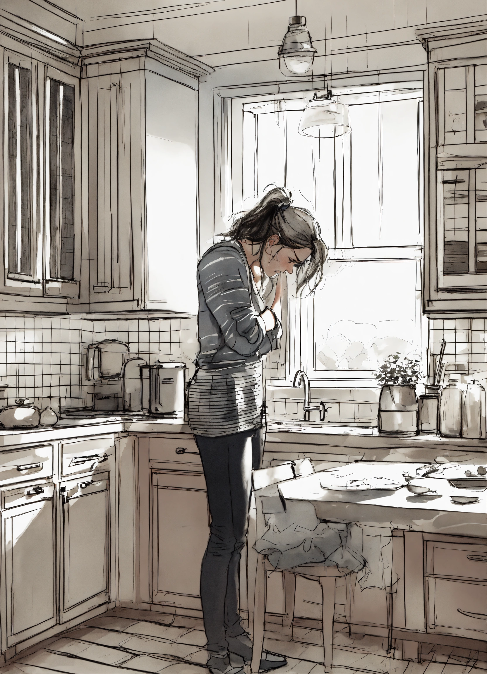 Realistic sketch of an frustrated overwhelmed parent alone in the kitchen