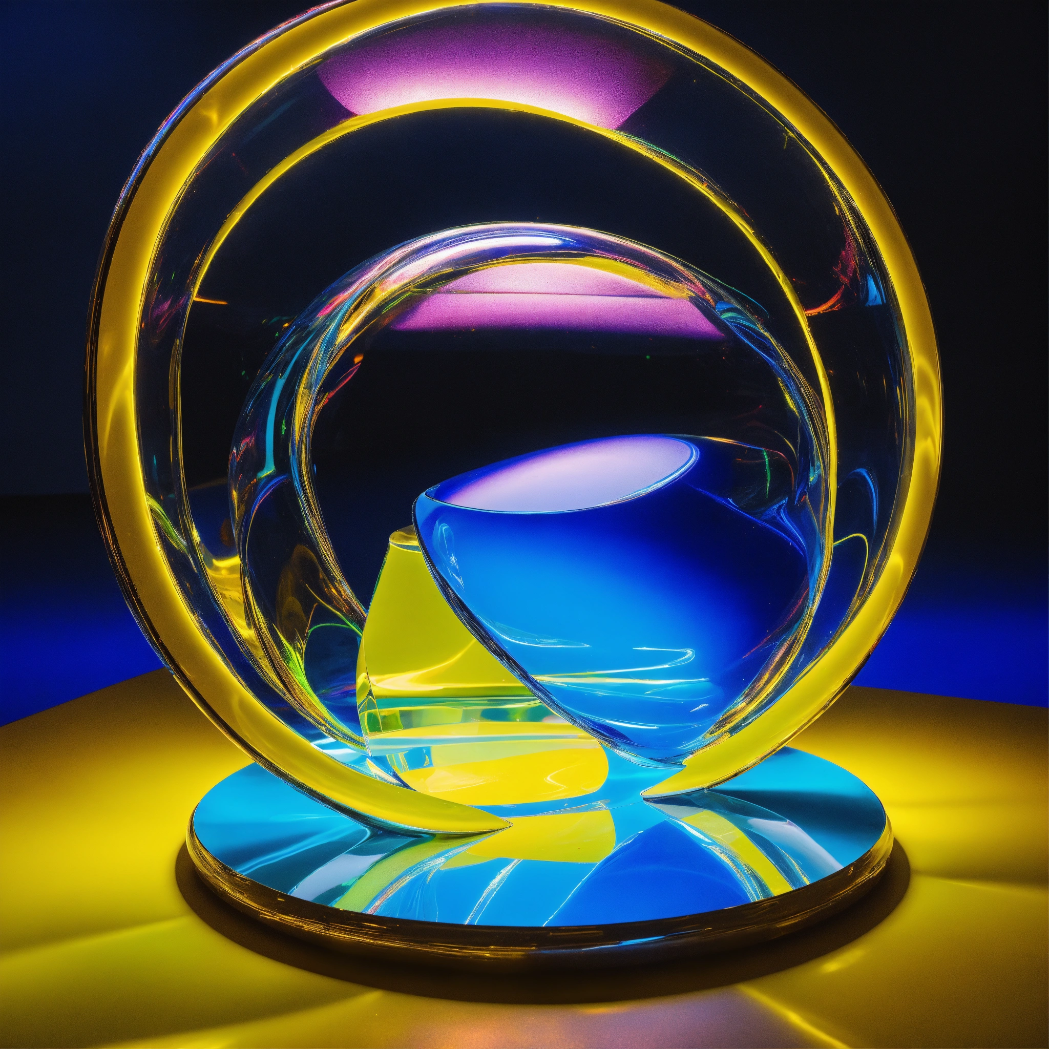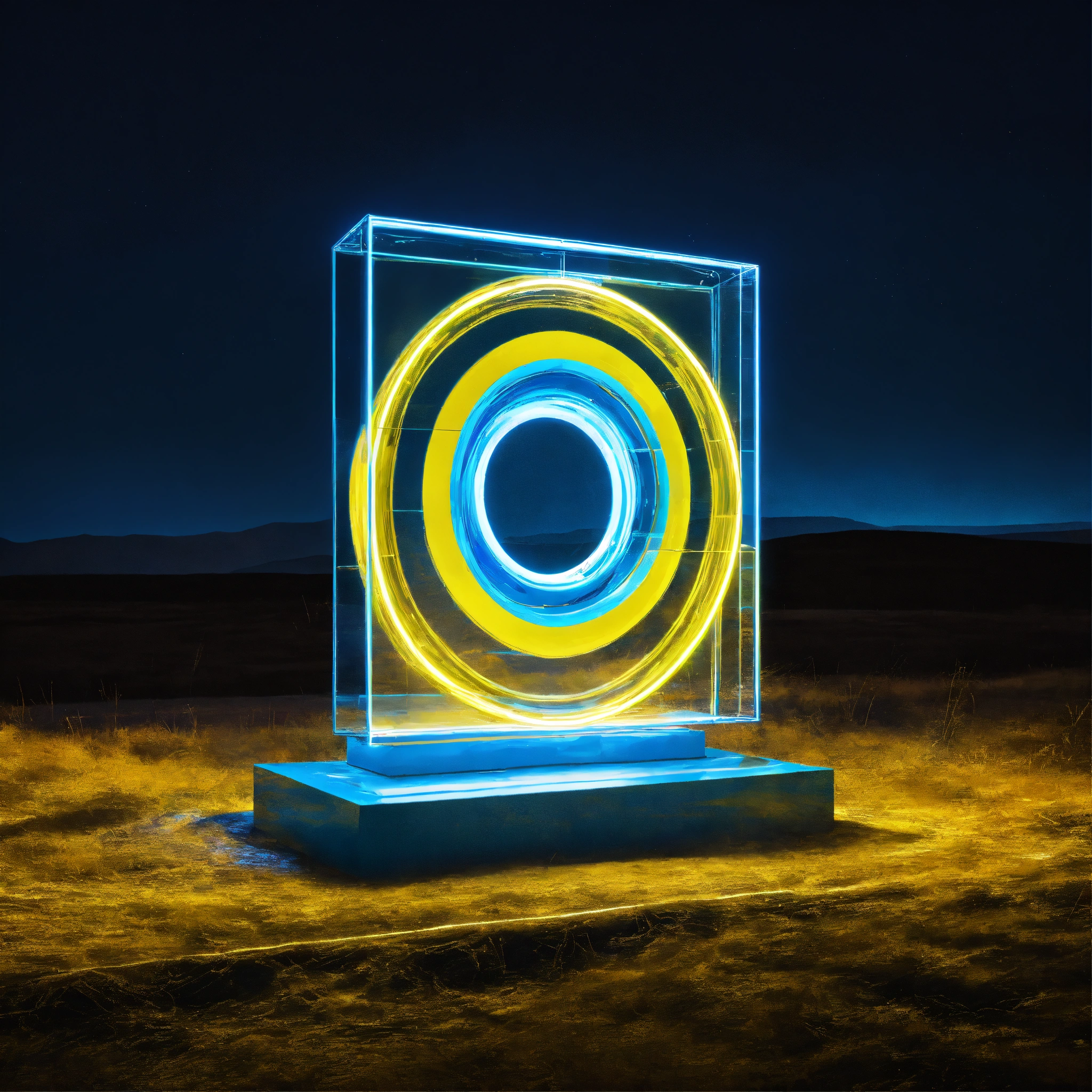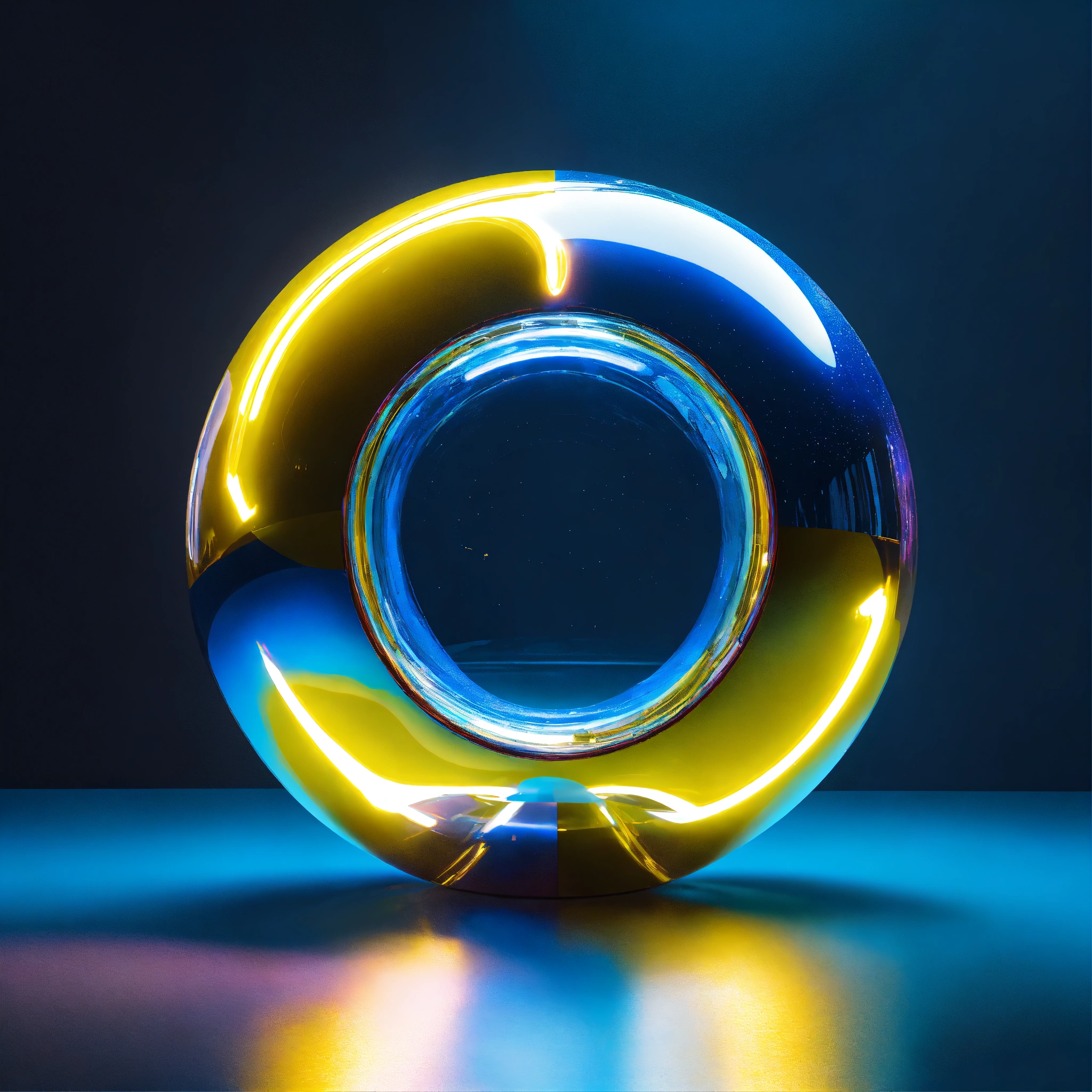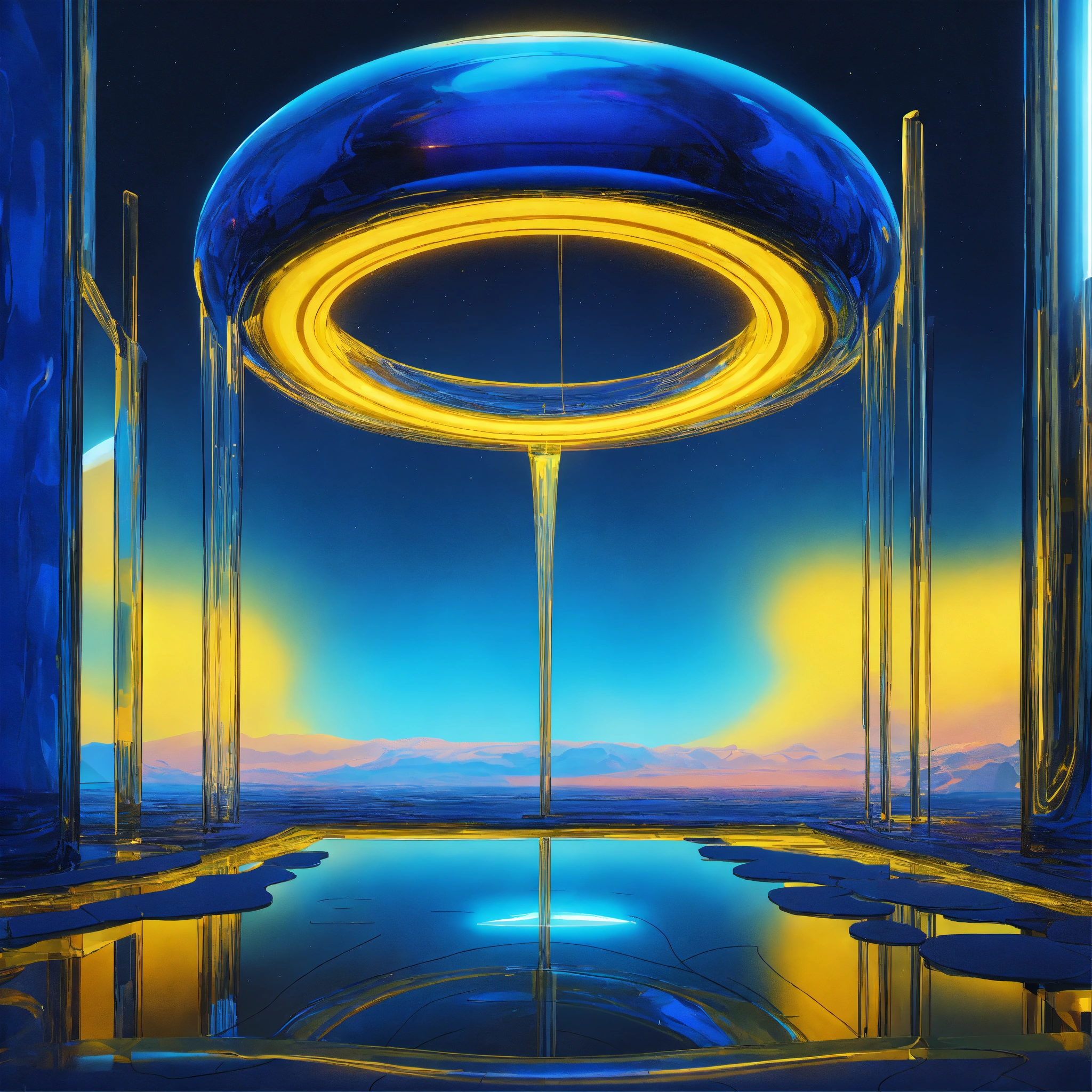Metallic and glassy surface, vivid tones of blue and yellow, surreal futuristic neatly object, heavenly and intense neon lights, a glass installation on the open land. a background symbolizing a portal to another dimension. one abstract representative object floating. --ar 169 --s 1000 --c 15