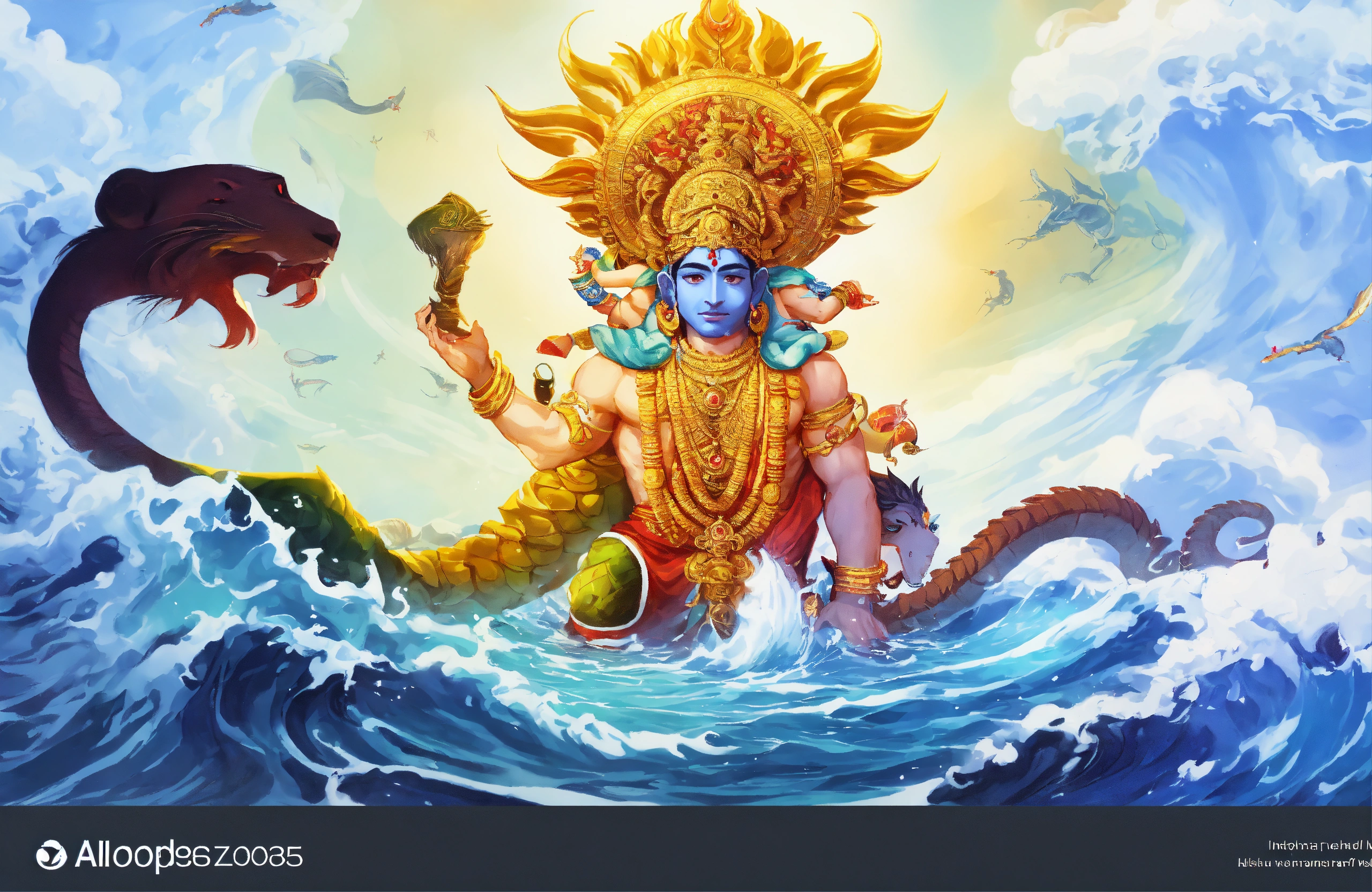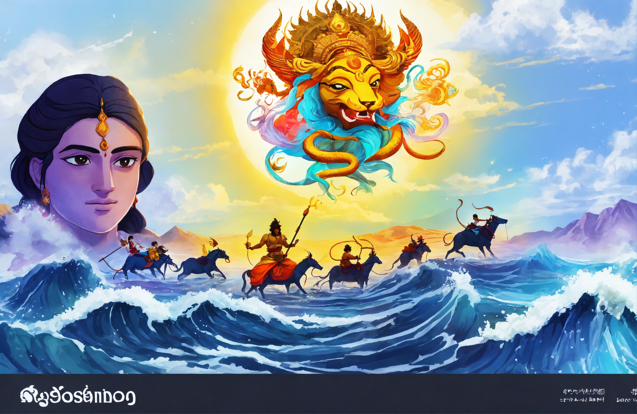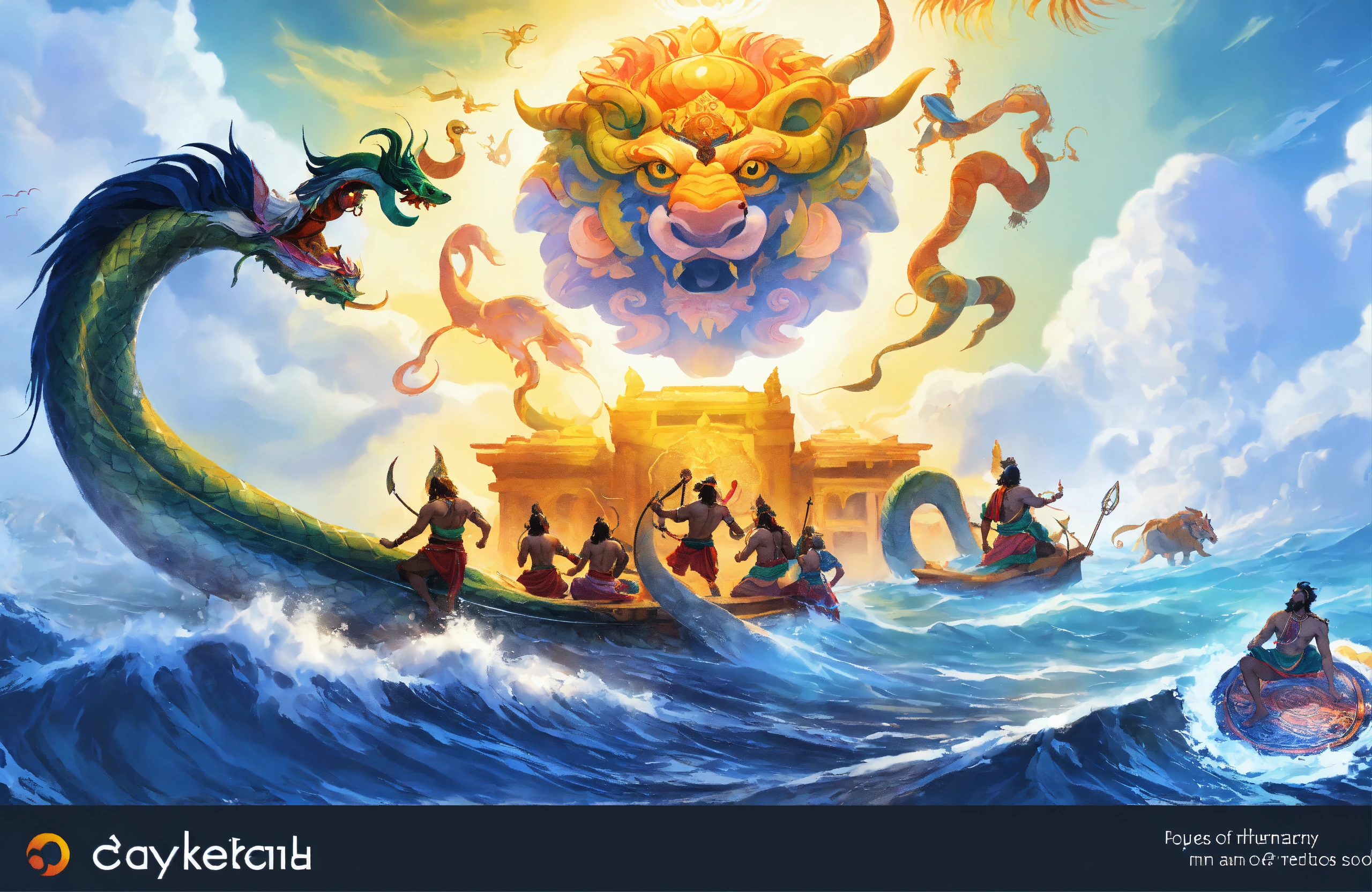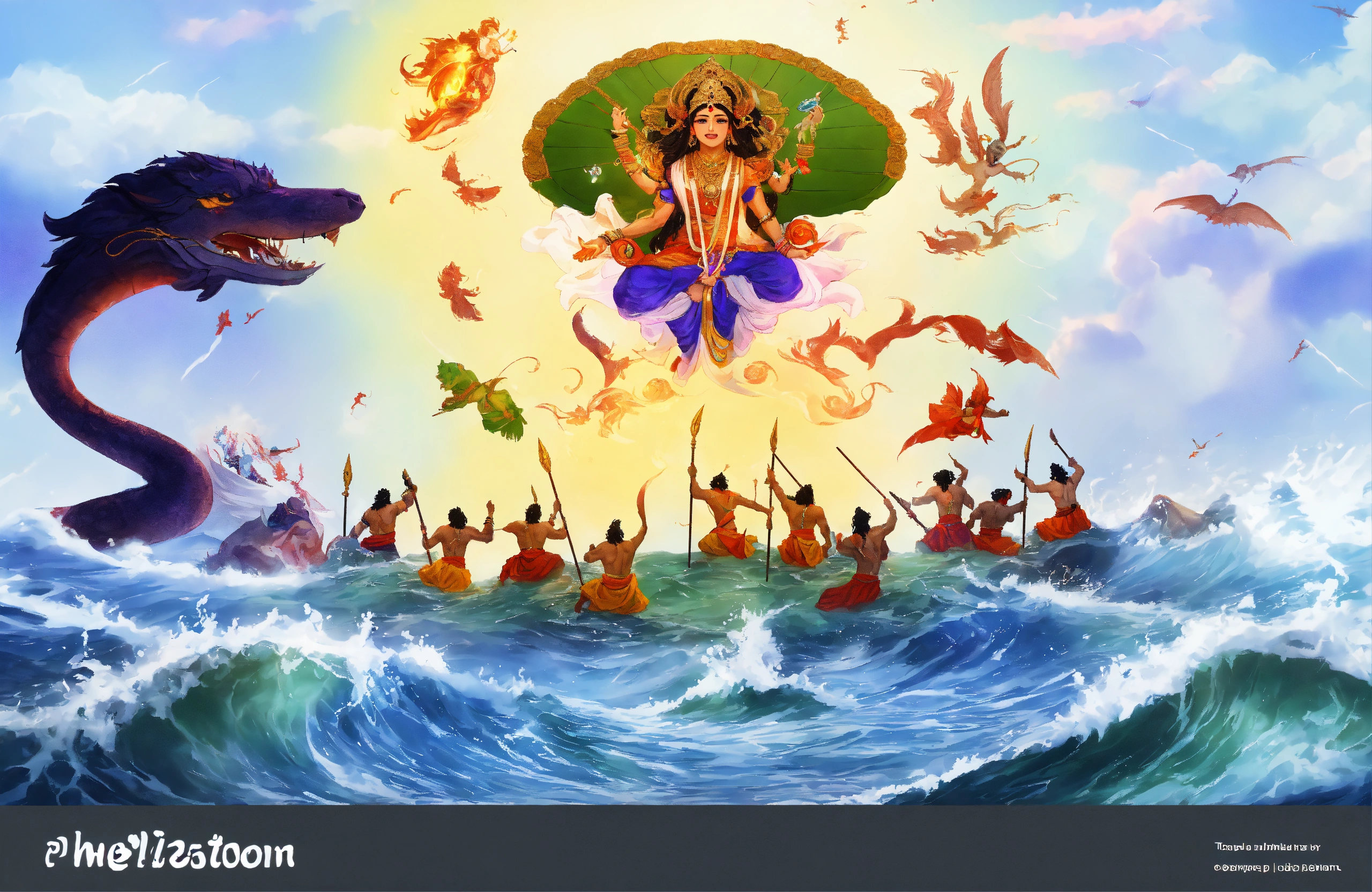 Create an illustration of a mesmerizing indian mythological scene with gods and demons gathered around the ocean, where the gods and demons stand together, ready to embark on their quest to extract the elixir of immortality as the massive mount mandara with the three headed serpent vasuki wrapped around it, ready for the churning.