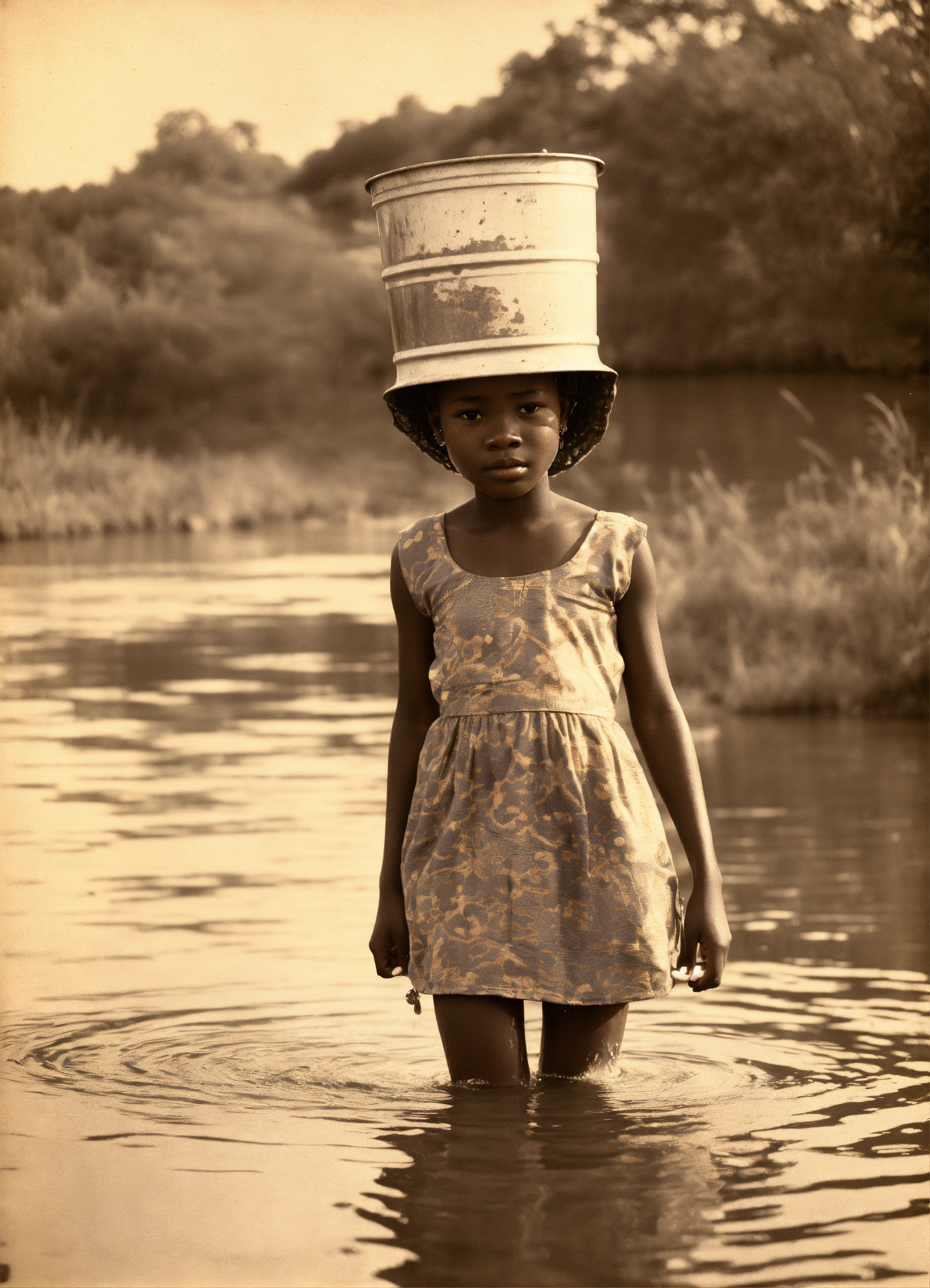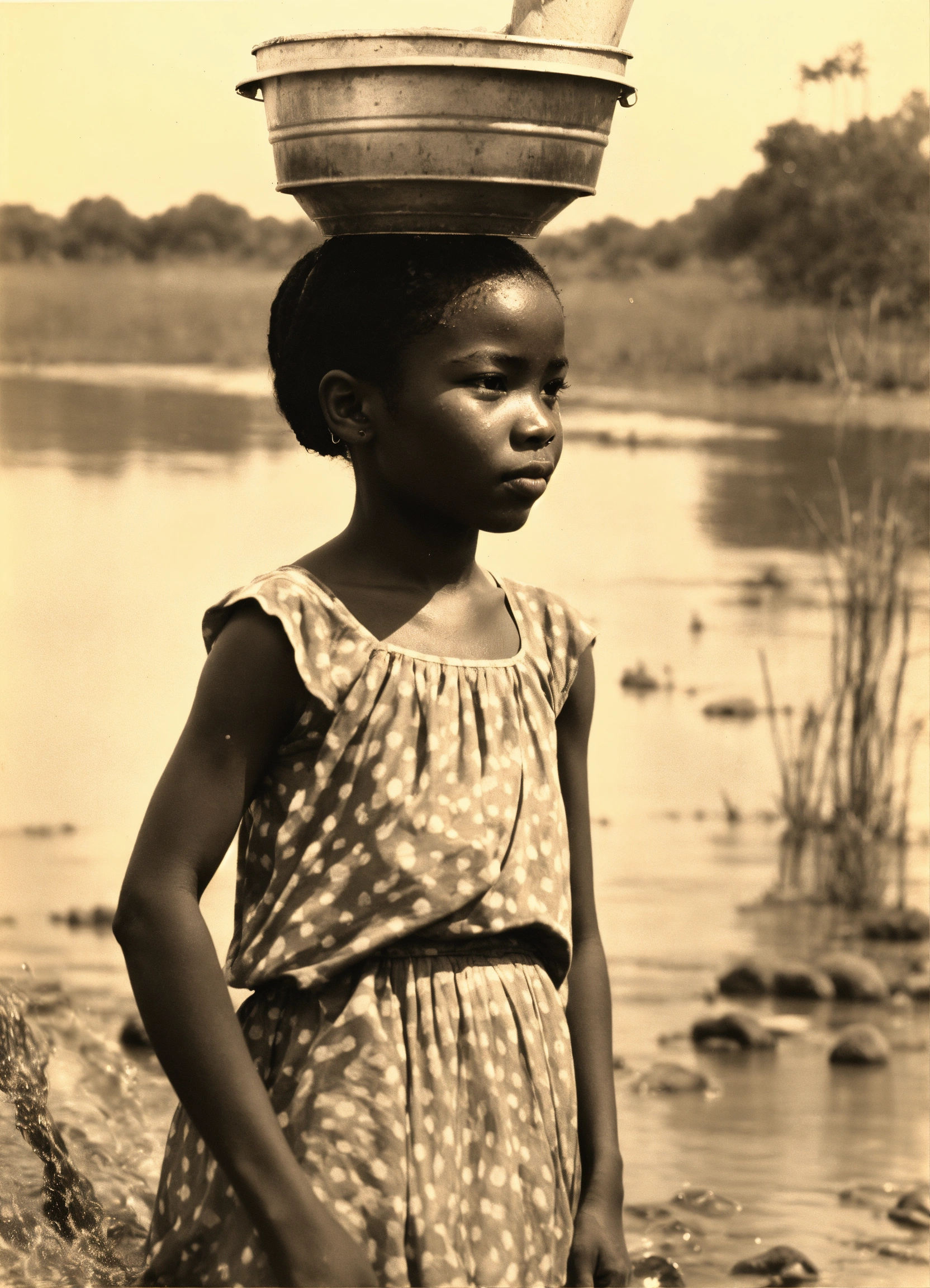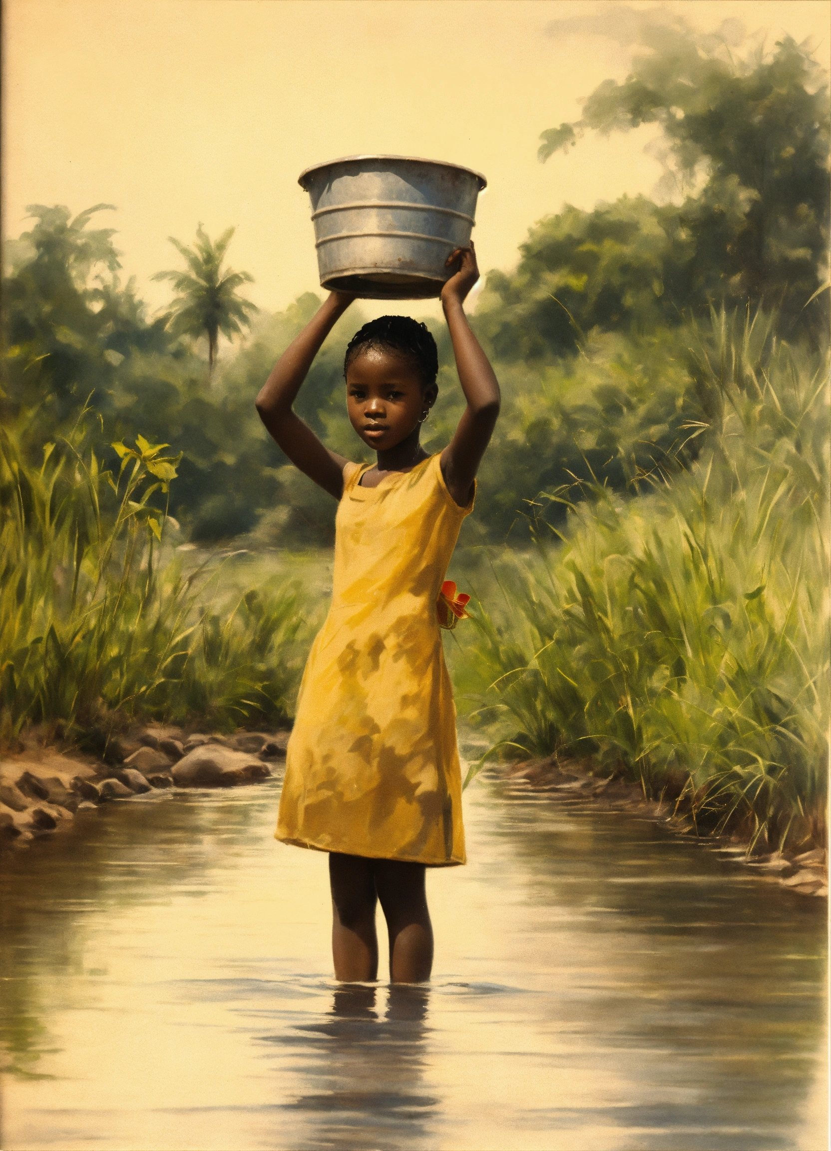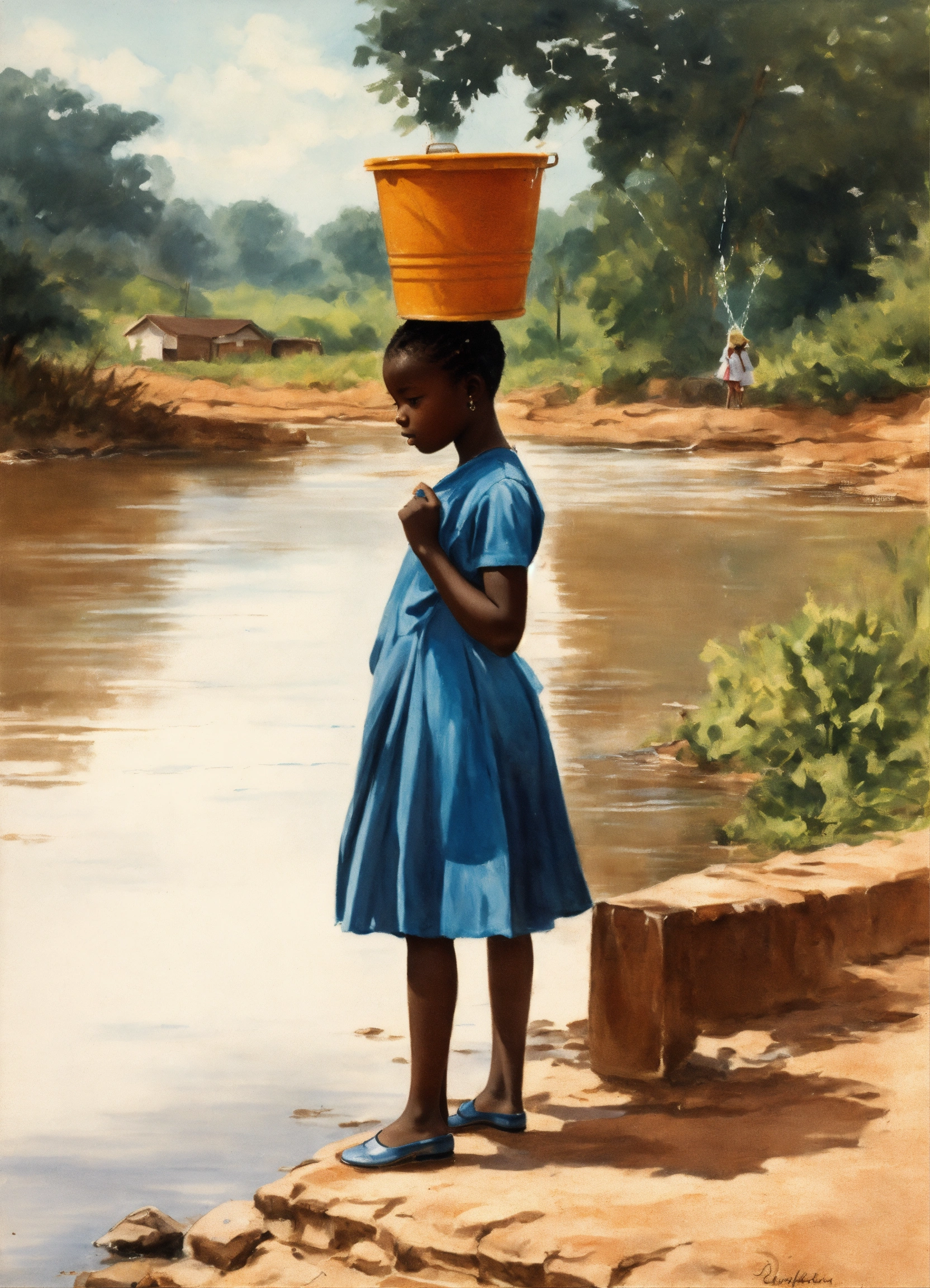 Sketching of ghanaian young girl with bucket of water on her head at the river in the 1960s