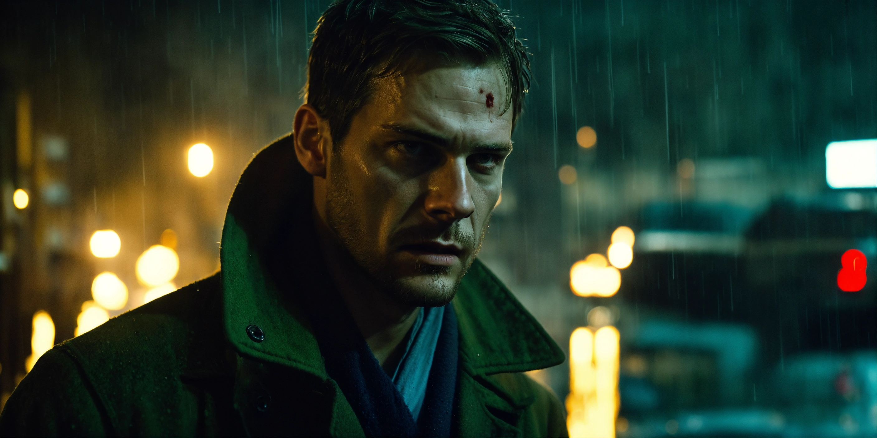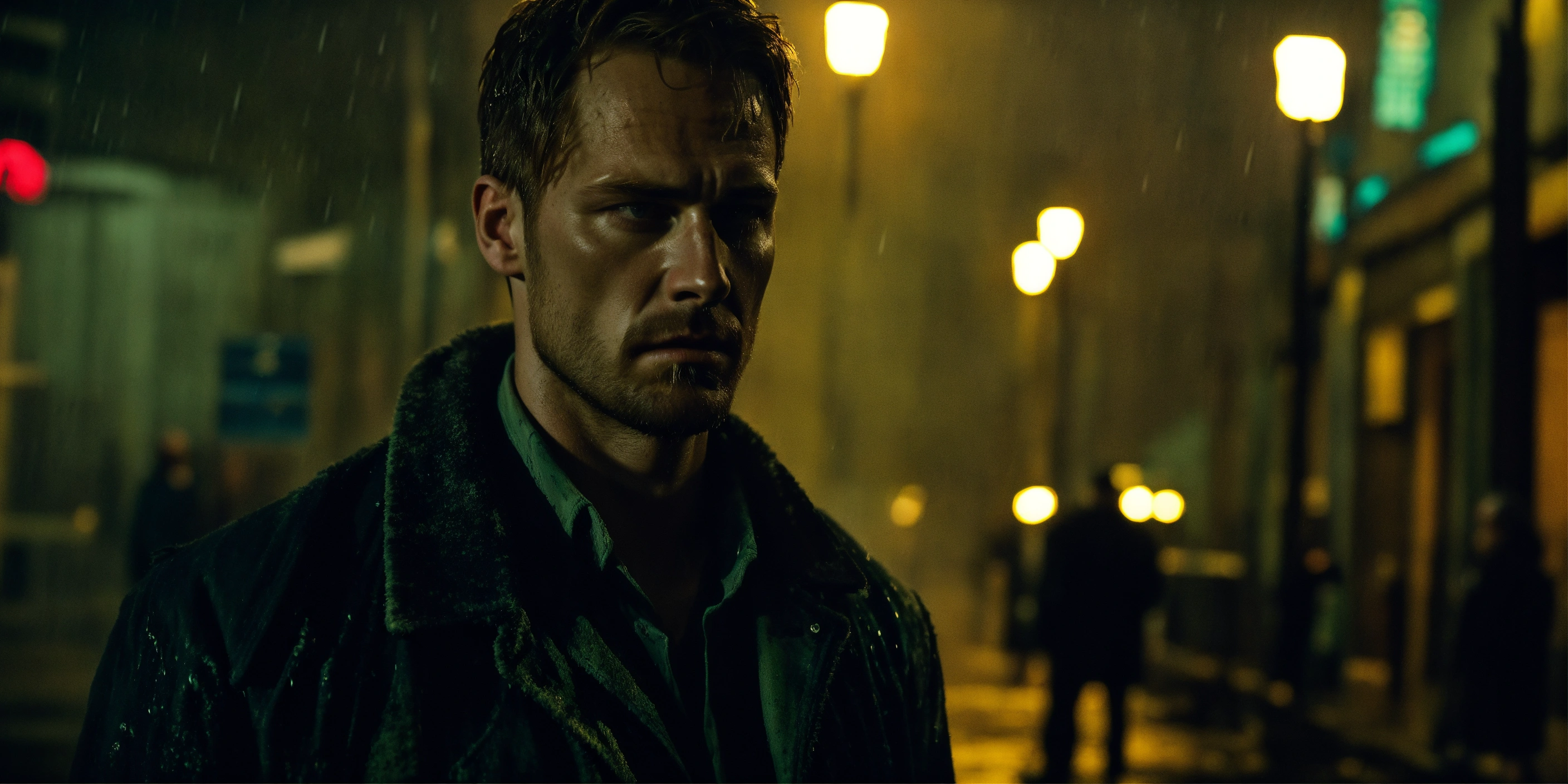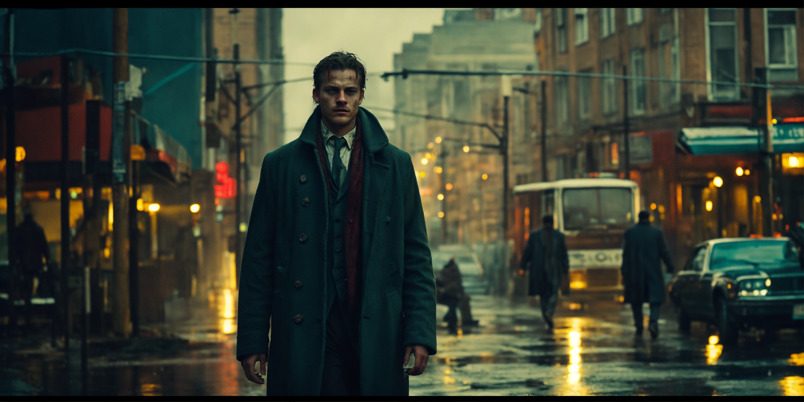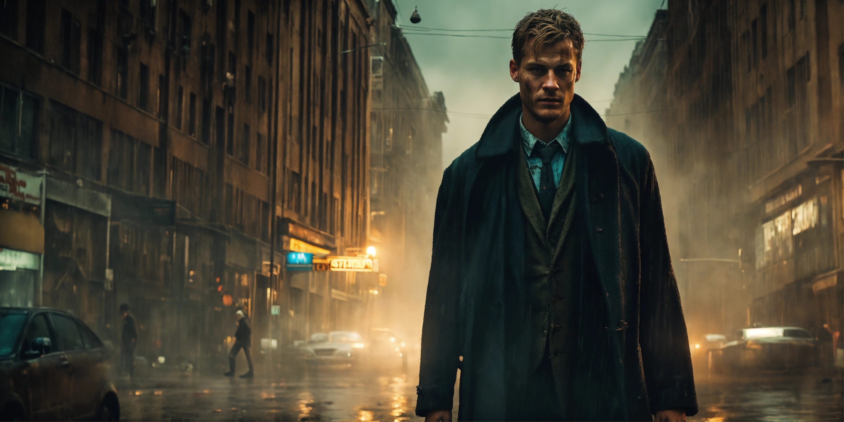 Beautiful tall man, 33 years old kinnaman, zombie-infested city, dark, cinematic, epic, rainy, detailed, realistic photo face, worn-out overcoat