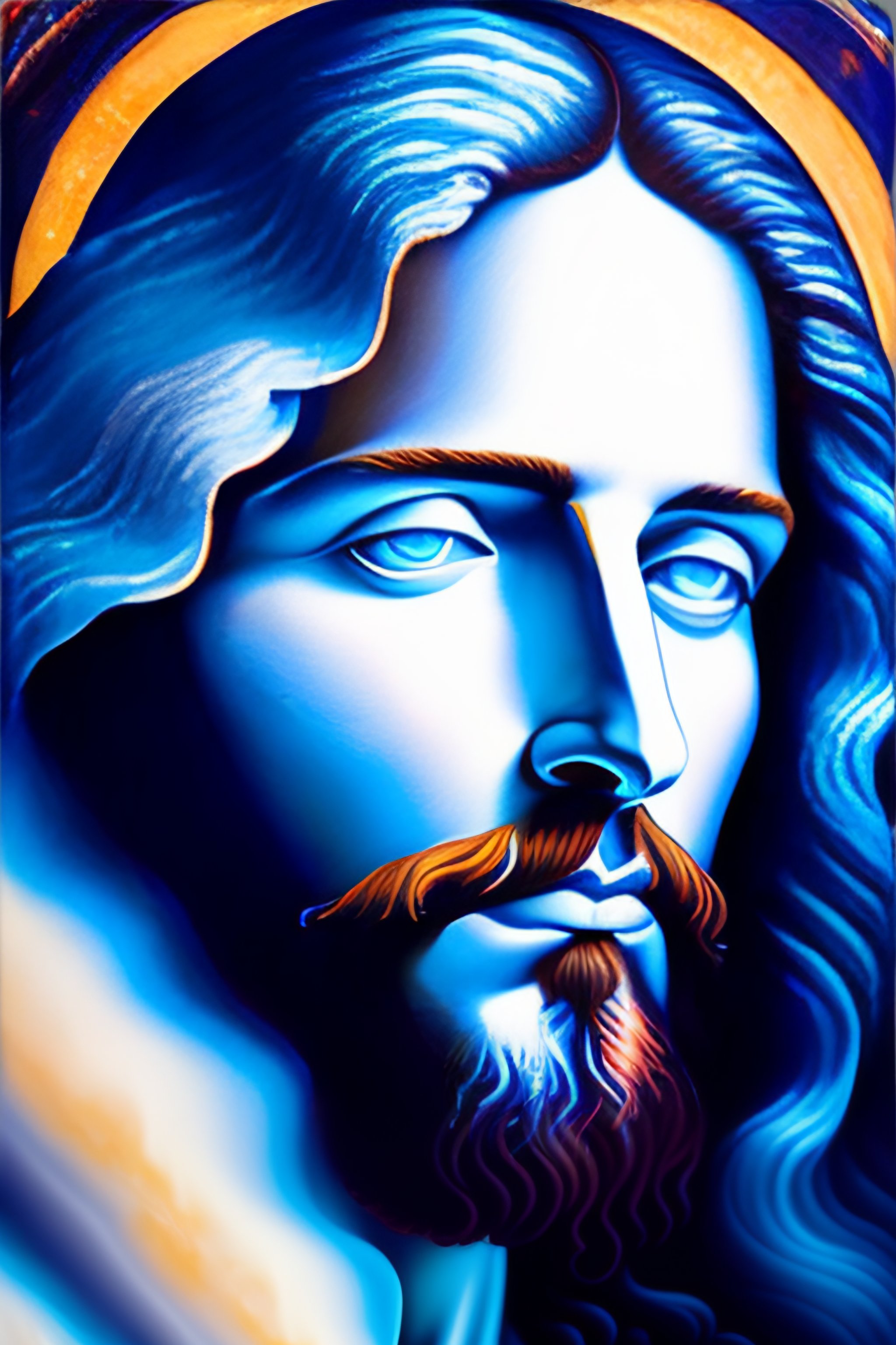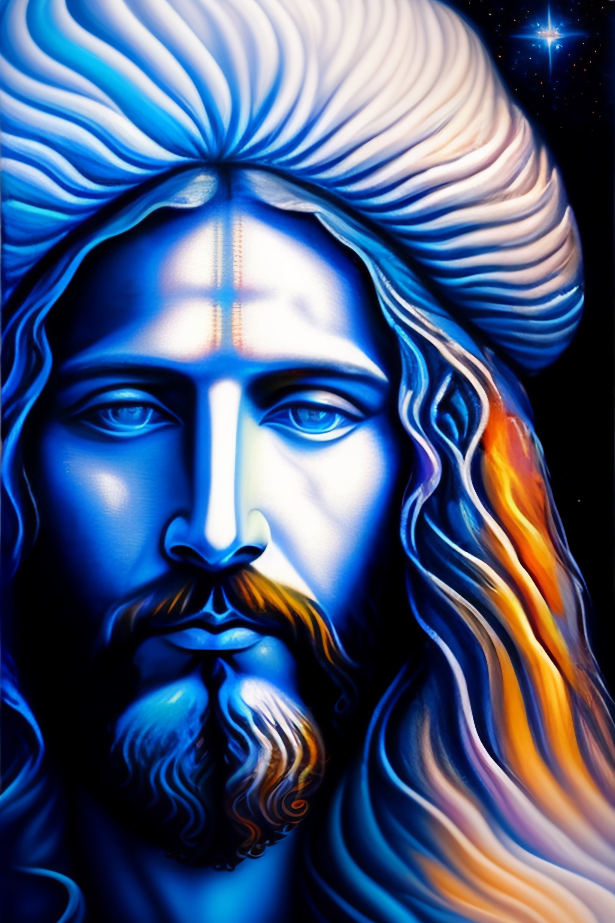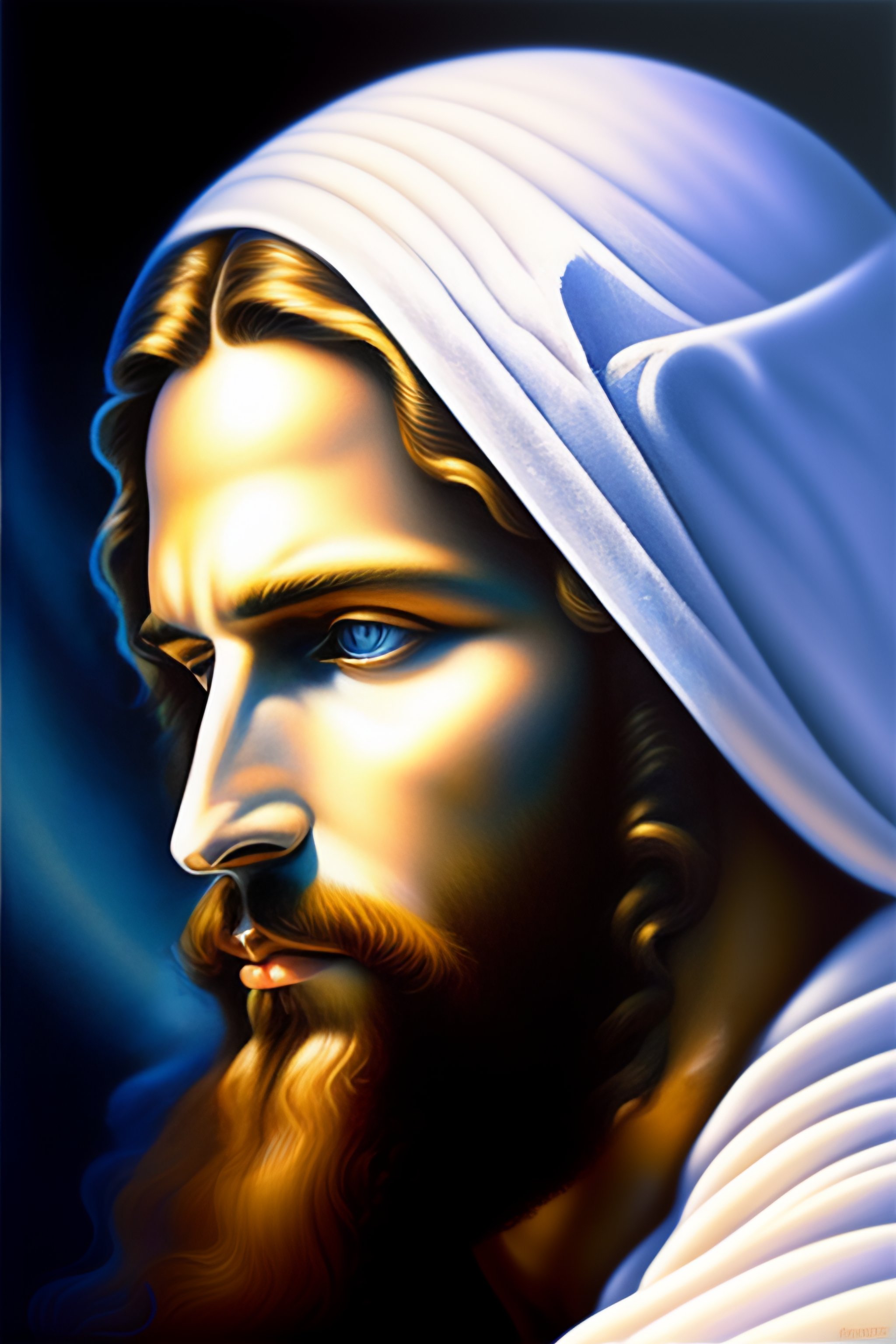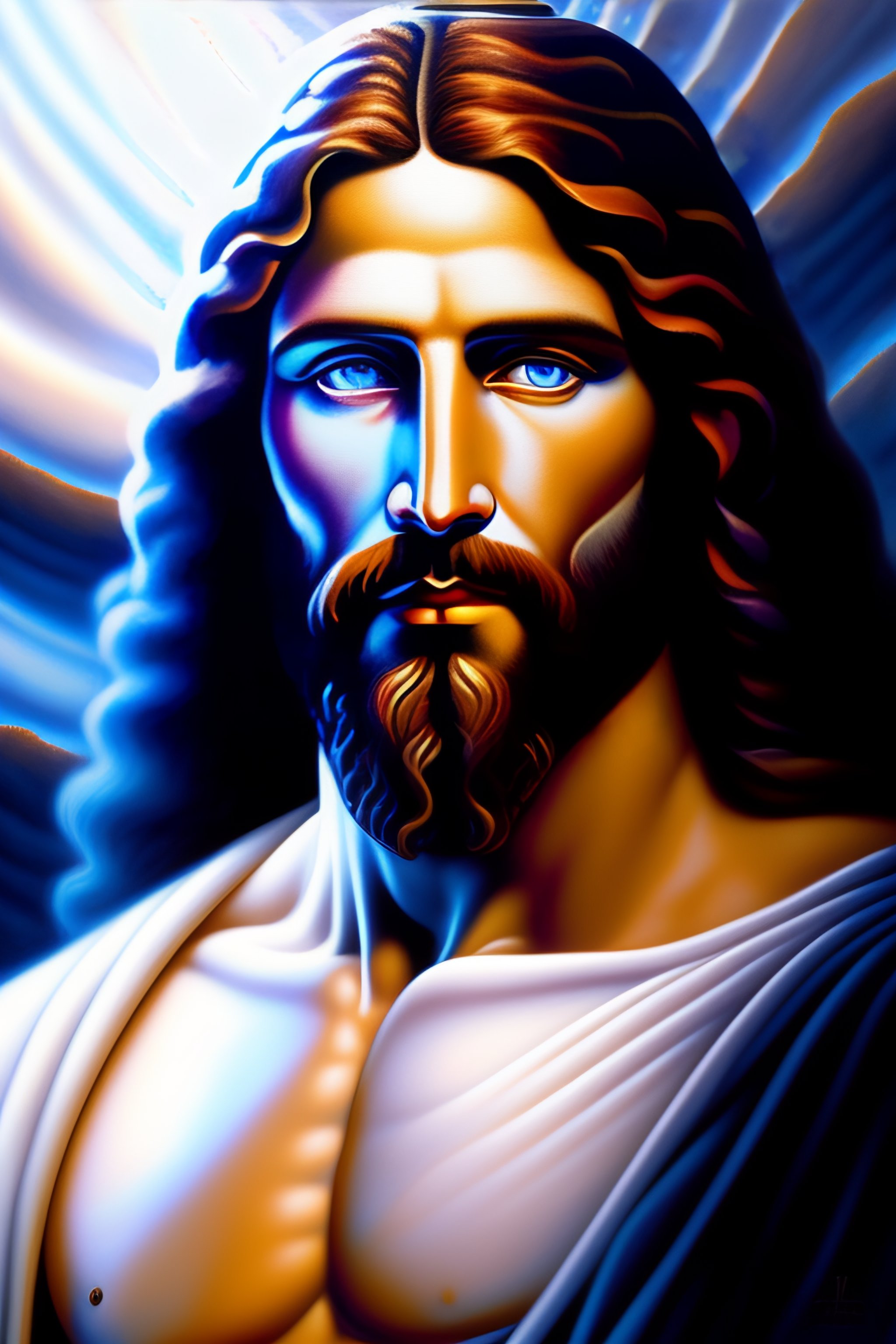 A painting of jesus christ white clothes, an airbrush painting, fantasy art, drawn in the style of mark arian and giger, blue holographic face, tends to have fractal structure, closeup portrait of an jesus, expressive masculine face