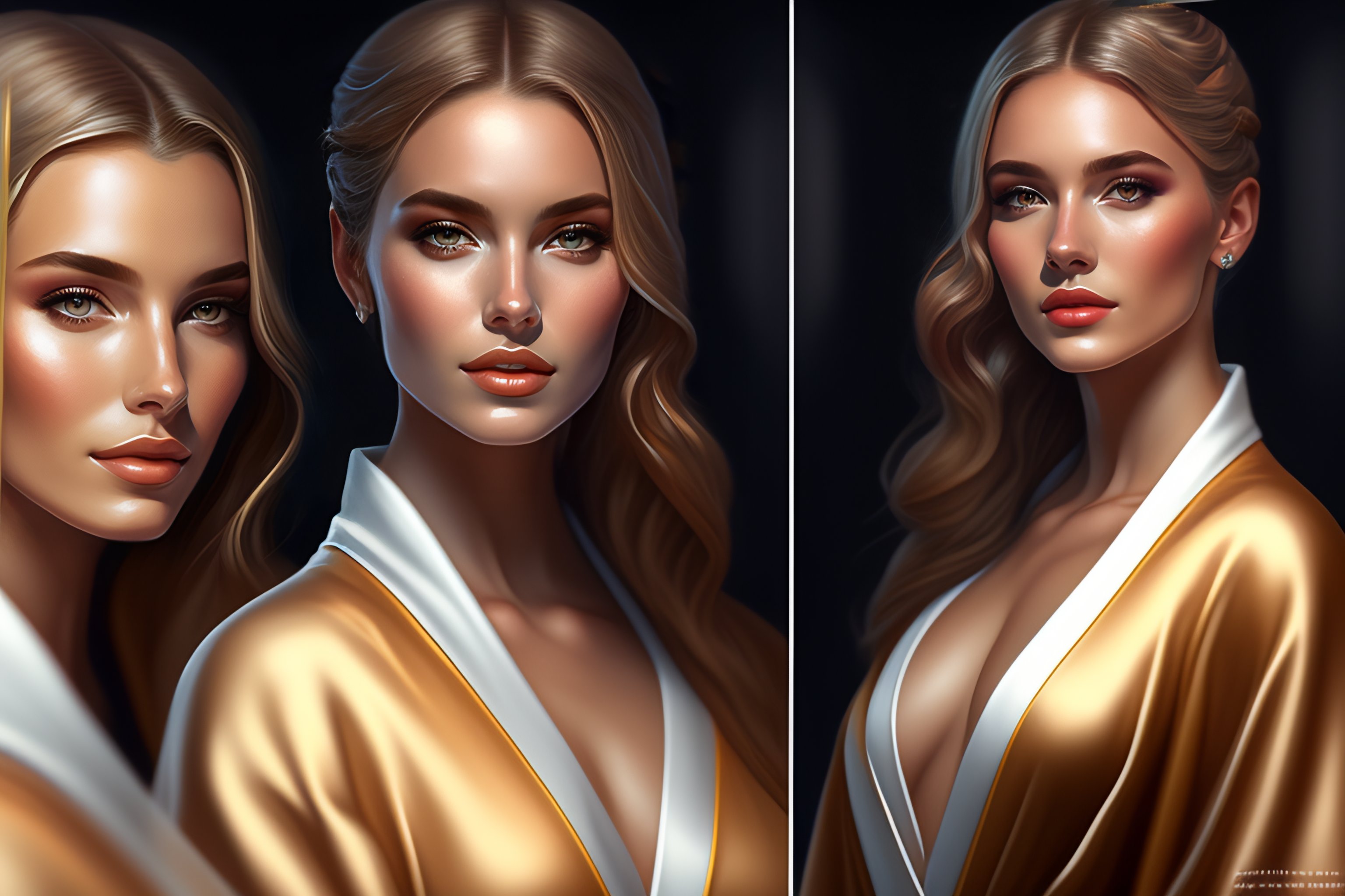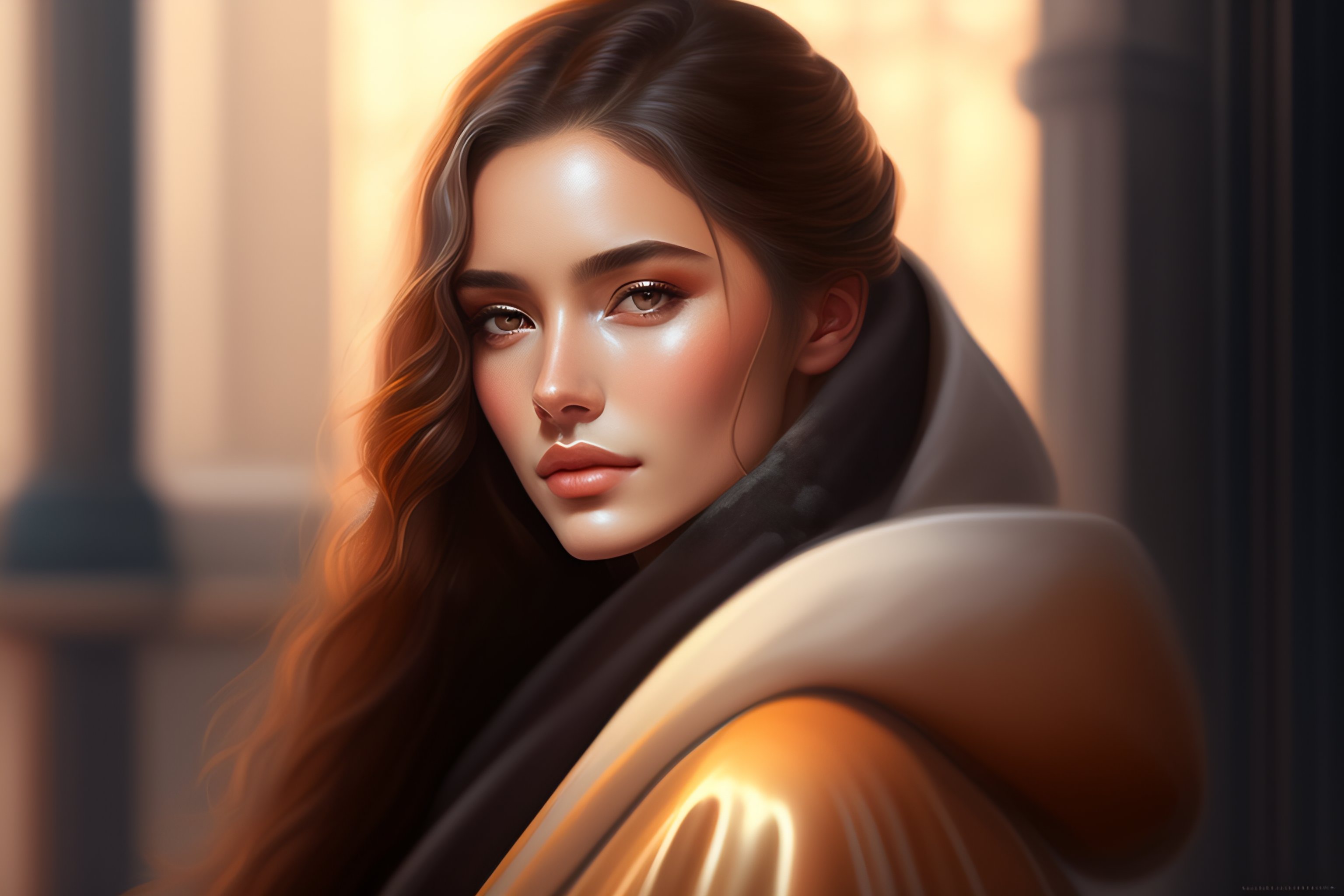 Portrait of a young woman wearing a robe, non-centered shot, unique pose, intricate, elegant, highly detailed, digital painting, artstation, realism art, smooth, sharp focus, illustration