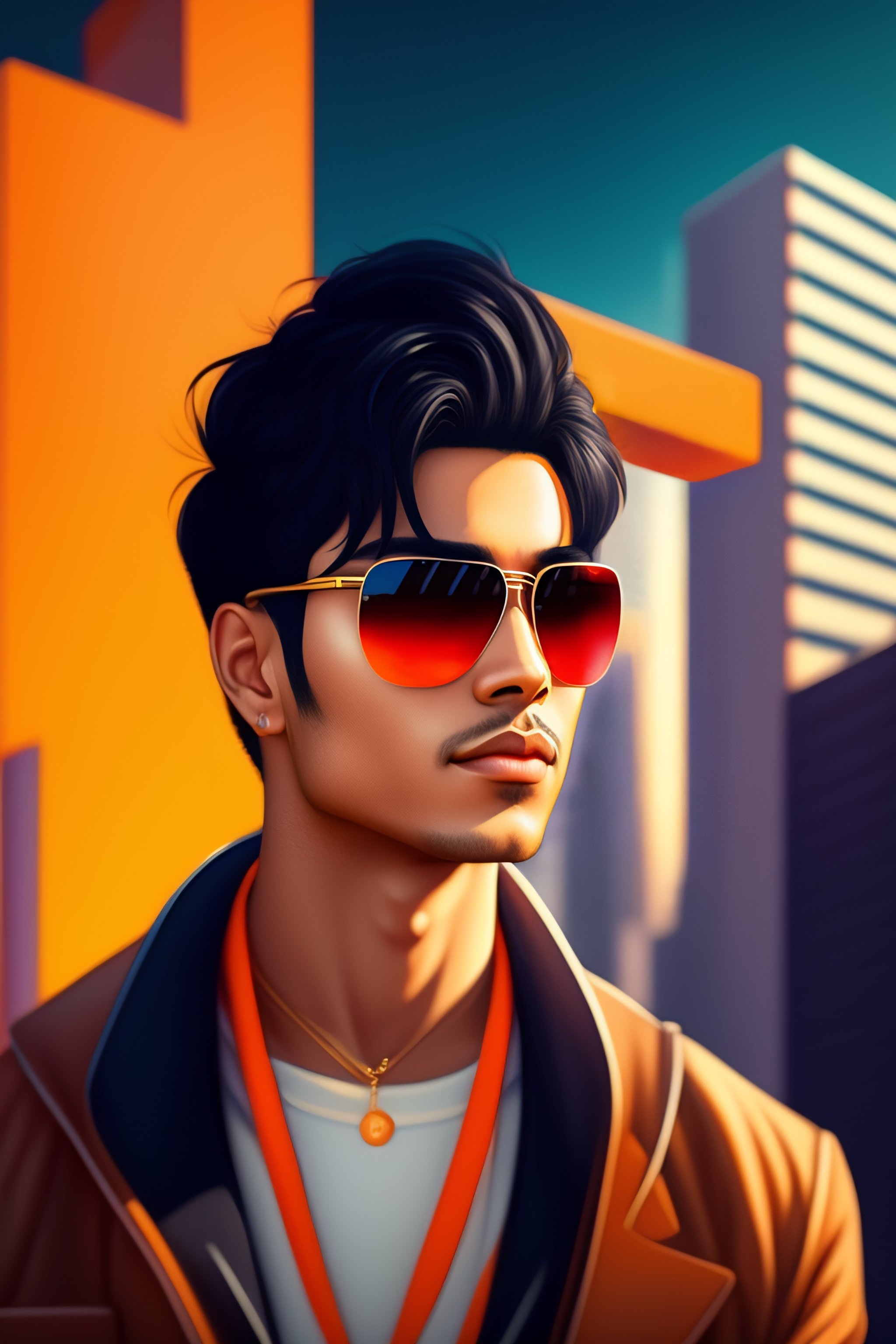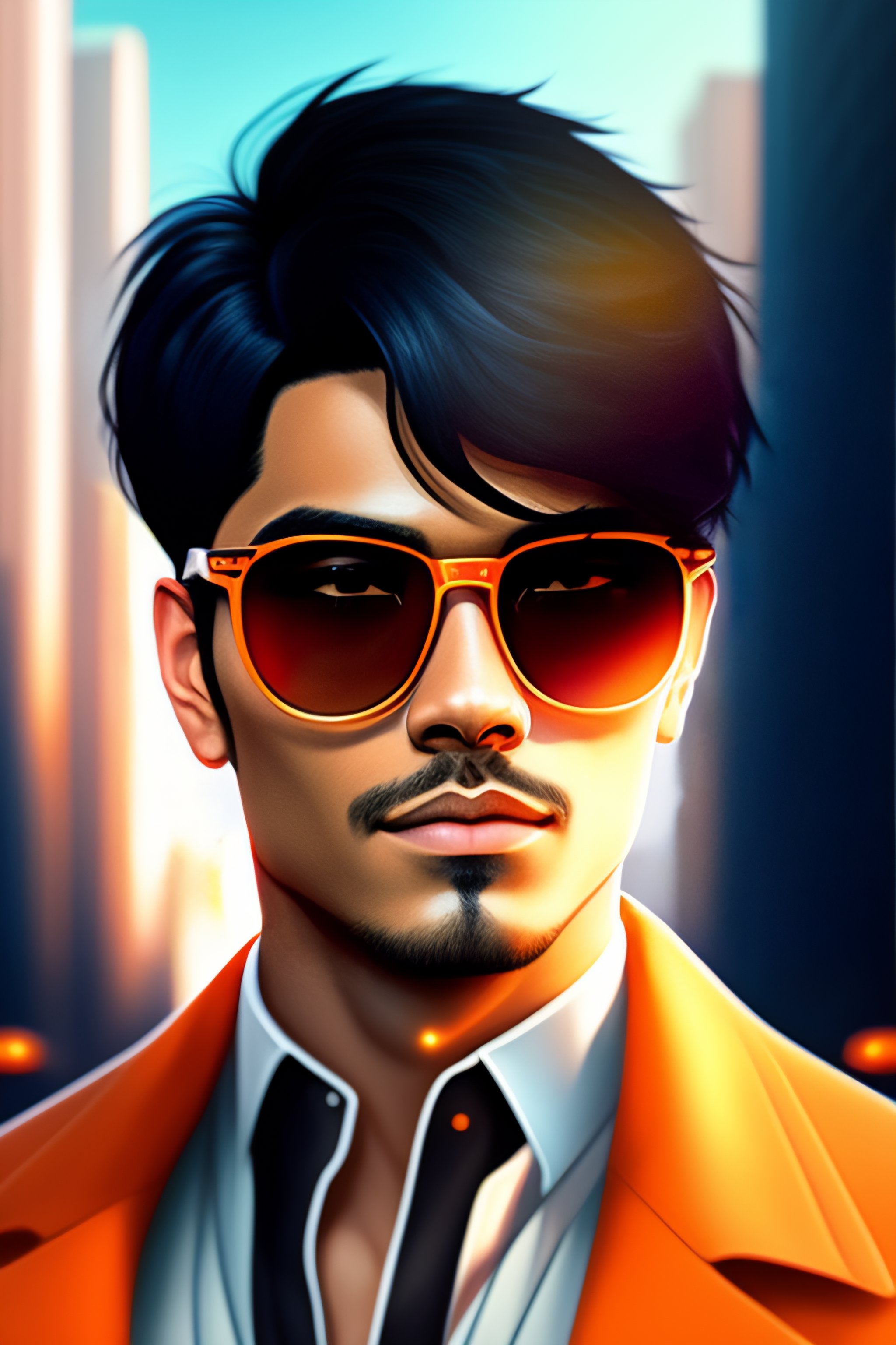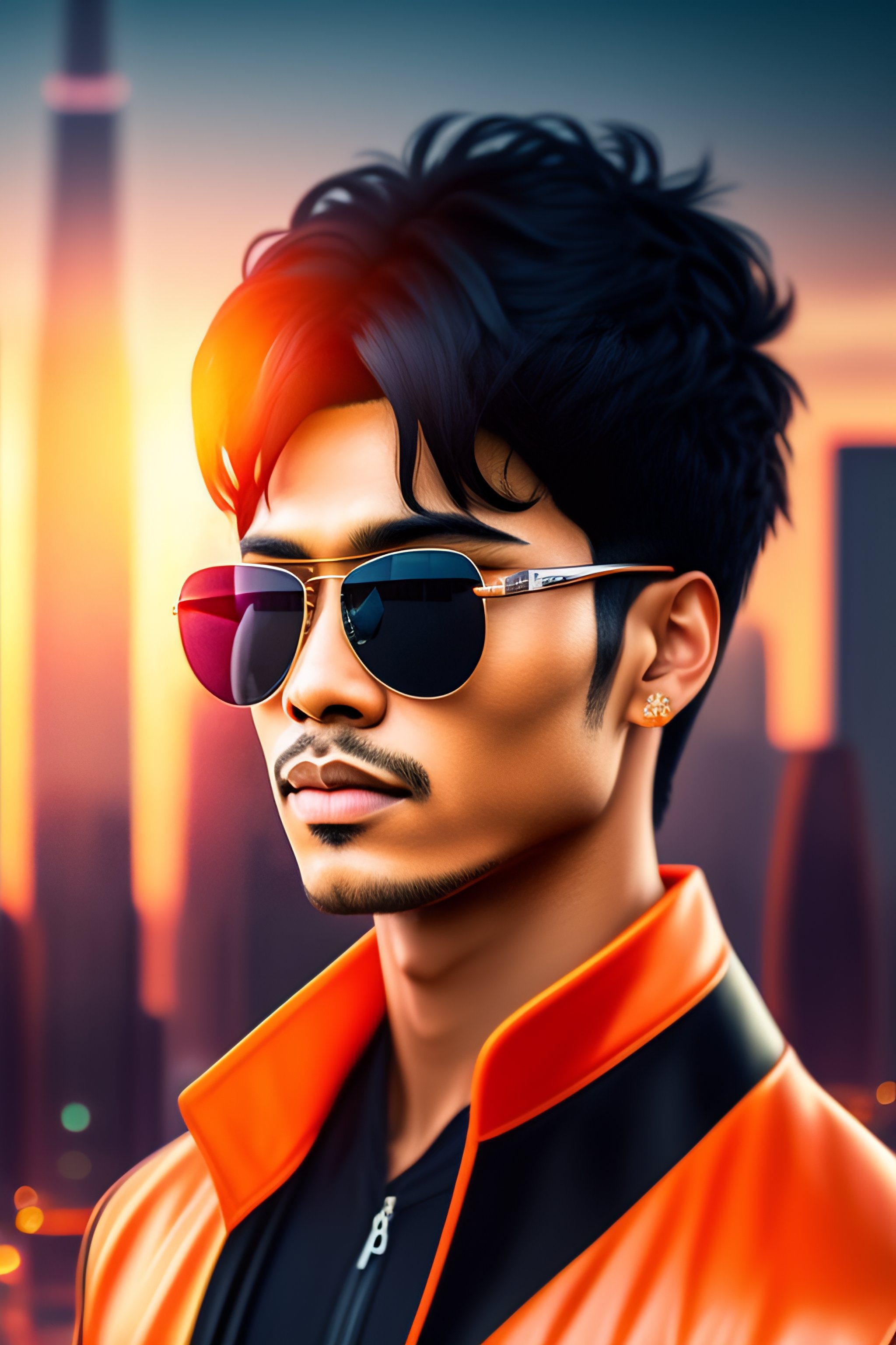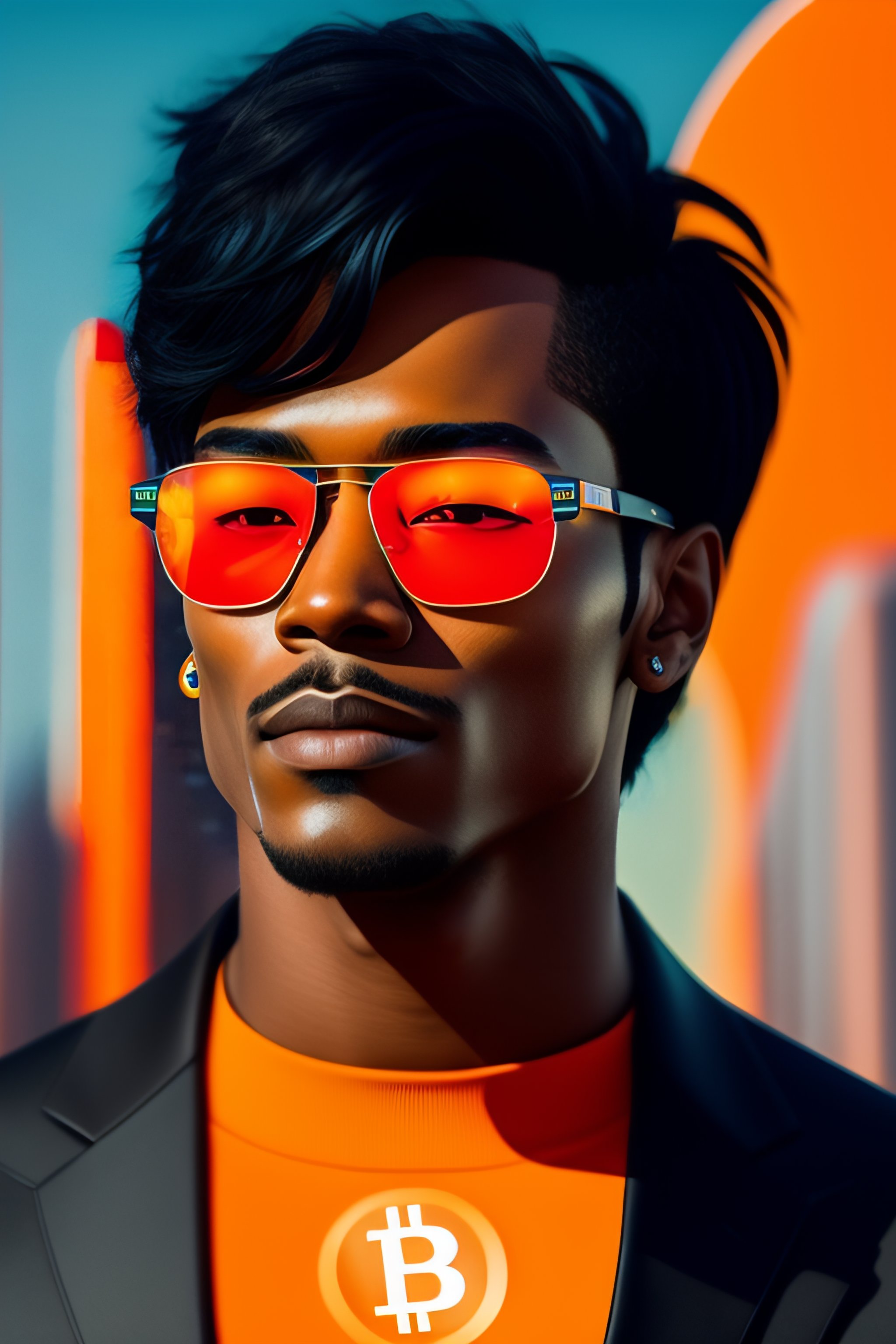 Portrait anime black hair guy short hair sharp fine face, orange bitcoin logo sunglass, futuristic city in background