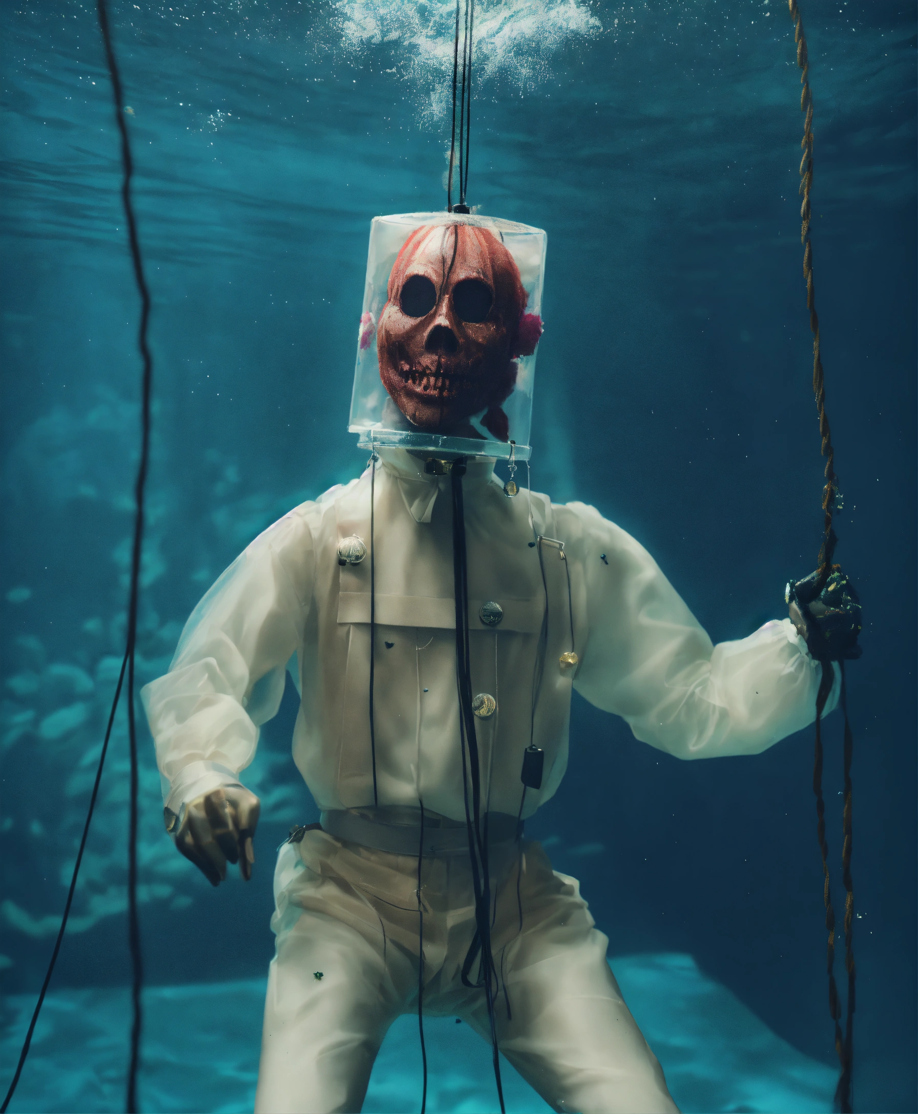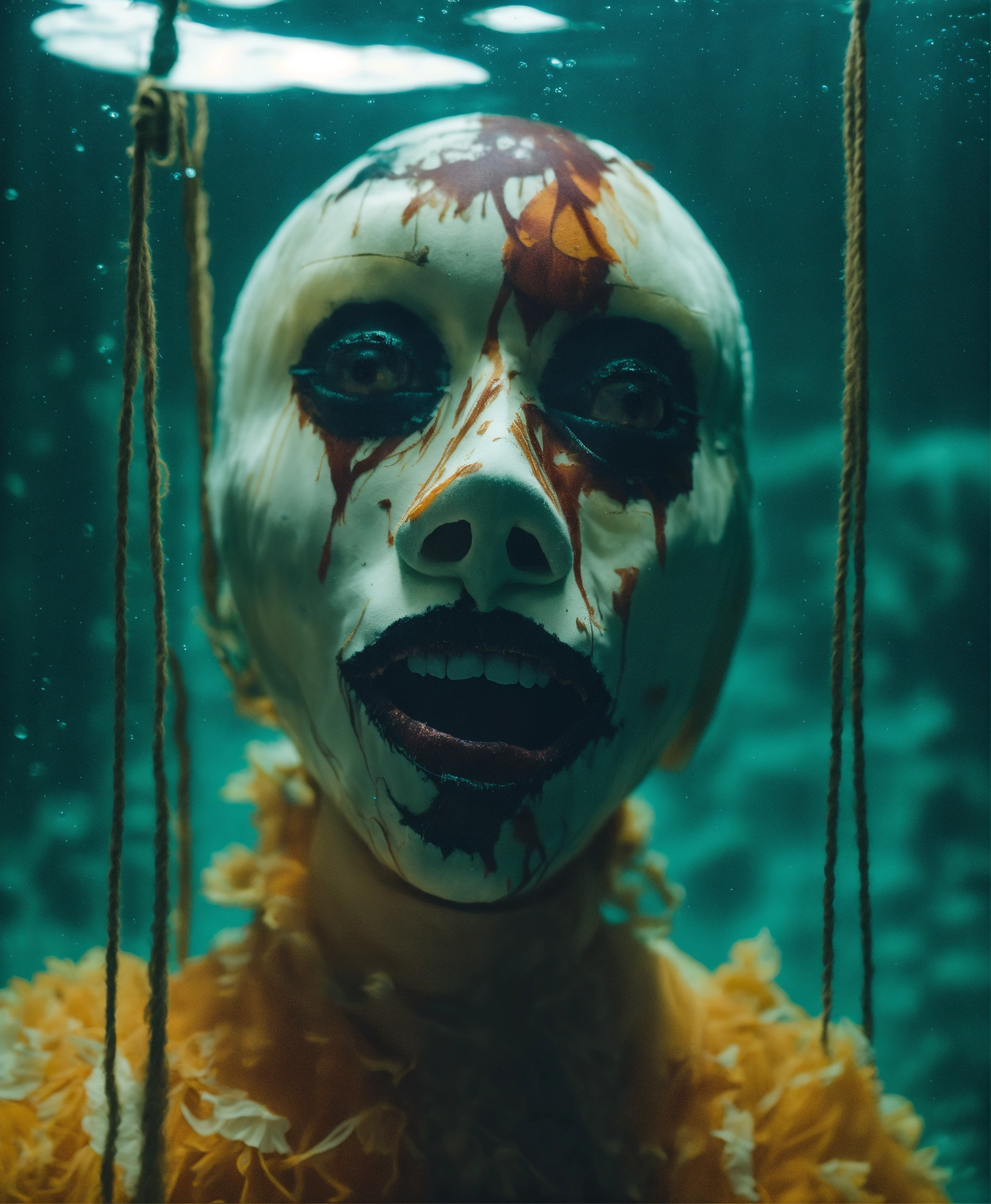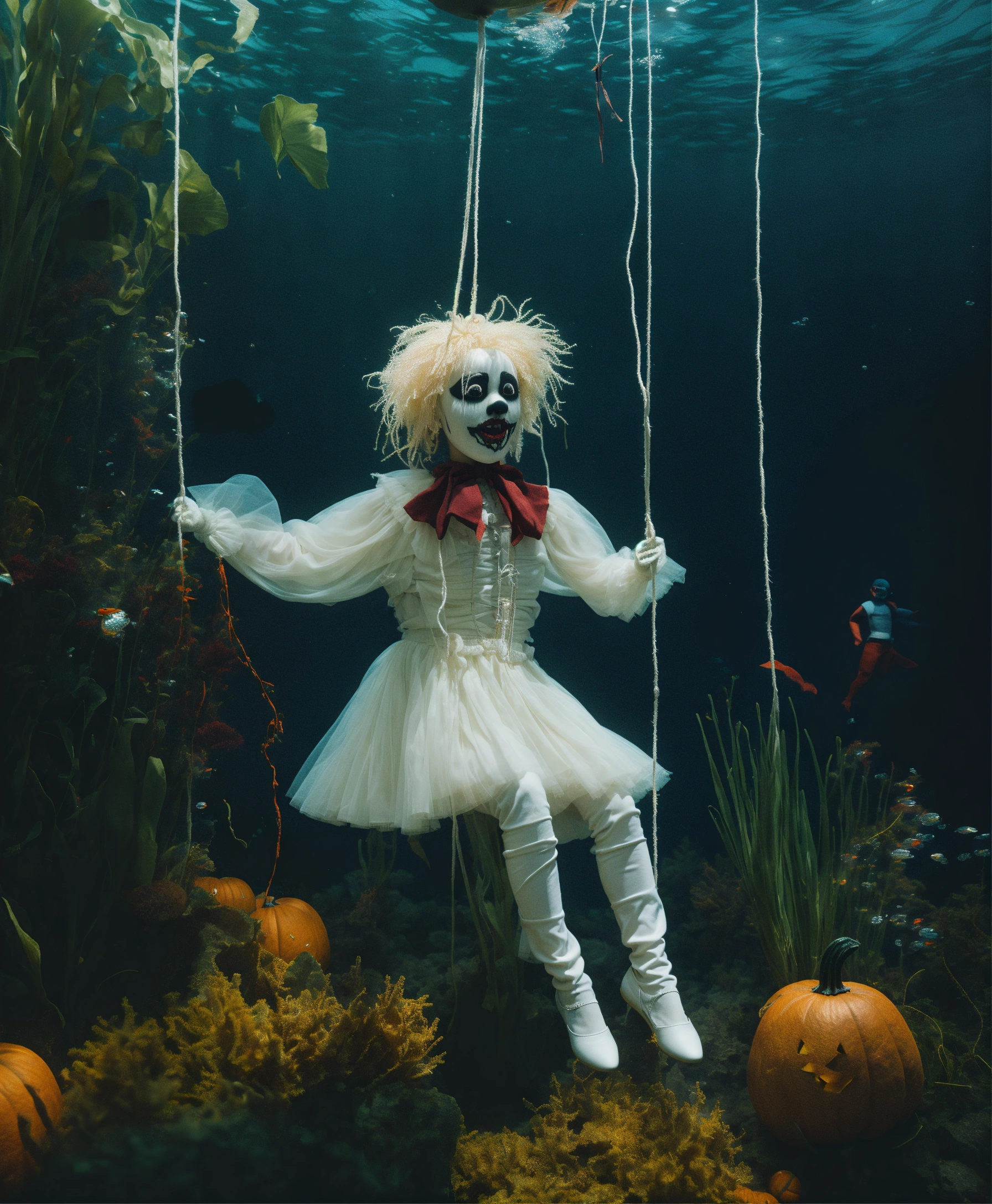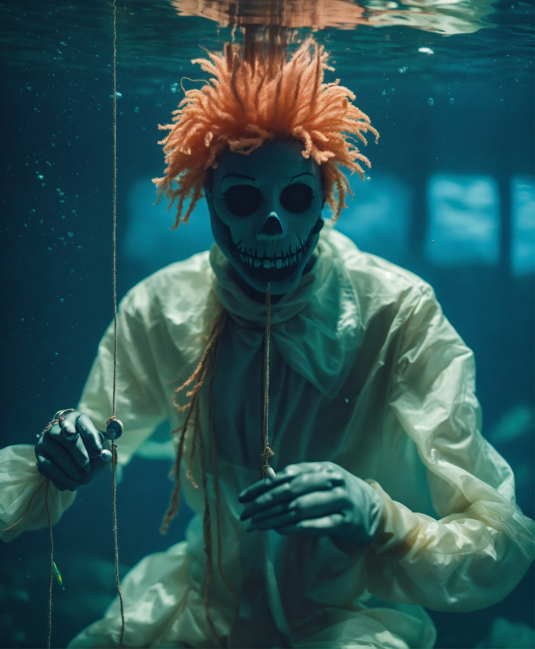 Scary puppet on a string under water, halloween, model, 8k resolution, hyper realistic, day, 35mm film, editorial, high fashion, 2023, off white by virgil abloh