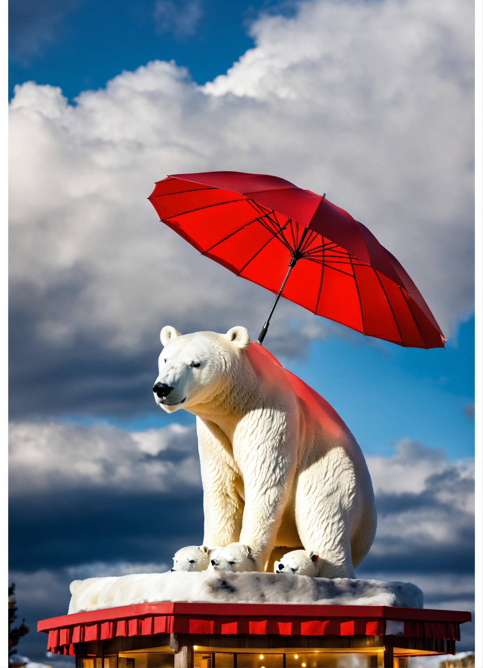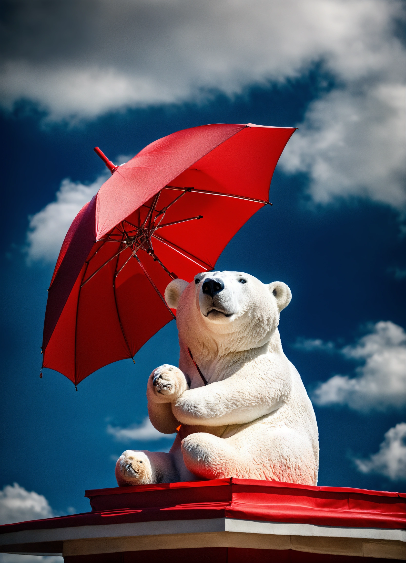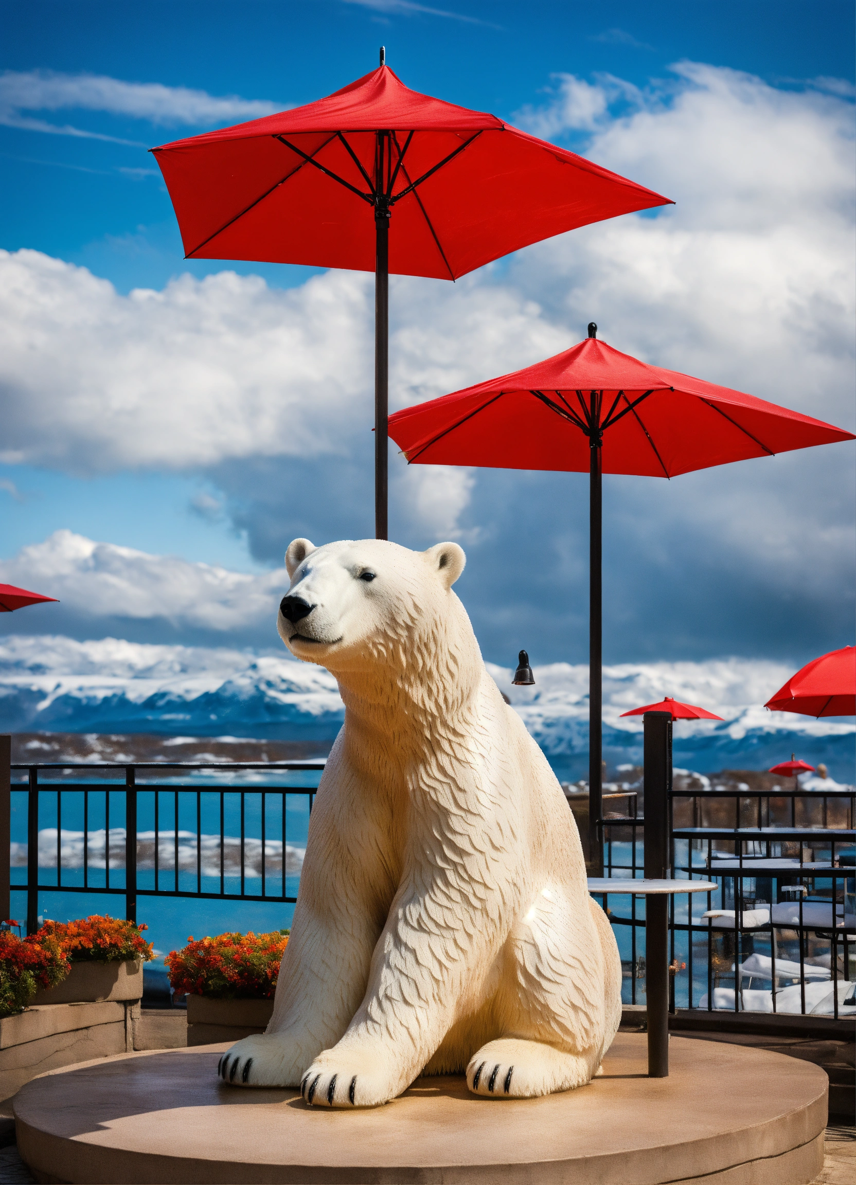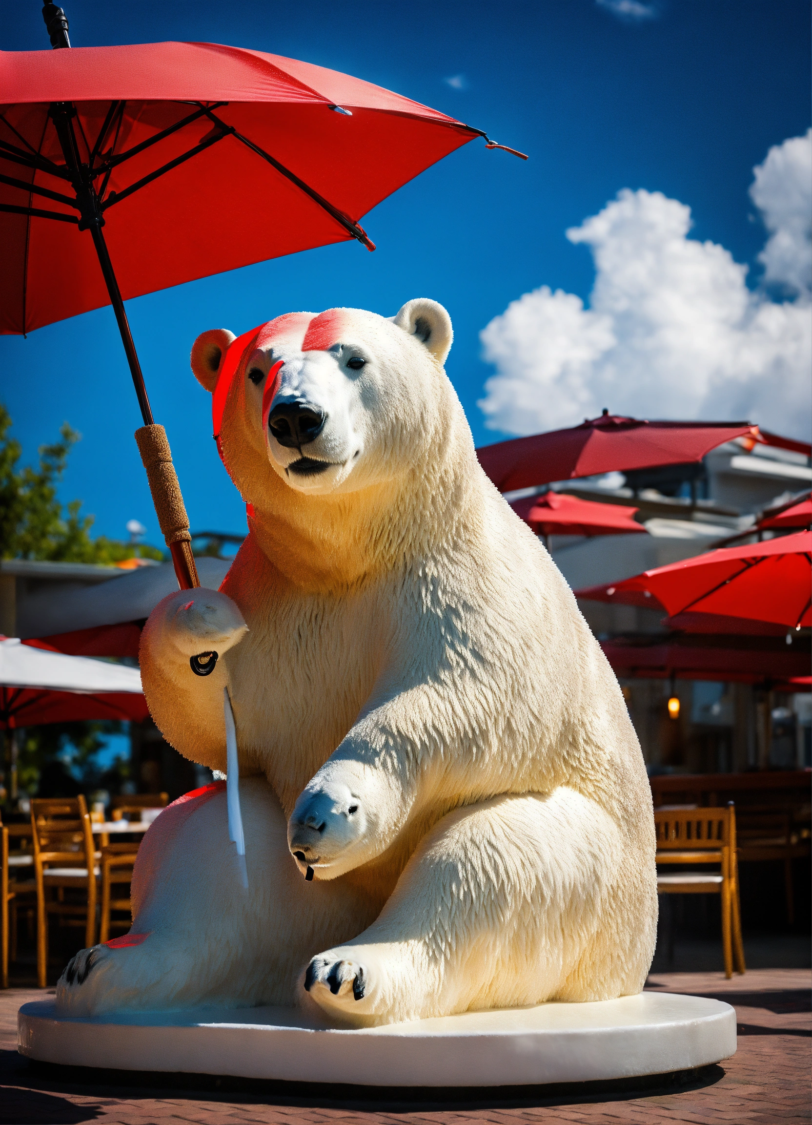 Abstract polar bear statue on a cloud holding a red umbrella outside restaurant