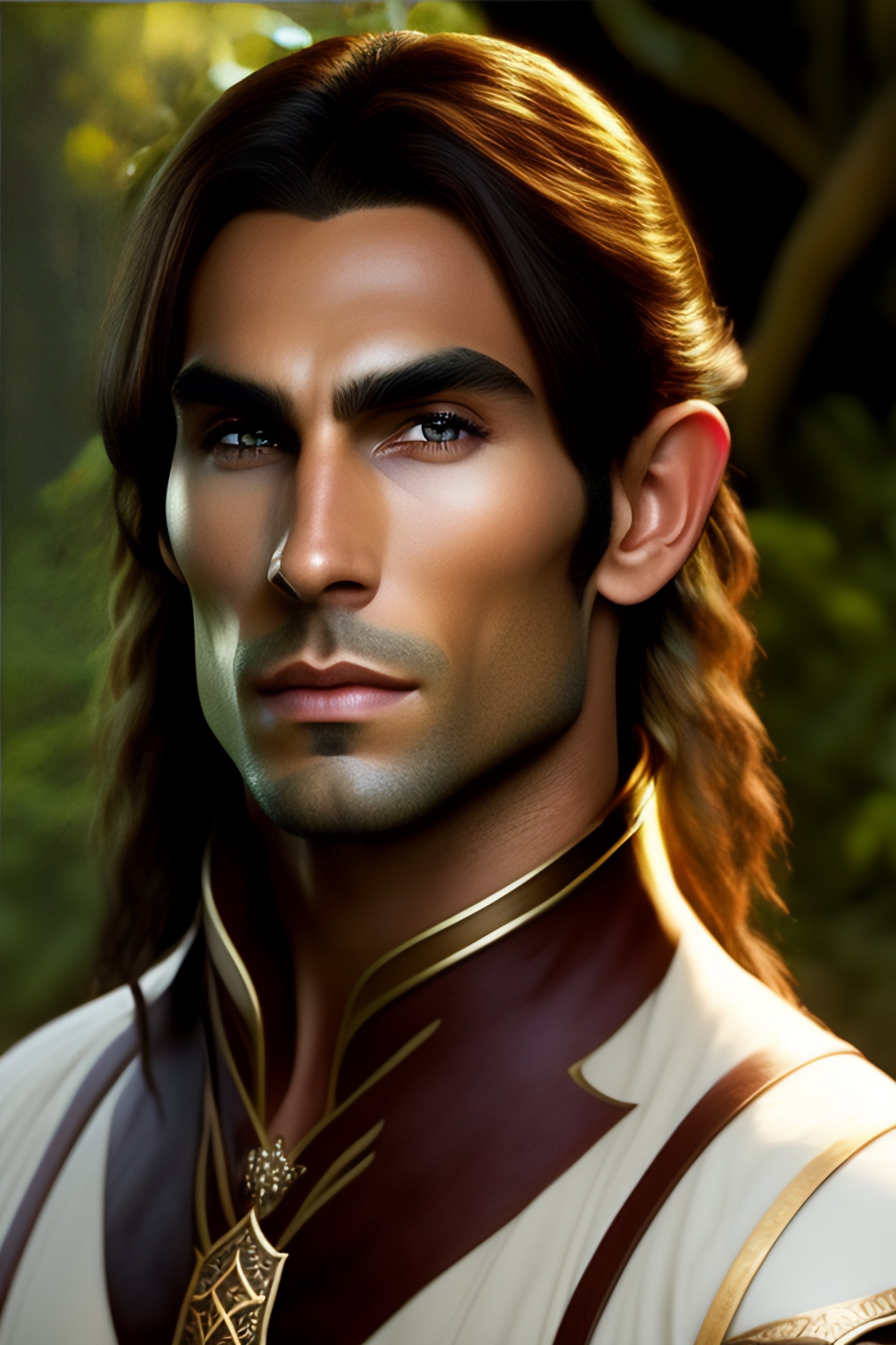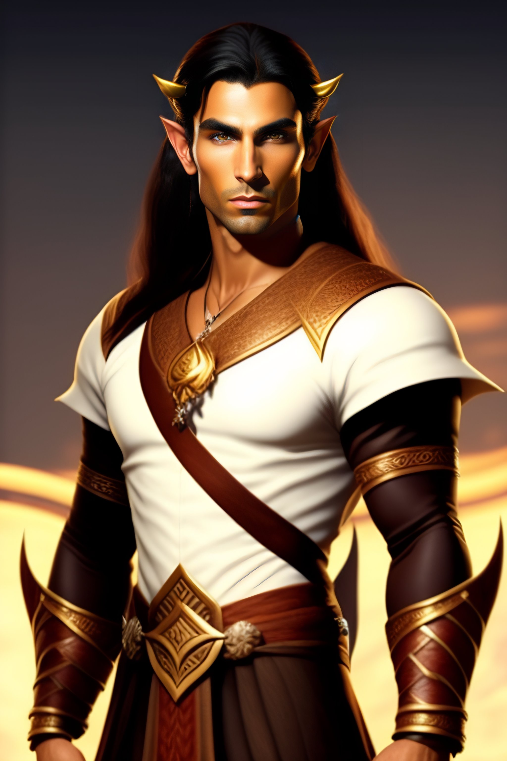 Male half-elf, 30 years, tanned complexion, round face, pointed ears, slanted eyes, brown eyes, brown hair, short hair, goatee, wearing fantasy clothes, a white shirt, a thick brown leather belt