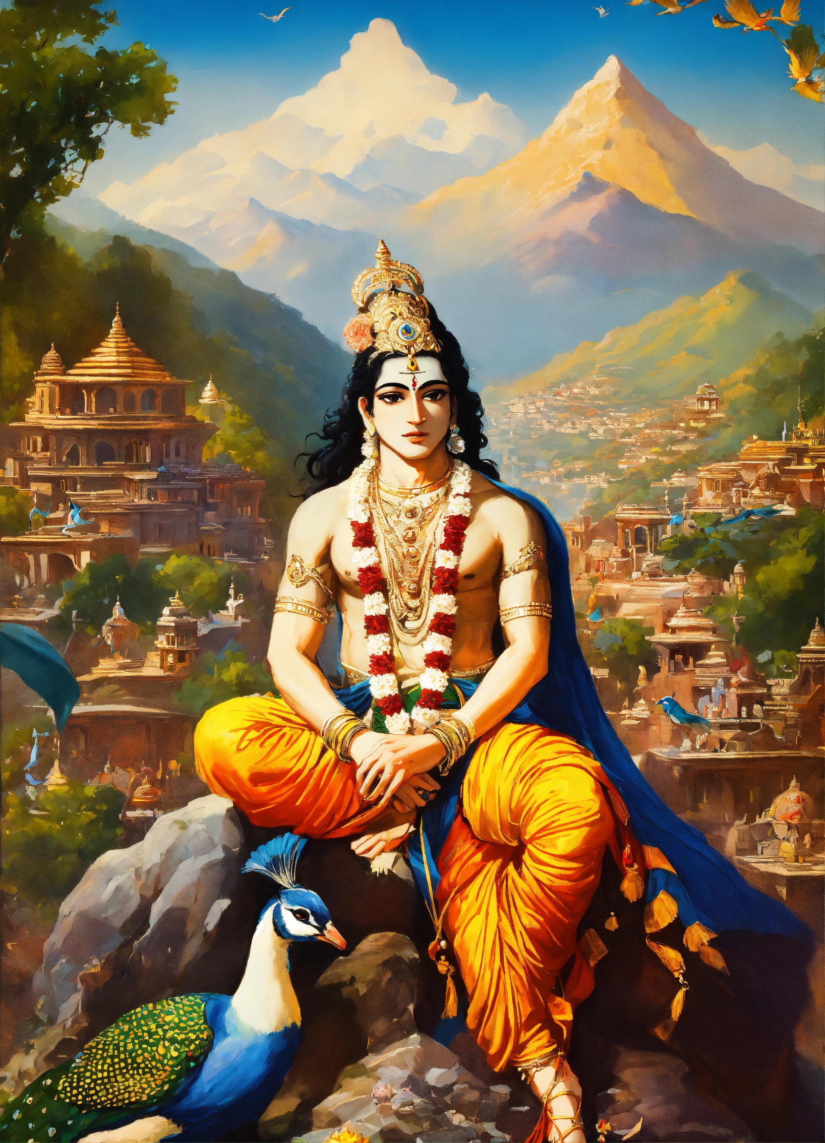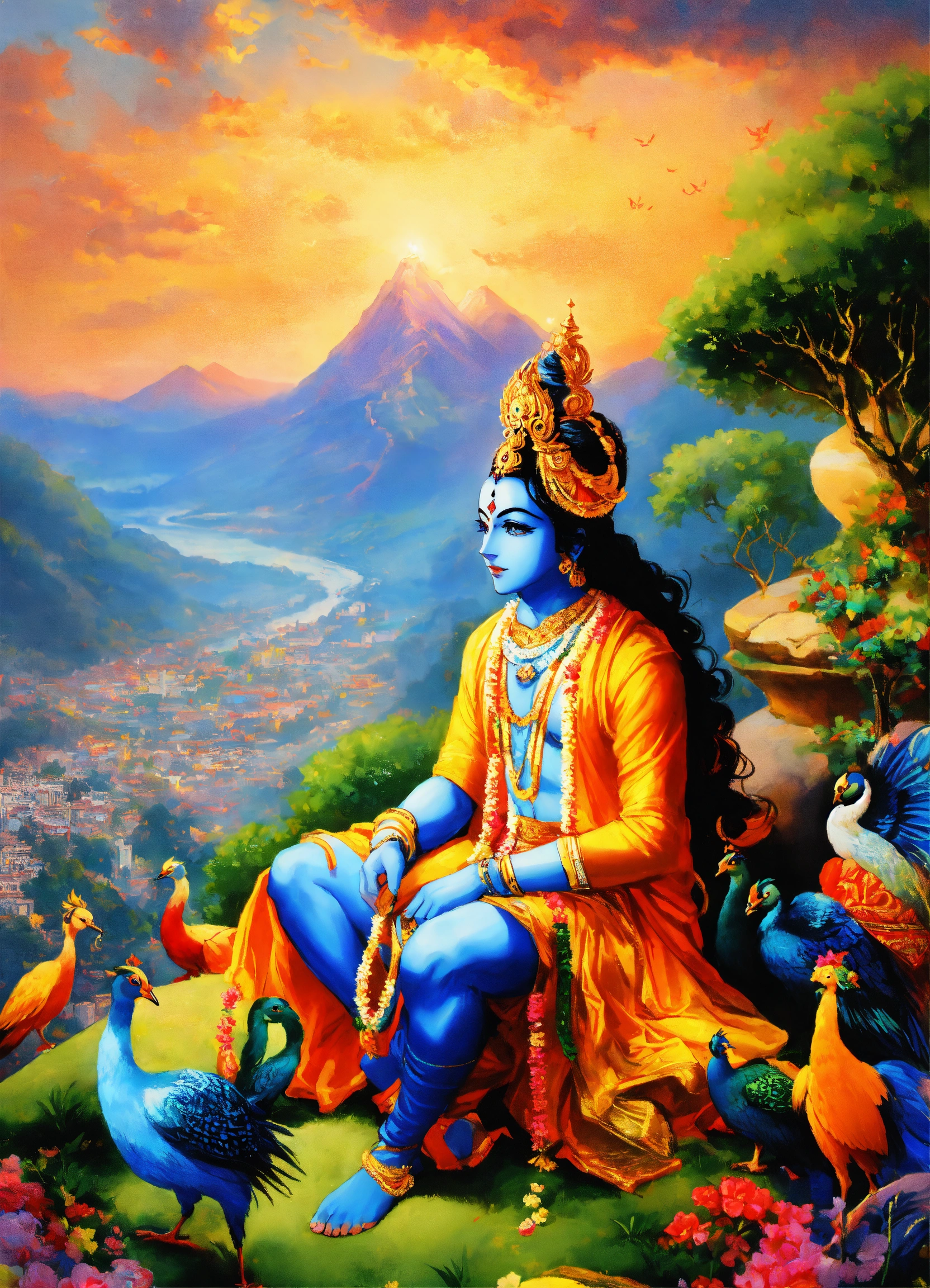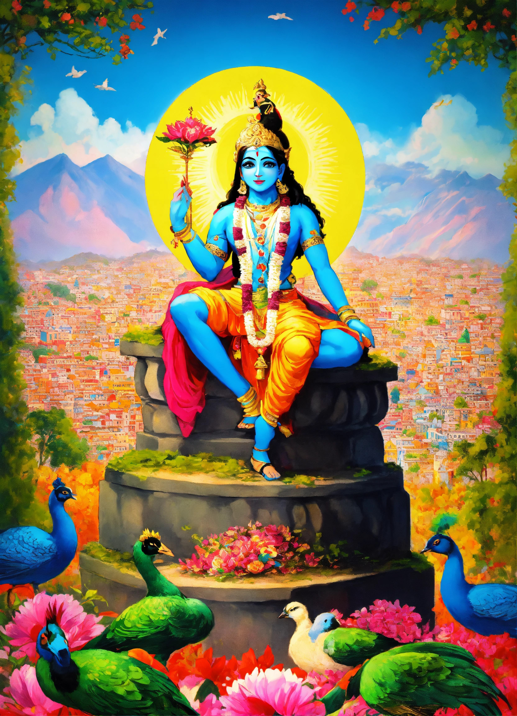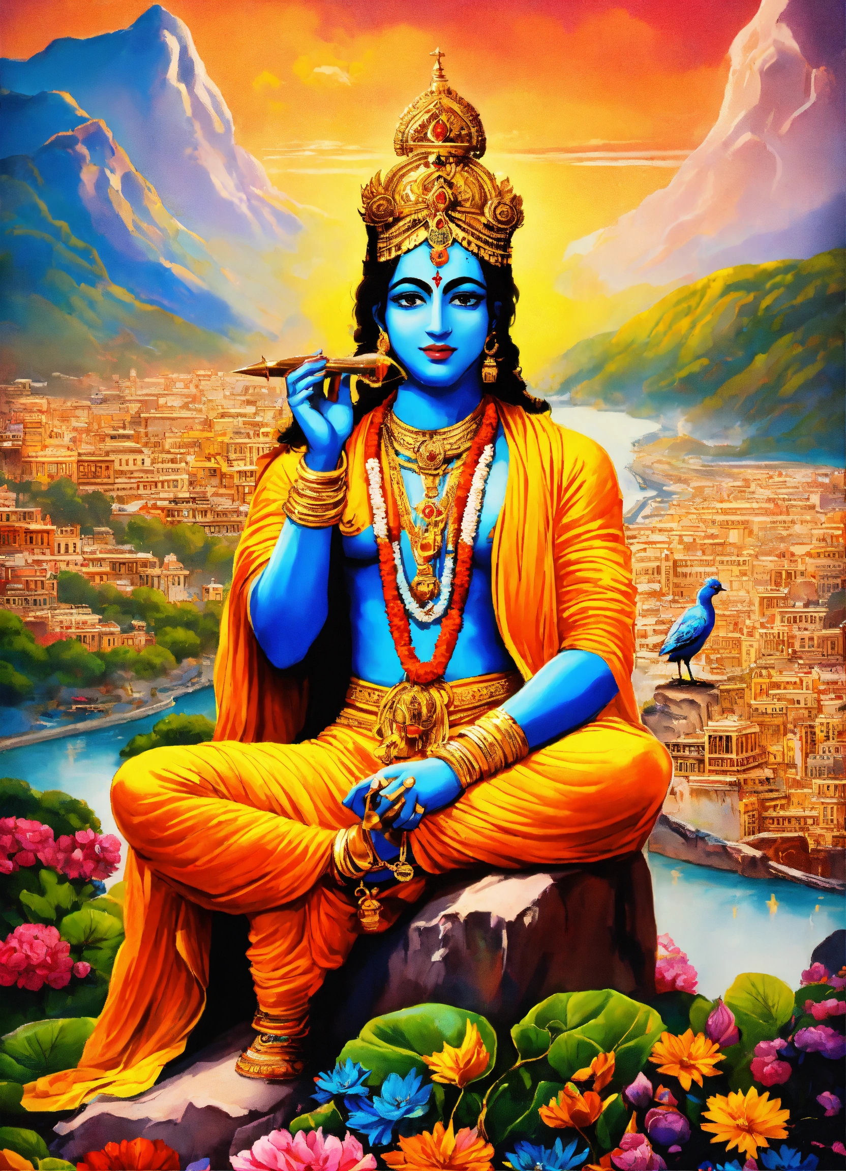 Lord krishna sitting on a sacred mountain in a vibrant cityscape