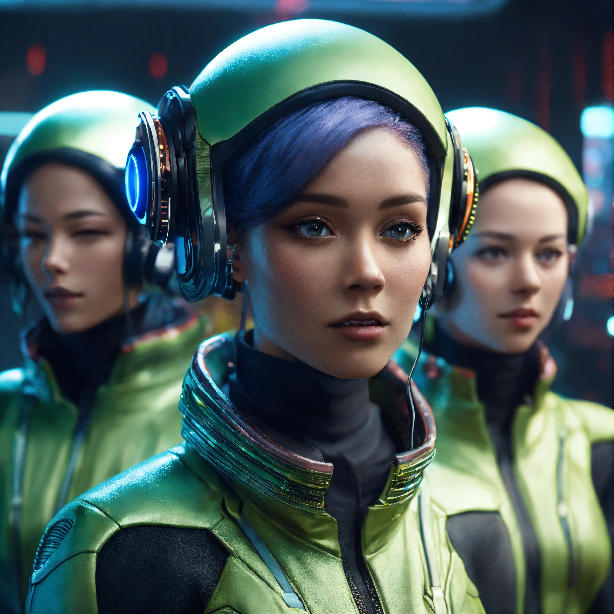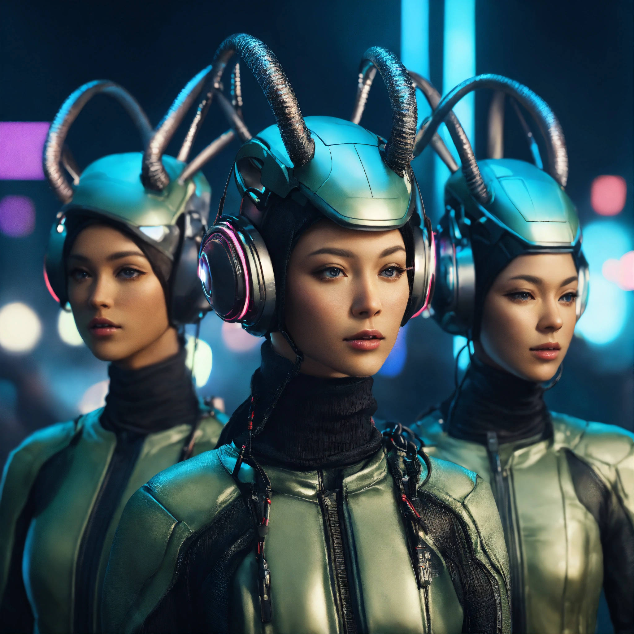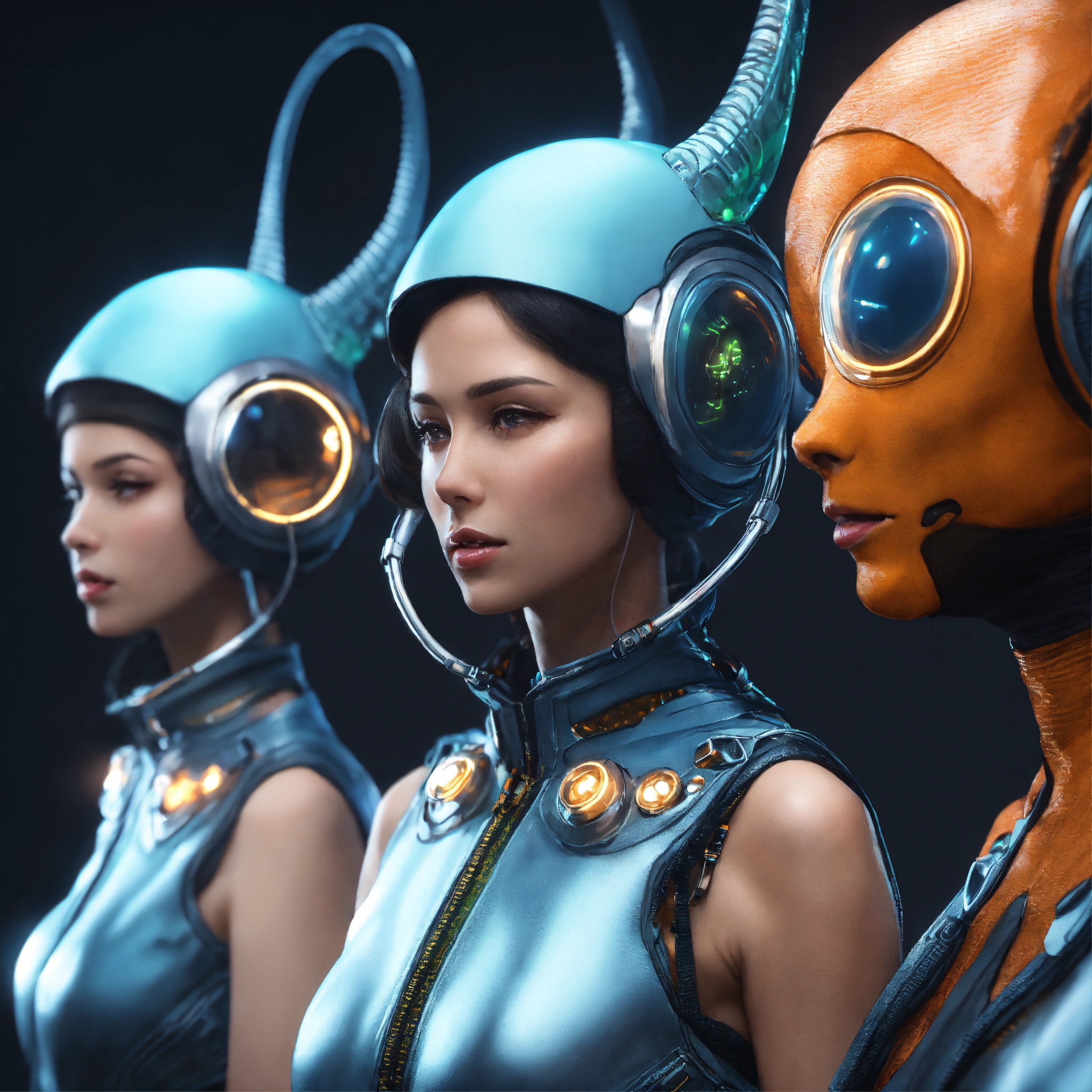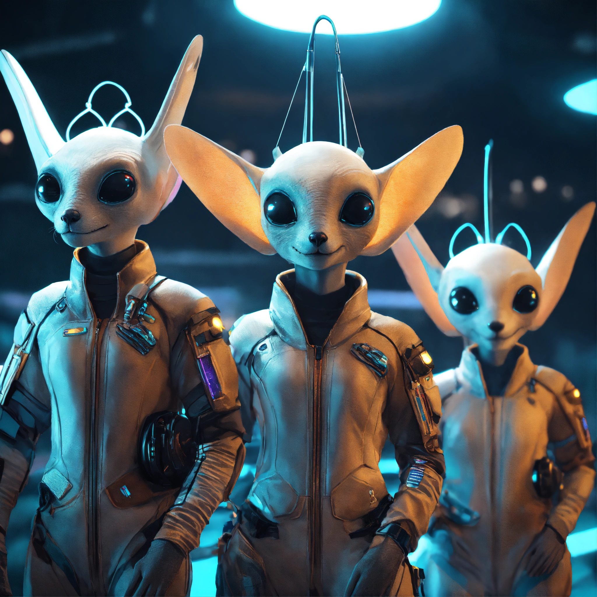 Zoom out of 4 lovable creatures wearing detailed alien ear antennas with futuristic clothing, futuristic, sci-fi, realistic, 8k