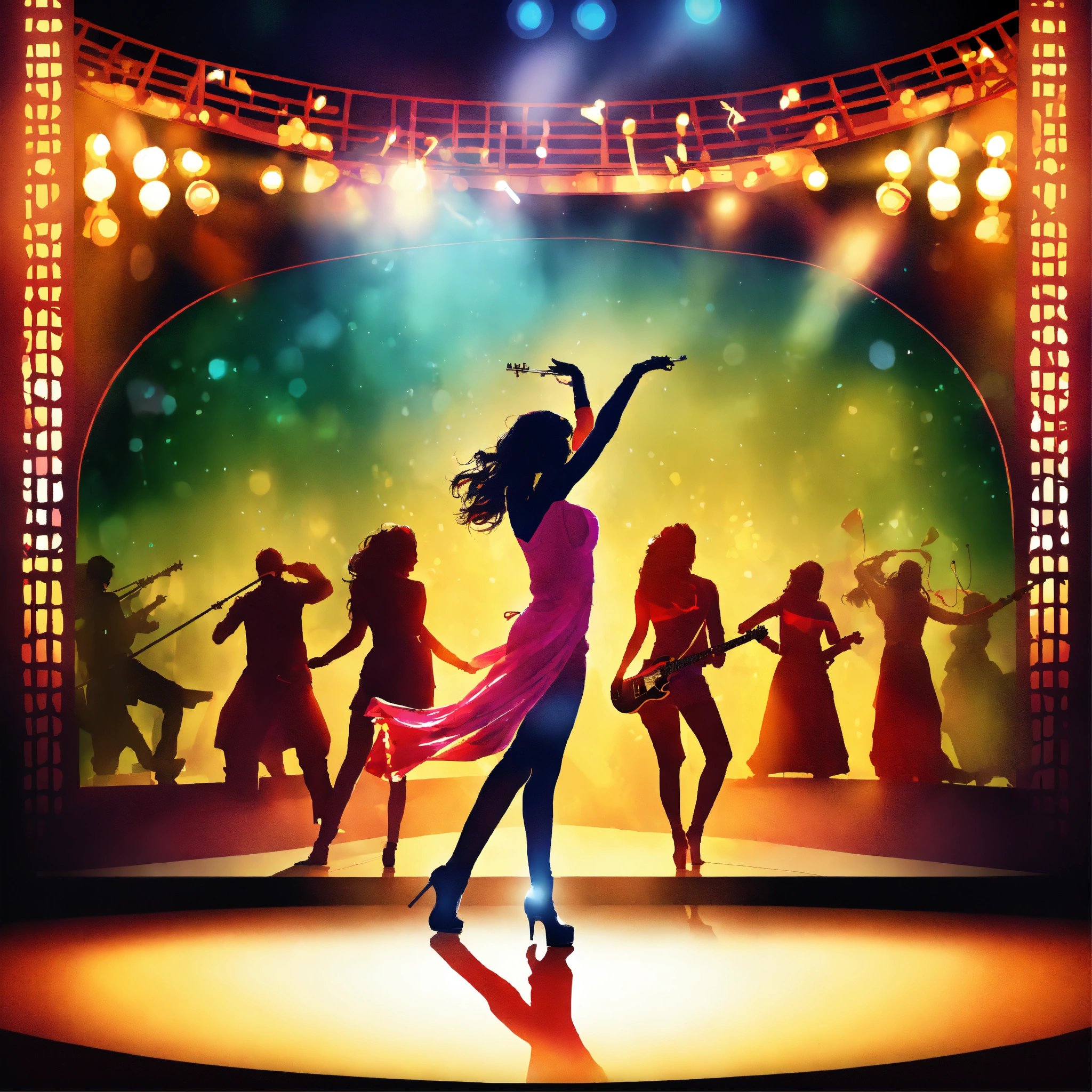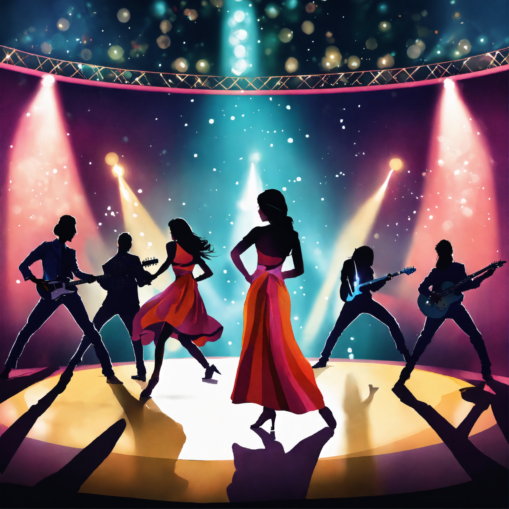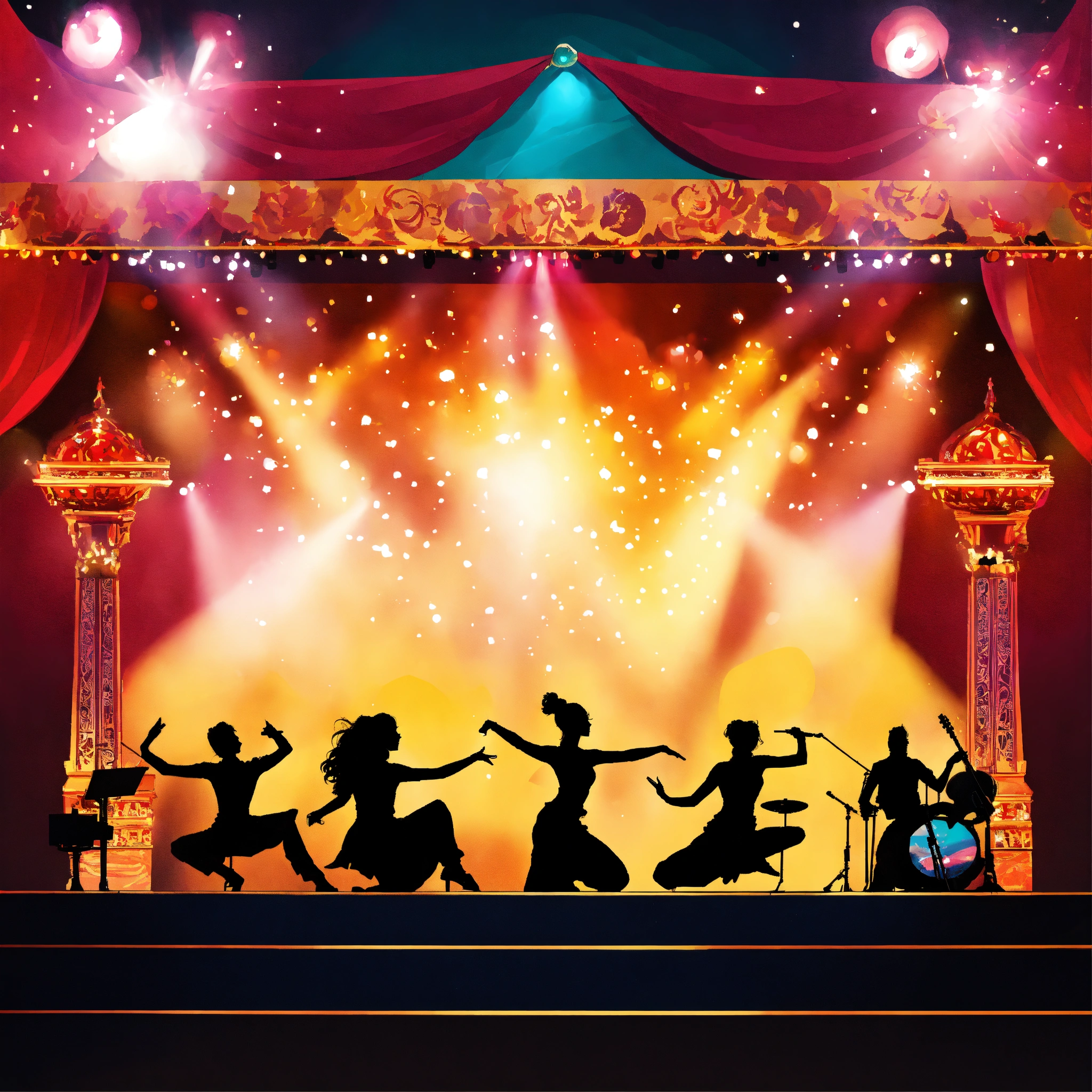 A dance and musical concert poster with stage view, include a live rock band and female bollywood dancers on stage, dont include any text, make it a surrealistic image