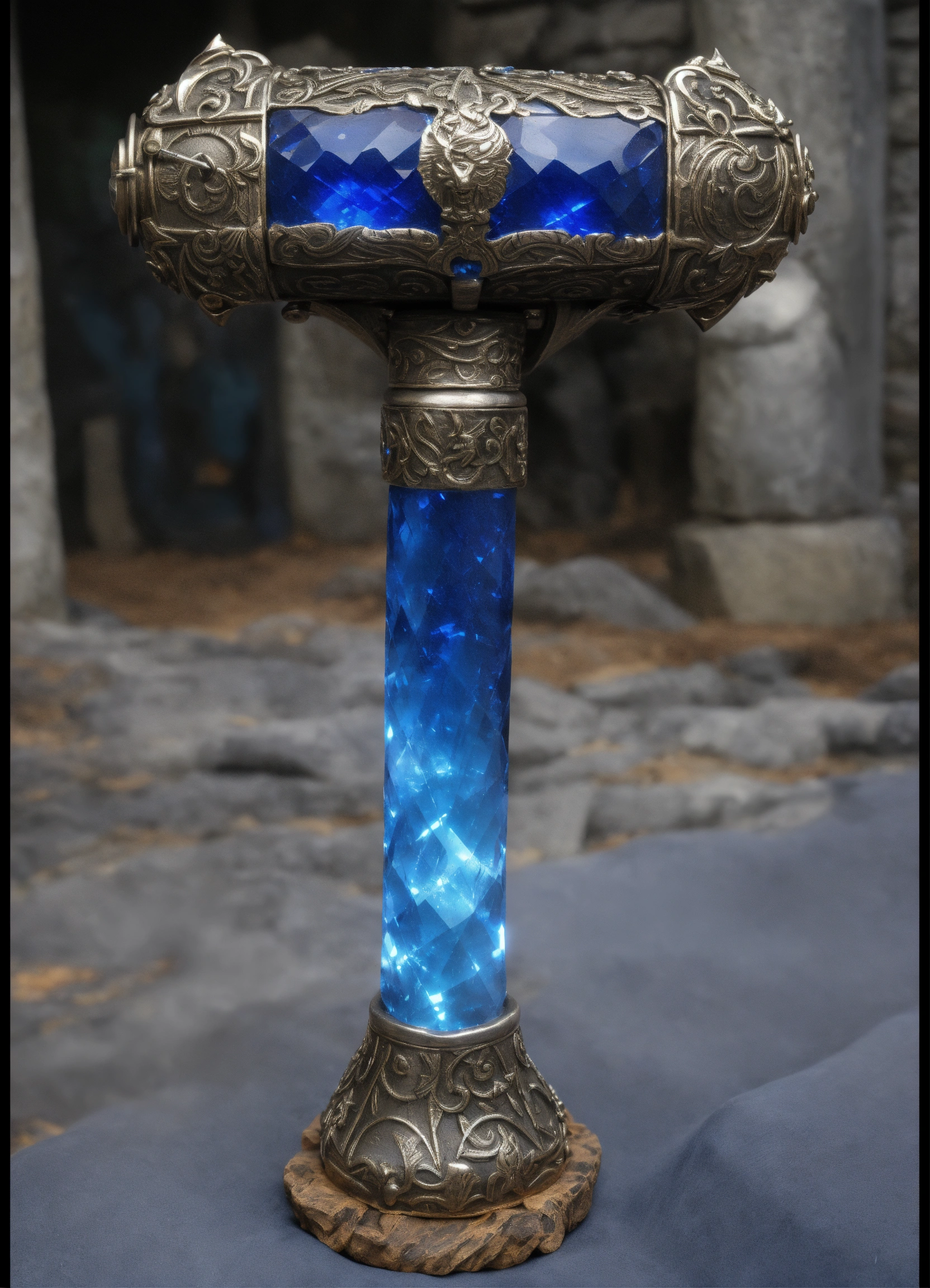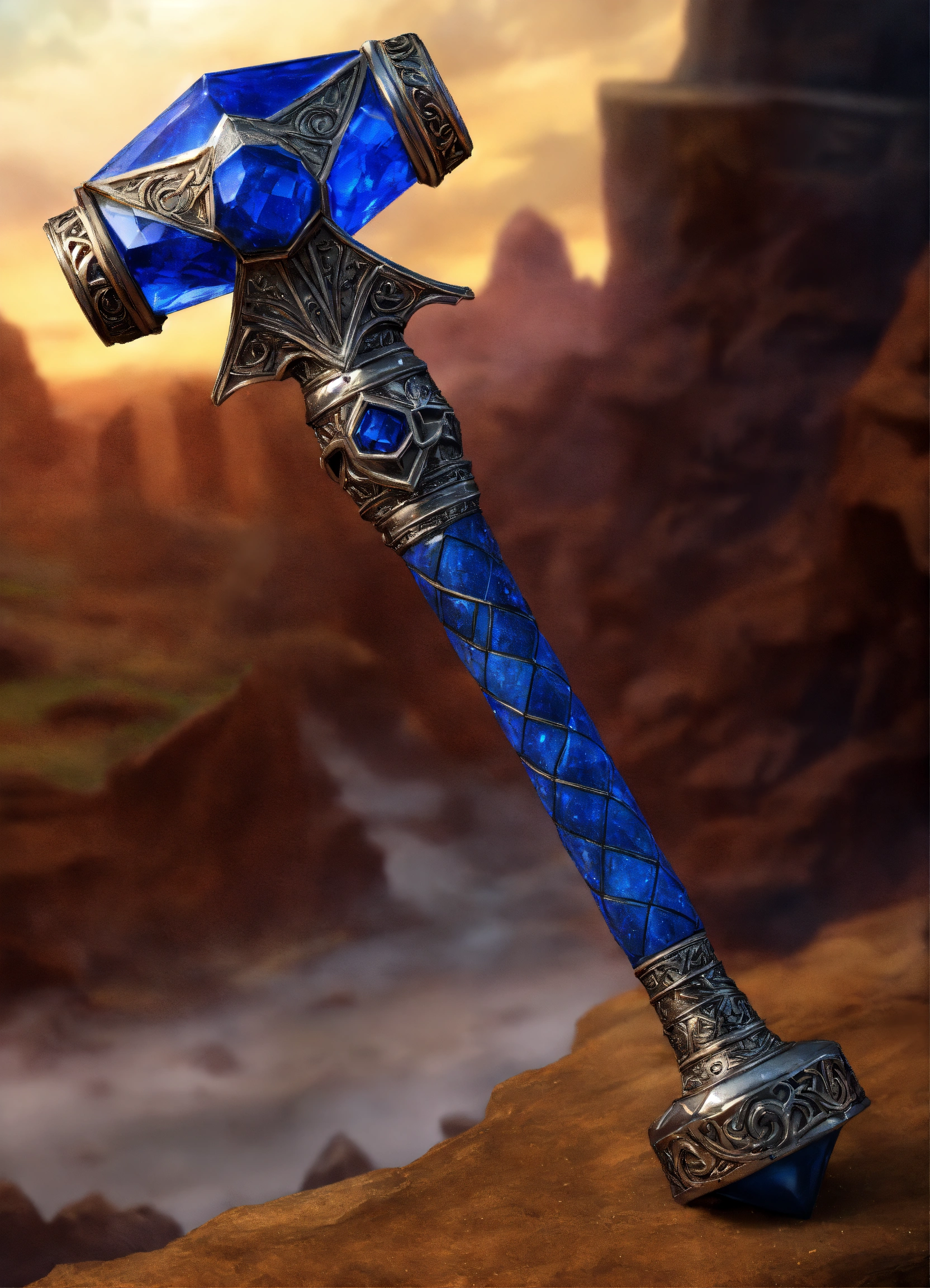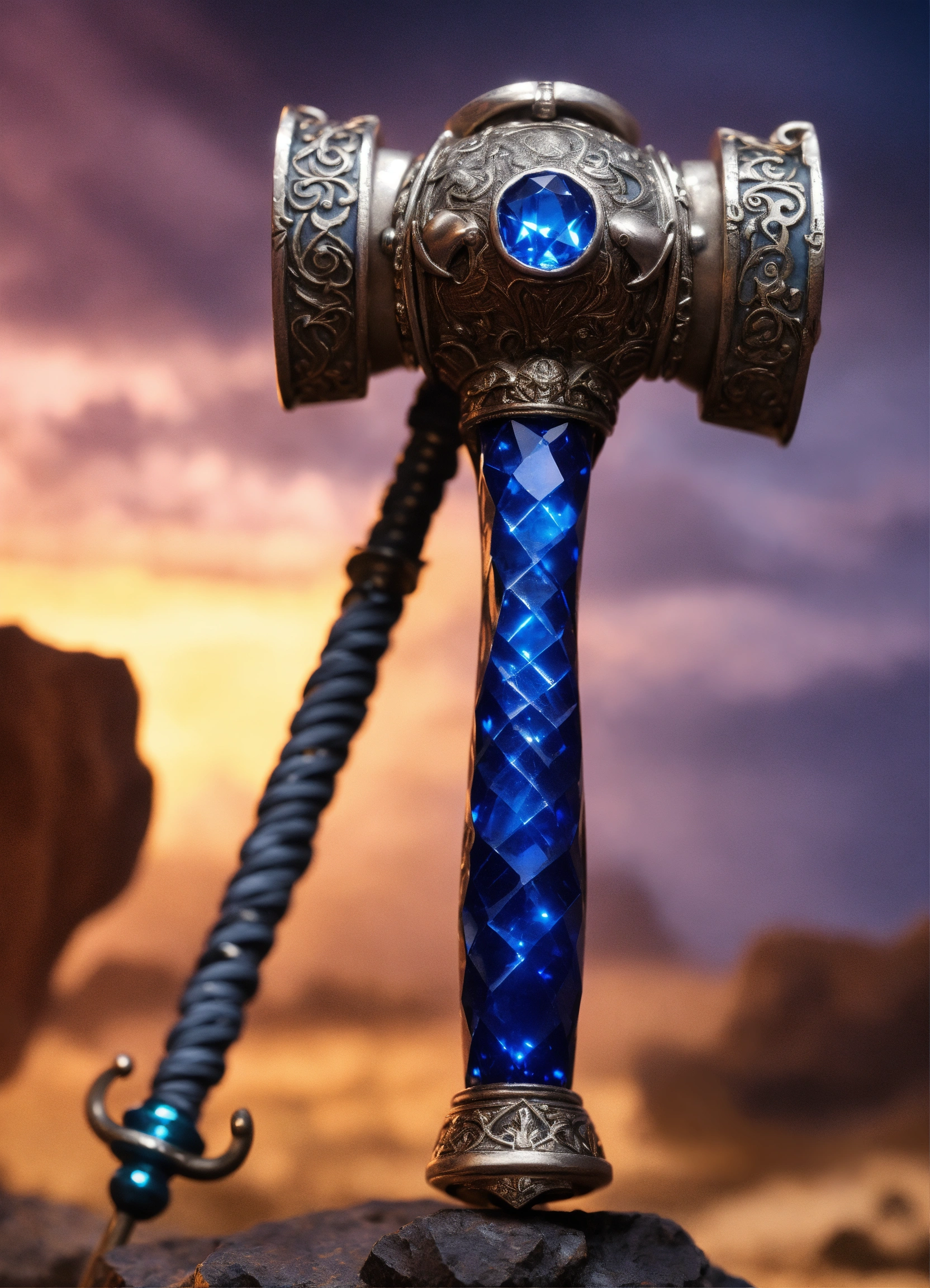 Dungeons & dragons item, warhammer, better calued a maul because of how large it is. the hammer's head is roughly the size of an anvil. the head and neck are made of silver with inlays of sapphire blue. carved intricately with thunder and lightning themes. it's four foot long handle is wrapped with blue leather and stitched with silver thread. pommel is a large carved sapphire that glows magically. fantasy, realistic. no background.
