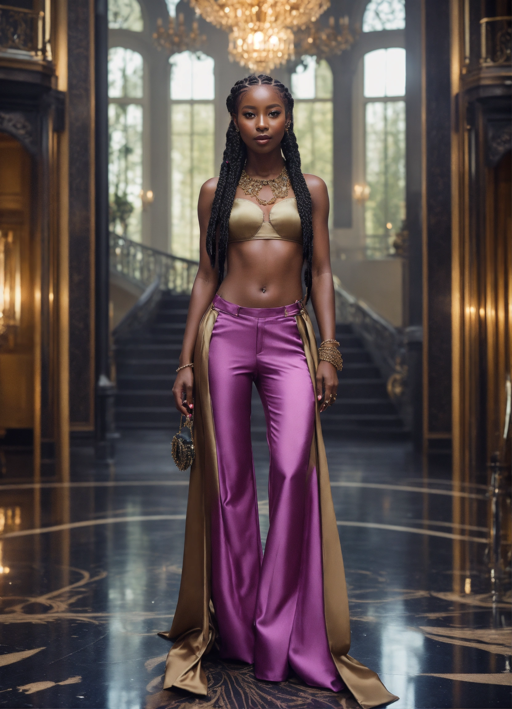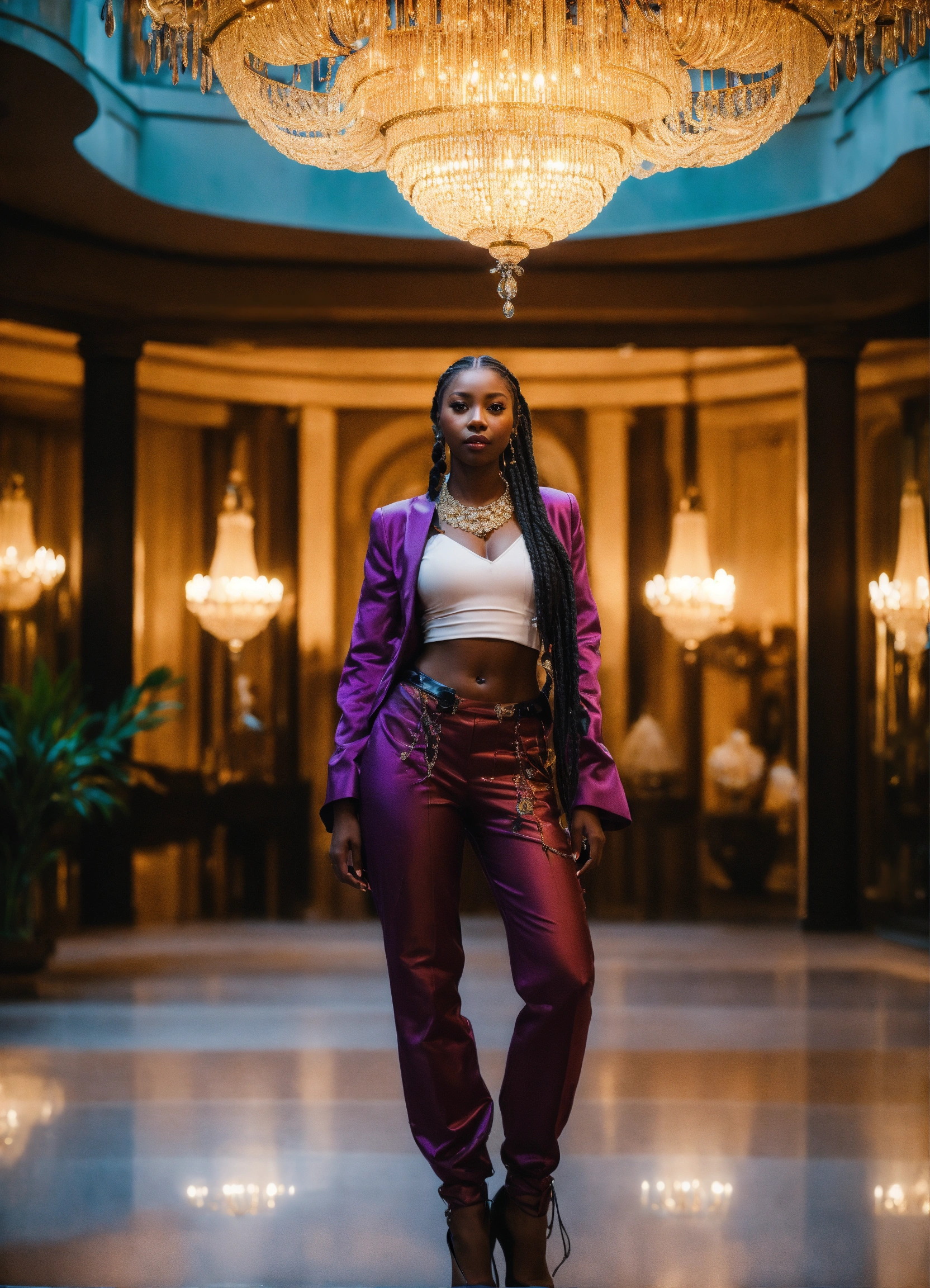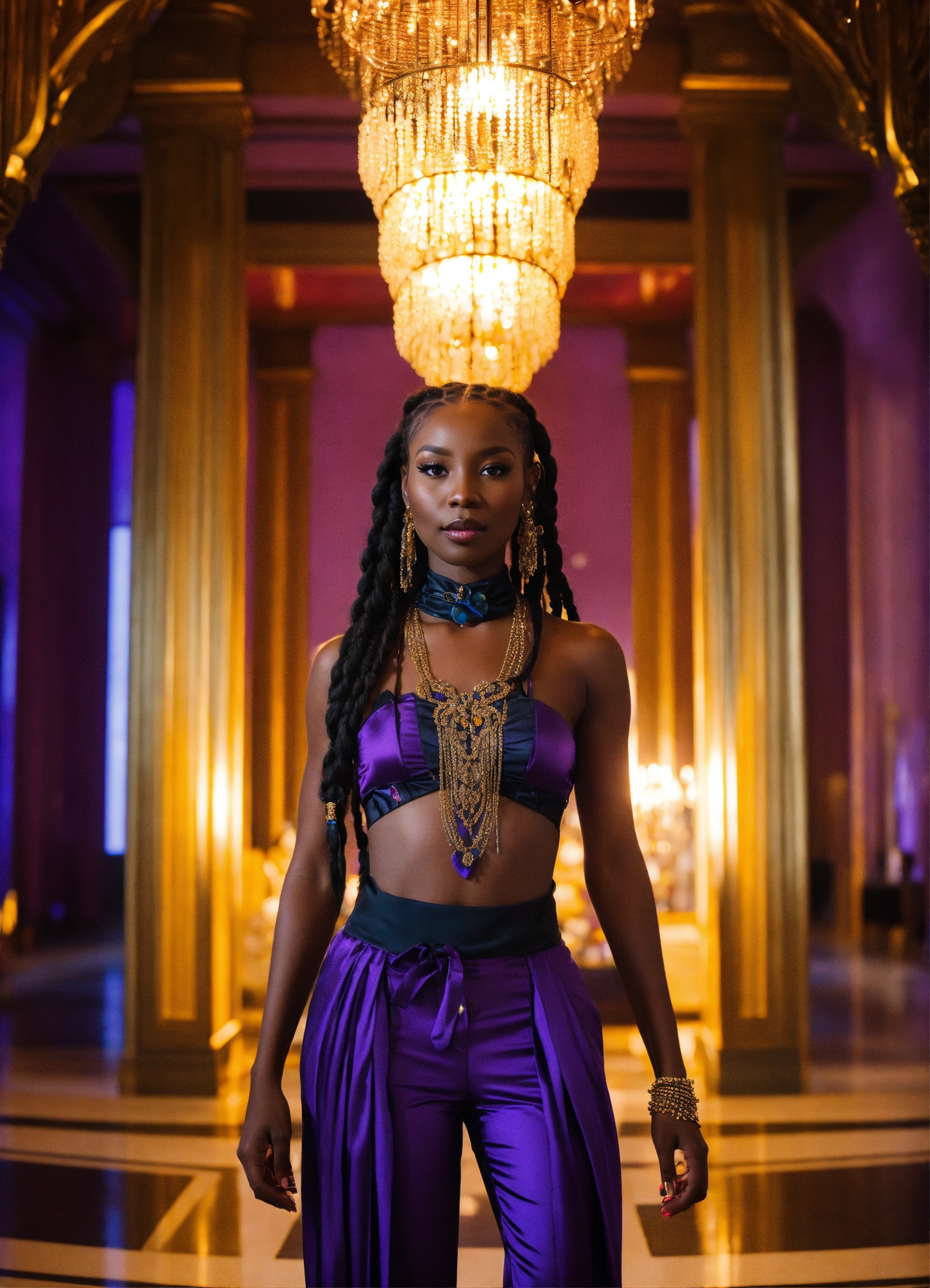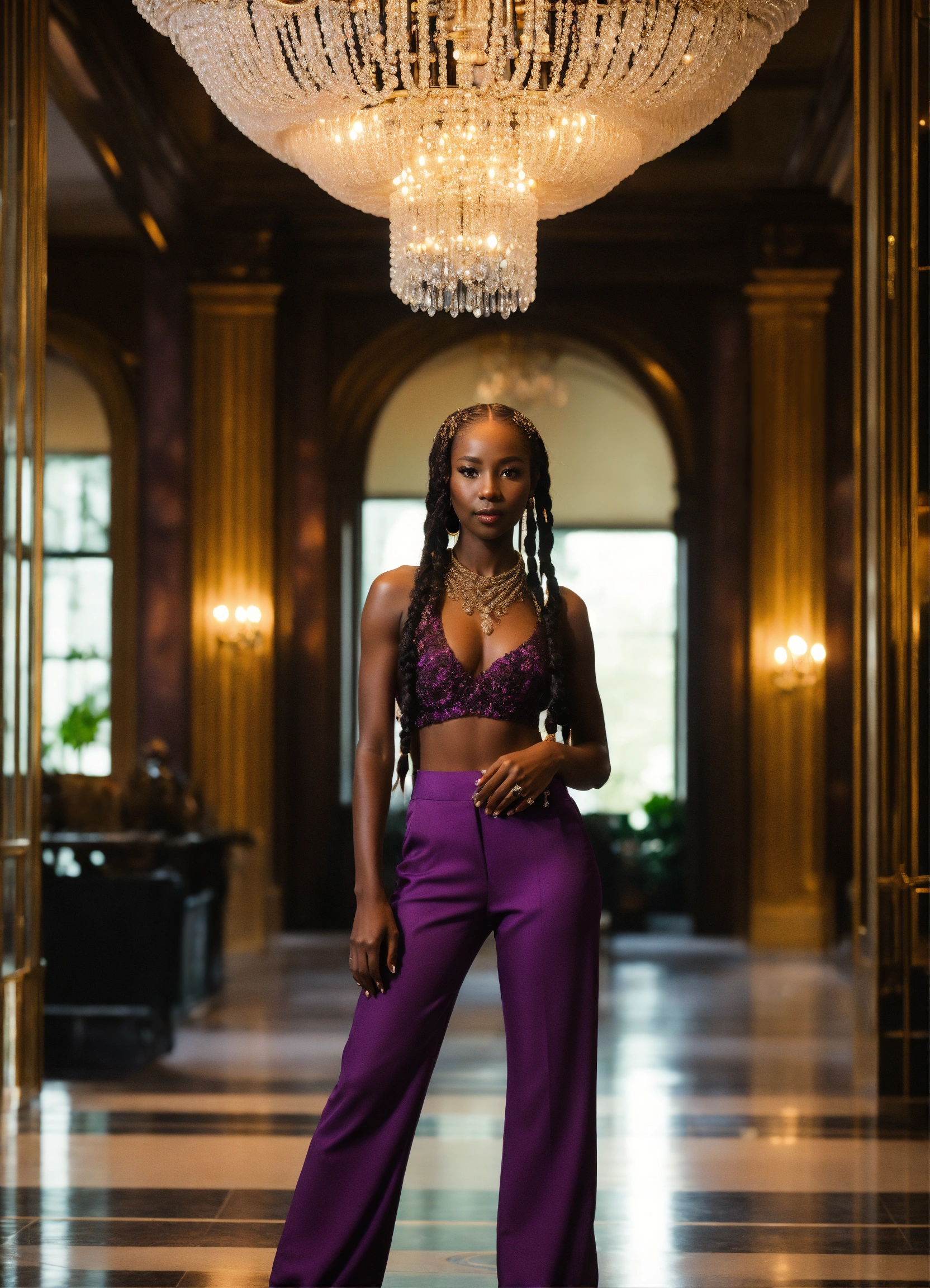 Alien female, 35 years old with purple eyes, dark skin, and long braids. small frame. dressed in haute couture pants. standing in a luxurious atrium during daylight. there is a large chandelier. outgoing persona.