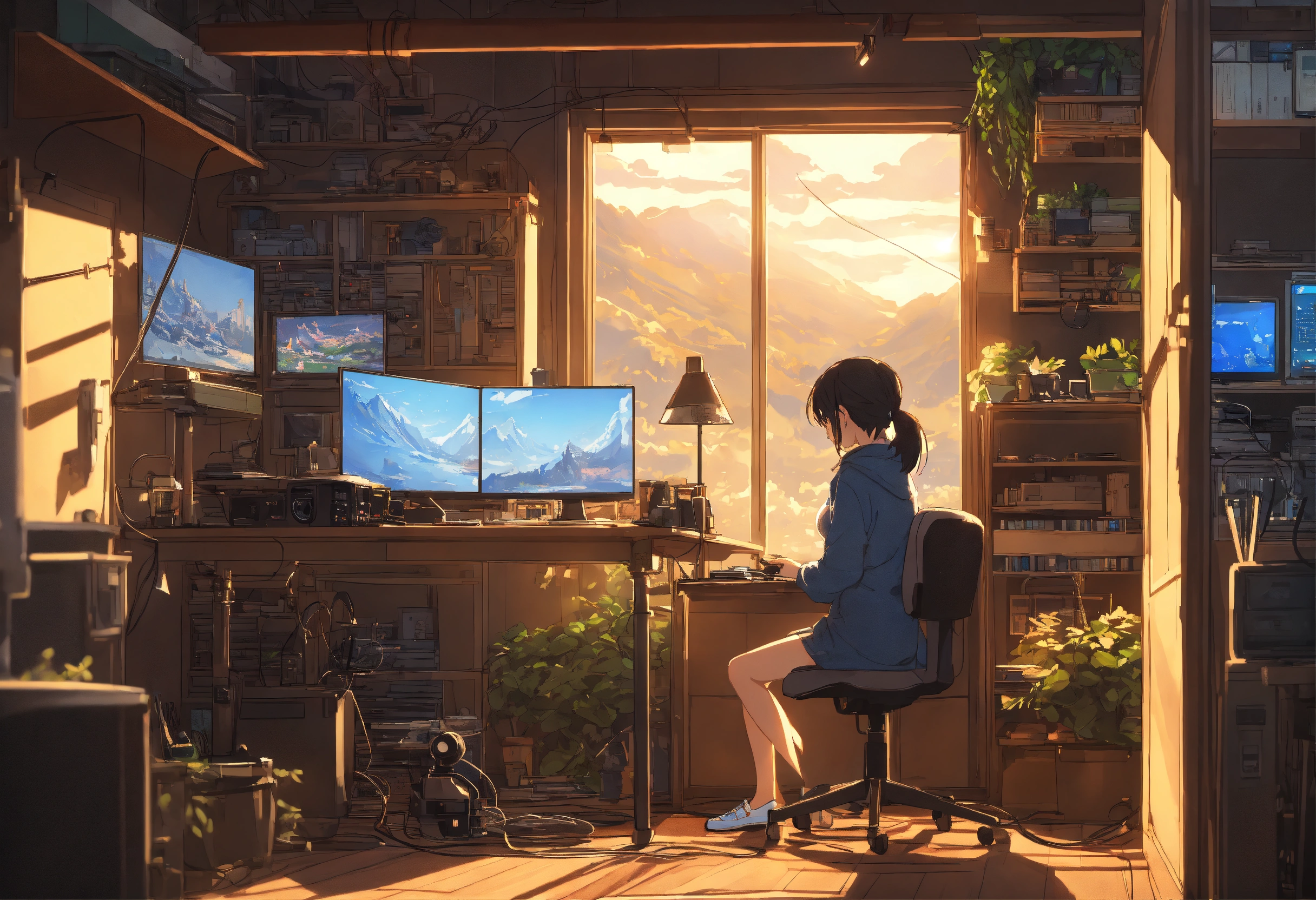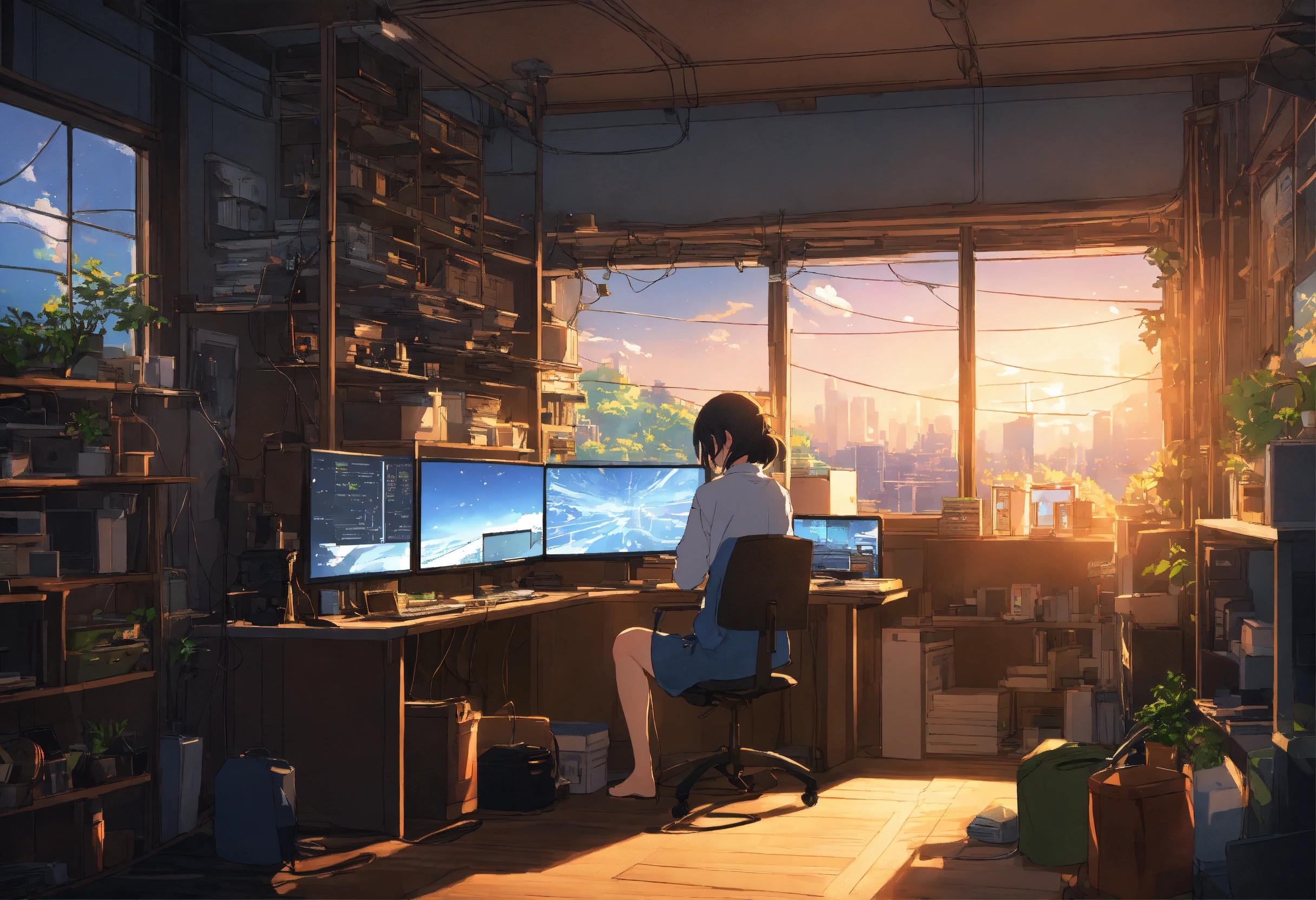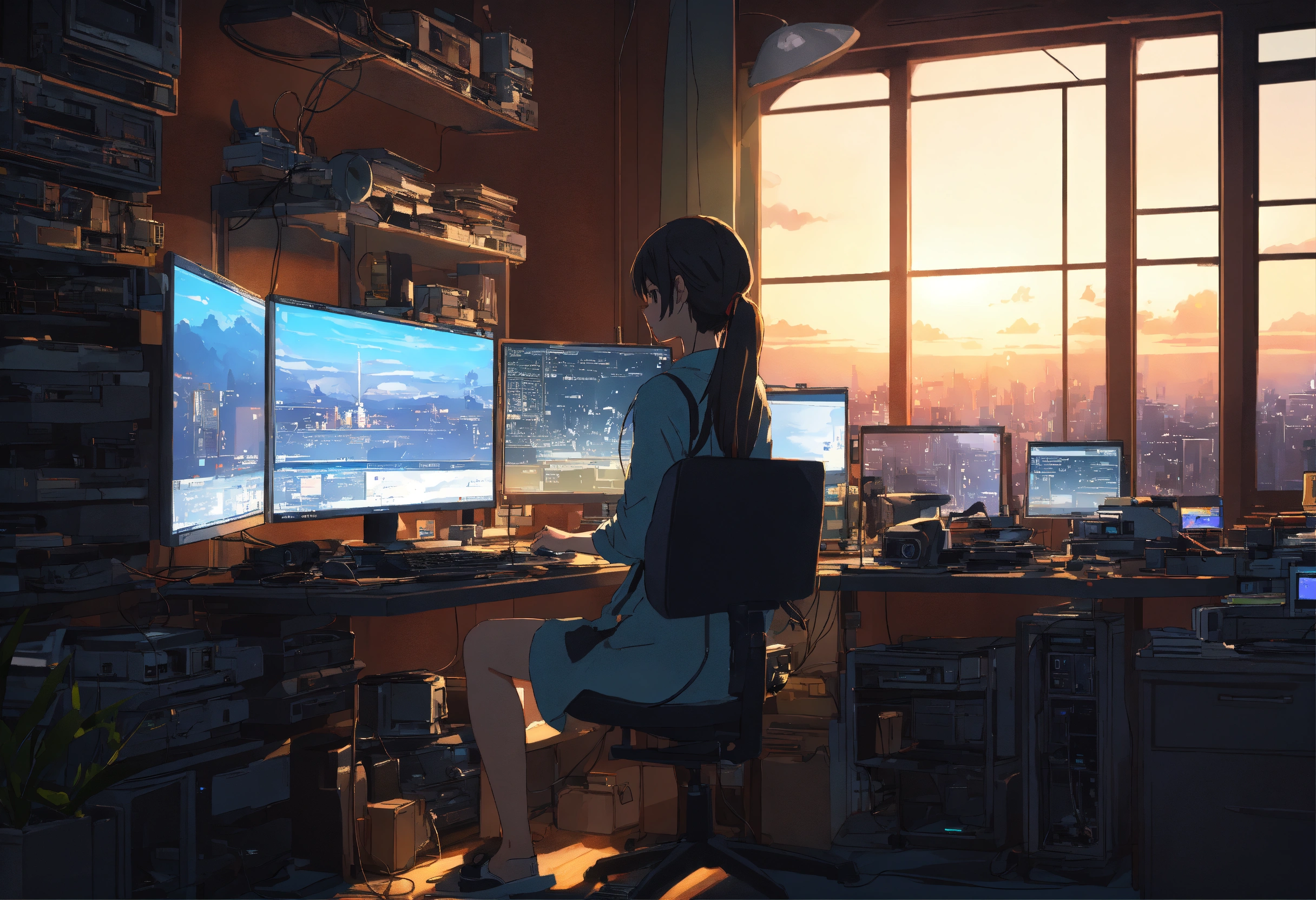 Create a high resolution artwork of anime girl is programming at a computer in a room full of gadgets, web developer, by makoto shinkai and ghibli studio, outlined silhouettes, dramatic lighting, highly detailed, incredible quality, trending on artstation, masterpiece, 8k