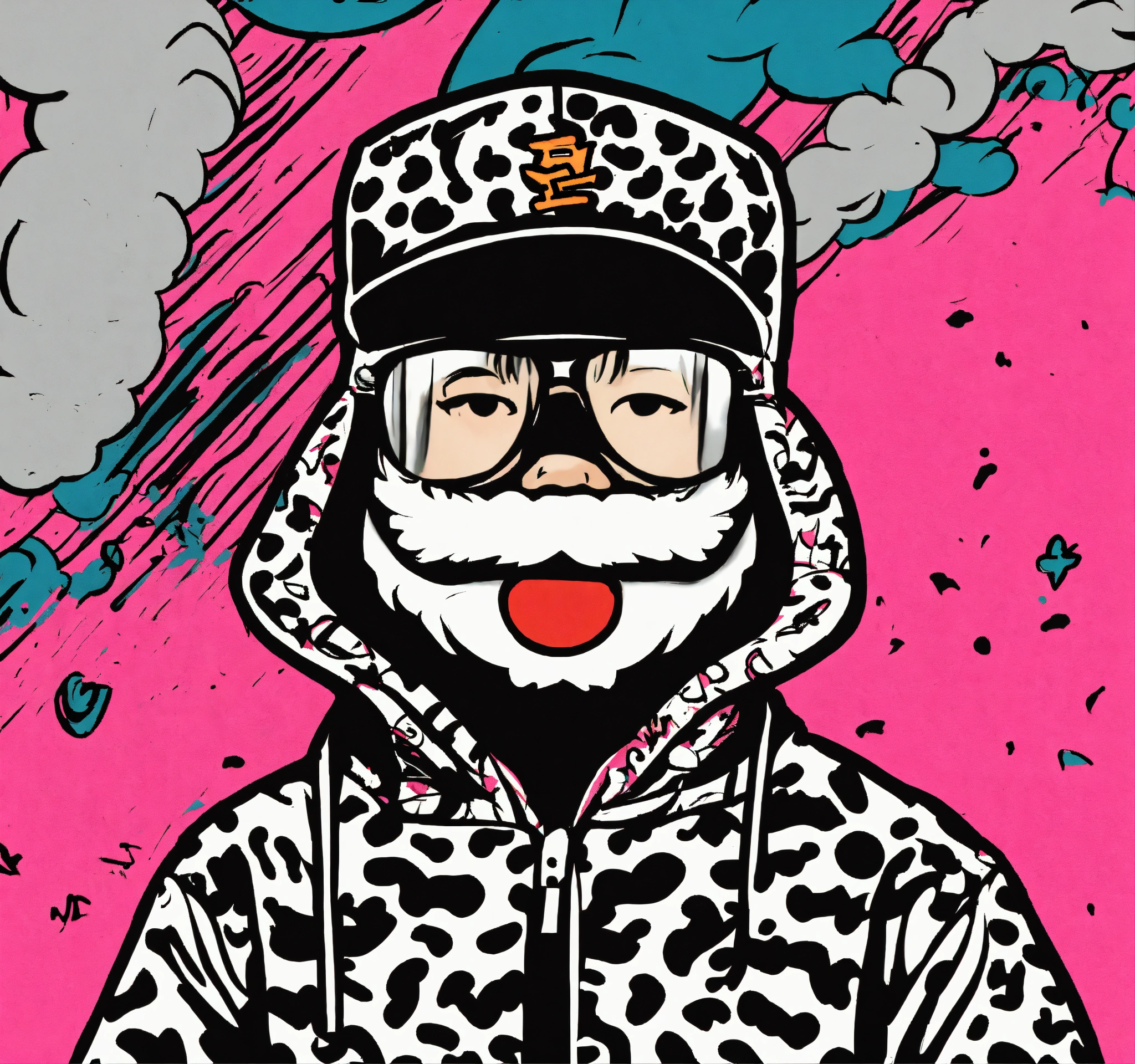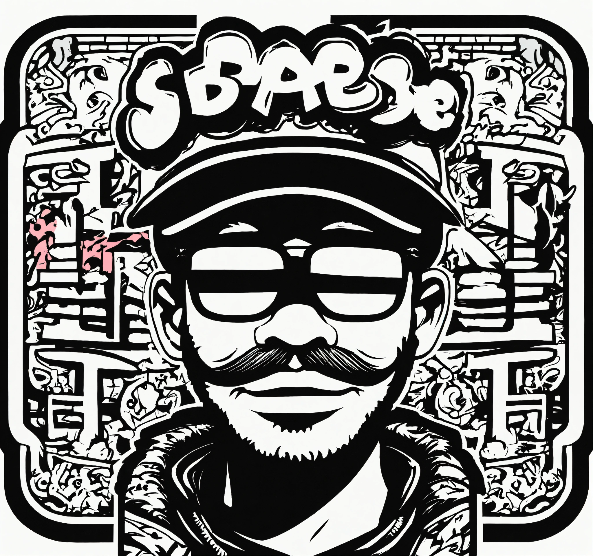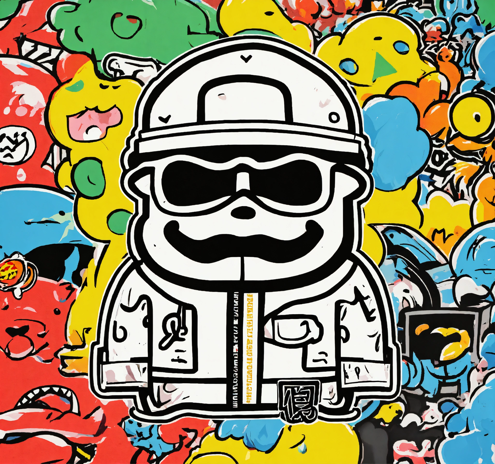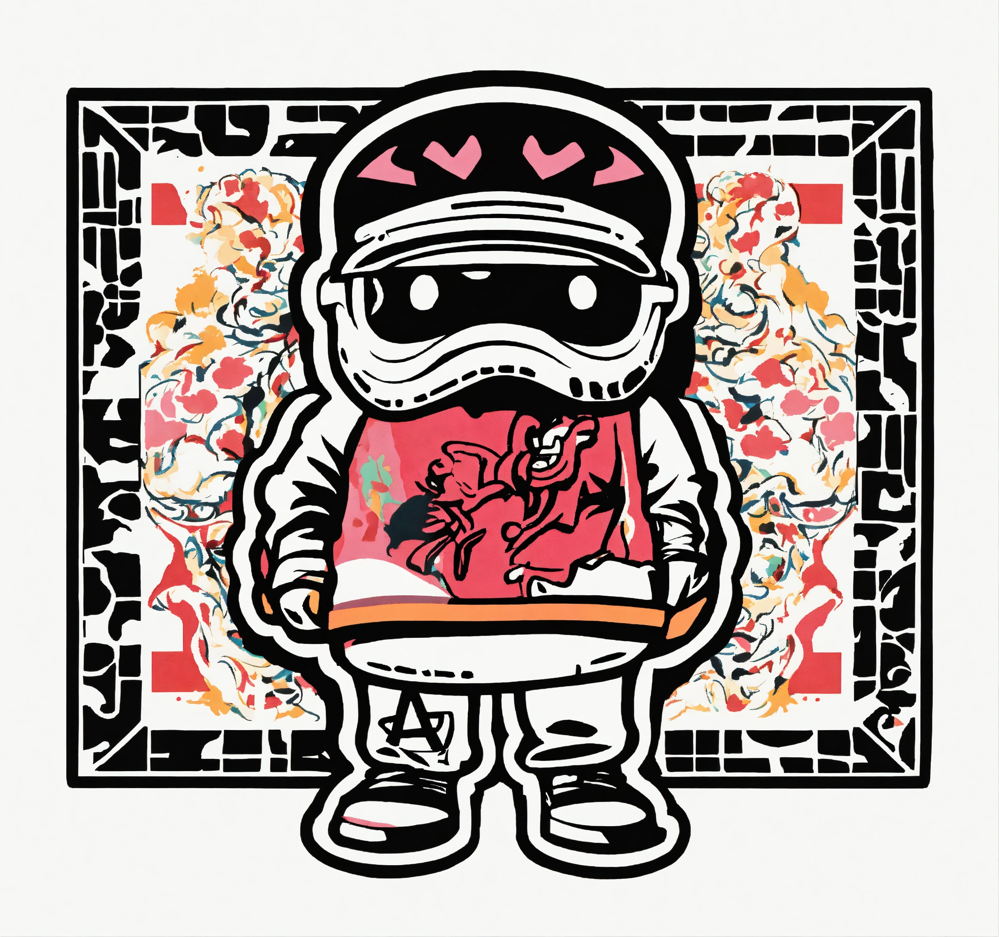 Keith harring style japanese bape graffiti cartoon logo design of a nigo bape style a fantasy mascot, nigo boondock's inspired flat vector, fashion company logo, andy warhol style, color black and white, white background.
