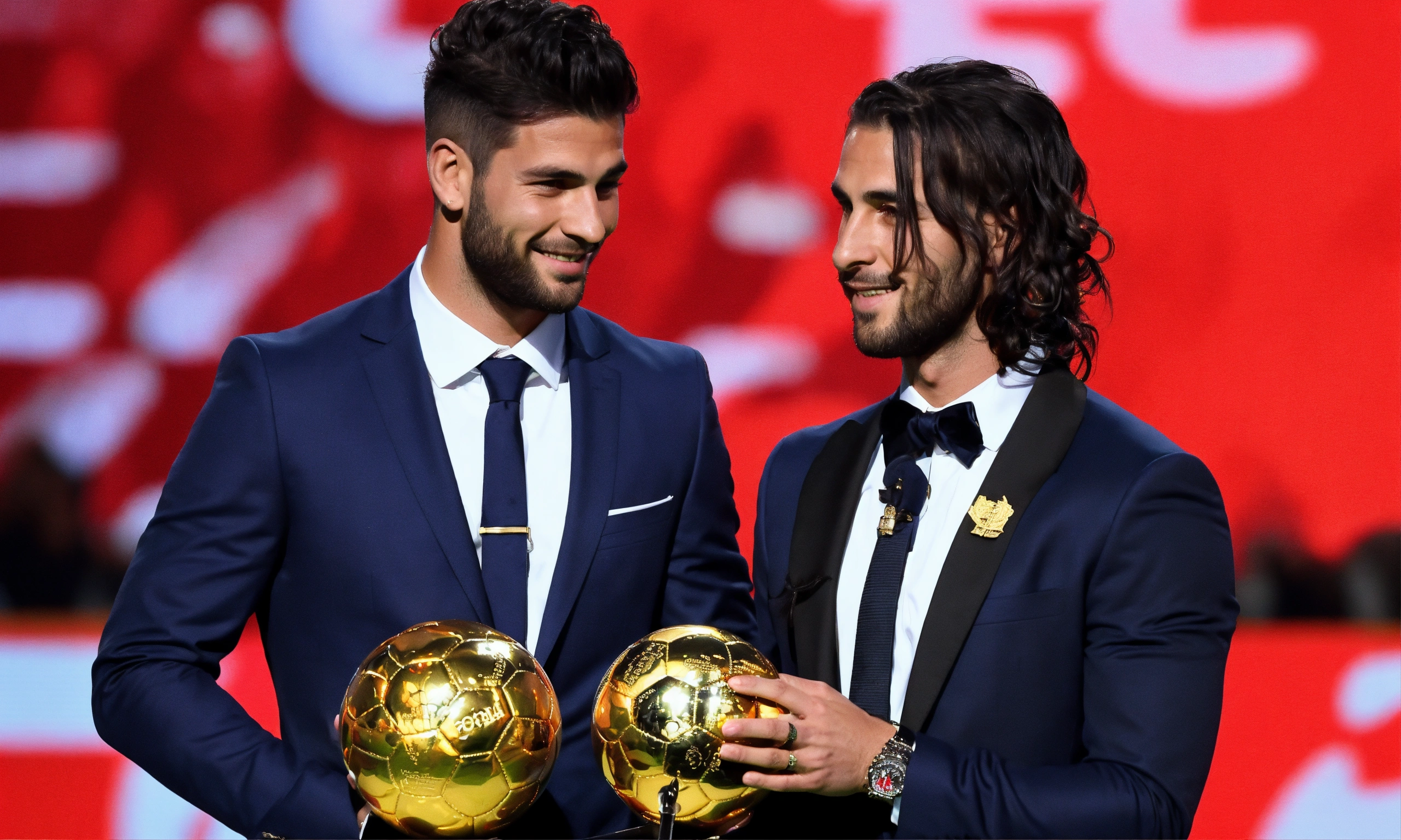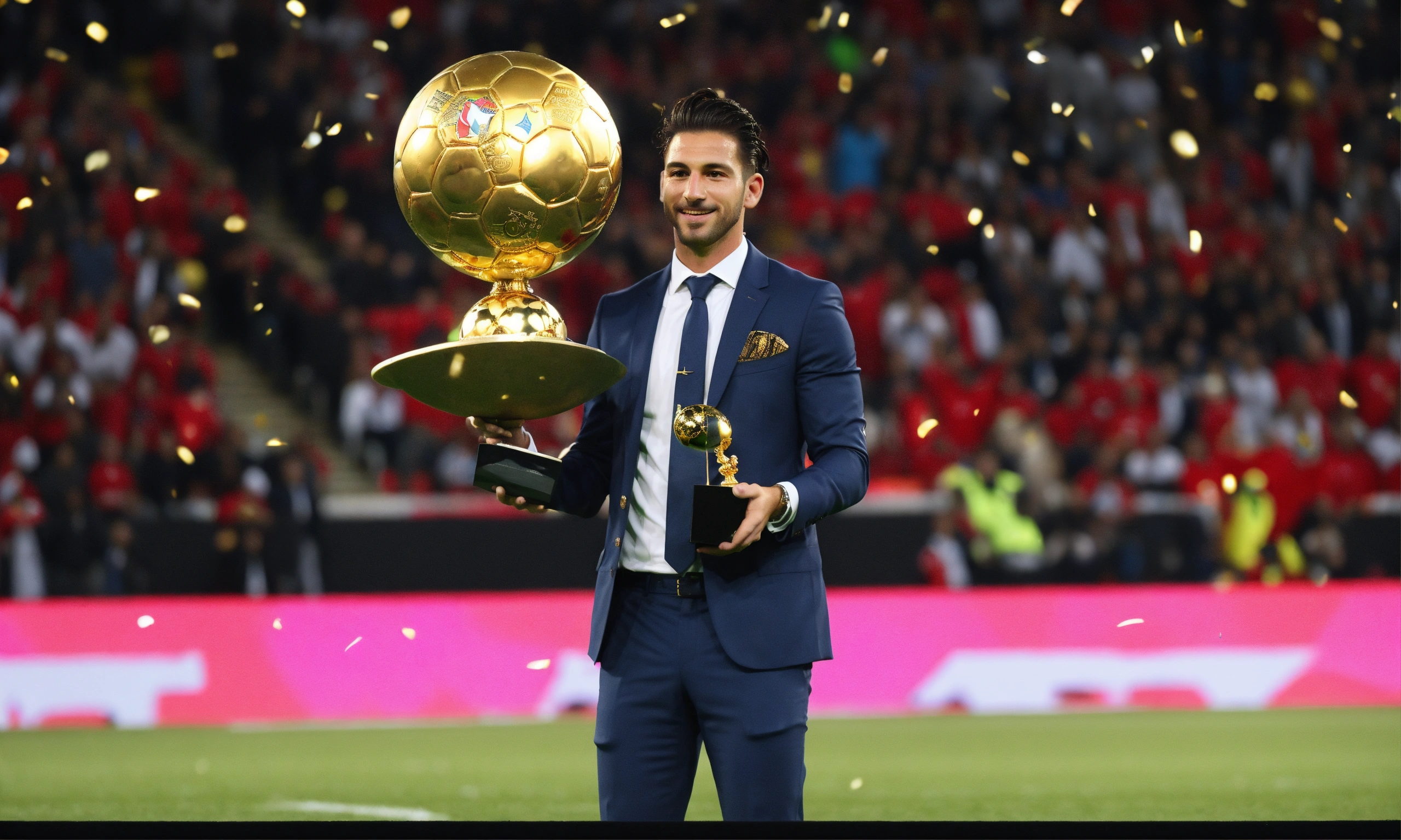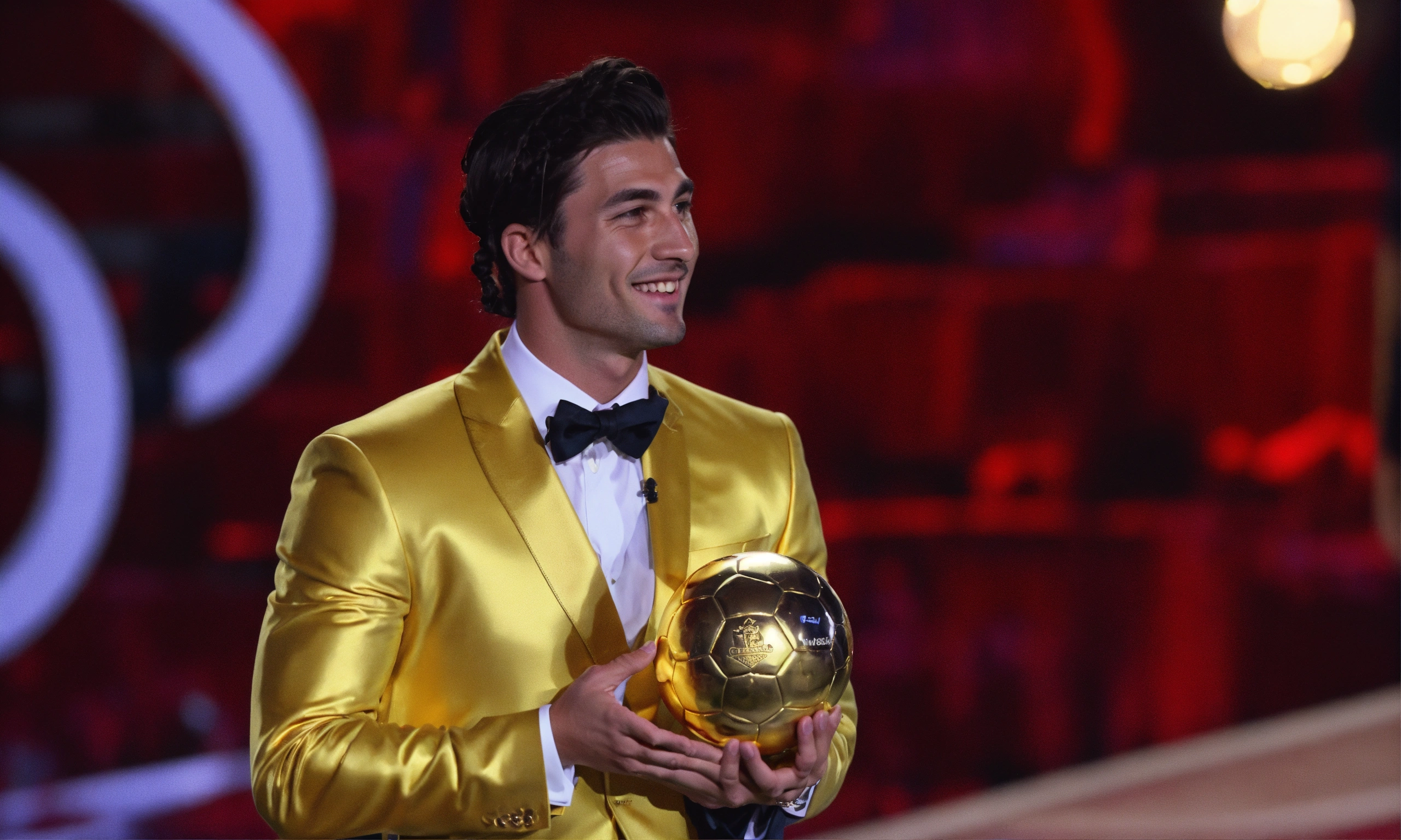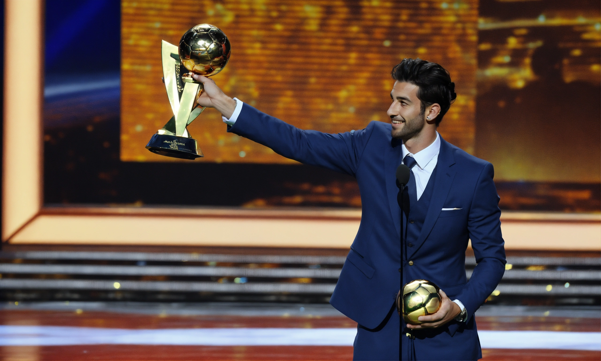Awarding the golden ball to the best football player, on stage, half of the body is visible, a cute man in a suit, ling hair tied in a pigtail, argentine man