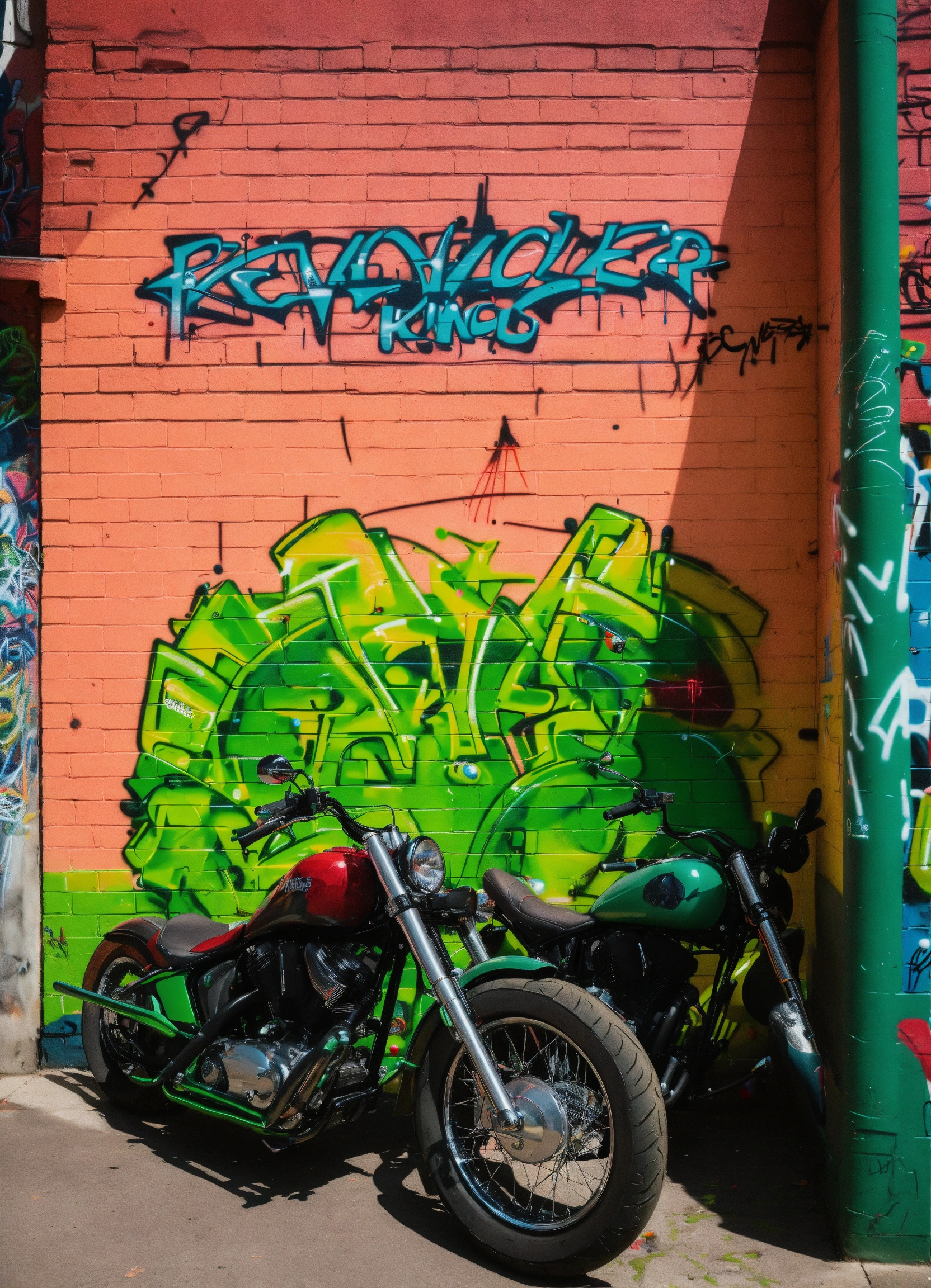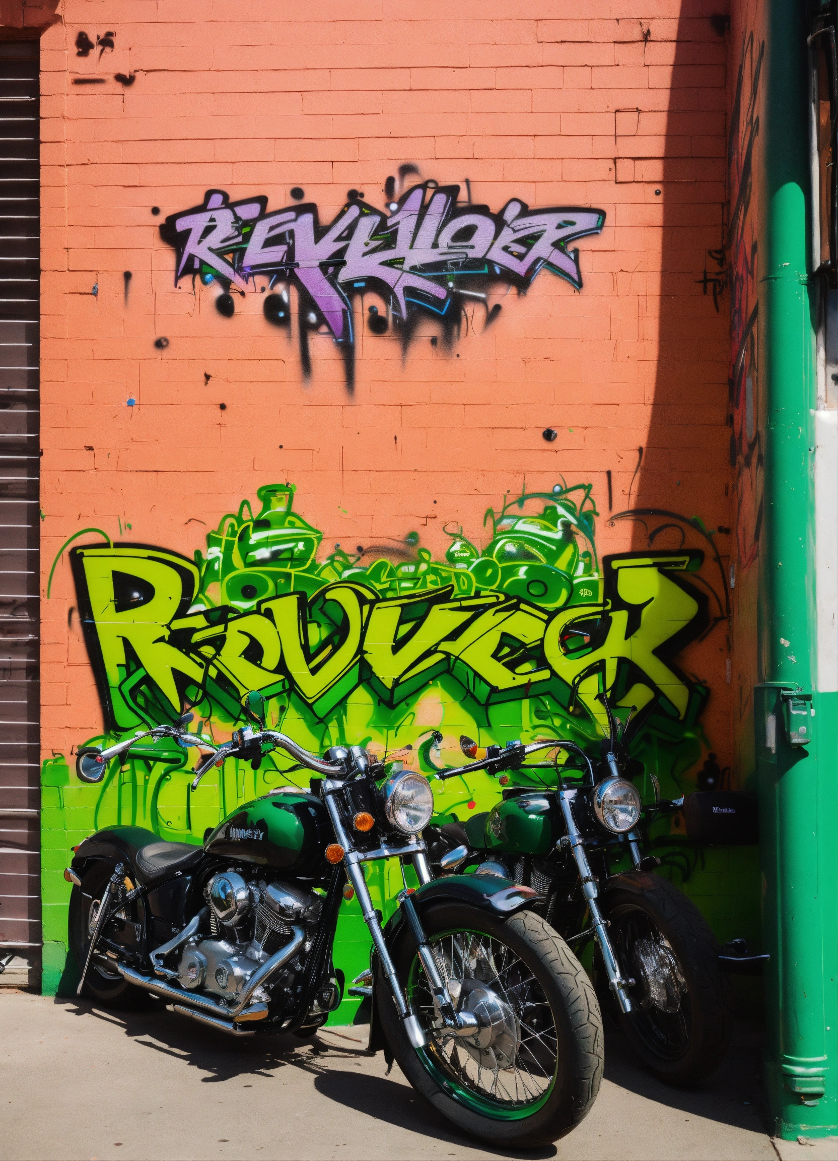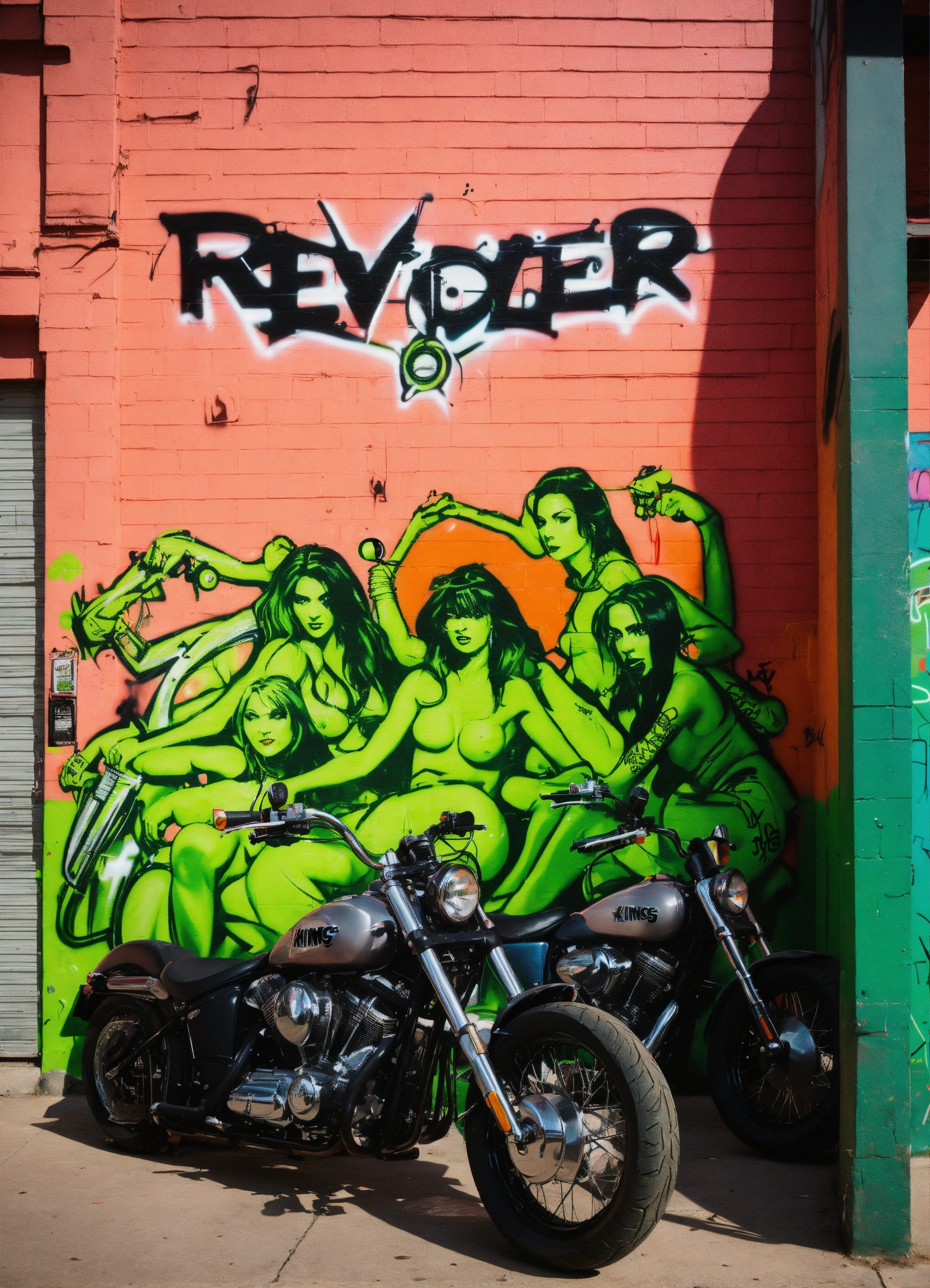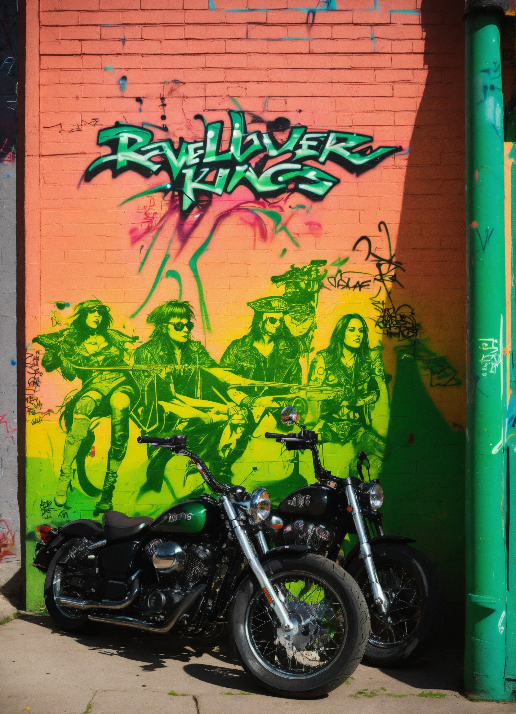 A graffiti saying revolver of kings in green with 2 girls on motorcycles like motley crue