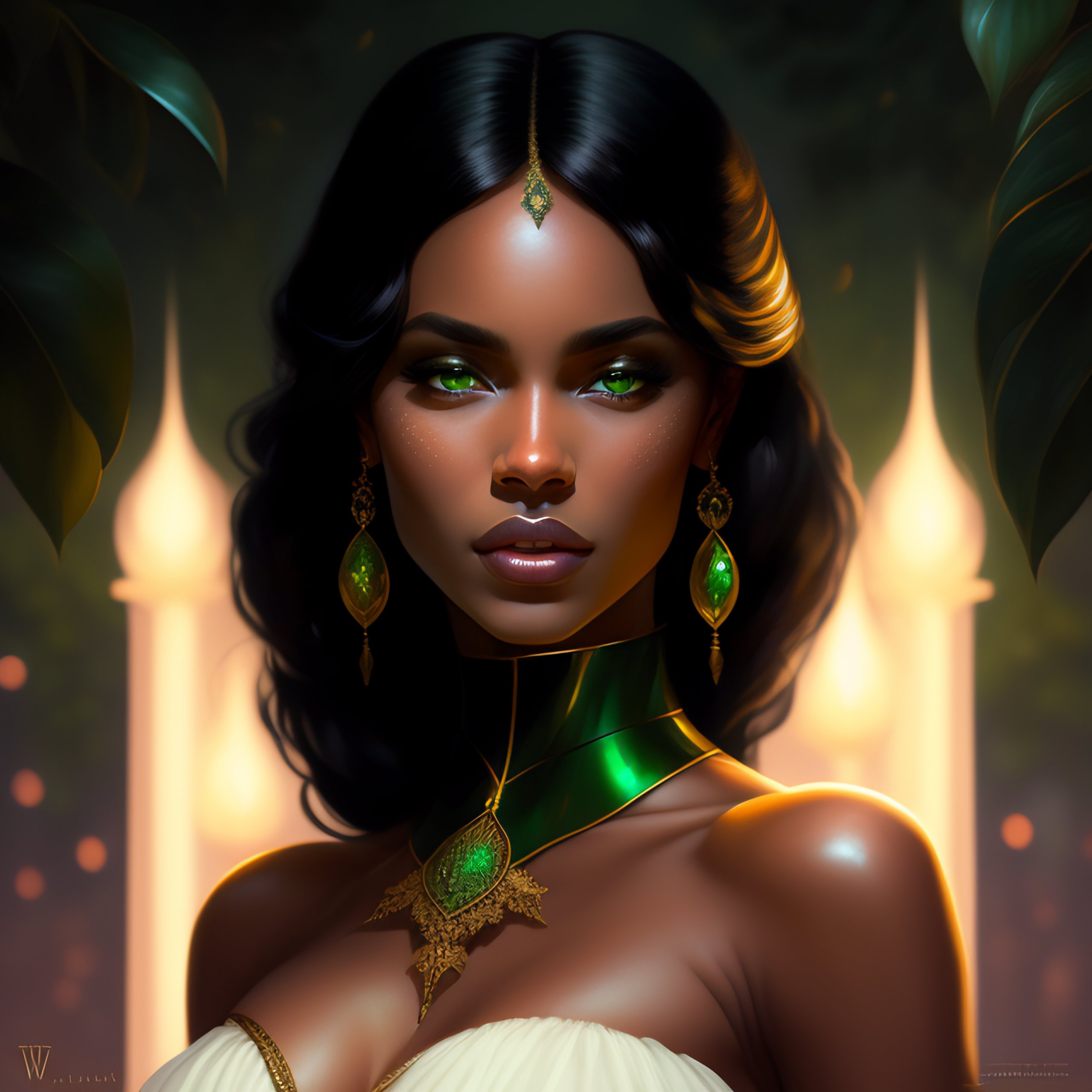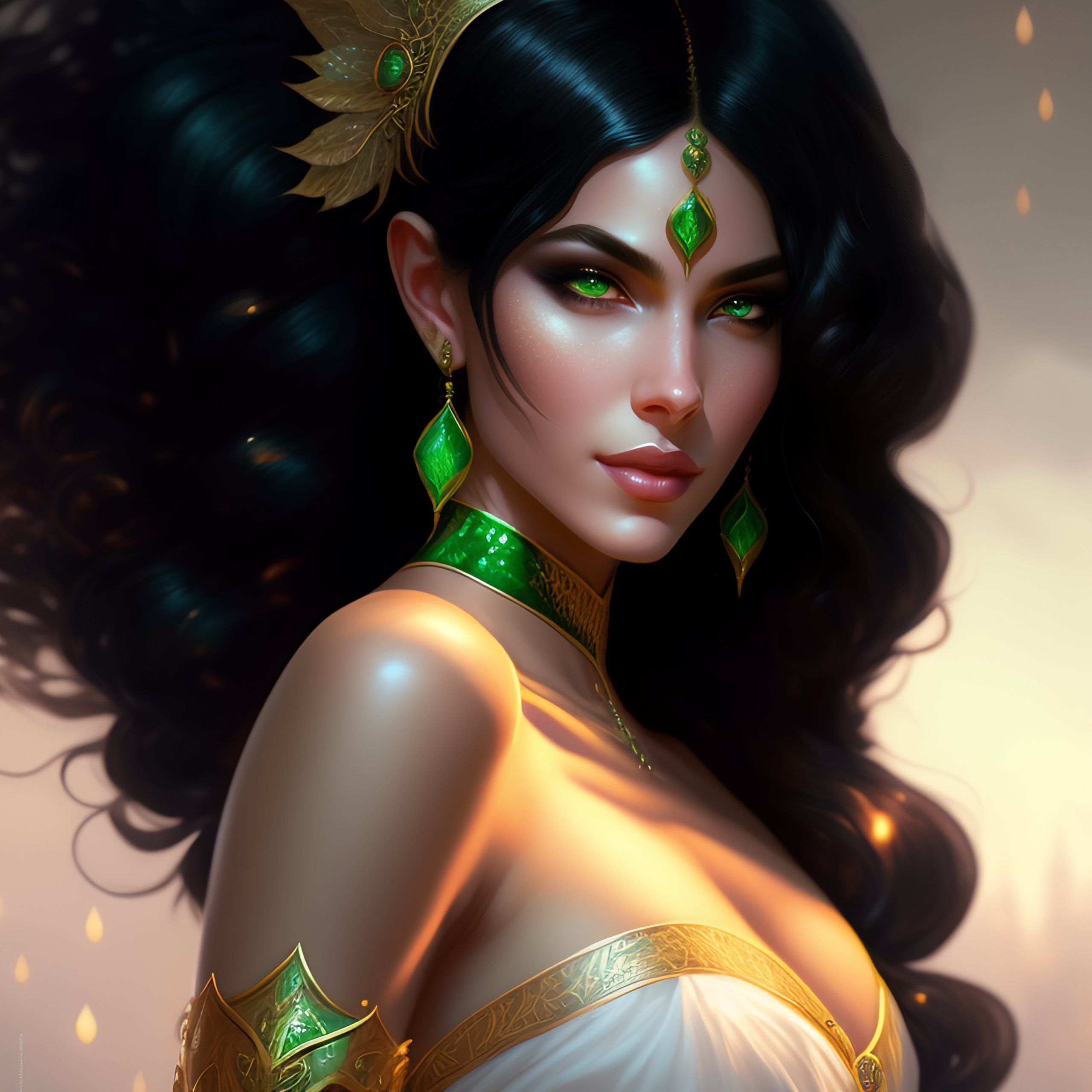 Black hair woman, witch, white skin, pale skin, green eyes, smiling fantasy magic, dark pin-up style hair, dark light night, intricate, elegant, sharp focus, illustration, highly detailed, digital painting, concept art, matte, art by wlop and artgerm and greg rutkowski and alphonse mucha, masterpiece, black background