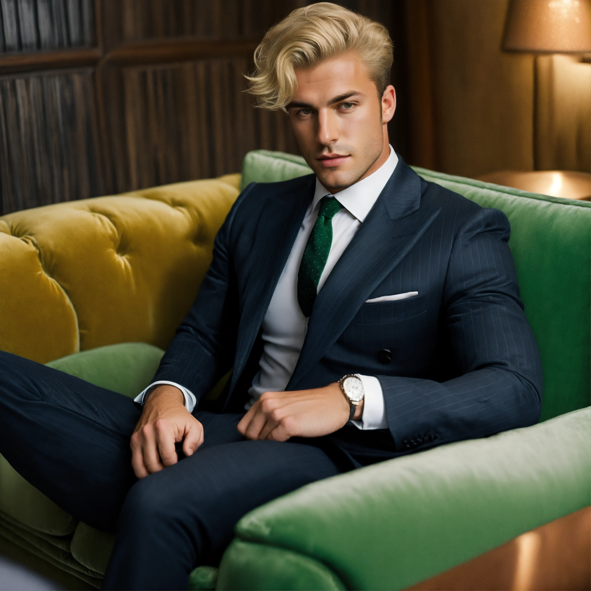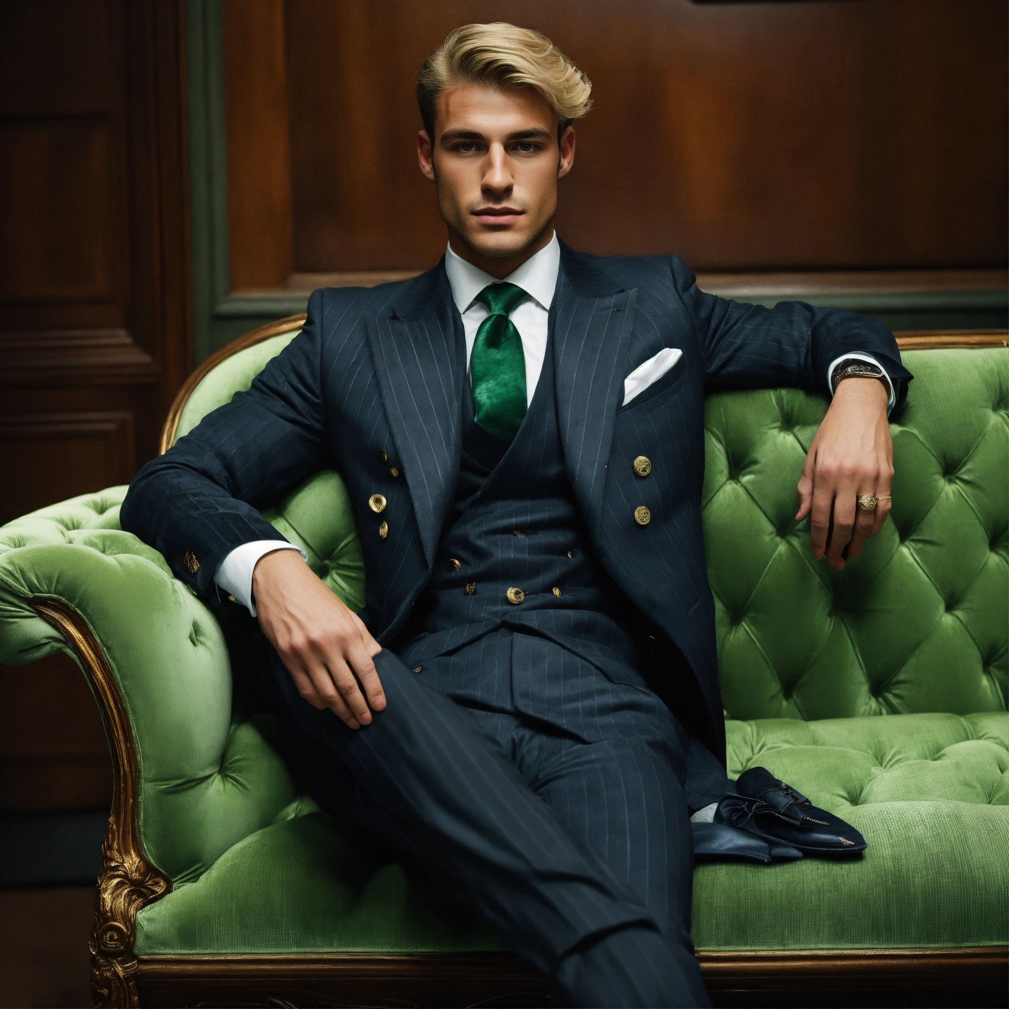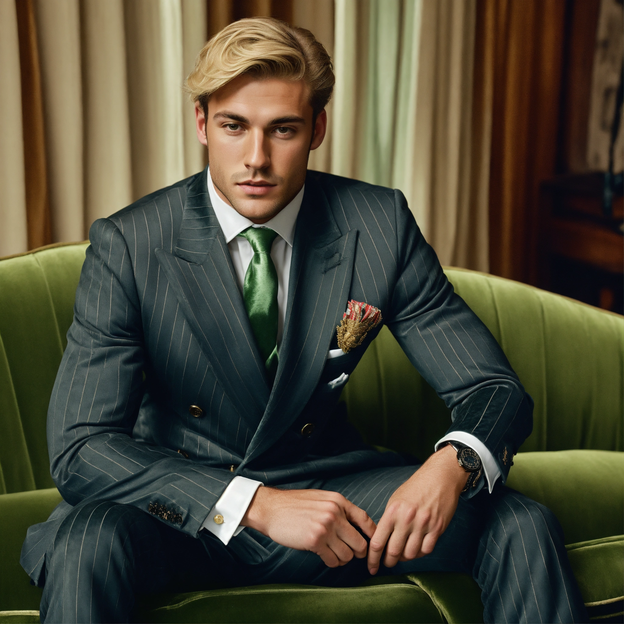A young muscled french businessman in dark grey pinstripe double breasted suit and club tie, blonde brushed hair, seating in a pale green velvet couch