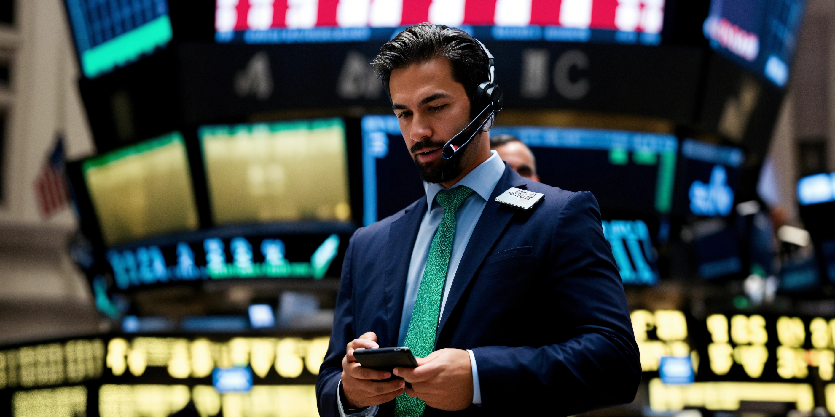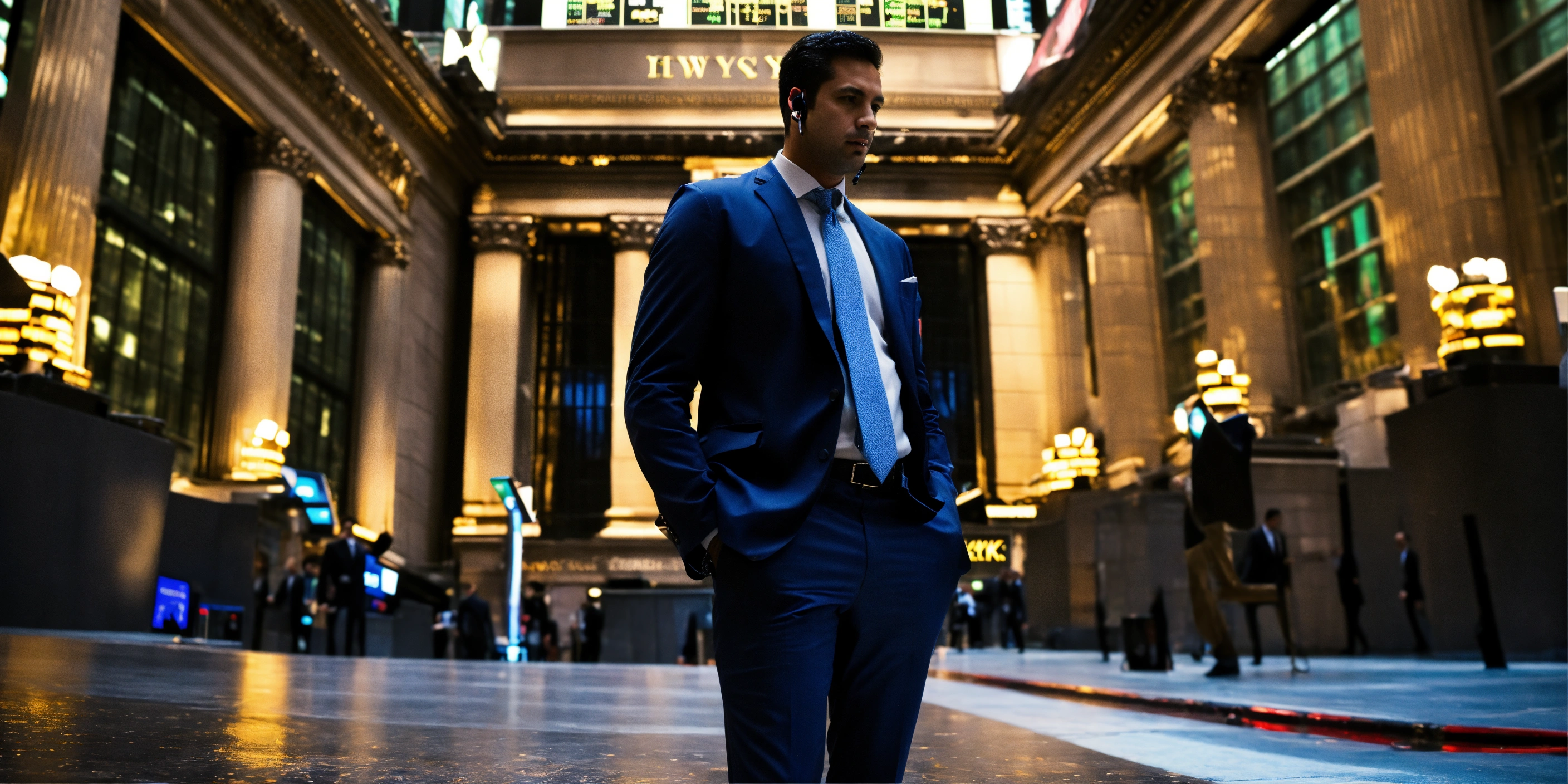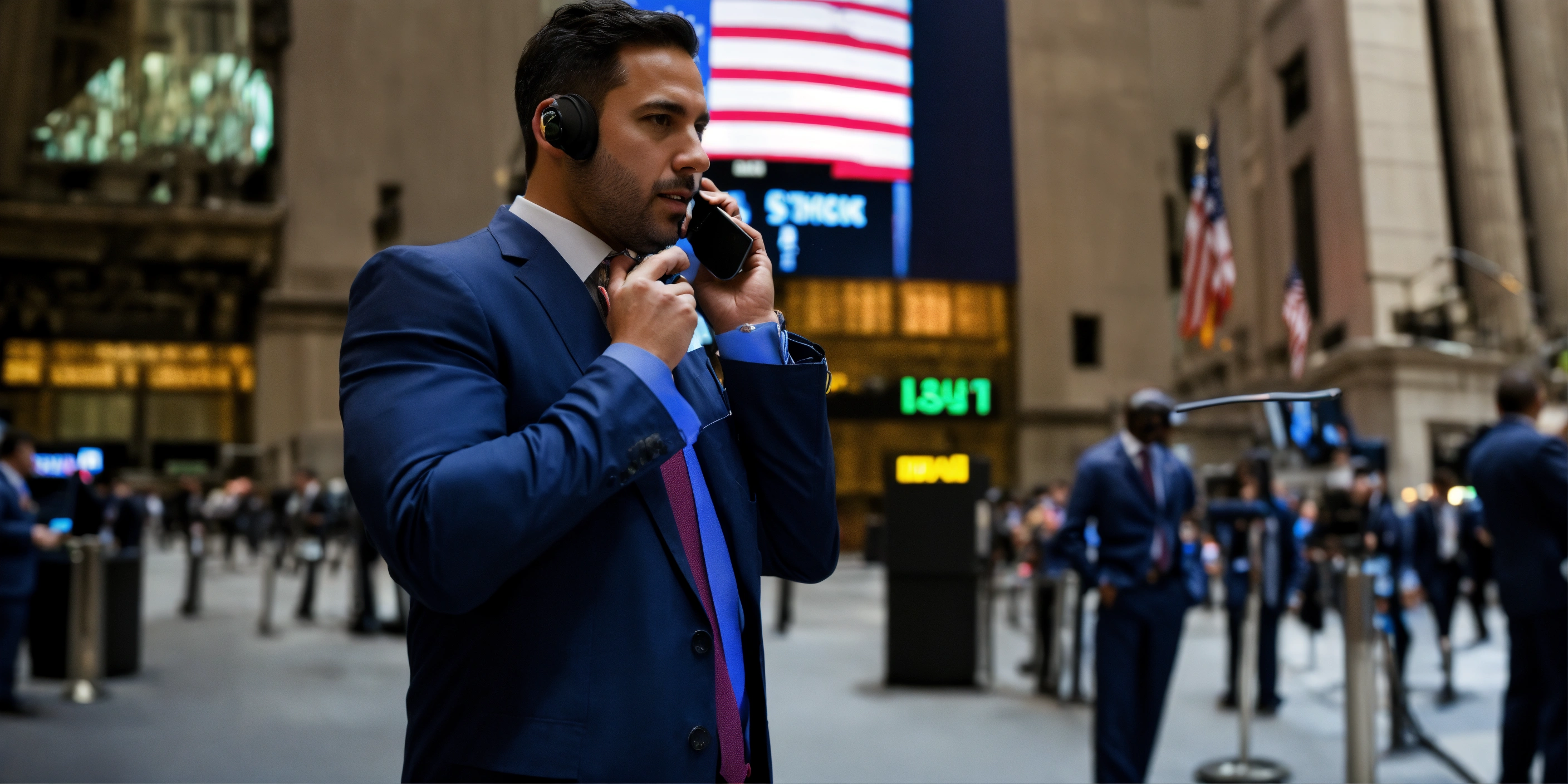 A businessman standing in the front of new york stock exchange and made a call phone with the handy, the other hand is in the pants, 4k, high resolution, perfect picture modern and colorful