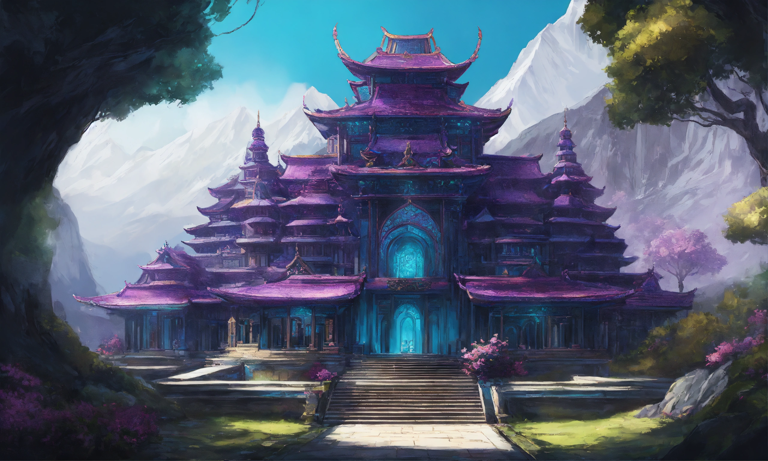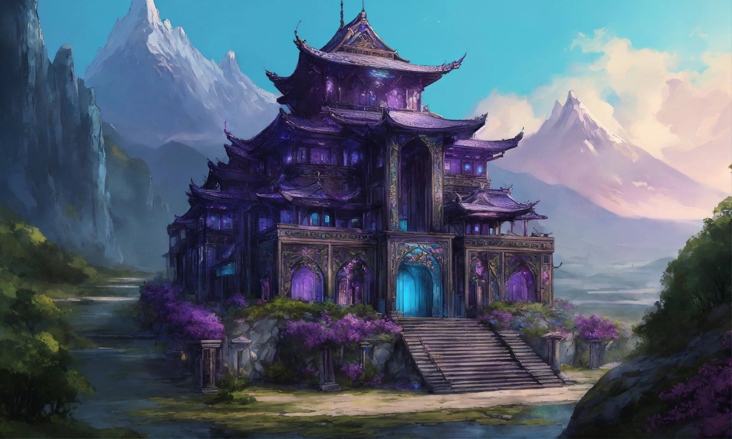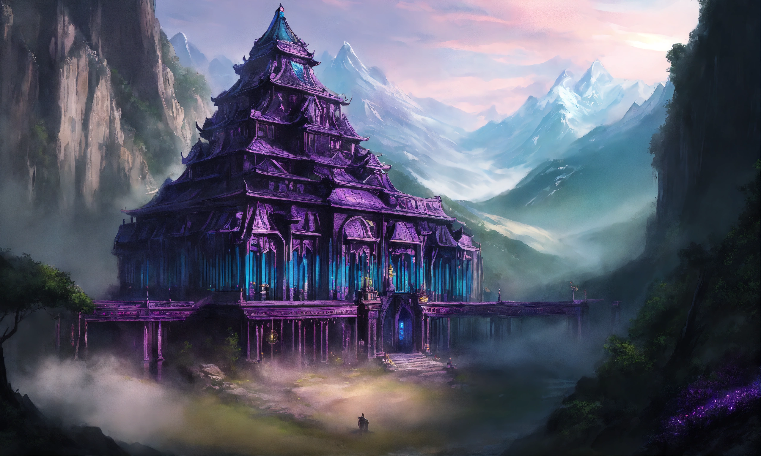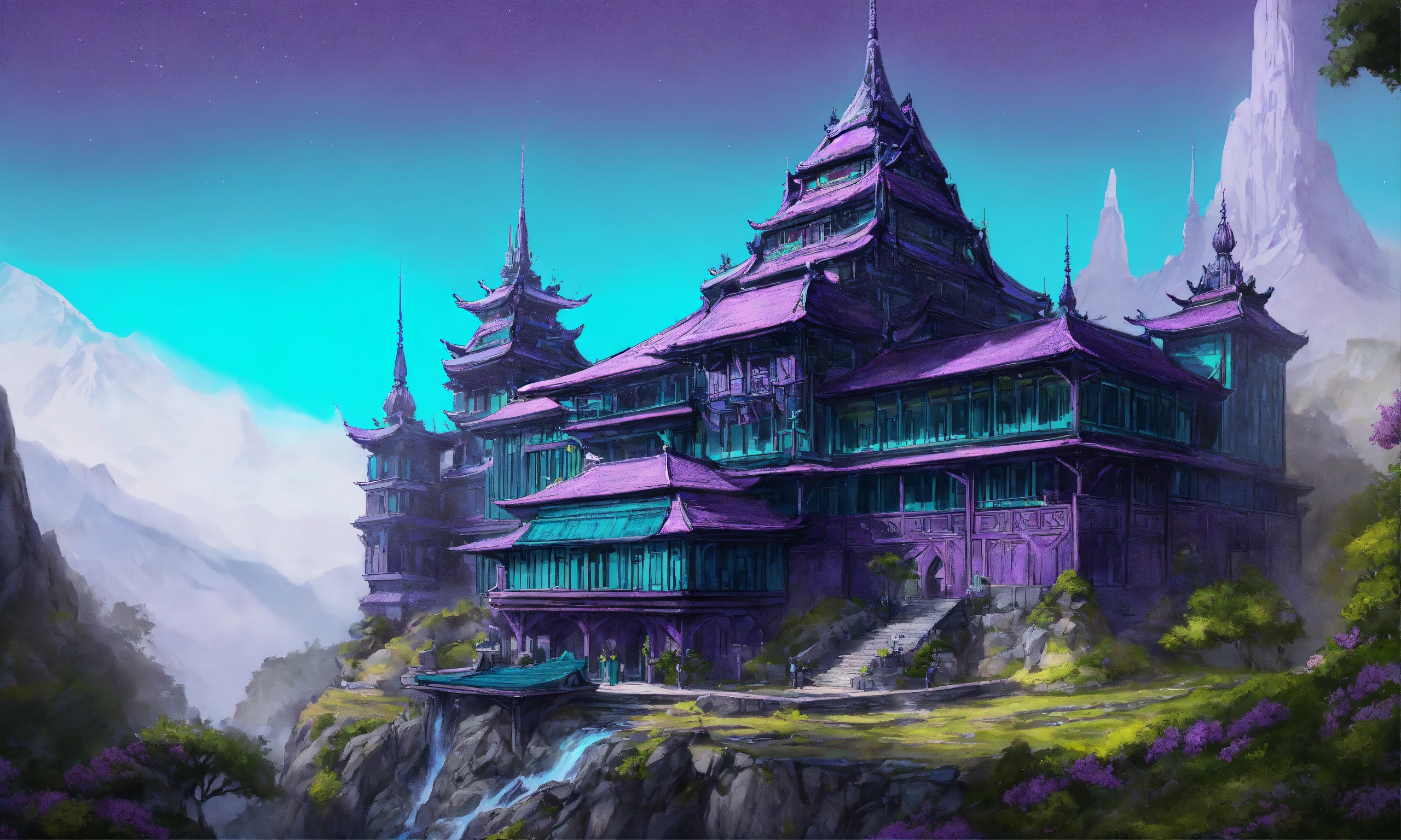 Drawing of a fully shown large black and purple and cyan elegant high elf sci fi palace in the mountains of asia, elven architecture, immensely detailed