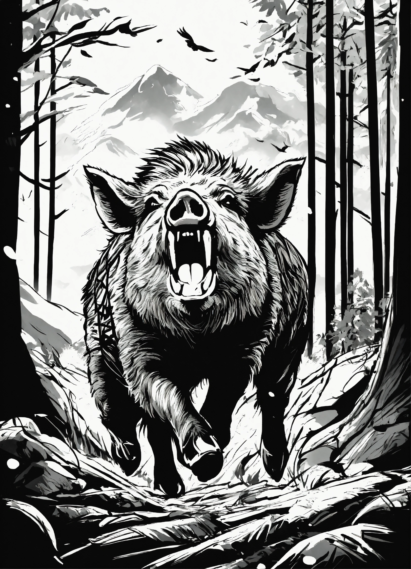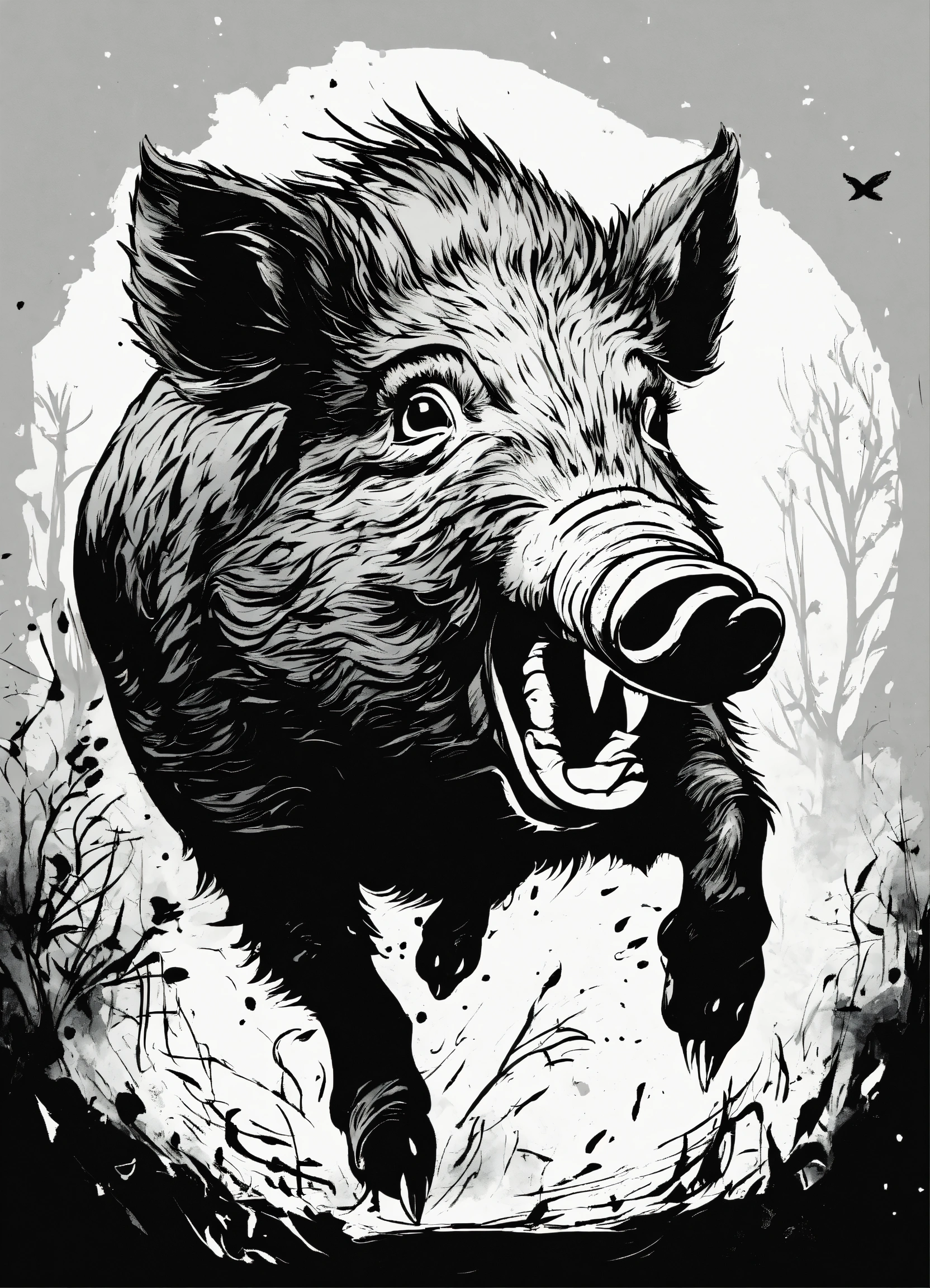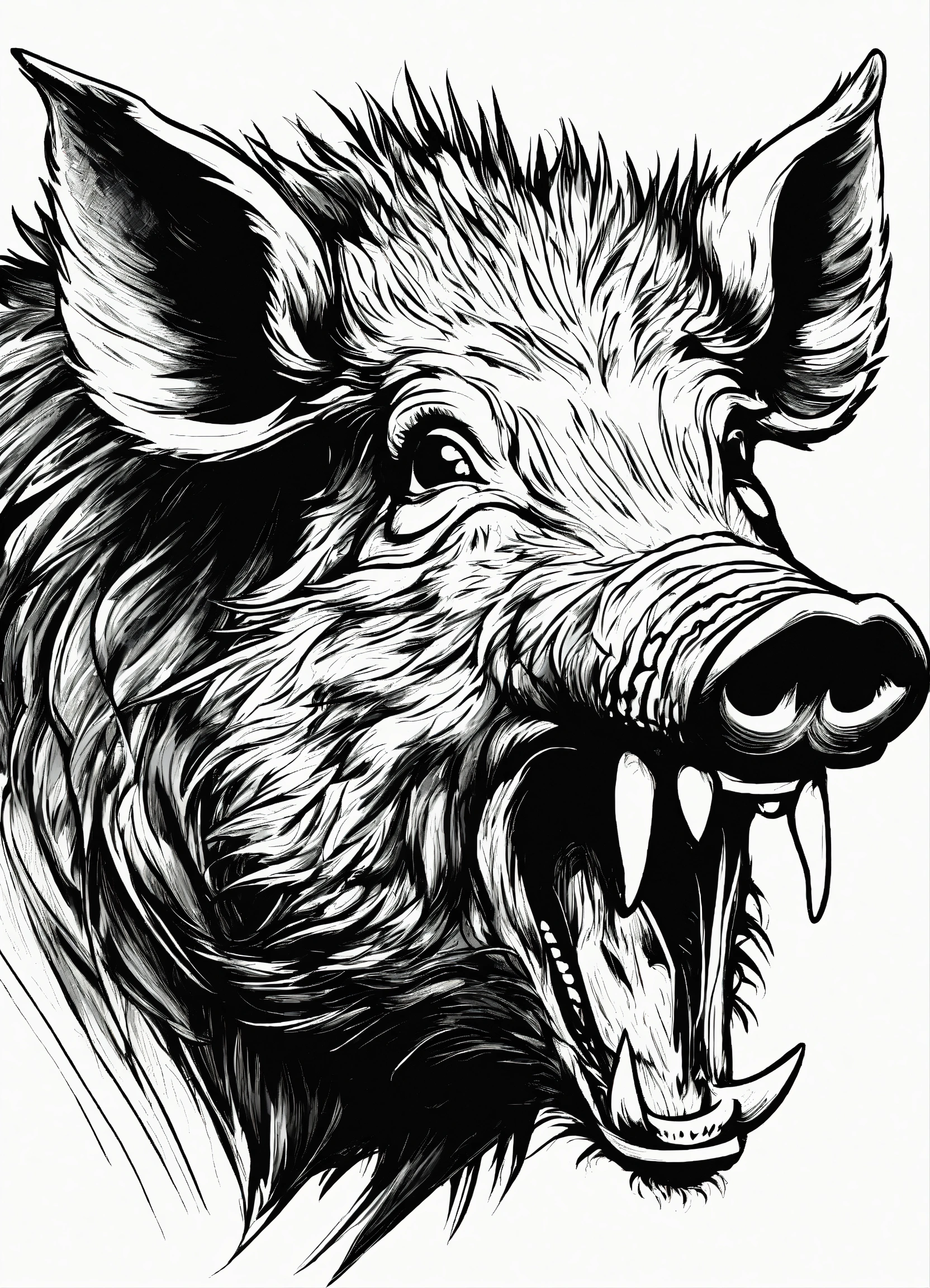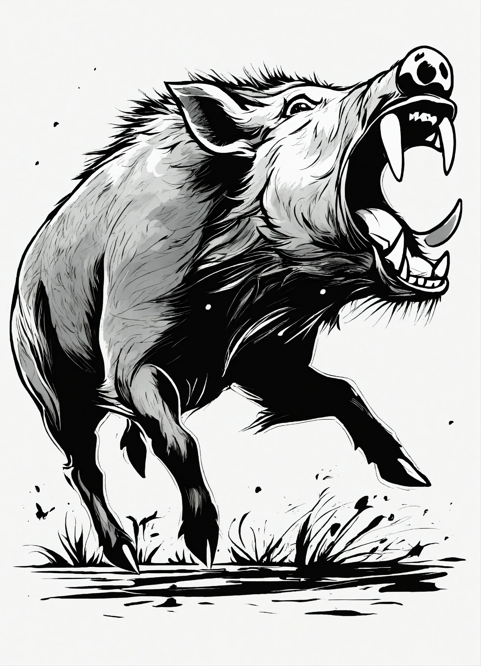 Wild boar screaming shooting up, black and white, white background, no background, ink fine line art stylized, vector, design for tattoo, ignorant style