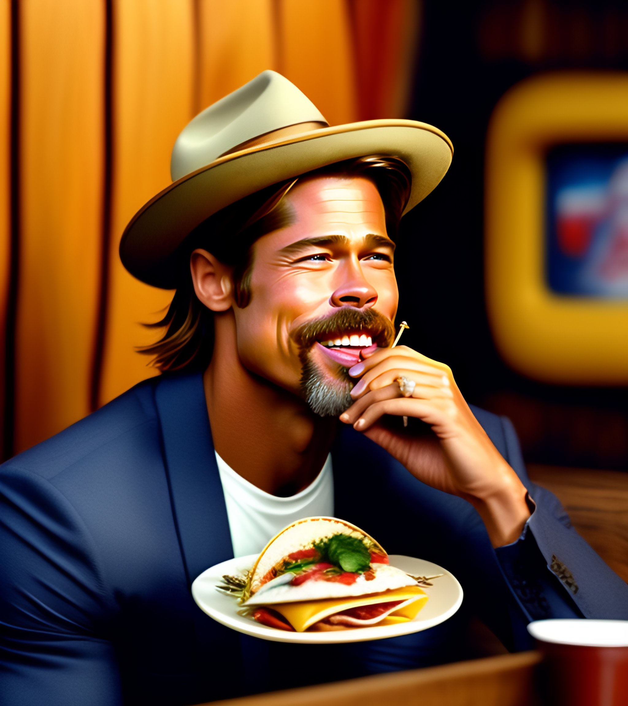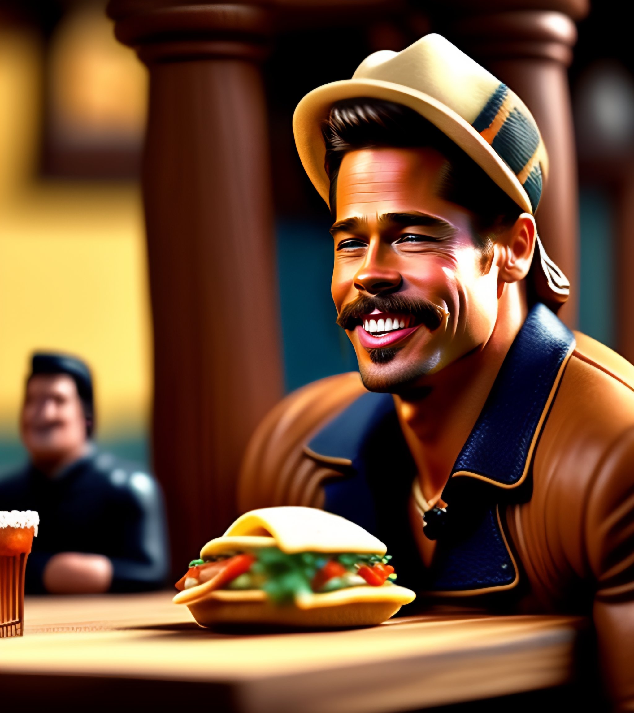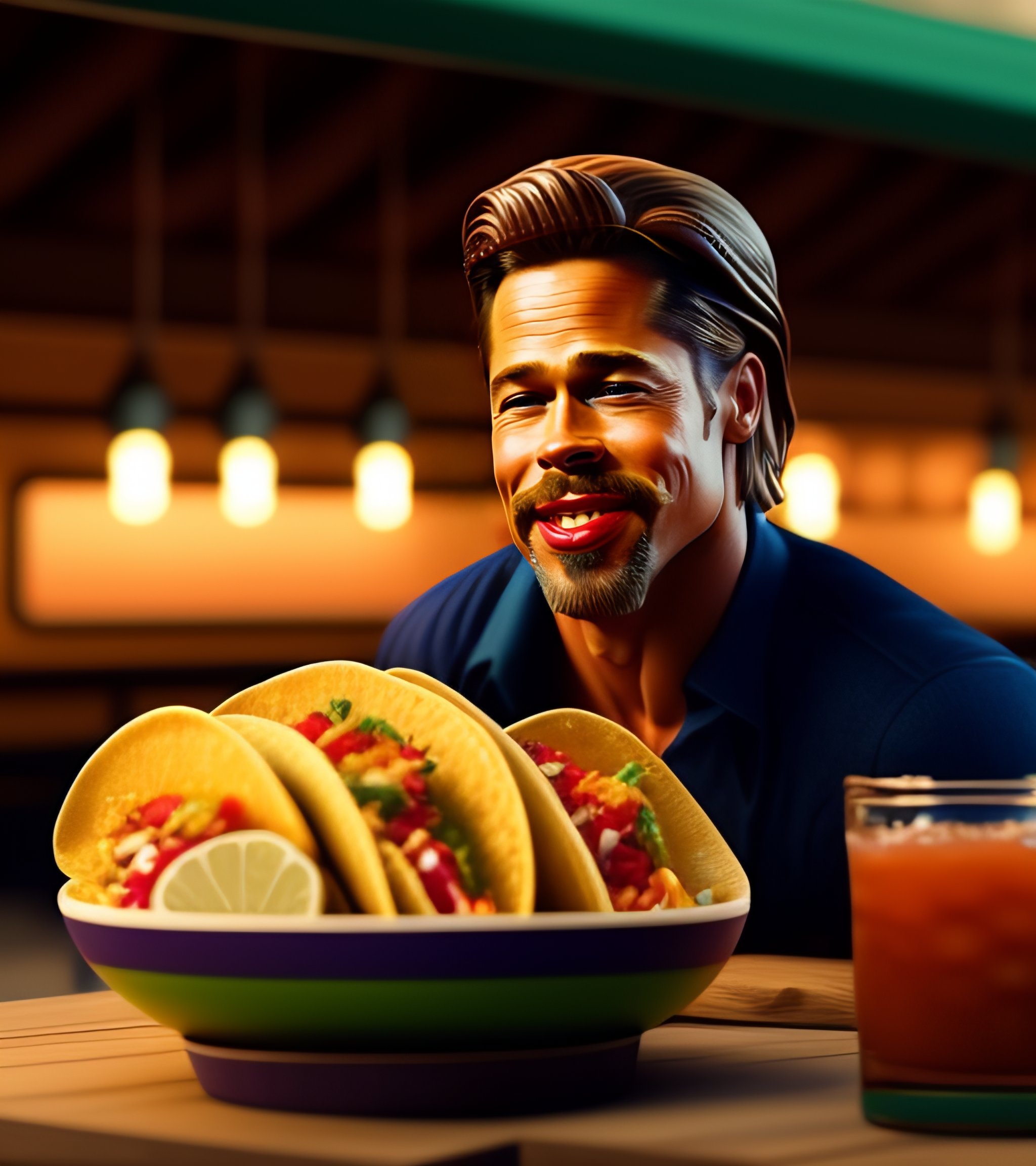 Claymation brad pitt eating tacos in a wooden food hall, he is smoking and laughing, there is a margarita in front of him