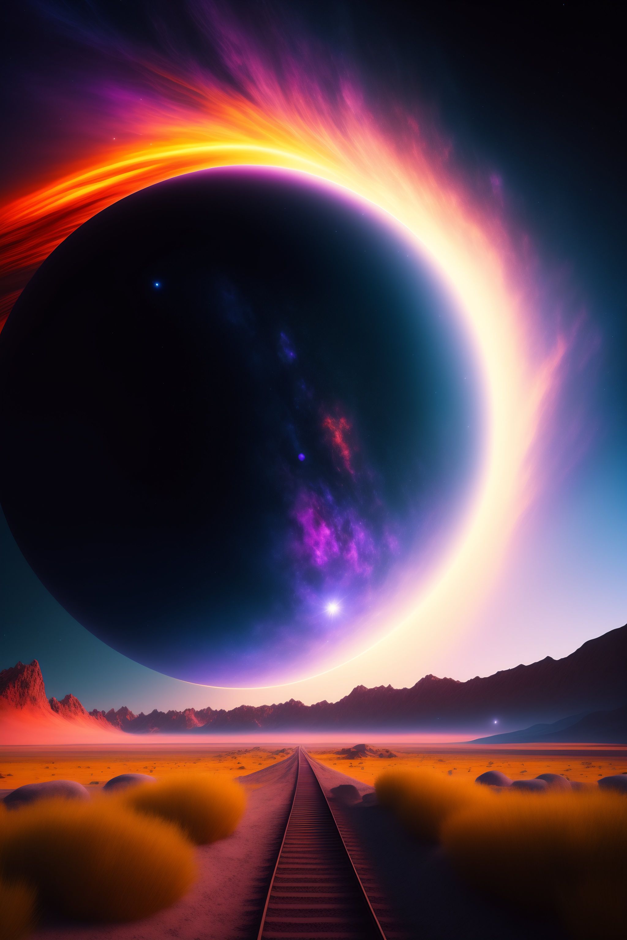 This ultra-realistic cgi image of space is a unique combination of elements that create a visually stunning and eye-catching piece of art. the image features giant metal-covered planets, a burst of light, and striking proximity to earth. the planets are rendered in ultra-high resolution, giving them a realistic and detailed look. the light burst is also rendered in ultra-high resolution, creating an intense and vibrant effect. the proximity to earth gives the image a sense of scale and depth, effect by vue, terragem, daz 3d, blender, procreate, photoshop, merge, wet, moon, gigant one creature, tunel, train, max view zoom