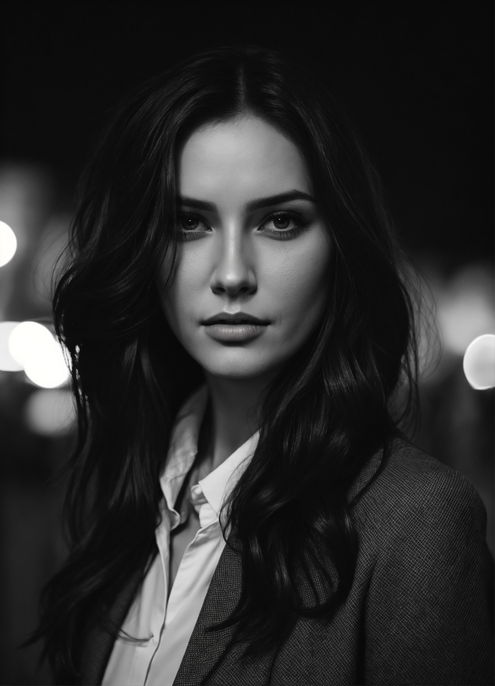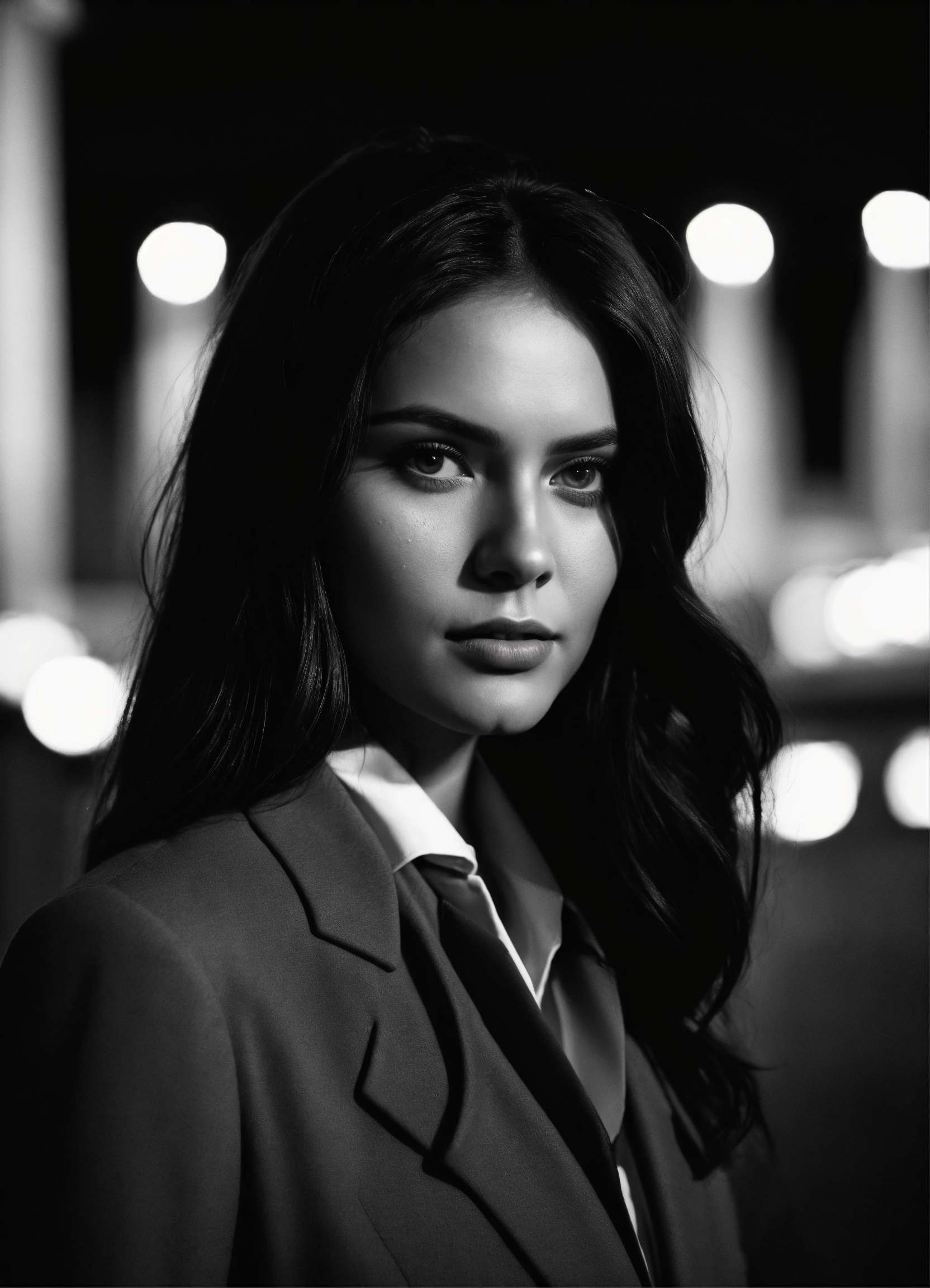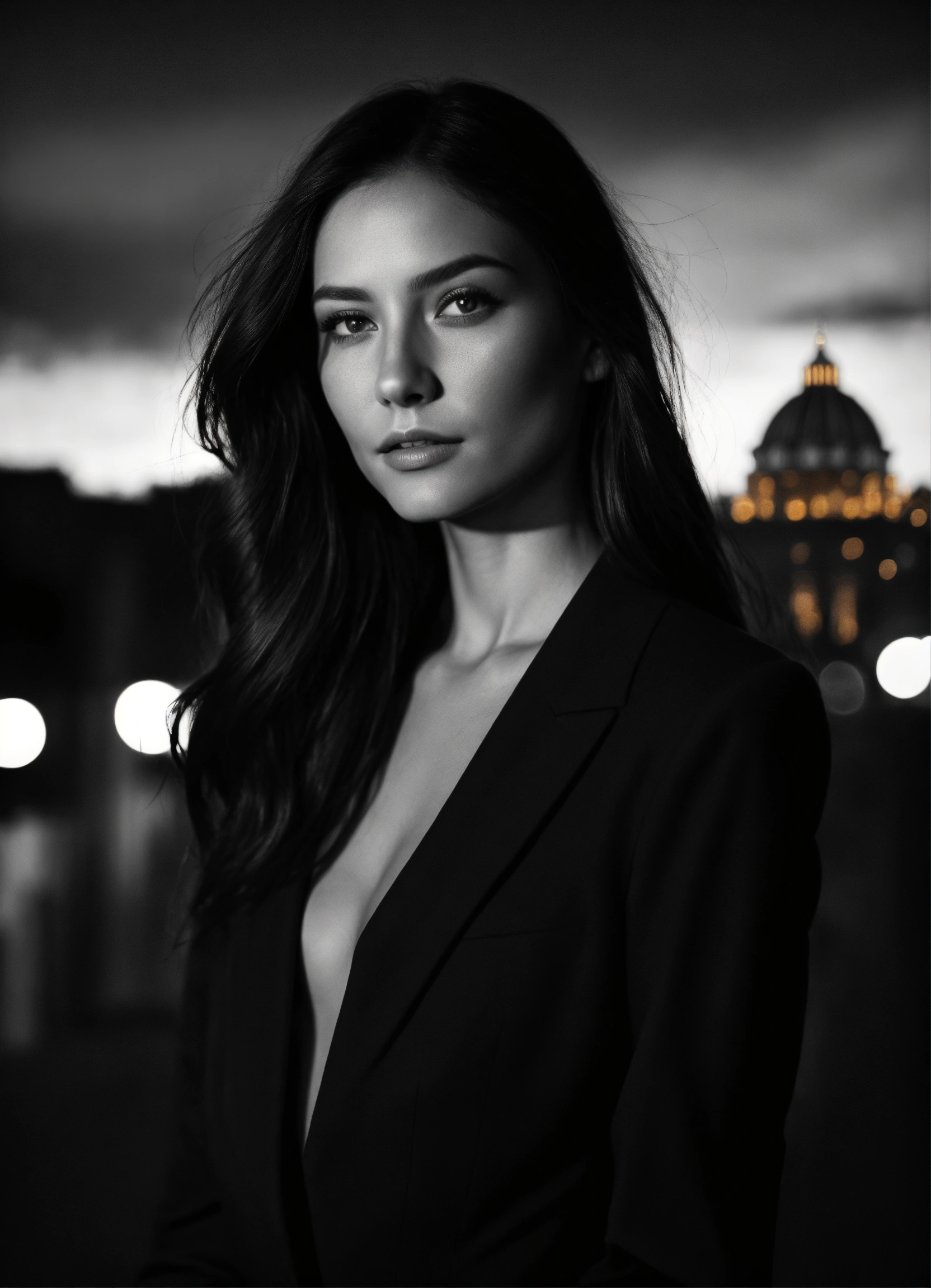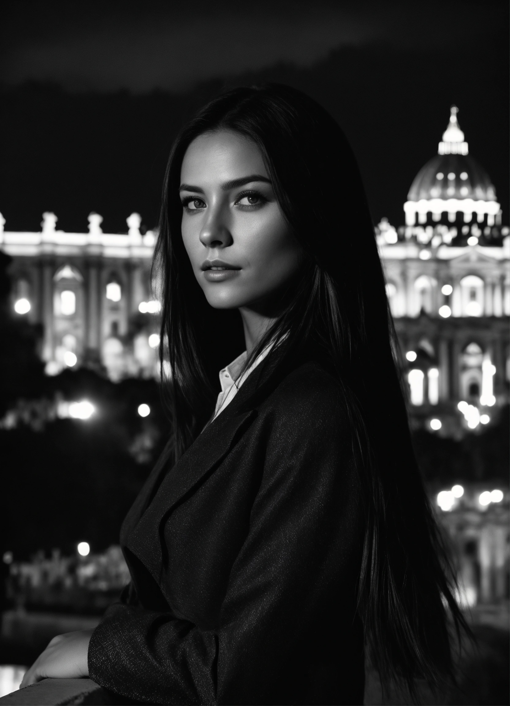Photo of model women long dark hair, black and white, realistic, portrait, not painted, very detailed faces, skin with pores, 4k, dark suit, skin not smoothed, looking into the camera, dark shirt. vatican in rome in full view at night as background
