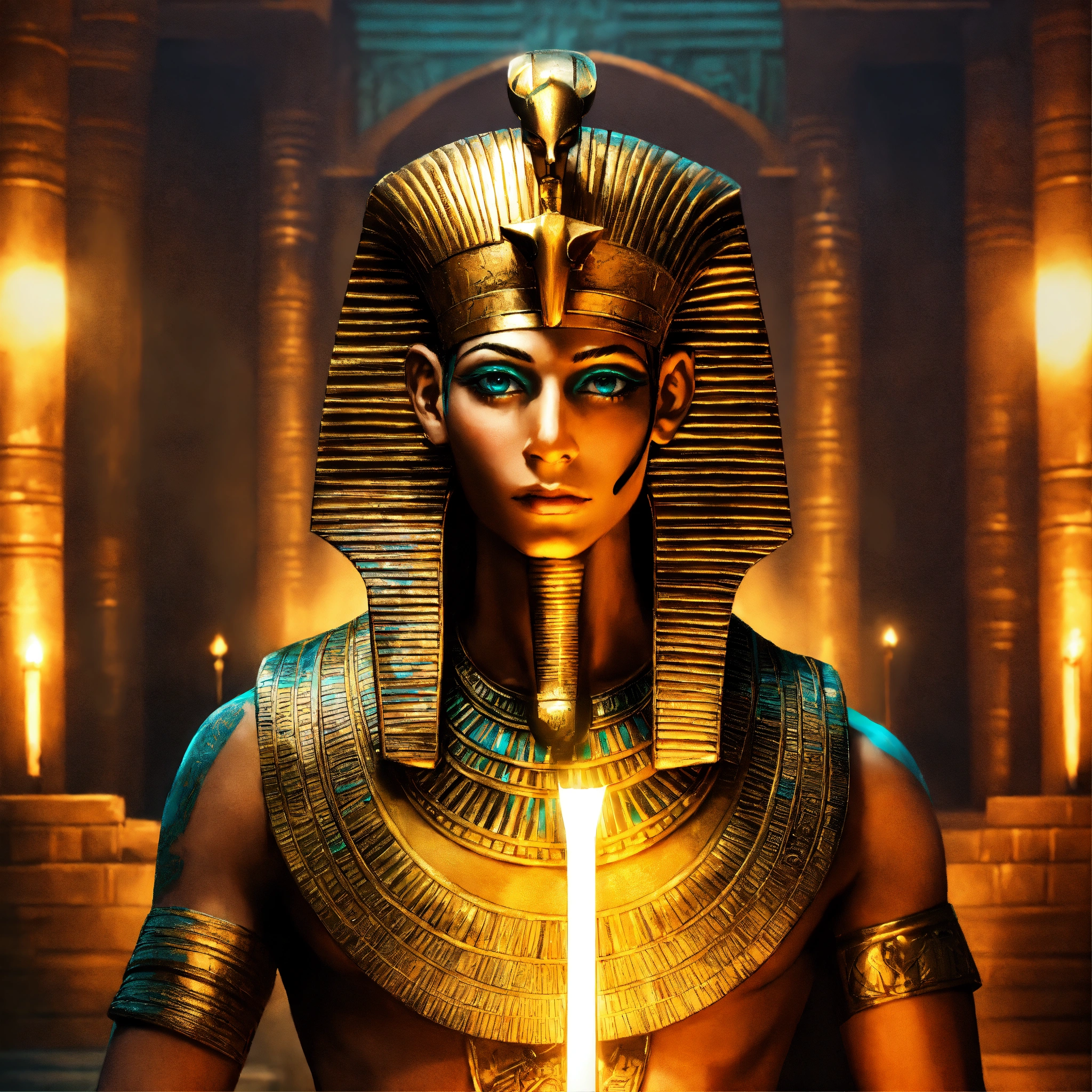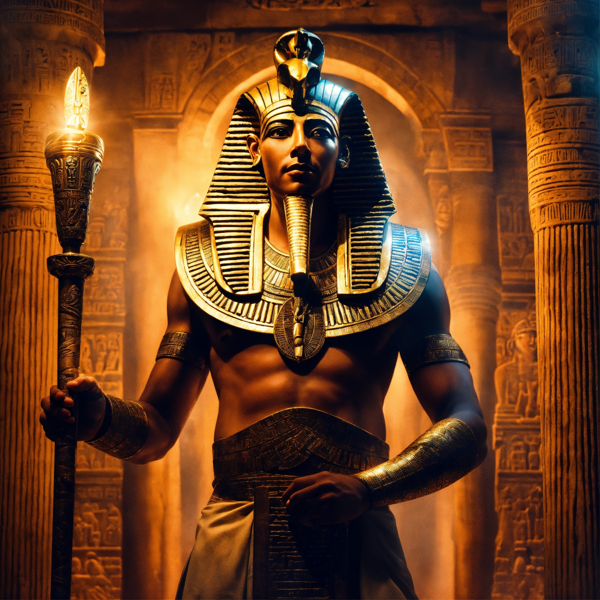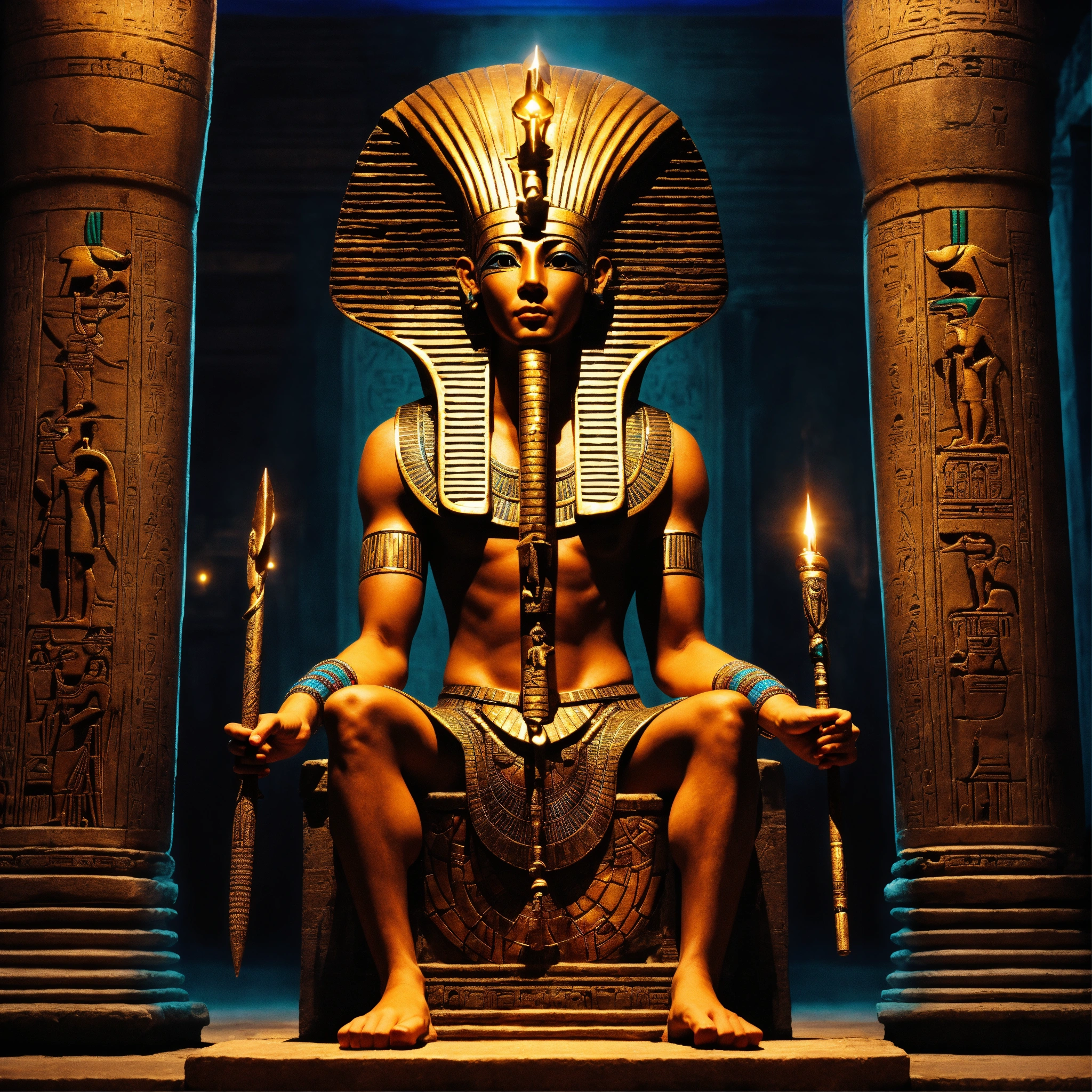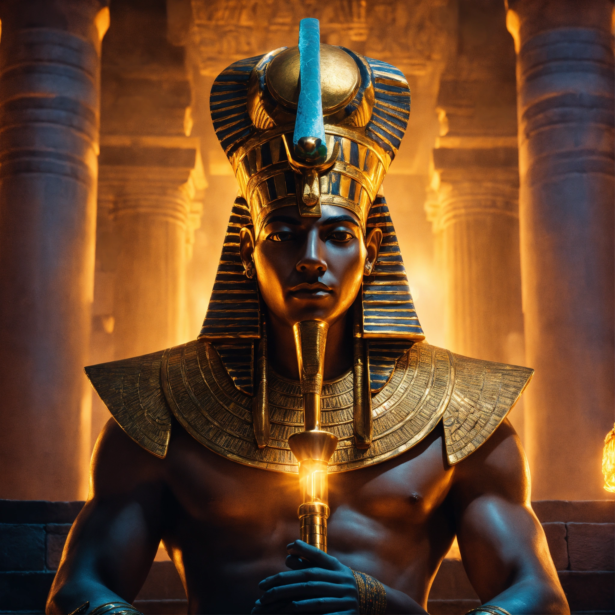 Fantasy head portrait of an evil ancient egyptian god in an eerie sacred temple in the evening holding an enchanted scepter