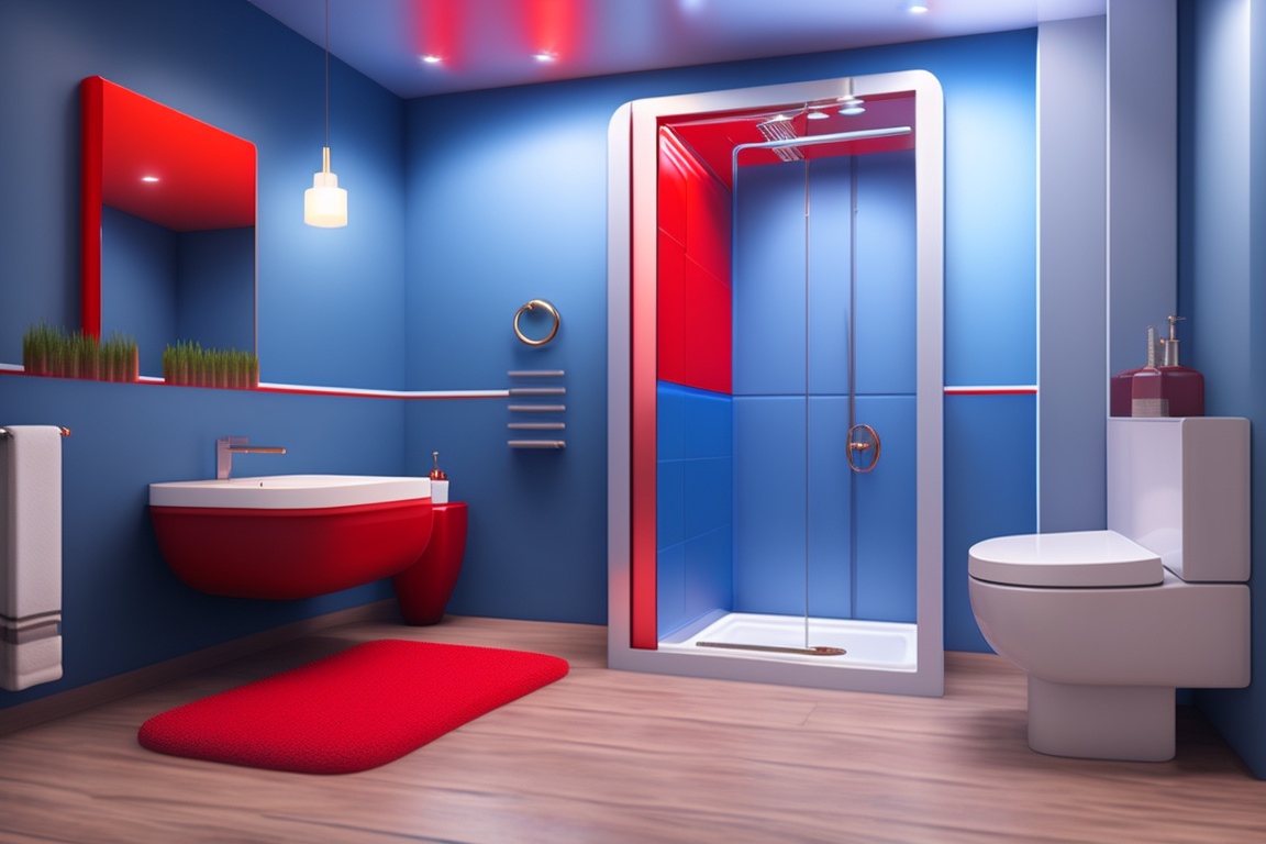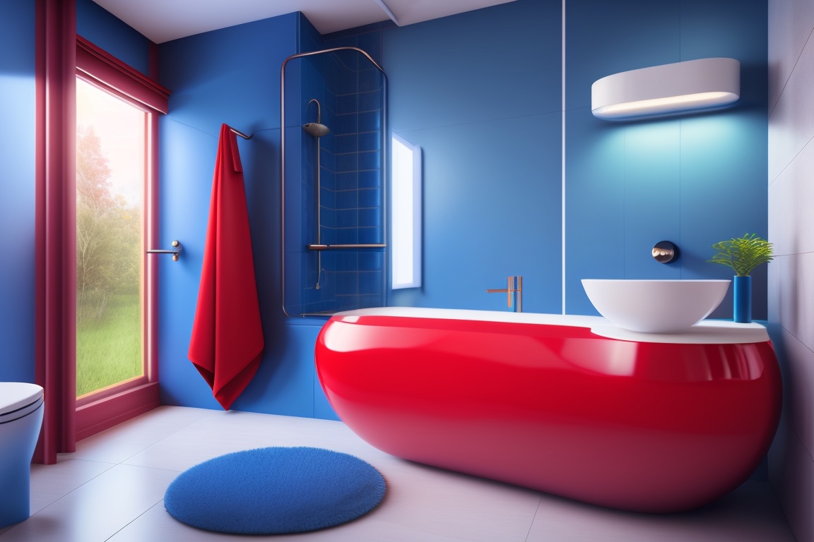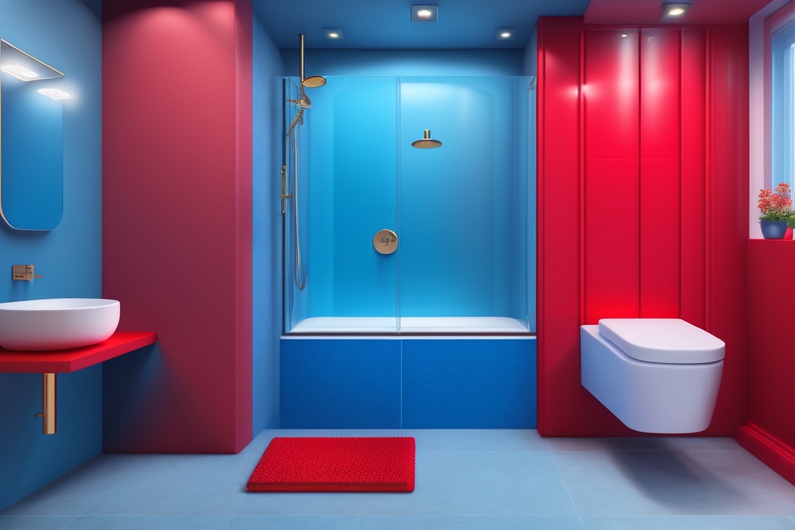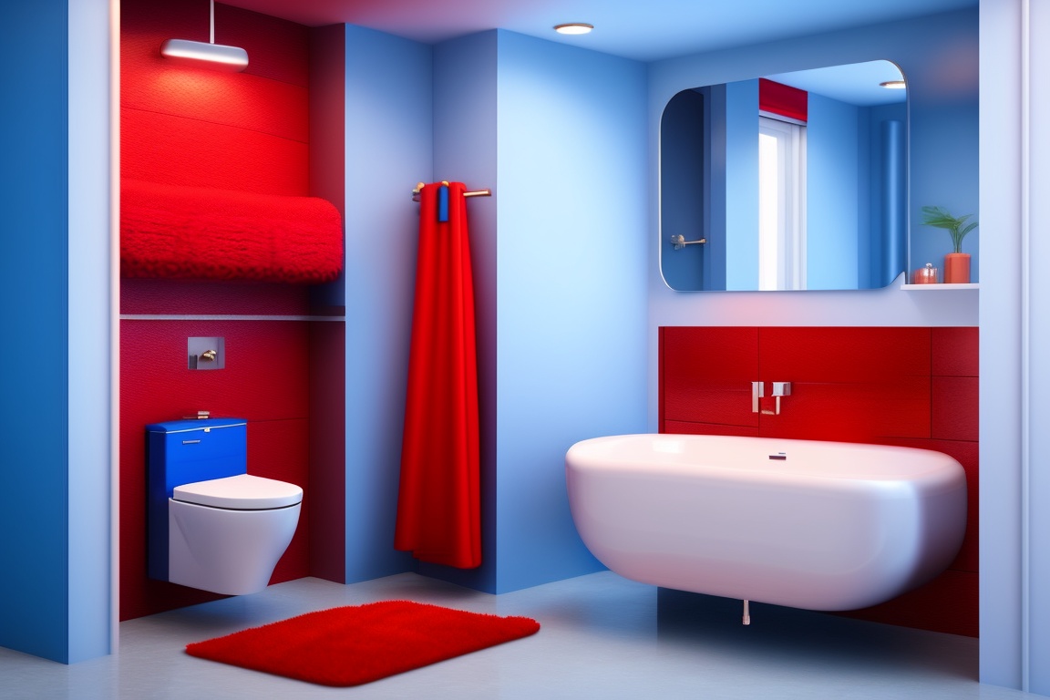 Blue and red bathroom. red shower, blue sink with cabinets, red toilet, five red towels, soap. in the afternoon lighting