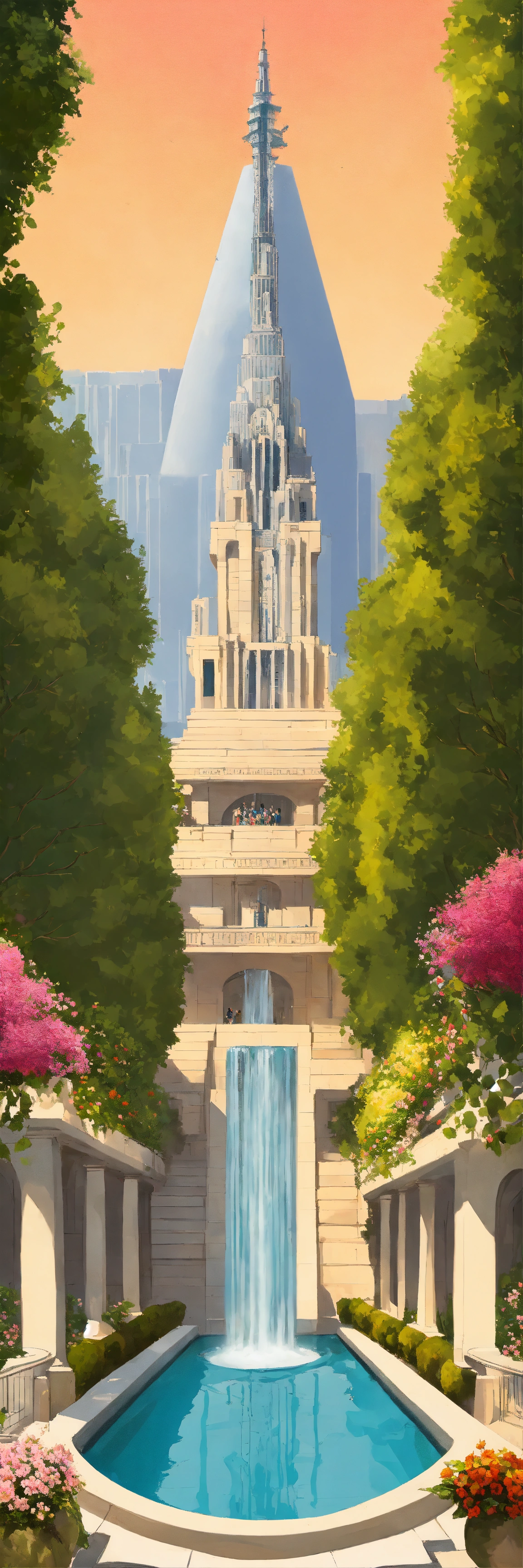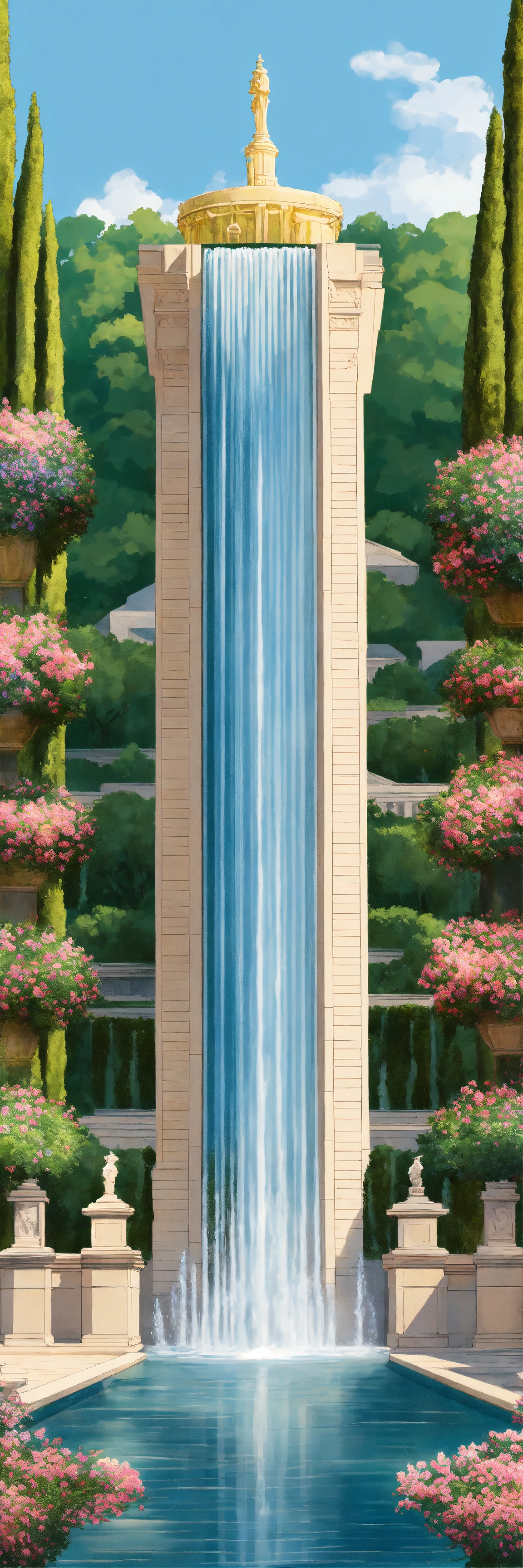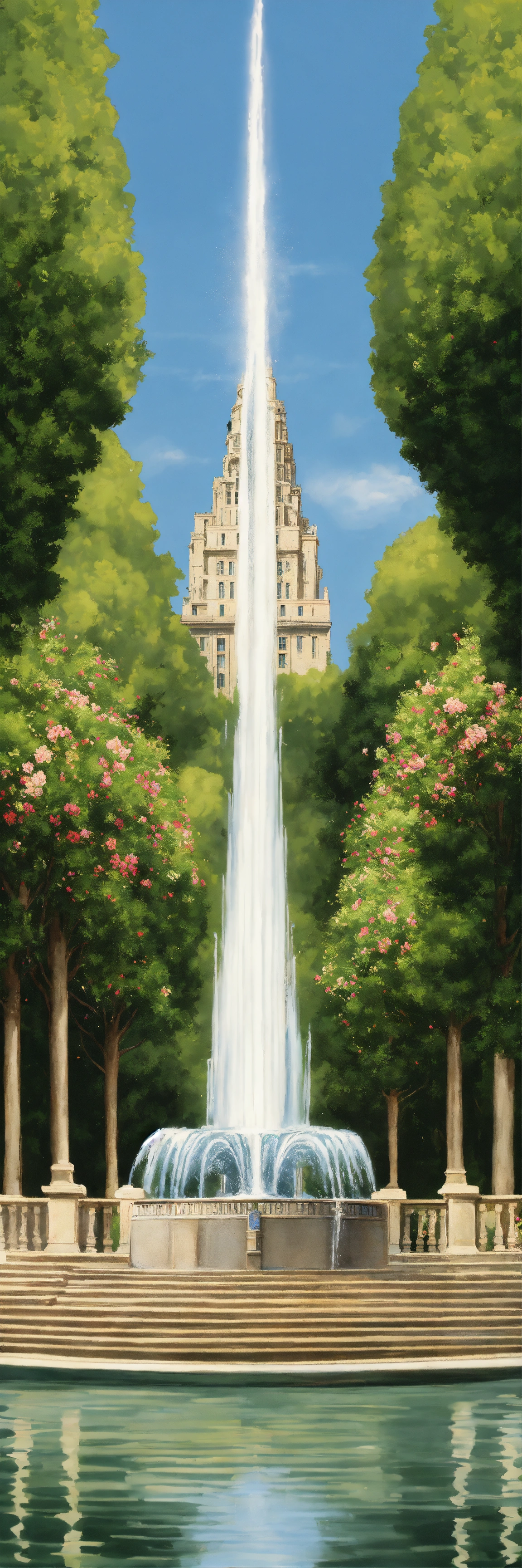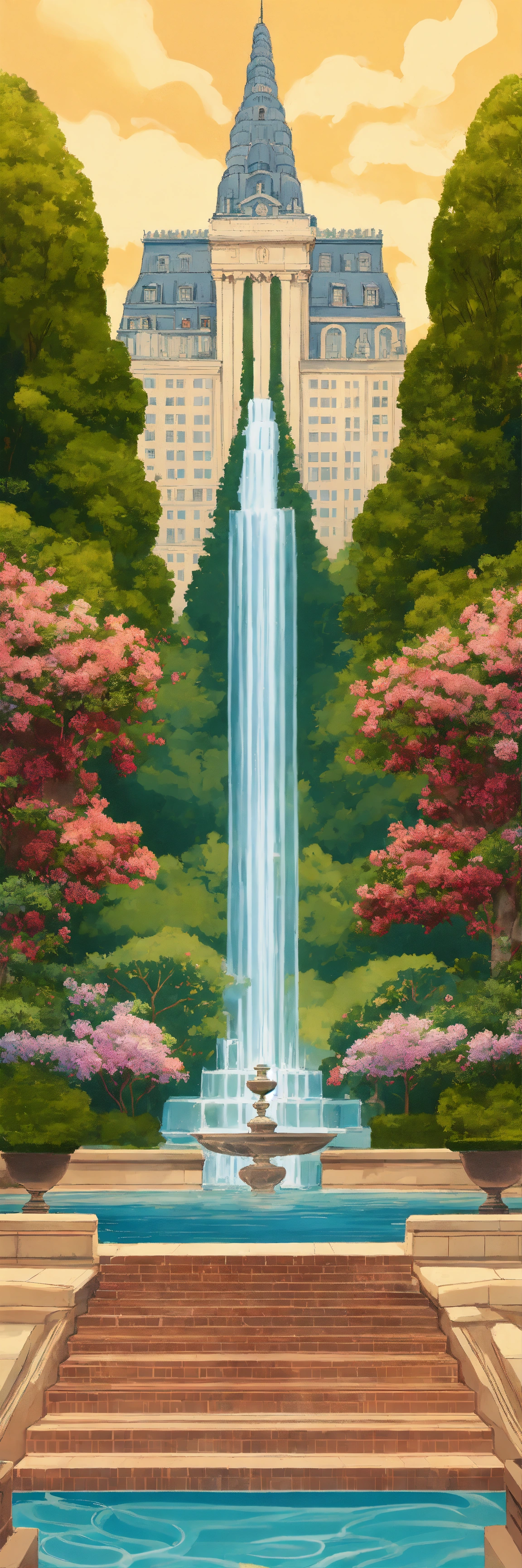 Water falls, the geneva water fountain jet d’eau, cypress trees tall, flowers, art deco pattern maze, pool canal, ornade sculpted stone masonry haussmannian parisian style empire state building with french roof tops, hérgé style illustration, symmetrical symmetry, spanish steps staircase, pillers, hanging gardens