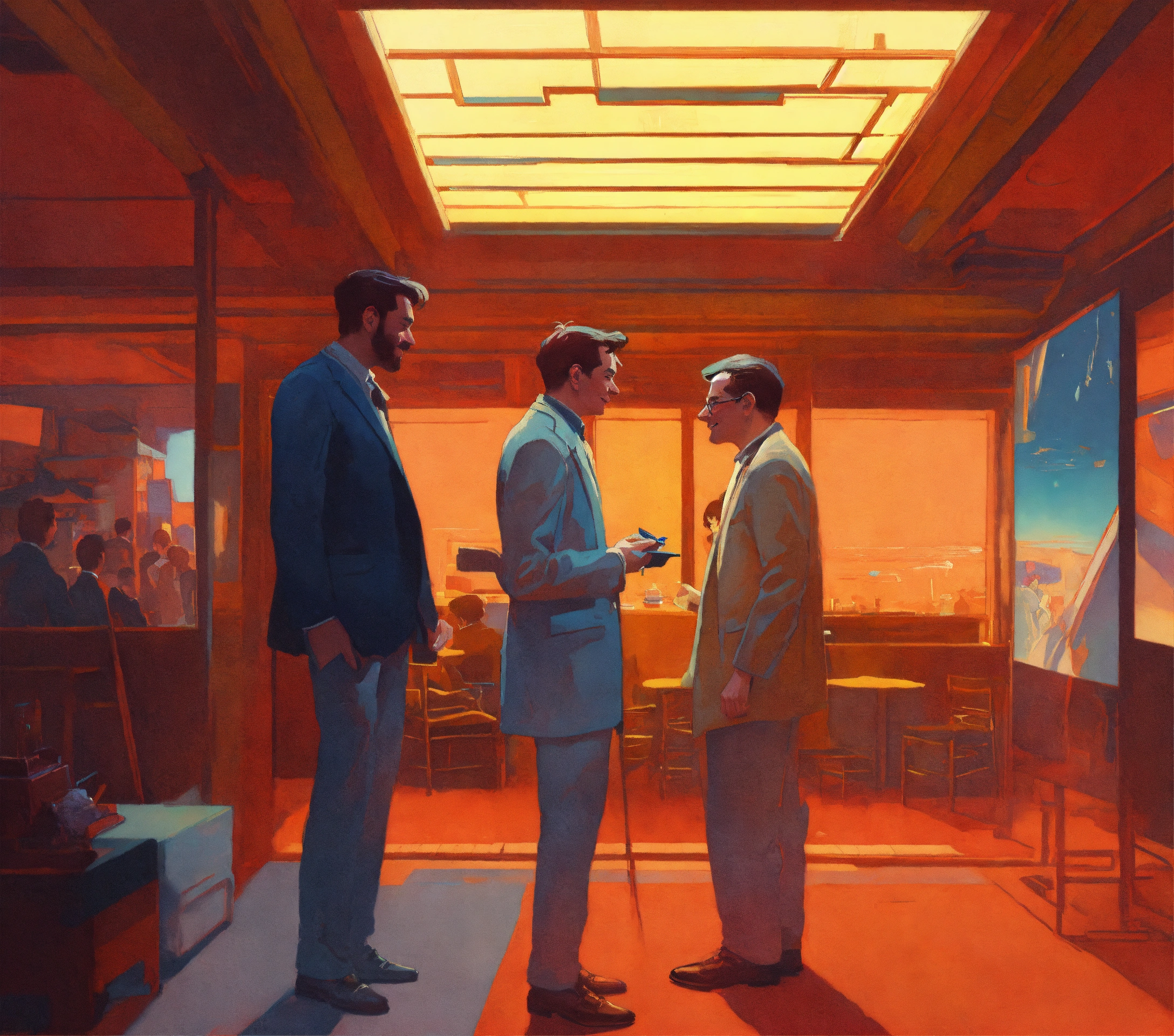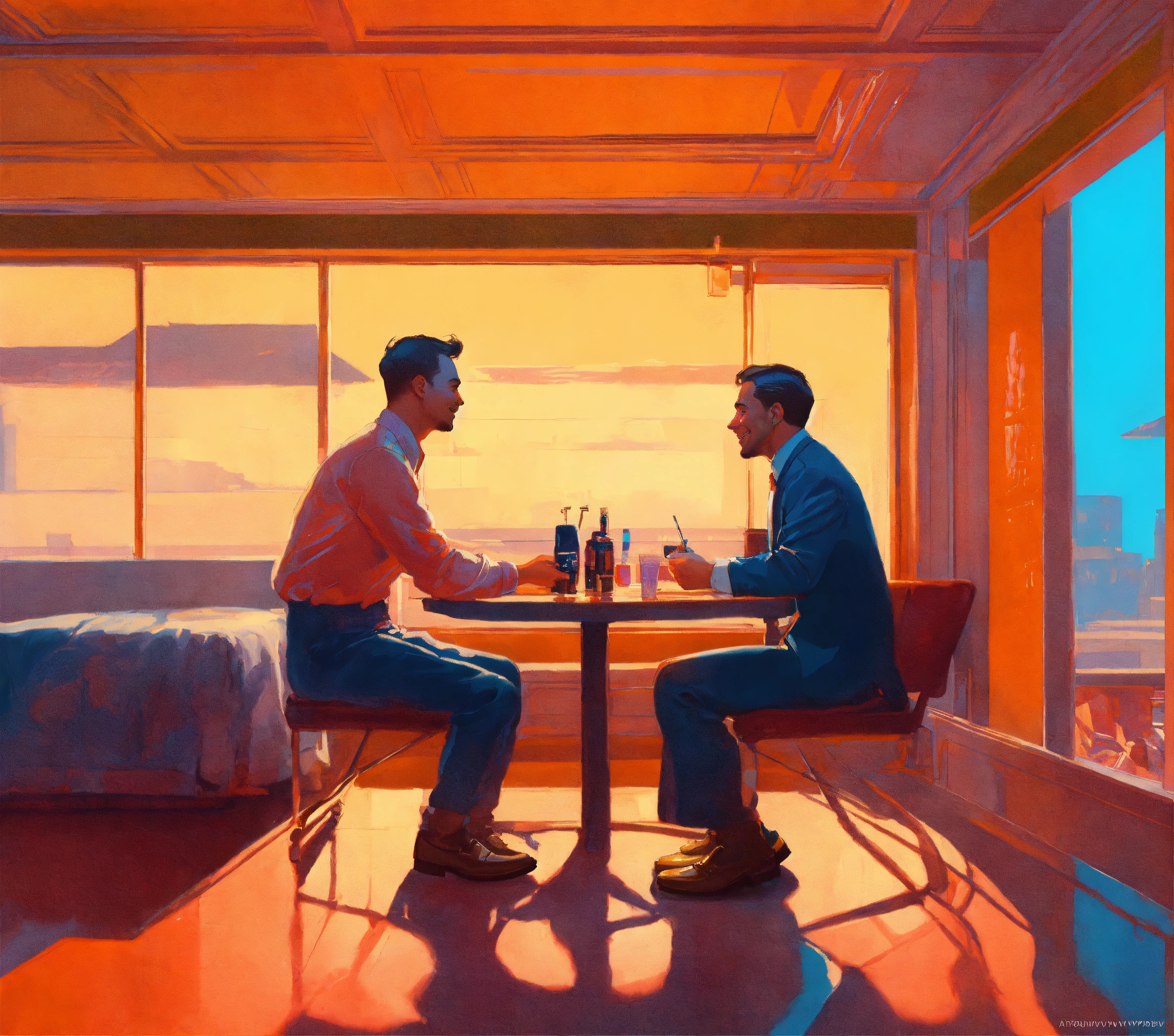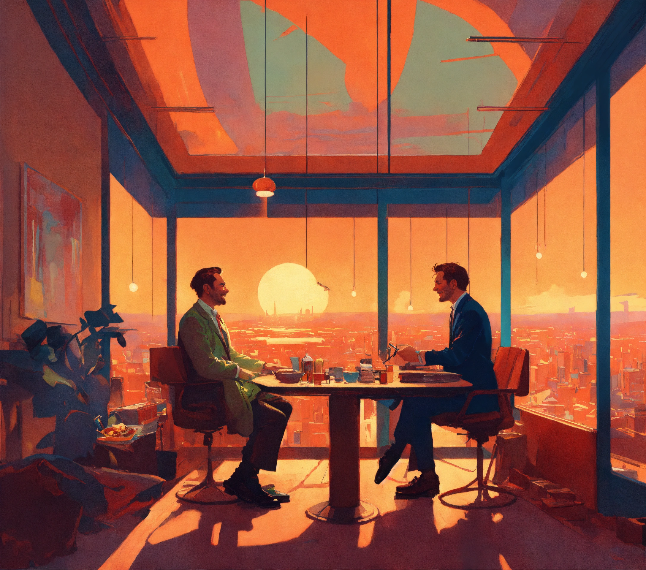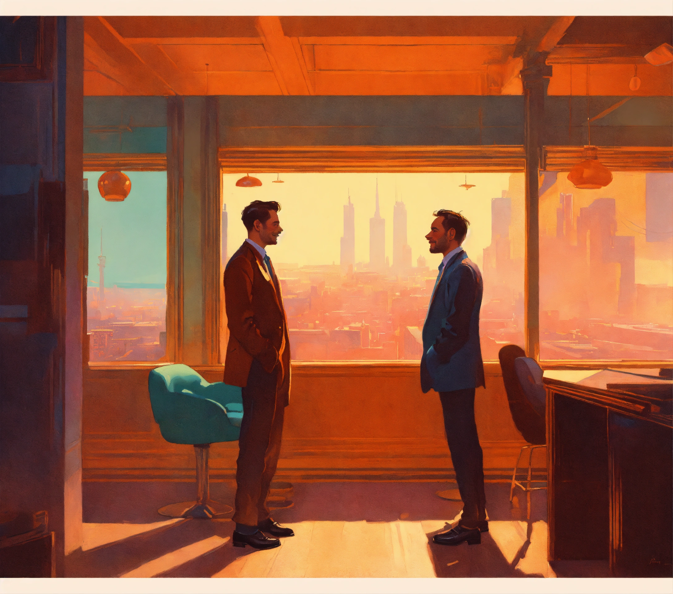 Two people making a deal, they smiling happily in the style of francis bacon and syd mead and edward hopper and norman rockwell and beksinski, open ceiling, highly detailed, painted by francis bacon, painted by james gilleard, surrealism, airbrush, ilya kuvshinov, wlop, stanley artgerm, very coherent