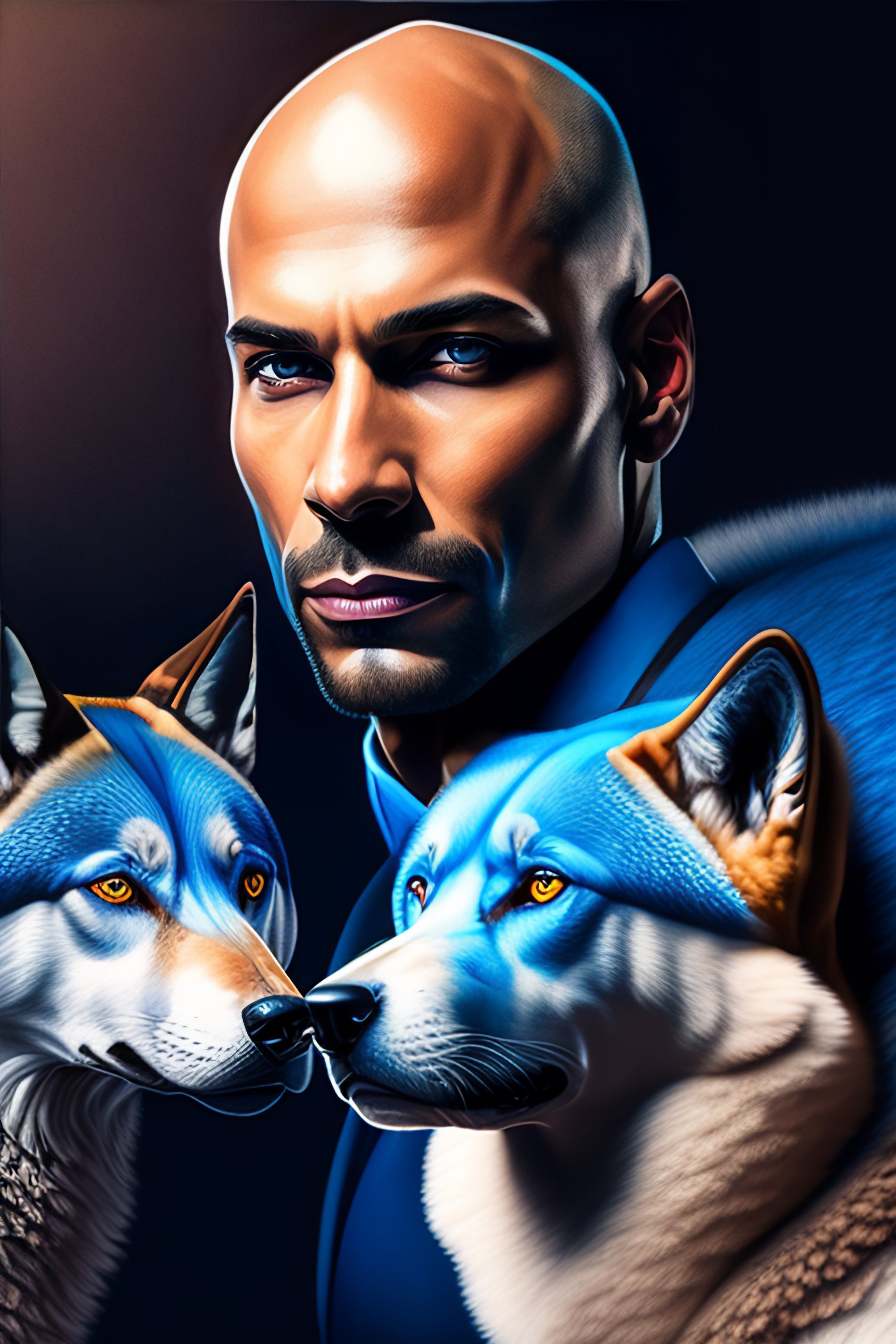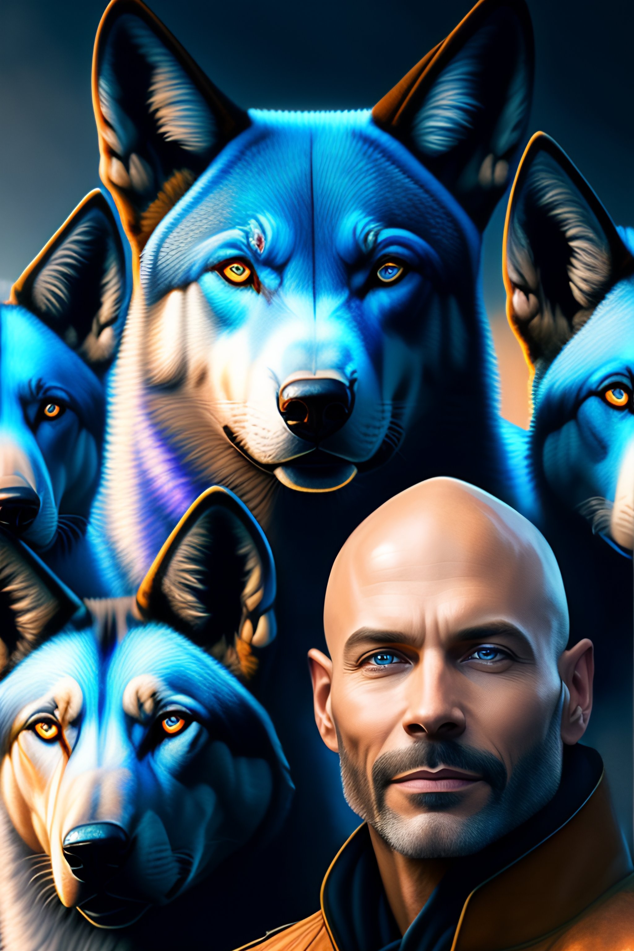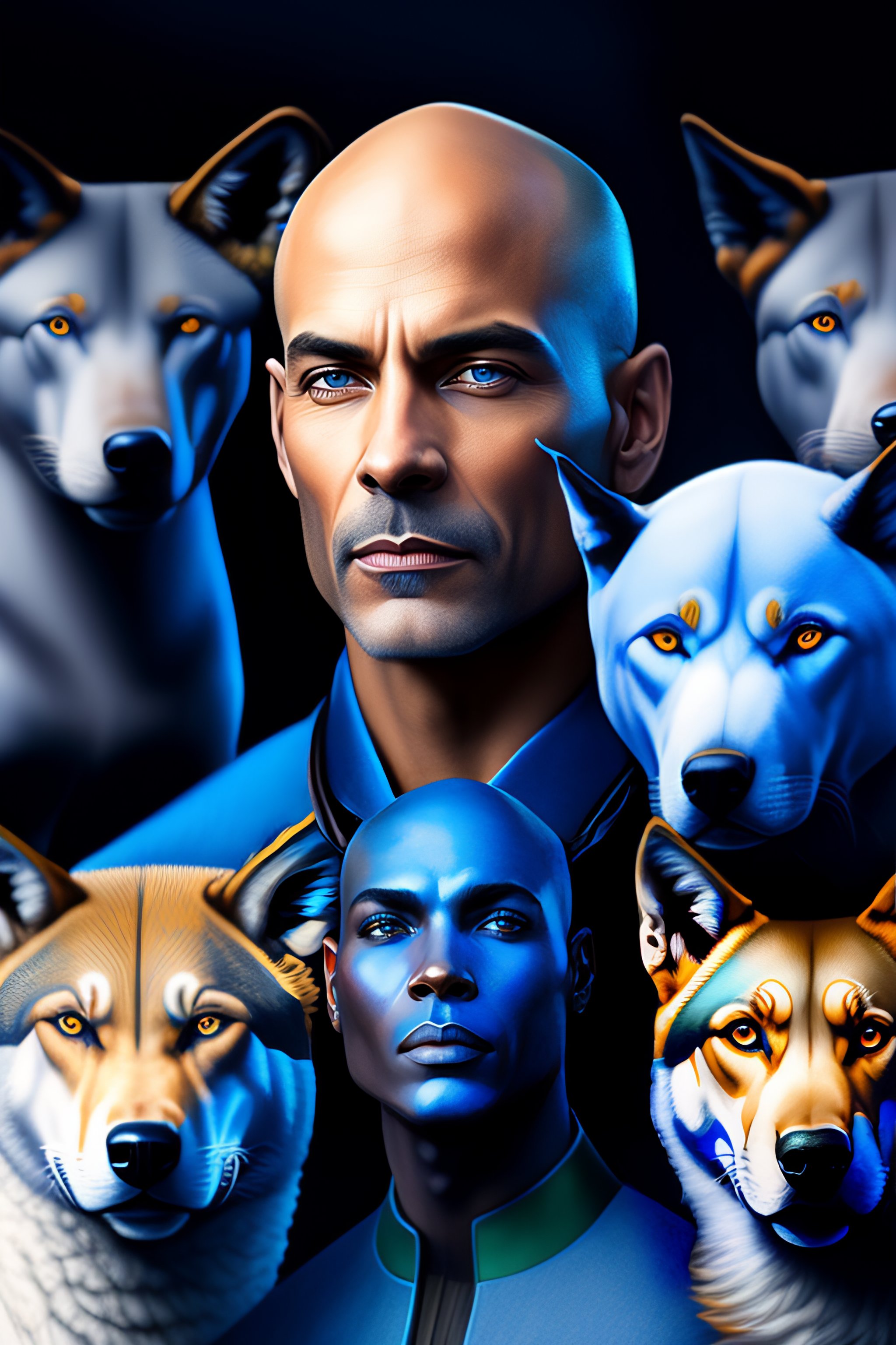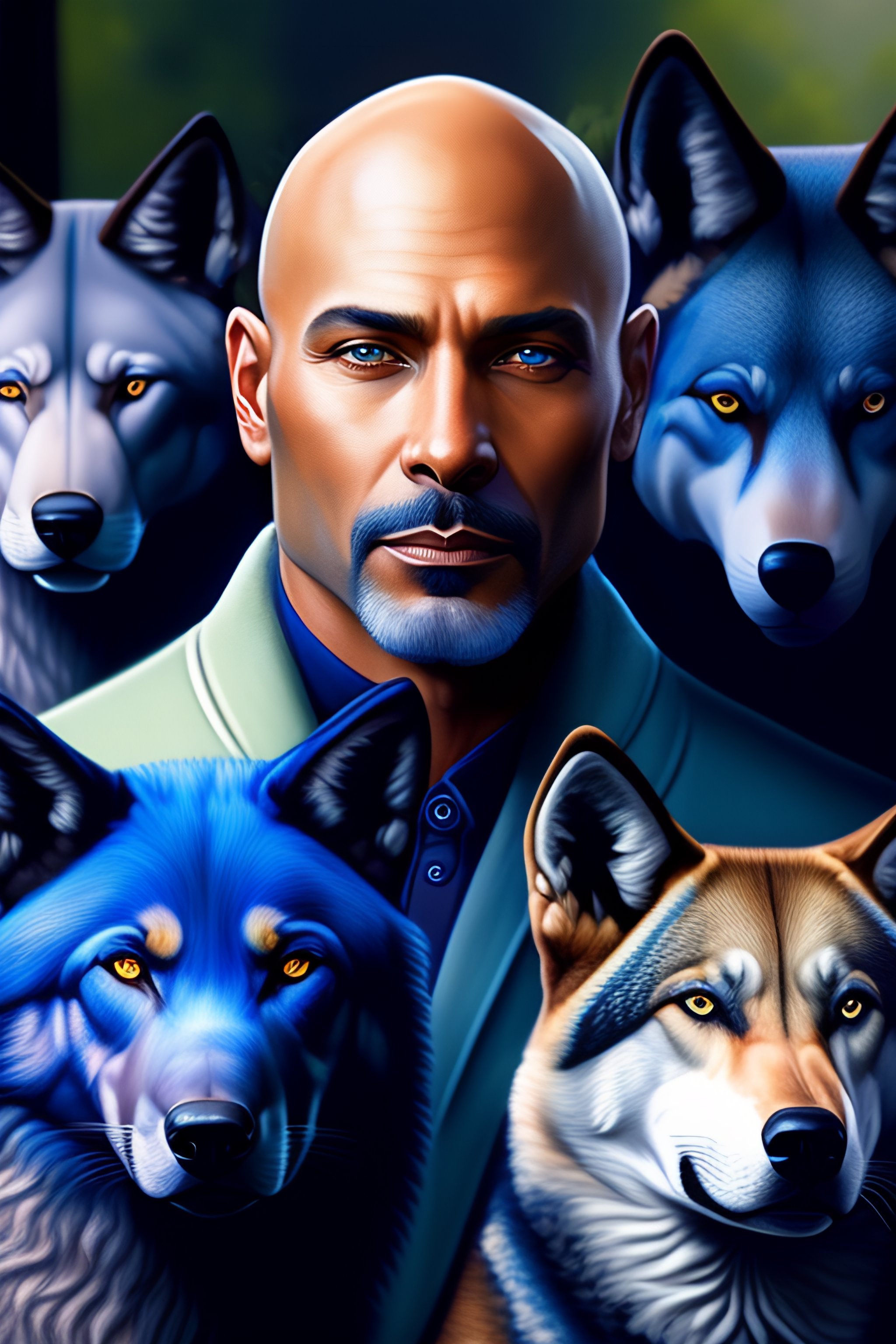 Detailed illustration of a bald blue man surrounded by a wolf pack, coherent face symmetry, ultra realistic, concept art, intricate details, eerie, highly detailed, photorealistic, octane render, 8 k, unreal engine, art by artgerm and greg rutkowski and alphonse mucha