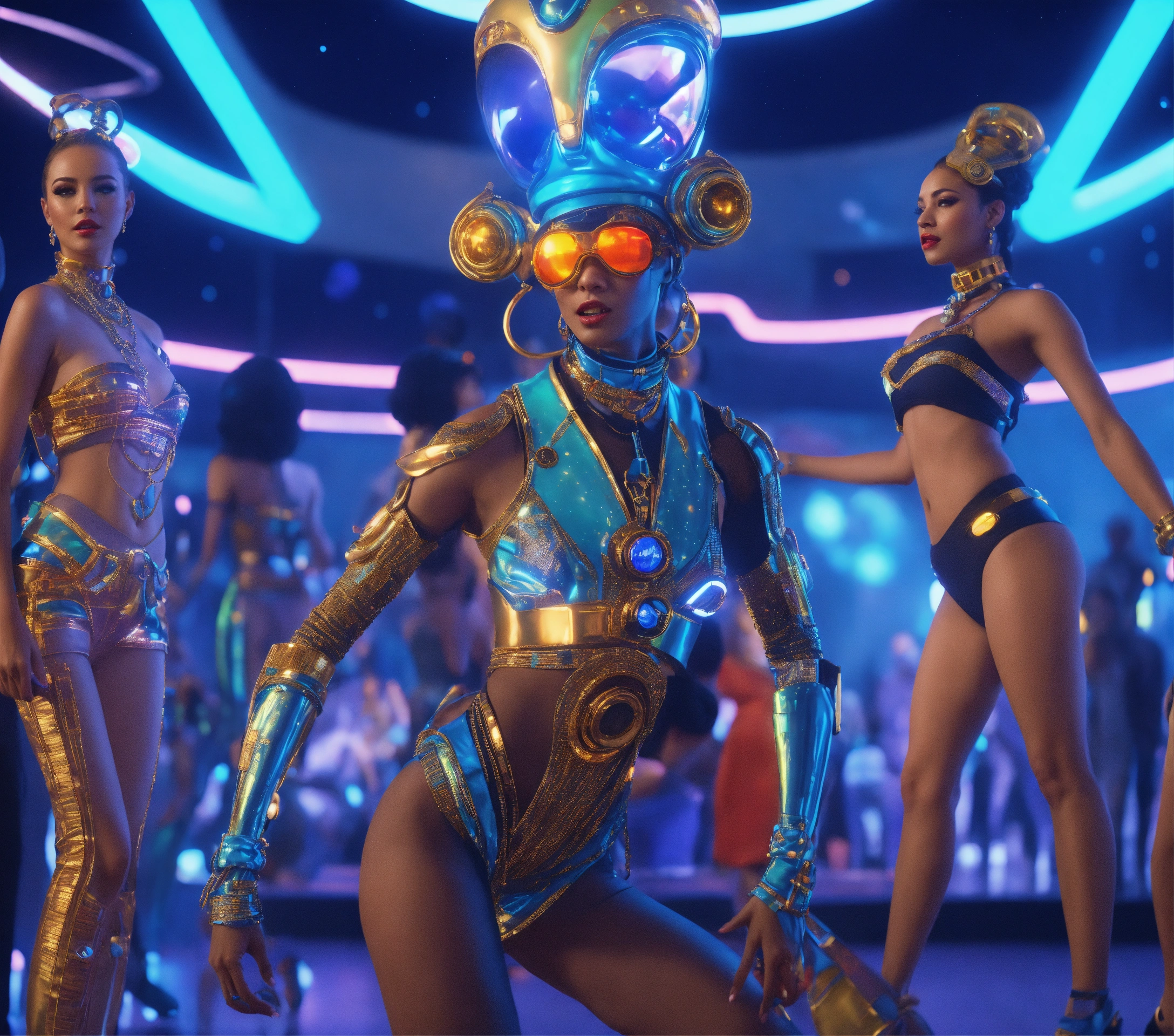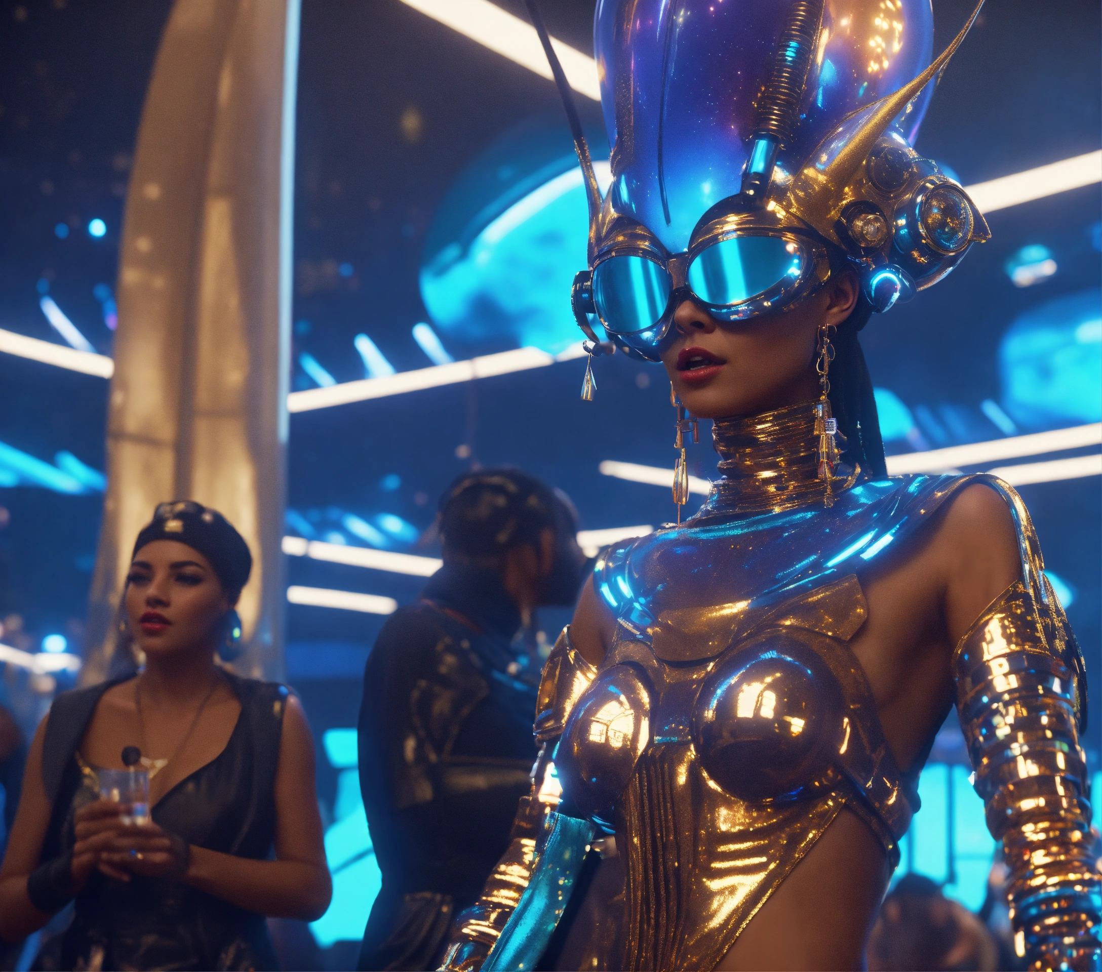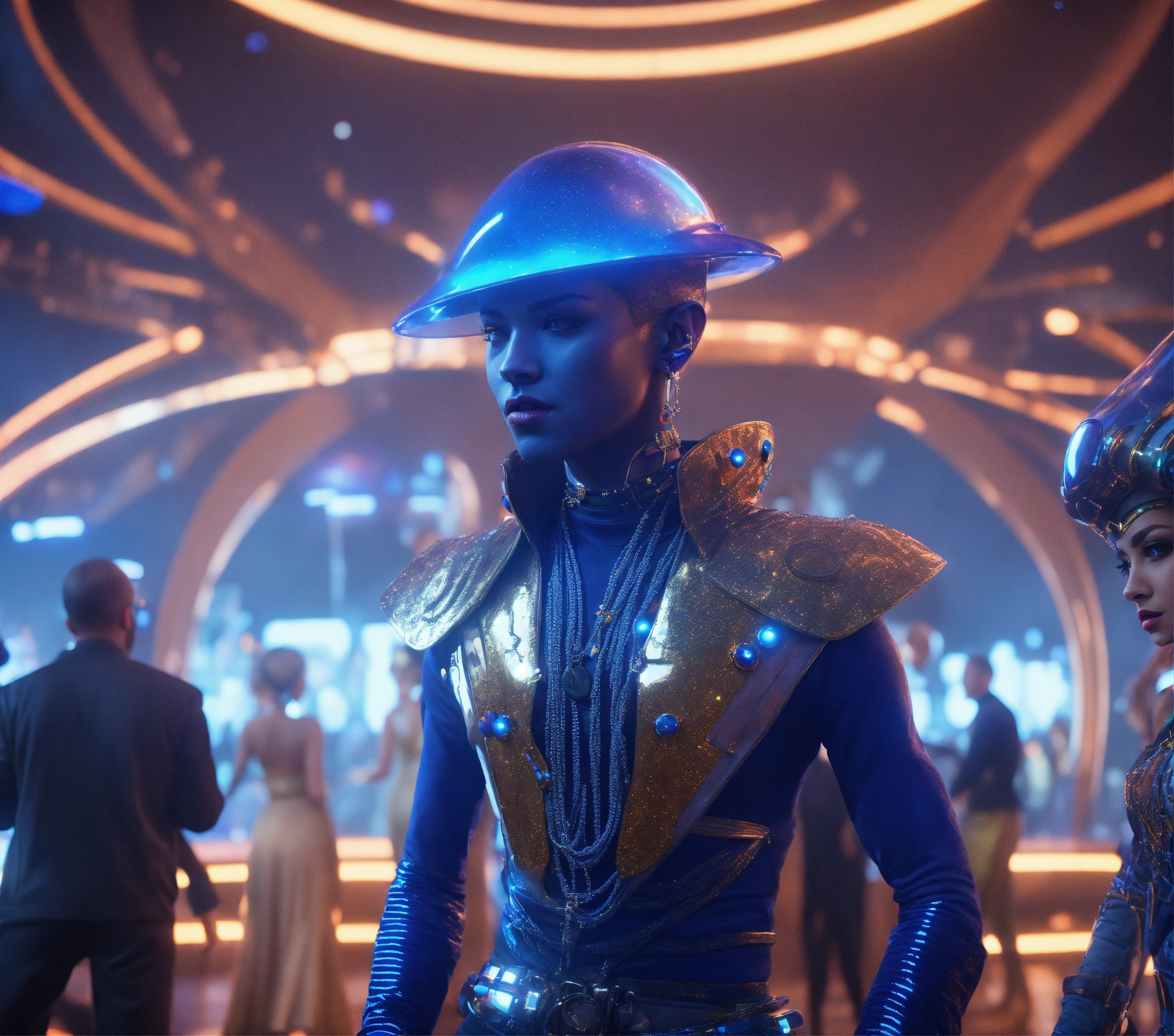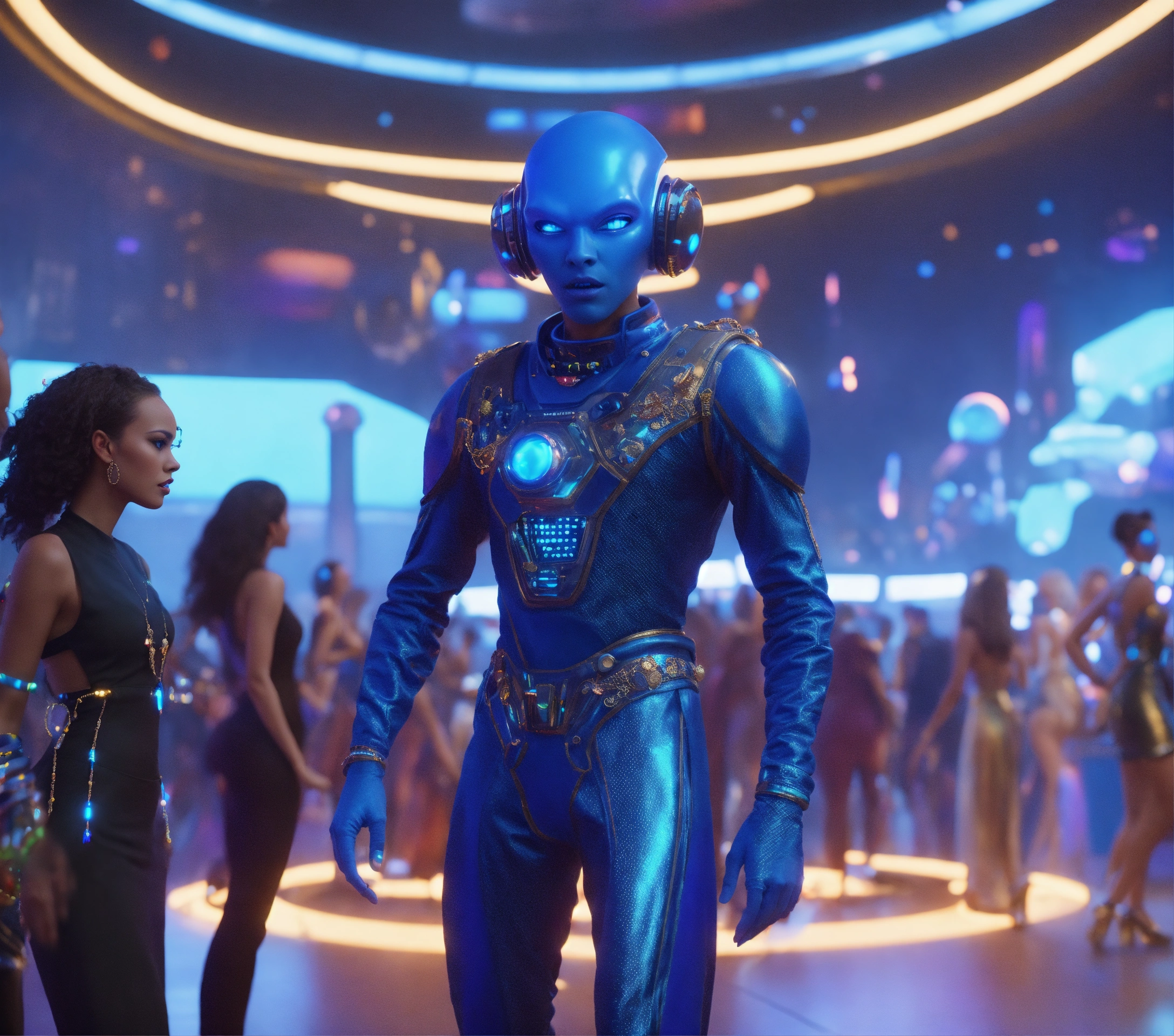 Zoom out from a funky blue alien guy wearing space fashion with alot of jewelry with beautiful women in funky futuristic royal attire dance and socialize at a packed jazz concert on a spaceport, realistic, futuristic, sci fi, 8k, unreal engine, pixar
